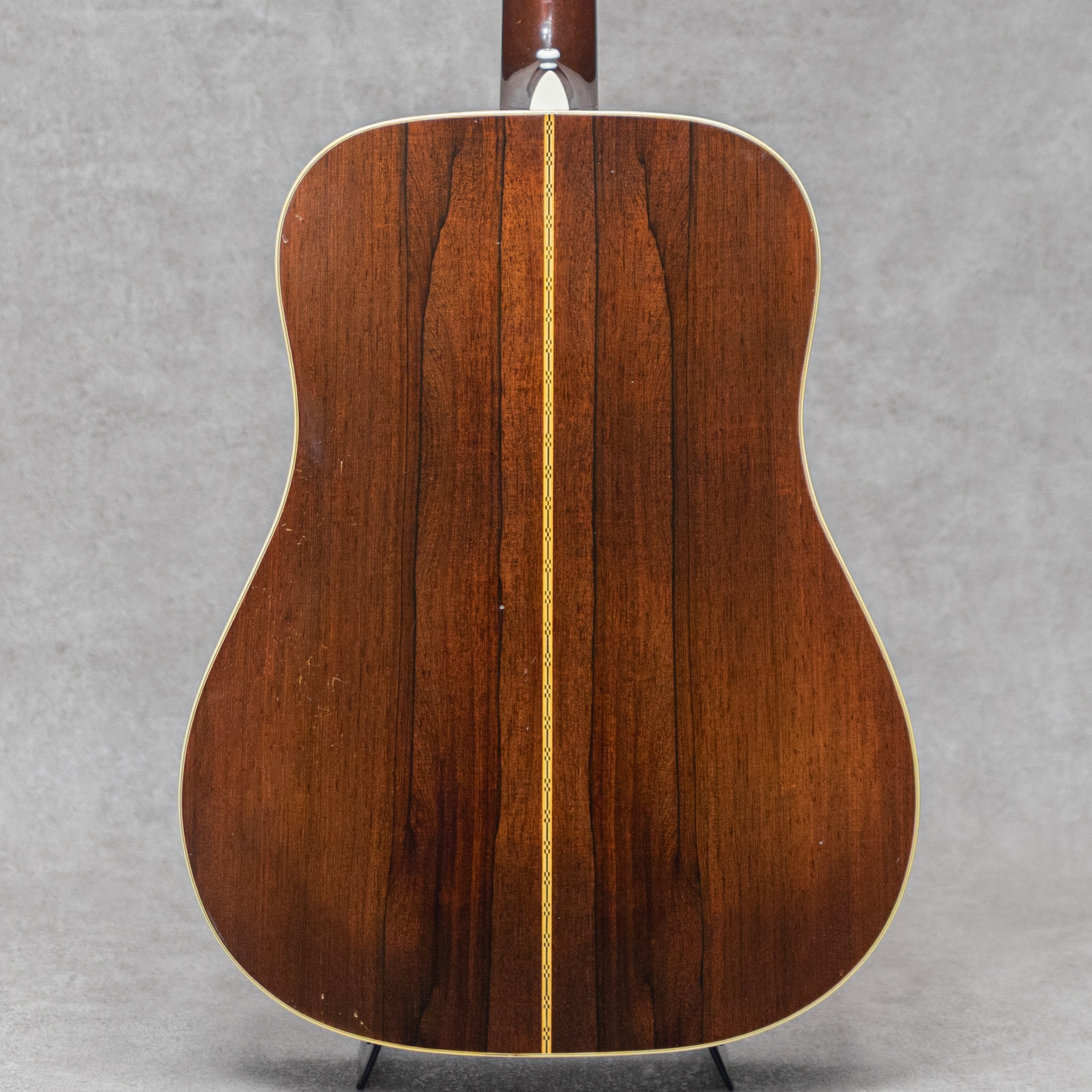 マーチンギターの中で最も有名なモデル"D-28"。現在同様の14fジョイントのドレッドモデルとして1934年に誕生してから、時を超え今もなお愛されるワールドスタンダードモデル。本器はハカランダ期の1962年製Vintage品。スプルーストップ、美事なスパイダーグレインの柾目ハカランダサイド&バック、マホガニーネック、エボニー指板&ブリッジ、ロングサドル、パテント入りミルクボトルグローバーペグ、ハカランダ天神板、MOP指板ドット、マルチプライバインディング、べっ甲柄セルロイドピックガード、スチールTバーロッド、スモールメイプルブリッジプレート、ノンスキャロップドXブレイシング。この時期ならではの丸みの強い小振りなヘッドシェイプがクールな本器。よく乾いた抜けの良い立ち上がり、パンチのある力強く快活なサウンド。歯切れ良く、どもらずにスッと出てくるアタックはよく弾かれ経年したオールドならでは。"D28"の良さを存分に味わえる良いエクセレントコンディション&グッドサウンドの1本です。使用に伴う若干の打痕や小傷は否めませんが、ノークラック&オリジナルフィニッシュを保った本器。マーチンクラックも若干の変形はあれど割れは見られません。ネック裏にはカポ痕や小傷が見られますが、ネックコンディションもとても良くしっかりと持ち弾きやすい弦高。骨太でコシのある伸びやかなトーン、爪弾けばきらびやかに、そしてかき鳴らした時のパンチの強さは得も言えぬ心地良さ。決して金属質で耳を突く音色でなく、60数年間、タップリと弾き込まれてきた事を想像させてくれる熟れた響きです。ここ最近ヴィンテージの価格高騰もあり、お目にかかりにくくなってきているハカランダD-28。しっかりと弾きながらの所有をお考えの方には是非チェック頂きたいオススメの1本です。ハードケース付属