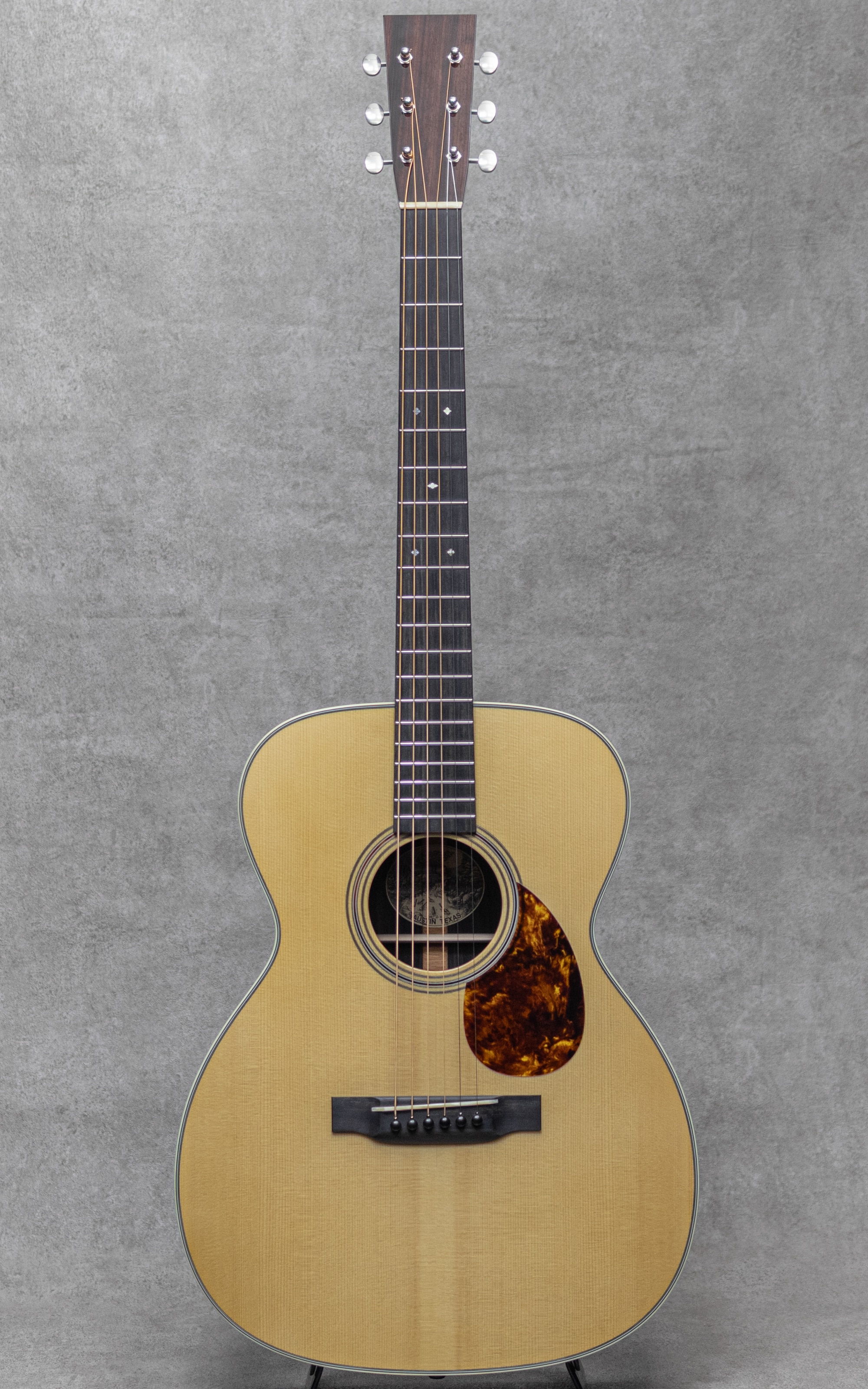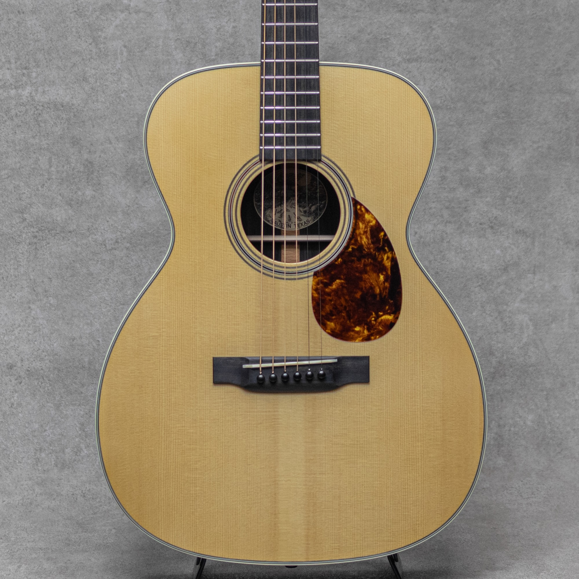 世界的にもっとも高い評価を得ているブランドの一つであるコリングスギター。コリングスの高く保たれたその完成度は、プレイヤーがその楽器を手に持つだけで見惚れてしまう美しさを持ち、音を出せば納得する響きを放ちます。2017年にカリスマであった”Bill Collings(ビル・コリングス)”が逝去し、最初期よりのマスタービルダー"Bruce VanWart(ブルース・ヴァンワート)"も引退となり、着実に若い世代へと引き継がれたコリングスは更なる情熱と更なる完成度を魅せながら輝き続けます。本器はコリングスが辿り着いた境地、アコースティックの新シリーズ”Hill Country(ヒル・カントリー)”の1本、”OM2AHC”。”Hill Country"シリーズでは全モデルでアディロンダックスプルーストップに、ハンドメイドのピックガード&ウェッジ&ネックヒールキャップ、ヘッド裏ブランド刻印を採用。コリングスが持つ良さをしっかりと継承しながら、よりアコースティックに、よりダイナミックに、進化を遂げた新シリーズです。本器は2StyleのインディアンRWのOMモデル。目幅が狭く柾目痕が前面に浮き出る美しいアディロンダックスプルース、美しい杢目を魅せる極上イーストインディアンローズウッドサイド&バック、ホンジュラスマホガニーネック、エボニー指板&ブリッジ、ロングサドル、ゴールドMOPスロッテッドダイアモンド&スクエア指板インレイ、レリックウェバリーオープンバックペグ、ハンドメイドべっ甲柄ピックガード、アイボロイドバインディング、ジグザグバックストリップ、ヒルカントリースキャロップドXブレイシング w/ショートタングブレイス。新たに様々なこだわりを詰め込んだ”Hill Country”は、現アコースティックマスタービルダーの”Steve Nall(スティーブ・ノウル)”が開発の大部分を担った自信作。仕上がりにまず驚くのはそのサウンド。とてもふくよかで倍音豊かに轟く響きで、プリウォーのスキャロップサウンドのそれを彷彿させる完成度とクオリティ。そこに付随する兼ねてから持ち合わせるコリングスならではの芯の太いサシティンとアタック、そして明瞭で広いレンジ感。フラットトップアコースティックギターに求められる多くの要素をかなり高い次元で体現する完璧な実力派モデルに仕上げられています。OMサイズとは思えない密度と音量で、それに負けない音の広がり。フィンガータッチでも十二分にサスティンの効いた明瞭な響きを聴かせ、かかえるプレイヤーの感性にも直接響きかけるサウンドです。リバーブ感と粘り、しっかりとパワフルにレスポンスするダイナミックスレンジ、優れたトーンバランスとピッチ、、あげればキリがない完成度を誇る現代に体現される究極のトラッドギアの1本です。ここ数年のコリングスのスタンダードシリーズはとても完成度が高く、ある種の完成の域を覚えていましたが、あっさりと裏切り乗り越えられました。この魅力は本当に文字では語り尽くせません。ブレない高い志を持つ現役世代のコリングスが産み出す至極の逸品。とにかくお手元で、実際に、ご体感ください。