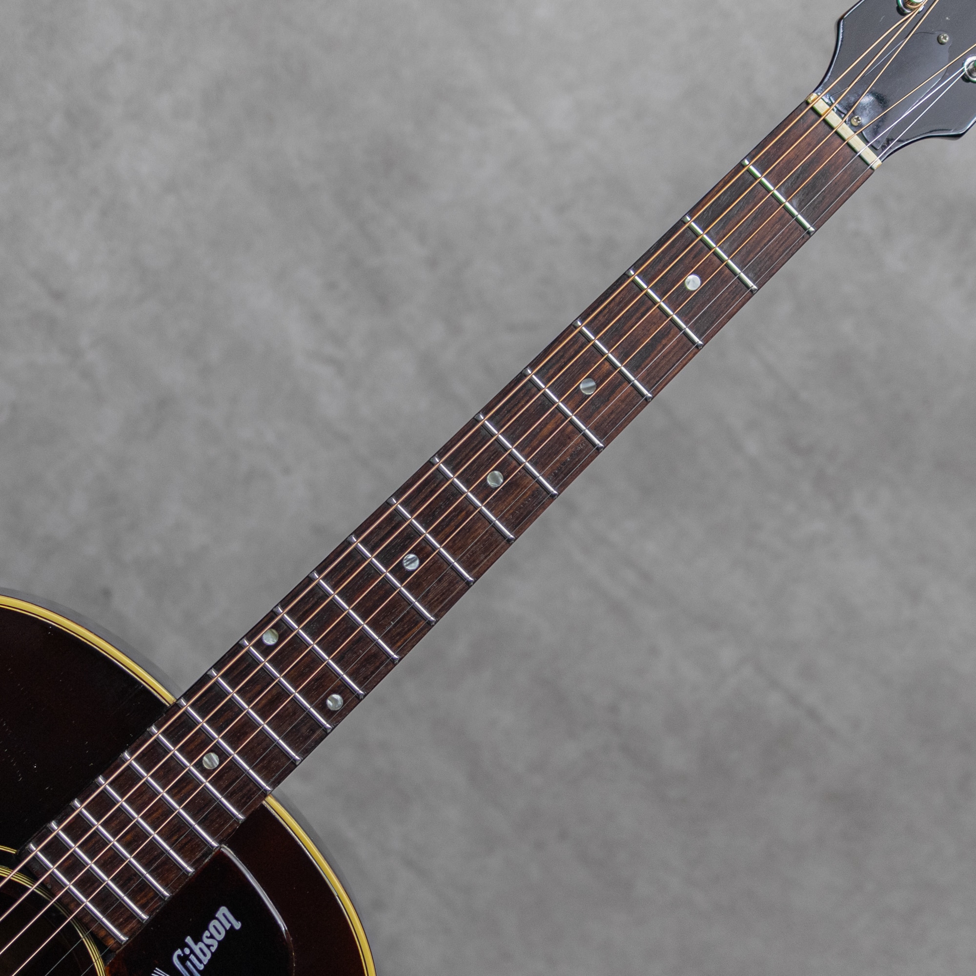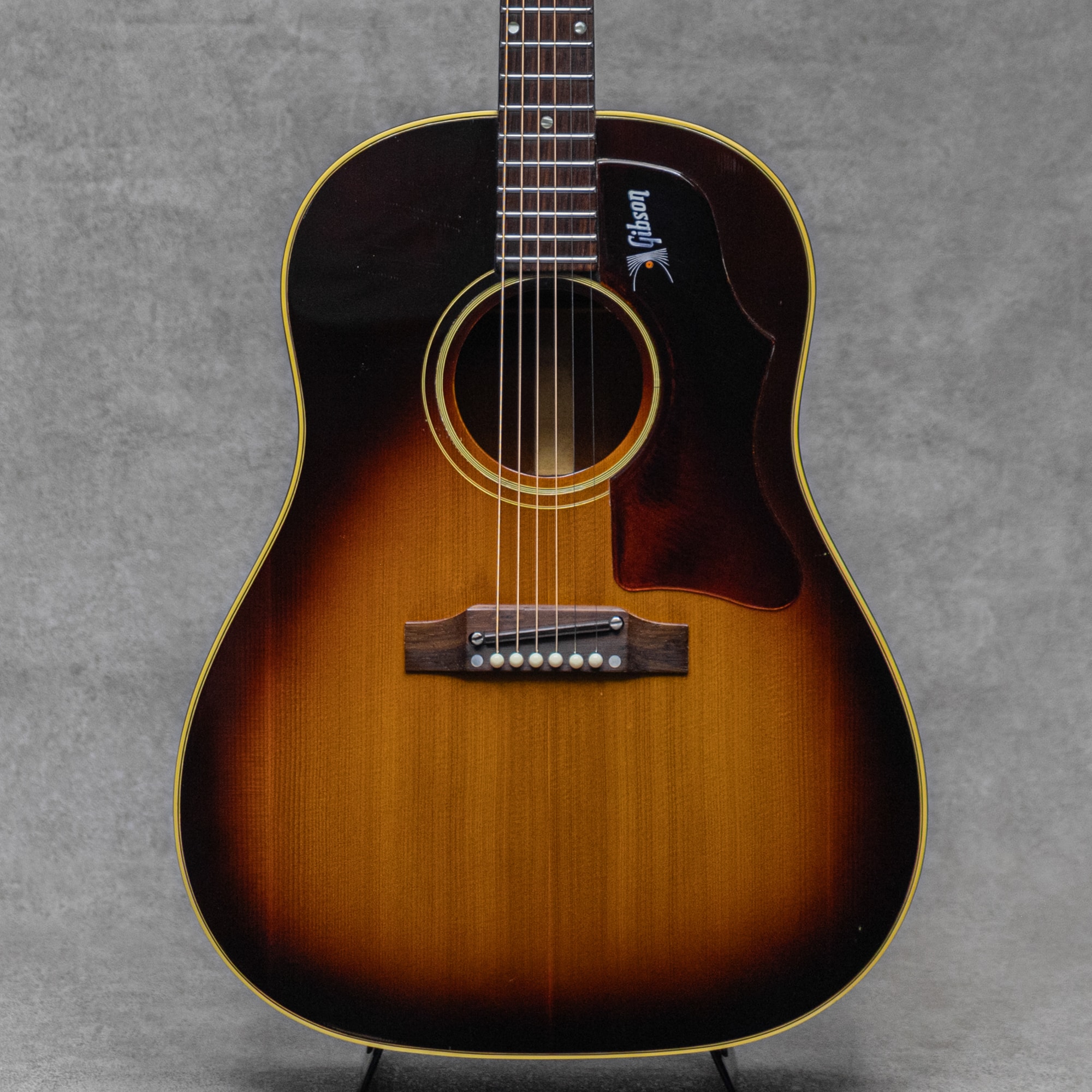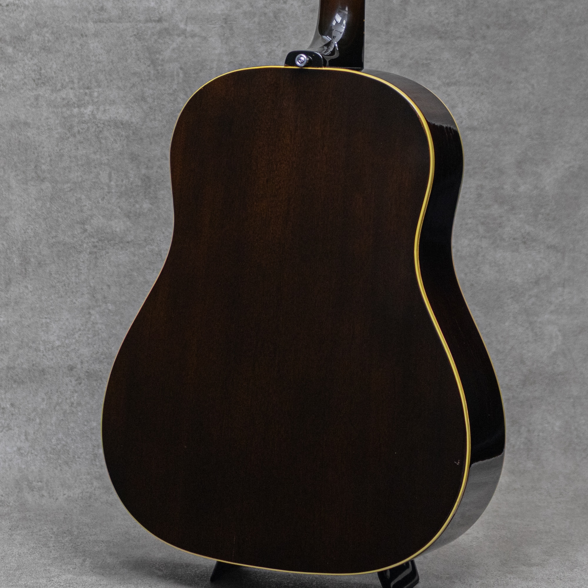 フラットトップにおけるもうひとつの憧れ、ワーキングホースGibson"J-45"。1942年に登場した"J-45"、その後幾つかのマイナーチェンジを繰り返しながらも、今尚トップシーンで欠かせないGibsonを代表するラウンドショルダーボディのジャンボモデル。アイコンとも言うべきダークカラーのサンバーストは、1961年にチェリーサンバーストへとマイナーチェンジされます。1967年に再びブラウンバーストが復活し、再びそのルックスは継承されることとなります。本器は、ナロウネックにブラウンサンバーストのアイコニックな”J-45”。PGのロゴもキレイに残されたボトムベリーブリッジの1968年頃製極上Vintage品。スプルーストップ、マホガニーサイド&バック、マホガニーネック、ローズウッド指板、ハカランダブリッジ、ローズウッドアジャスタブルブリッジ、Gibsonロゴ入りポインテッドチックピックガード、ダブルリングロゼッタ、ナット幅約39.5mmネック、14度ヘッド角、ノンスキャロップド・Xブレイシング。ペグは近年のダブルライン3連クルーソンデラックスペグが装着されています。パーカッシブで肉厚なアジャスタブルギブソンサウンド。お手本の様なガシャっとしたE to eの早いレスポンスはまとまりが良く、カッティングからストロークでこの時期ならではの独特なサウンドをもたらしてくれます。音量感もあり、プレイヤーの腹に響く低音感も心地よく、ドライで歯切れの良い元気なサウンドを聴かせてくれます。68年製のもっとも特徴的な仕様を備えた1本で、光沢をしっかりと纏ったブラウンバーストがまばゆい本器。打痕や小傷最小限で、経年によるウェザーチェックも軽微。またノンクラックで良好な1本です。ネックコンディションもとてもよく、弾きやすいアクションをしっかりと保っています。アイコニックなブラウンサンバースト、美しいコンディションを保ったグッドビンテージの1本です。お見逃しなく要チェックください。ハードケース付属