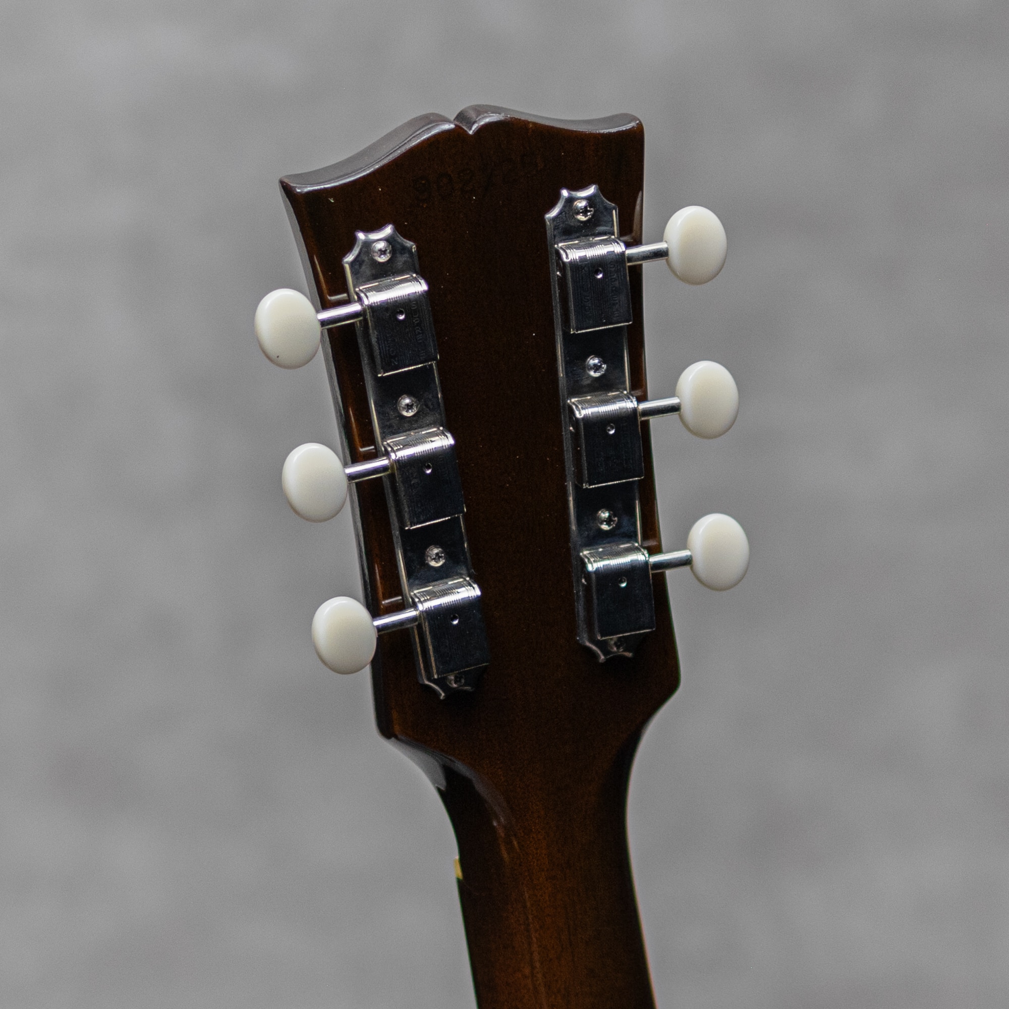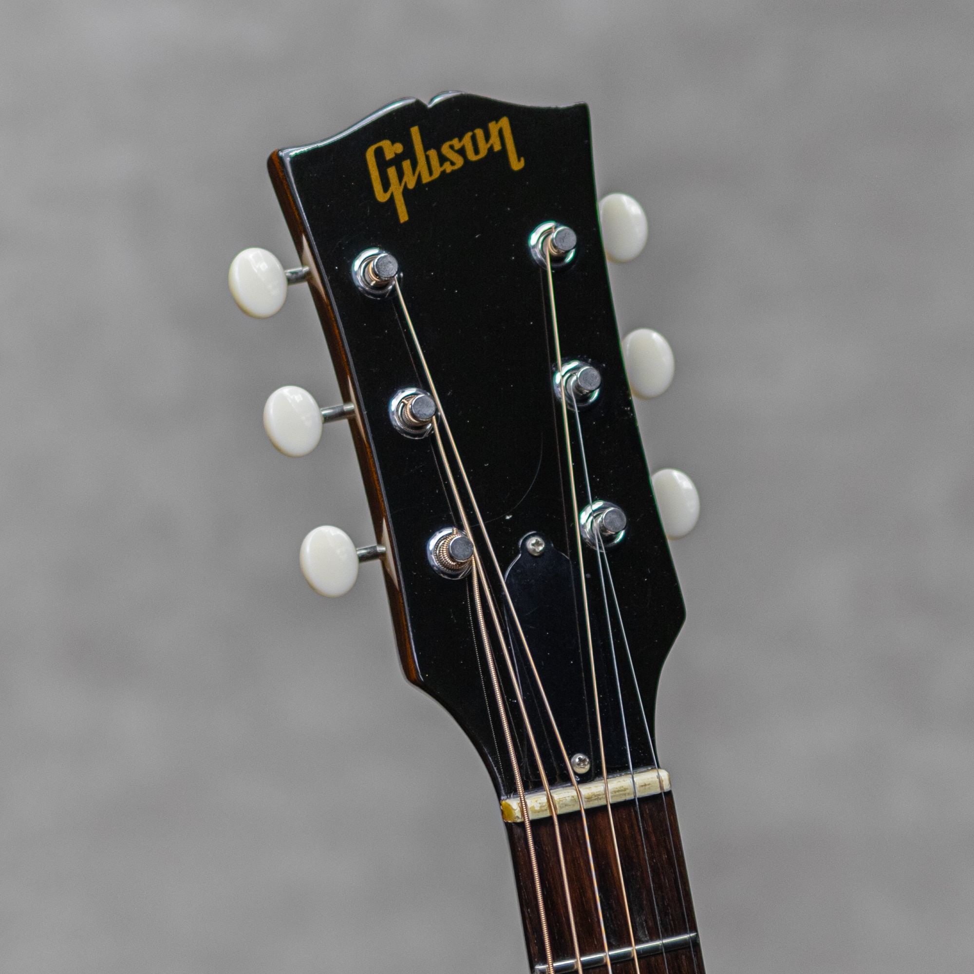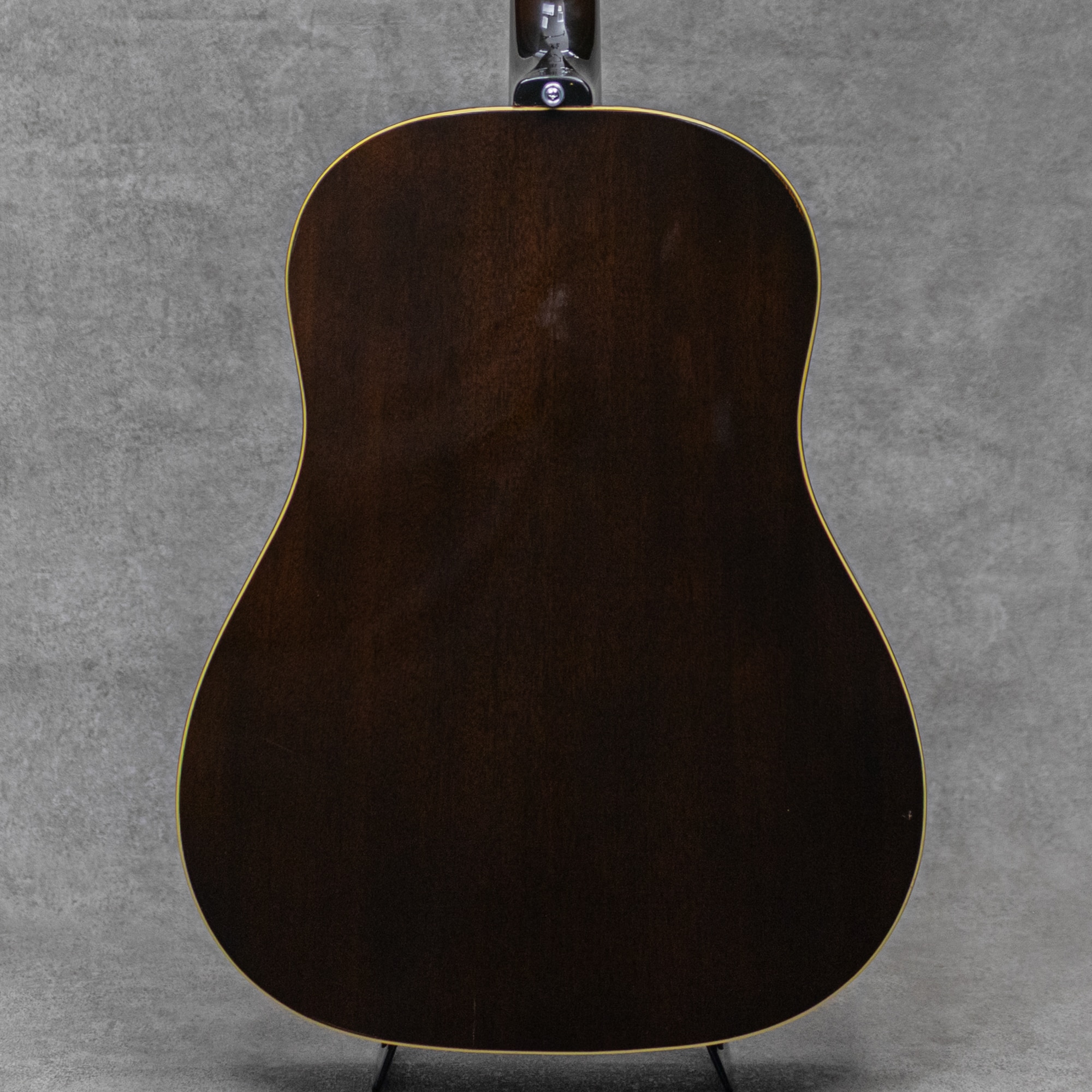 フラットトップにおけるもうひとつの憧れ、ワーキングホースGibson"J-45"。1942年に登場した"J-45"、その後幾つかのマイナーチェンジを繰り返しながらも、今尚トップシーンで欠かせないGibsonを代表するラウンドショルダーボディのジャンボモデル。アイコンとも言うべきダークカラーのサンバーストは、1961年にチェリーサンバーストへとマイナーチェンジされます。1967年に再びブラウンバーストが復活し、再びそのルックスは継承されることとなります。本器は、ナロウネックにブラウンサンバーストのアイコニックな”J-45”。PGのロゴもキレイに残されたボトムベリーブリッジの1968年頃製極上Vintage品。スプルーストップ、マホガニーサイド&バック、マホガニーネック、ローズウッド指板、ハカランダブリッジ、ローズウッドアジャスタブルブリッジ、Gibsonロゴ入りポインテッドチックピックガード、ダブルリングロゼッタ、ナット幅約39.5mmネック、14度ヘッド角、ノンスキャロップド・Xブレイシング。ペグは近年のダブルライン3連クルーソンデラックスペグが装着されています。パーカッシブで肉厚なアジャスタブルギブソンサウンド。お手本の様なガシャっとしたE to eの早いレスポンスはまとまりが良く、カッティングからストロークでこの時期ならではの独特なサウンドをもたらしてくれます。音量感もあり、プレイヤーの腹に響く低音感も心地よく、ドライで歯切れの良い元気なサウンドを聴かせてくれます。68年製のもっとも特徴的な仕様を備えた1本で、光沢をしっかりと纏ったブラウンバーストがまばゆい本器。打痕や小傷最小限で、経年によるウェザーチェックも軽微。またノンクラックで良好な1本です。ネックコンディションもとてもよく、弾きやすいアクションをしっかりと保っています。アイコニックなブラウンサンバースト、美しいコンディションを保ったグッドビンテージの1本です。お見逃しなく要チェックください。ハードケース付属