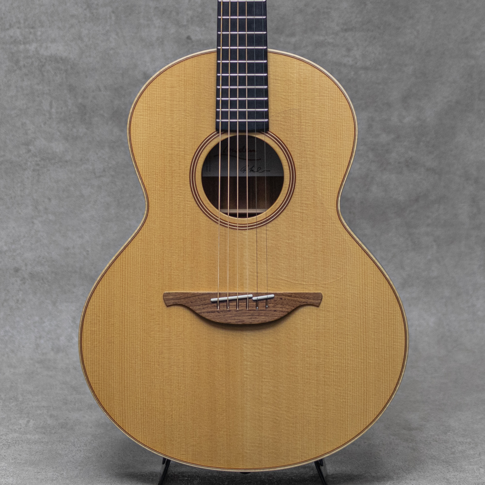 ヨーロッパのフィンガースタイルアーティストをはじめ、多くの著名なミュージシャンが使用しているアイルランド製ギター”Lowden Guitars"。丁寧で確かな造りとその独特な乾いた美しい響きは他では類を見られない北欧の雄。現在はジョージ・ローデンを含む少数精鋭のクラフトマン達のみで製作されていて、まだまだ気鋭な新モデルや新マテリアルにも精力的な取組を見せています。本器は、2021年にオリジナルシリーズへラインナップされたコアウッドS&Bの” S-34”。使用感も少ないグッドコンディションの1本。2021年製USED品。柾目痕浮き出る美しいシトカスプルース、うっすらとフレイム杢が見られるコアサイド&バック、積層マホガニー&ローズウッドネック、エボニー指板、ローズウッドブリッジ、ゴトーゴールド381ペグ/エボニーノブ、メイプル&マホガニーロゼッタ&バインディング、クリアピックガード、シルクの様な質感のセミグロスフィニッシュ。ロウワバウト14.7”ほどのコンパクトモデル”S”は、コンサートサイズ相当の1本。抱えやすく愛らしい外観ながら、しっかりと低音までしっとり柔らかく反響してくれます。コアならではの甘く優しい響きは、フィンガータッチで十二分に得られるレスポンスを包み込む倍音でゆったり弾き惚れる心地よい1本です。サテンフィニッシュは使用に伴う艶も出やすいですが、それらがほとんど伺えないグッドコンディションの本器。若干の打痕や小傷は伺えますが、大きく損なうものはなく良好です。ネックまわりもとても良好で、弾きやすいアクションをしっかりと保っています。分離よくそれでいて甘く囁きかけてくれる魅力ある1本。半世紀を経て愛され続ける北欧の雄”Lowden Guitars”、是非お手元でお楽しみください。オリジナルハードケース付属
