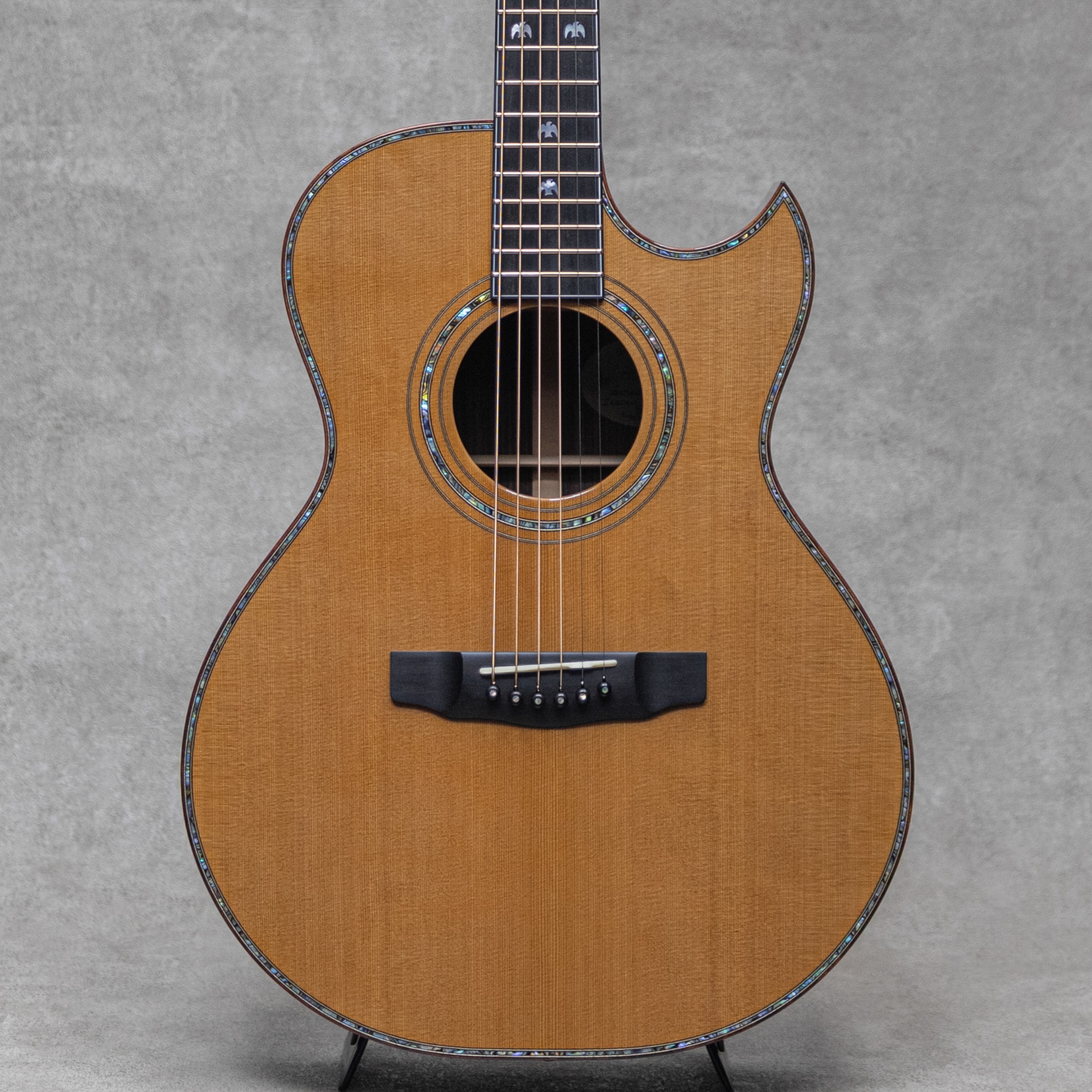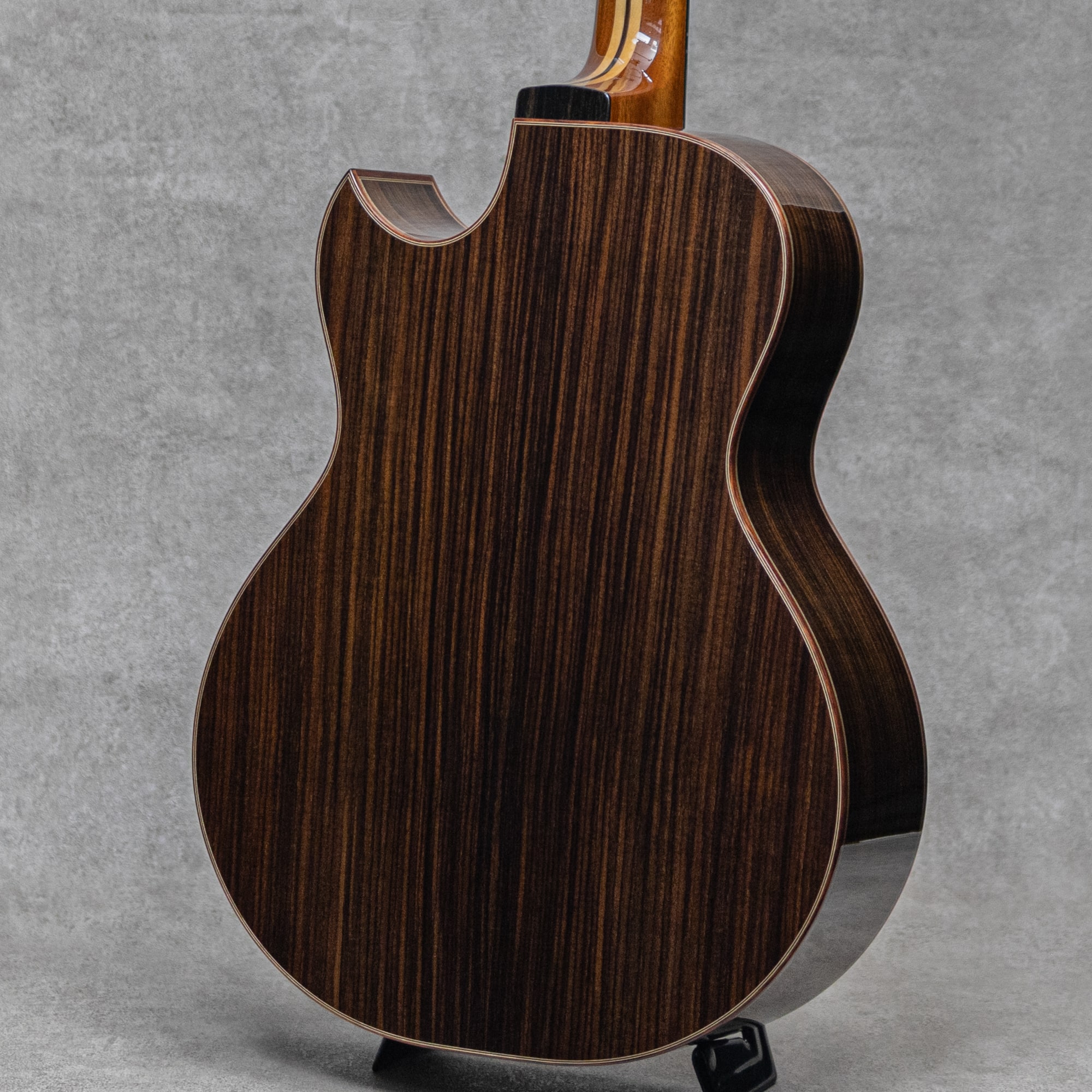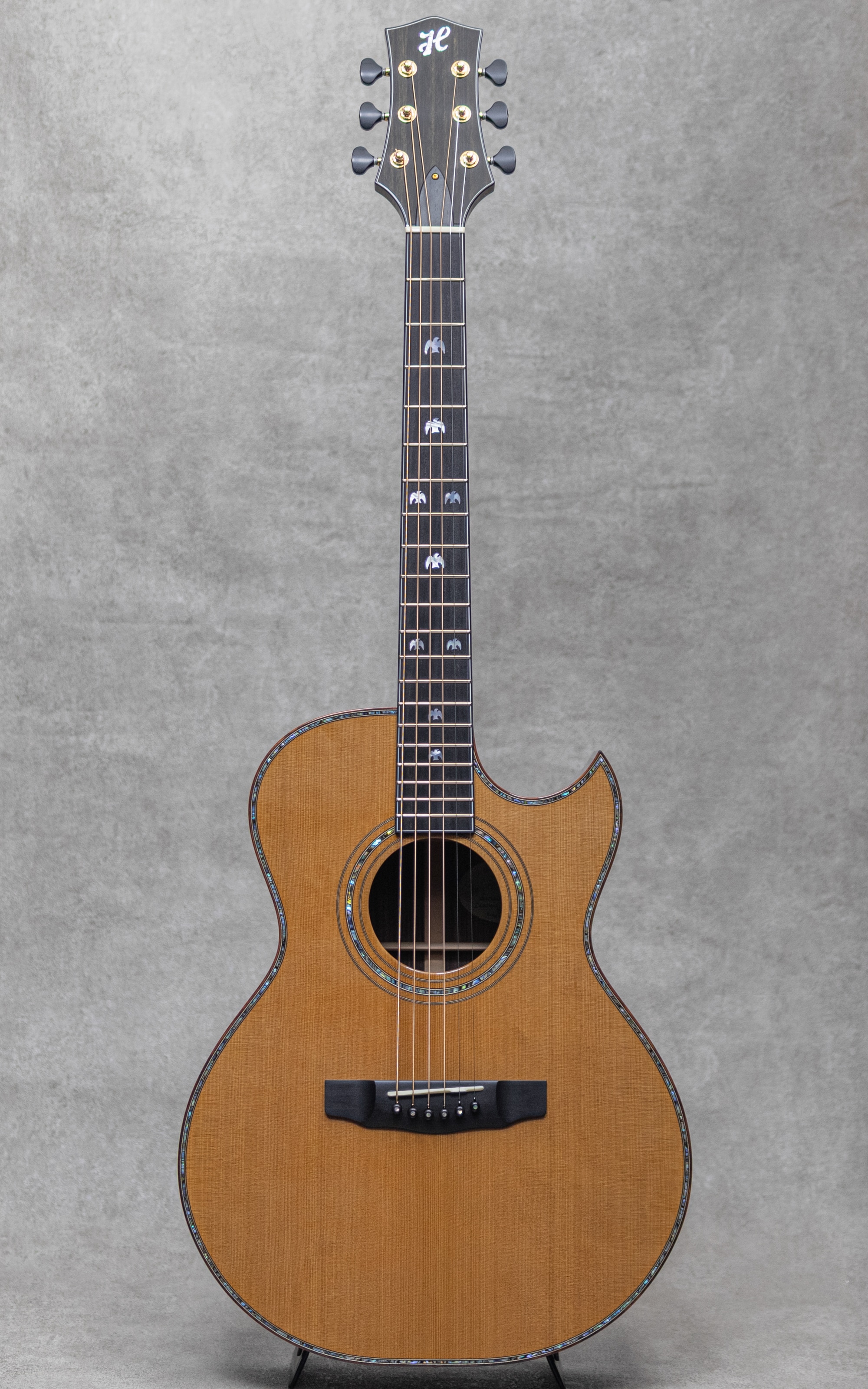 ミネソタ州グランド・マレーにて製作される"T. Drew Heinonen Guitars”。アメリカンルシアー若手の中でも注目を集める”T.Drew Heinonen(T. ドリュー・ハイノネン)”は、大学で音響物理学を学び、その後ミネソタ州レッドウィングのギター製作専門学校で学びを重ねます。専門学校在学中に”Dana Bourgeois(ダナ・ボジョア)”にみそめられ卒業後に”Bourgeois Guitars”で4年半に渡り製作に携わります。また別のセミナーで”James Olson(ジェイムス・オルソン)”と出会い、彼の工房へと招かれ2年に渡り製作に携わっています。そんなオルソンから、オルソンの代表作でもある”SJ”を元に採寸しデザインすることを許されるほどです。本器は、そんなSJを彷彿とさせるオルソン譲りの”SJ-C”。美しいフォルムラインにバードフィンガーボードインレイの1本。2024年製極上USED品。全面に柾目痕ゆらめく美しいウェスタンレッドシダートップ、均一で濃淡美しいインディアンローズウッドサイド&バック、マホガニー&メイプ&ローズウッドの5pcsネック、エボニー指板&ブリッジ、エボニー天神板、ゴトー510ゴールドペグ/エボニーボタン、アバロンロゼッタ、アバロントップトリムパーフリング、MOPバード指板インレイ、Jescar EVOゴールドフレット、ローズウッドバインディング、フローレンタインカッタウェイ。オルソンSJをそのまま元にされた1本。ネックプライやシダー/ローズのマテリアル、指板インレイにブリッジピン配列など、あのルックスを思わせる純正派の本器。しかし、そのサウンドはコピーではなく、驚きの完成度とポテンシャルを併せ持ちます。オリジナルよりももう少しモダンで反響感の強めな響き。奥深くしっかりと反響し、それでいて音像の芯が濁ることなく美しく・力強く・サスティナブルに魅せてくれます。シダートップですがコシがあるロングサスティンで、フィンガータッチでも野太く粘りある美しい響きがとても心地よい1本です。使用感すら伺えない極上コンディションの本器。打痕はもちろん、小傷も伺えない極美品。ネックまわりも良好でとても弾きやすいアクションをしっかりと保ってくれています。驚きの完成度とポテンシャルを持つ1本。是非この完成度をお手元でお確かめください。オリジナルハードケース付属