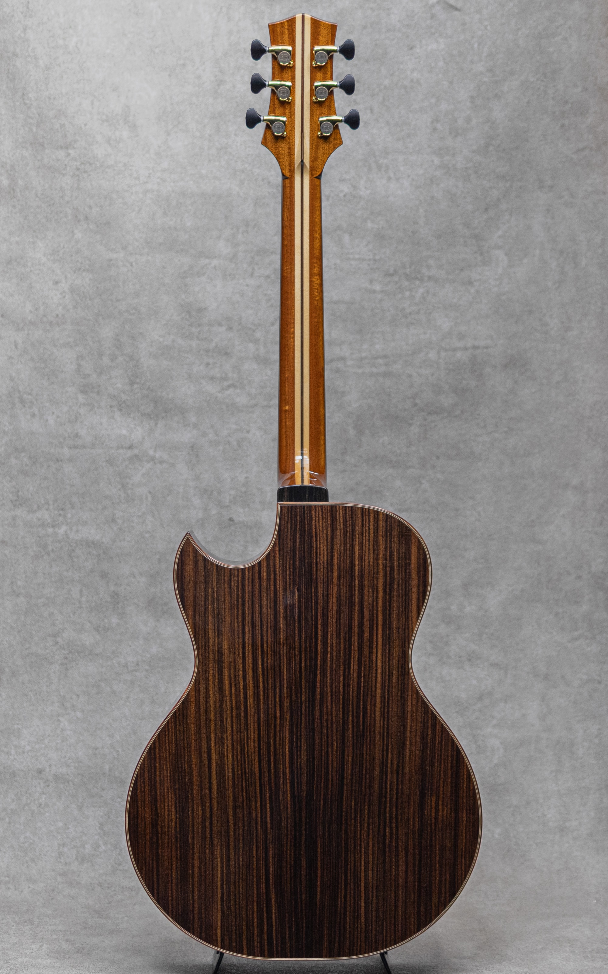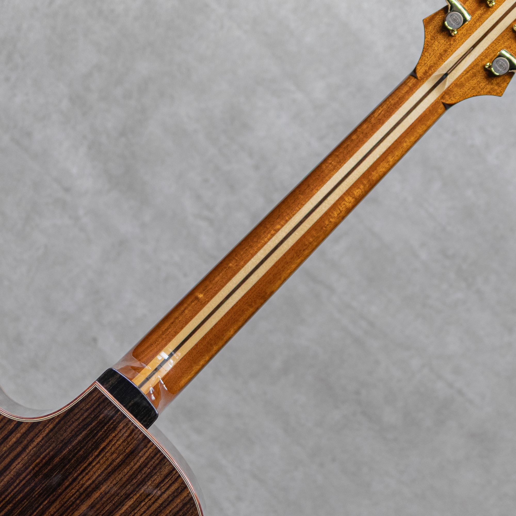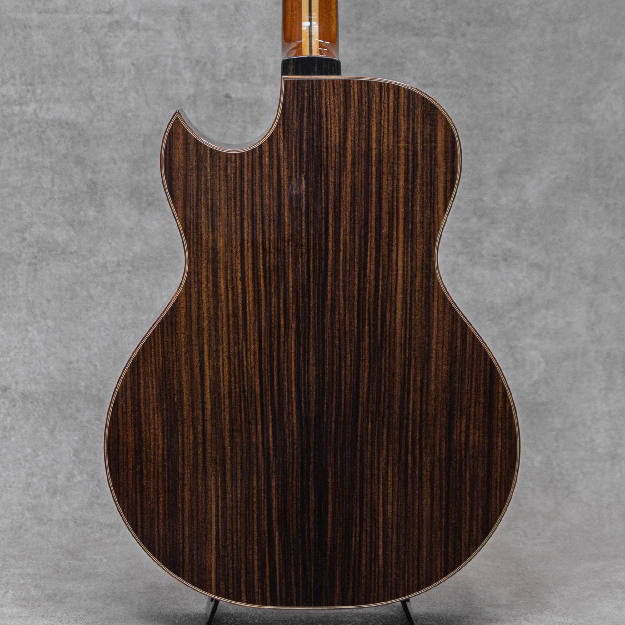 ミネソタ州グランド・マレーにて製作される"T. Drew Heinonen Guitars”。アメリカンルシアー若手の中でも注目を集める”T.Drew Heinonen(T. ドリュー・ハイノネン)”は、大学で音響物理学を学び、その後ミネソタ州レッドウィングのギター製作専門学校で学びを重ねます。専門学校在学中に”Dana Bourgeois(ダナ・ボジョア)”にみそめられ卒業後に”Bourgeois Guitars”で4年半に渡り製作に携わります。また別のセミナーで”James Olson(ジェイムス・オルソン)”と出会い、彼の工房へと招かれ2年に渡り製作に携わっています。そんなオルソンから、オルソンの代表作でもある”SJ”を元に採寸しデザインすることを許されるほどです。本器は、そんなSJを彷彿とさせるオルソン譲りの”SJ-C”。美しいフォルムラインにバードフィンガーボードインレイの1本。2024年製極上USED品。全面に柾目痕ゆらめく美しいウェスタンレッドシダートップ、均一で濃淡美しいインディアンローズウッドサイド&バック、マホガニー&メイプ&ローズウッドの5pcsネック、エボニー指板&ブリッジ、エボニー天神板、ゴトー510ゴールドペグ/エボニーボタン、アバロンロゼッタ、アバロントップトリムパーフリング、MOPバード指板インレイ、Jescar EVOゴールドフレット、ローズウッドバインディング、フローレンタインカッタウェイ。オルソンSJをそのまま元にされた1本。ネックプライやシダー/ローズのマテリアル、指板インレイにブリッジピン配列など、あのルックスを思わせる純正派の本器。しかし、そのサウンドはコピーではなく、驚きの完成度とポテンシャルを併せ持ちます。オリジナルよりももう少しモダンで反響感の強めな響き。奥深くしっかりと反響し、それでいて音像の芯が濁ることなく美しく・力強く・サスティナブルに魅せてくれます。シダートップですがコシがあるロングサスティンで、フィンガータッチでも野太く粘りある美しい響きがとても心地よい1本です。使用感すら伺えない極上コンディションの本器。打痕はもちろん、小傷も伺えない極美品。ネックまわりも良好でとても弾きやすいアクションをしっかりと保ってくれています。驚きの完成度とポテンシャルを持つ1本。是非この完成度をお手元でお確かめください。オリジナルハードケース付属