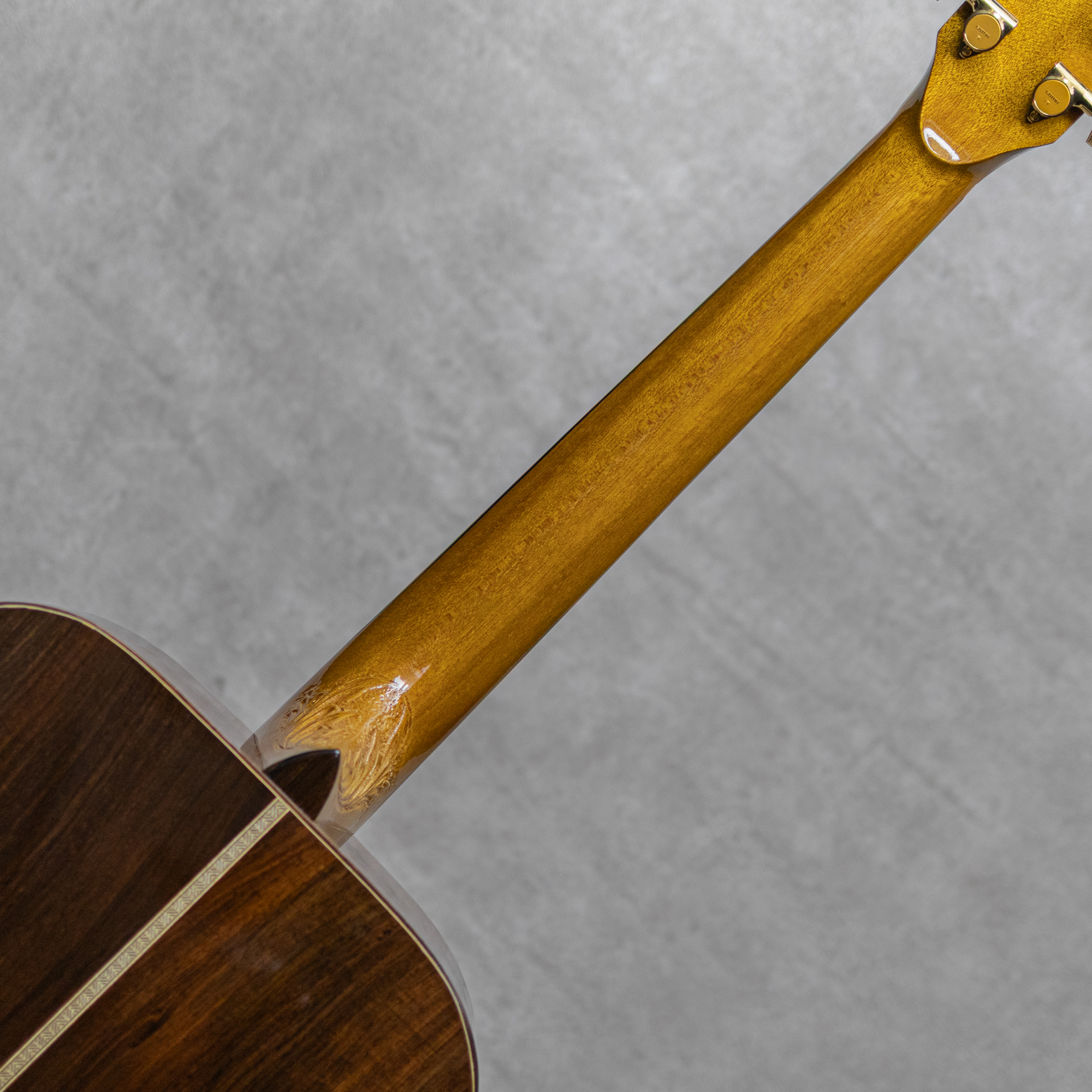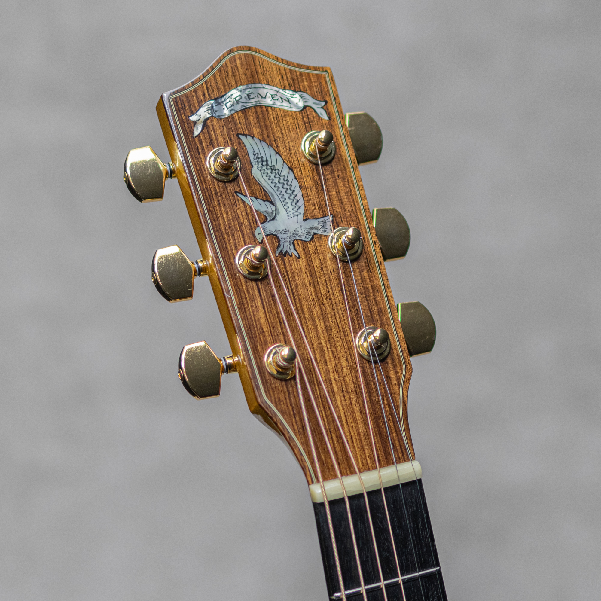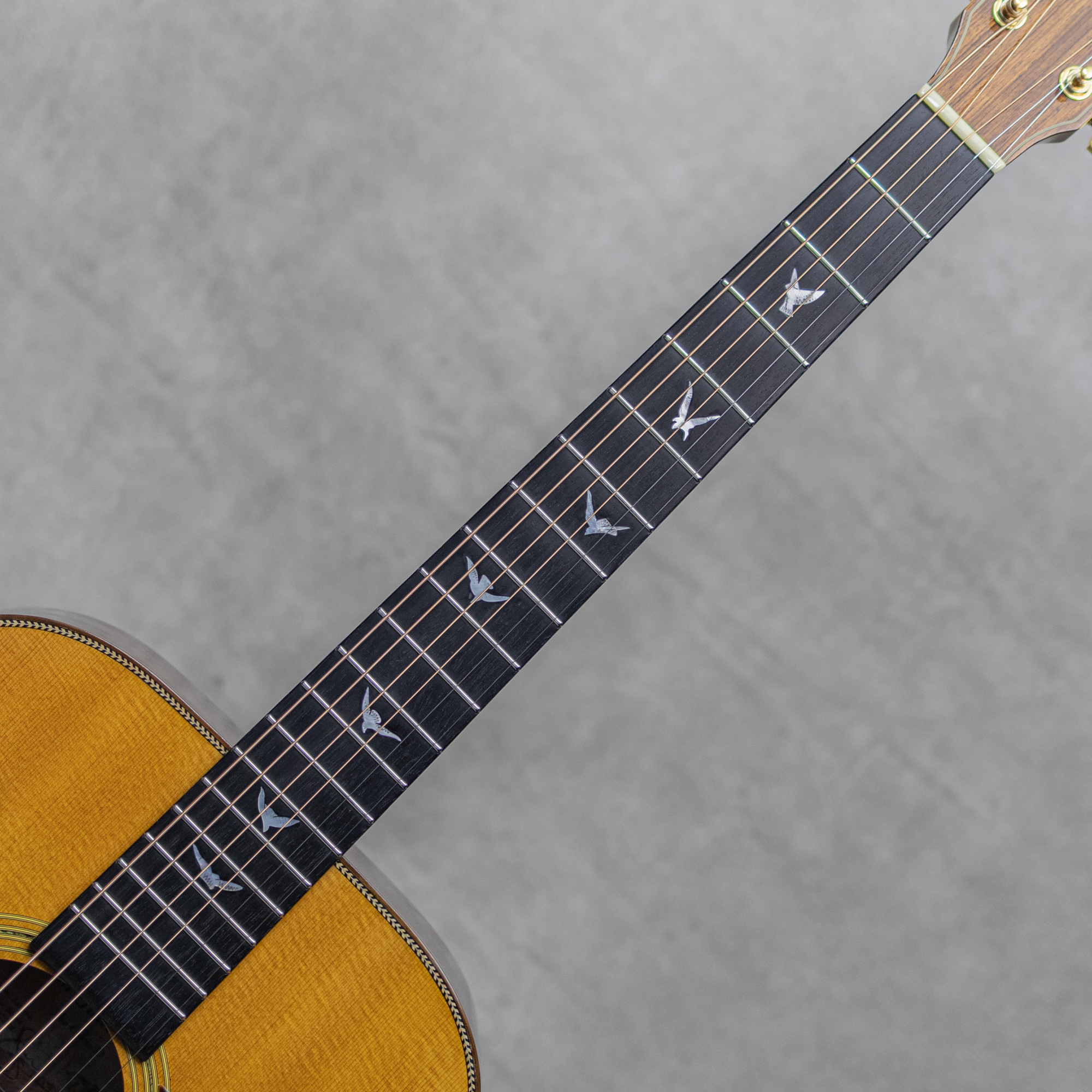 巨匠”John Greven(ジョン・グレーベン)"作の”Oshio-D”。美しいルッツスプルーストップに毛柾の極上ハカランダ、バードインレイのマスターピース。2012年製極上USED品。柾目痕がゆらめく淡い杢目のルッツスプルーストップ、毛柾目が美事な極上ハカランダサイド&バックエボニー指板、エボニーブリッジ、ヘリンボーントリム&アバロンロゼッタ、グレーベンTor-tisピックガード、フライング・バード&ヘッド指板インレイ、ゴトーゴールドペグ、ジグザグバックストリップ、ネックヒール彫刻、スキャロップブレイシング。奥深く響く倍音、粒ダチの良いレスポンス、そしてきらびやかなサスティン。それらを備えながら弾きやすく扱いやすいグレーベンならではのレスポンス感は、唯一無二です。本家ならではの大味なサウンドは、迫力があり派手でさすがのひと言です。フィンガータッチで十二分にその存在感を魅せてくれる、一時代を築き上げた名匠のマスターピースです。とてもキレイなコンディションで保たれた本器。打痕や小傷も見られず、もちろんノンクラック。ネックコンディションも良好で弾きやすいアクションをしっかりと保っています。グレーベンの中でもとりわけ人気の高い”The Oshio D”、そして極上のマテリアルで作られたコレクタブルな1本。お早めに、、お見逃しなく。オリジナルハードケース付属