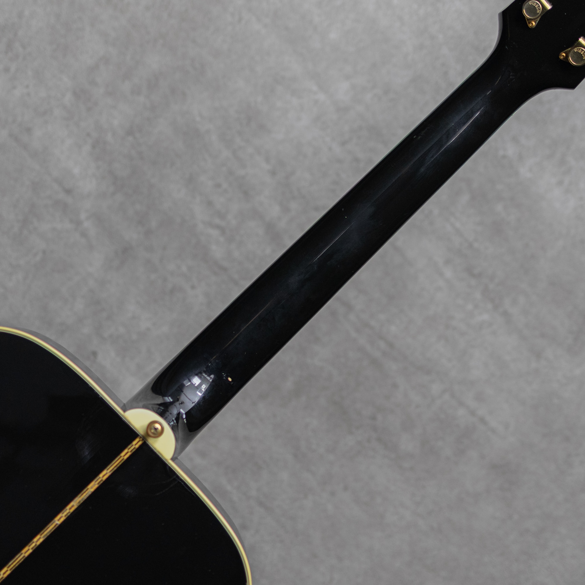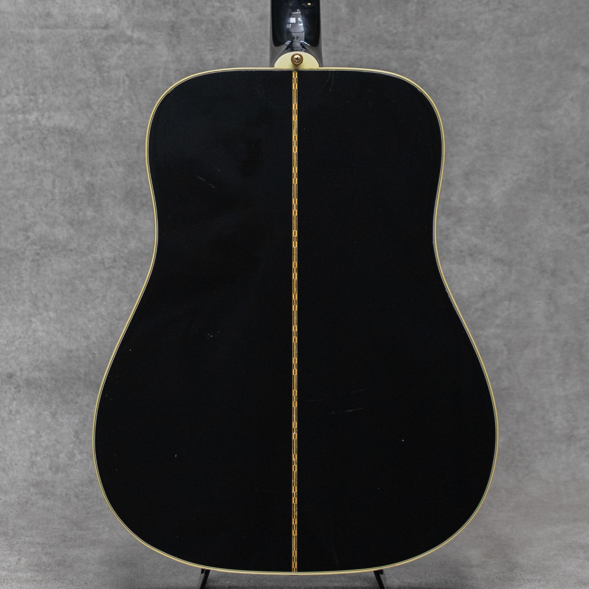 1960年に発売されたスクエアショルダージャンボモデルの”Hummingbird”に続き、上位モデルとして1962年にランナップされた”Dove”。上位モデルの証であるラージヘッドとメイプルを使用したボディに、鳩がインレイで描かれたピックガードが特徴で、そのまま名称の由来となっています。本器は1995年製USED品。クールなエボニーブラック、締った歯切れ良い響きが小気味良い1本。スプルーストップ、ボディ内にゆらめくフィギュアド杢が確認できるメイプルサイド&バック、メイプル3pcsネック、ローズウッド指板&ブリッジ、MOPクラウンヘッドインレイ、ゴールドロトマチックペグ、 MOP指板ダブルパラレログラムインレイ、”Dove"インレイラージピックガード、スキャロップドXブレイシング。奥深く響くジャンボサウンド。ドシっと低音の効いた箱鳴りをキレの良いアタックで刻むロックサウンド。他のジャンボモデルでは得られないダブならではの響きです。経年によるウェザーチェックや若干の小傷が見られる程度の本器。ブラックカラーならではの小傷が目立ちやす感じは否めませんが、30年の経年を鑑みると大きく目立つ傷もなく良好なコンディションの本器。ネックまわりも良好で、弾きやすいアクションをしっかりと保っています。過去にイントネーション改善のためにサドル溝の掘り直しが見られます。また過去にピックアップの取付履歴があり、現在はダミージャックが装着されています。ネックヒール部にストラップピン増設あり。経年も伴い弾きごろのプレイギア”Dove”。まだまだこれからガシガシと弾いていただきたい1本です。オリジナルハードケース付属
