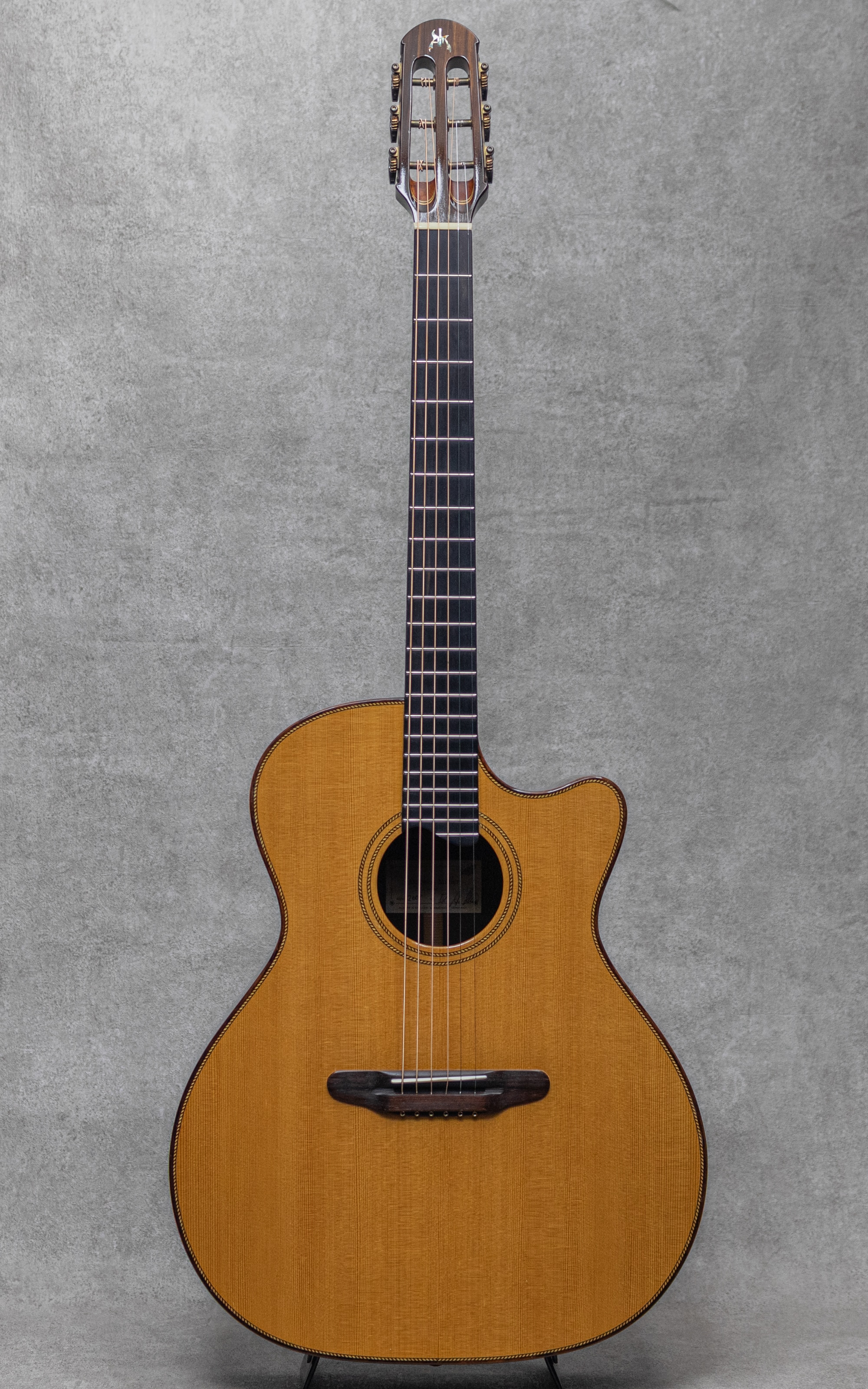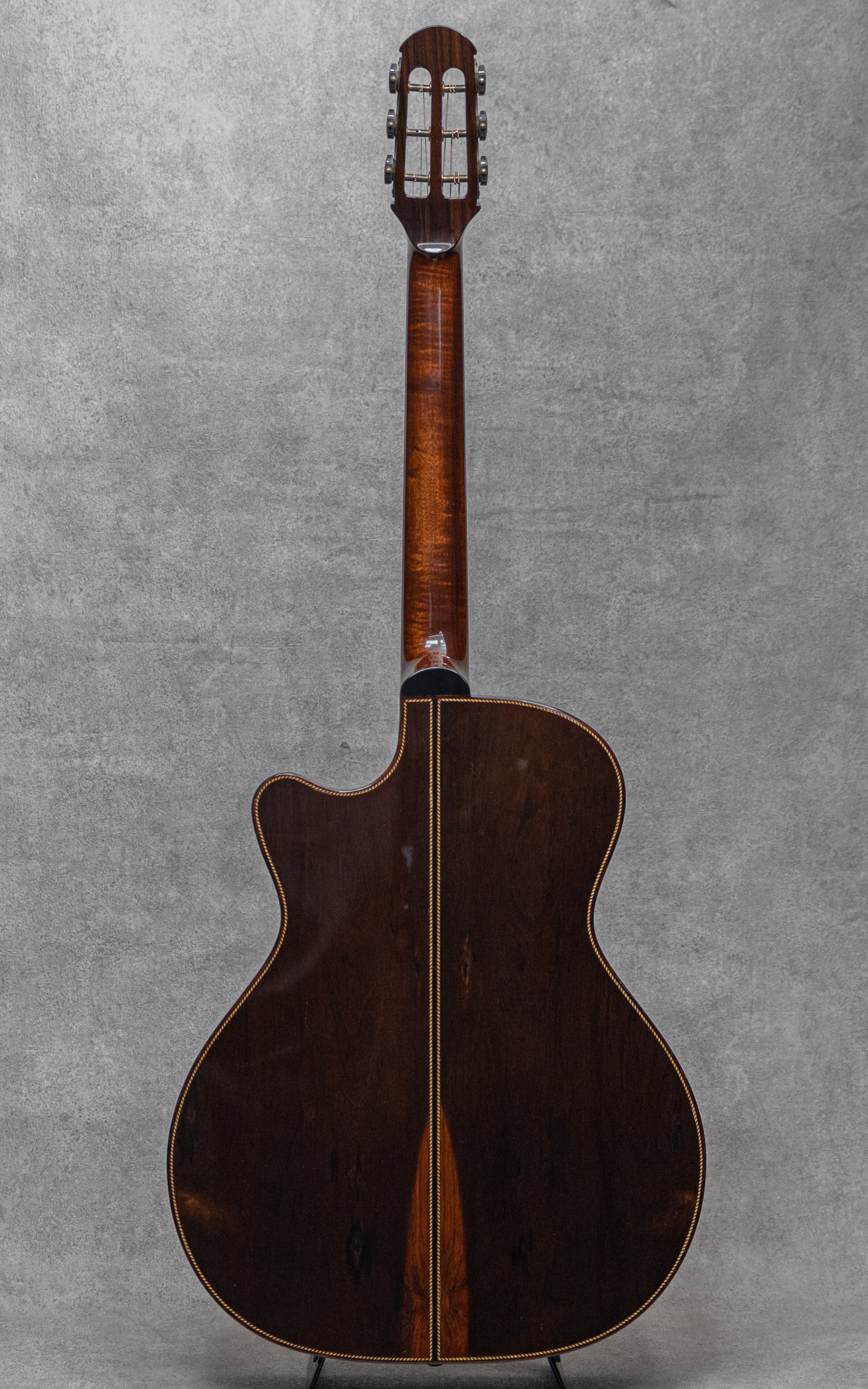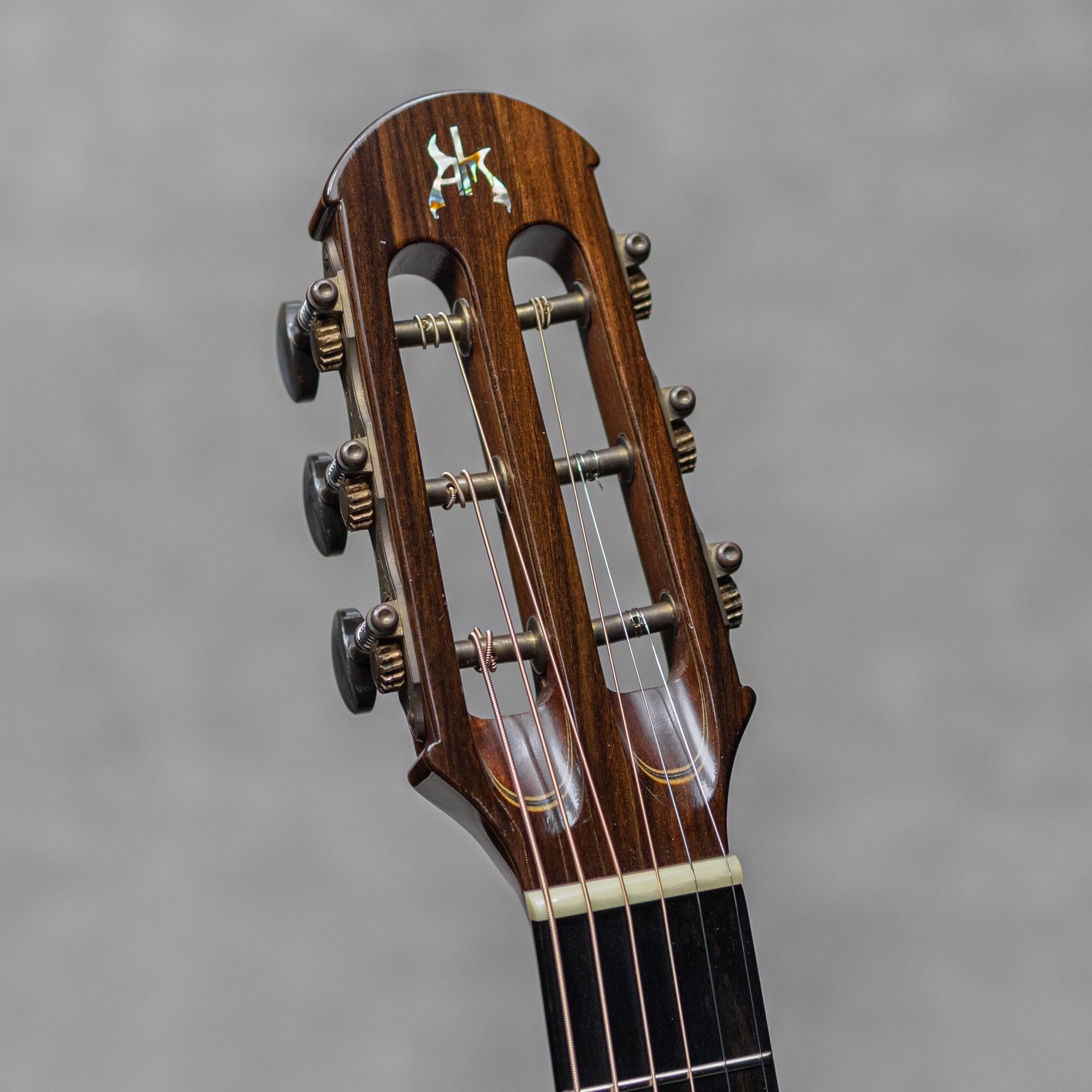 ドイツの産業発展に大きな役割を果たしてきた証とされる"マイスター"の資格を持つルシアー"Antonius Mueller(アントニウス・ミュラー)”。"Franz Ulrich Albert(フランツ・ウルリッヒ・アルベルト)”と”Albert&Mueller”を1984年に設立し、その中で自身でも製作を行なってきました。現在は息子と共に自身の工房にて製作をしています。本器はミュラー本人が手がけたフラグシップモデル”S-6 German Spruce / Jacaranda”。繊細で美しい響きのヨーロピアンサウンド。2008年製極上USED品。柾目痕がゆらめく上質なジャーマンスプルーストップ、淡い色味でワイルドな杢目のハカランダサイド&バック、マホガニーネック、エボニー指板、ハカランダブリッジ、アレッシチューナー/ブラックパールノブ、ロープロゼッタ&トリム、ハカランダバインディング、ベネチアンカッタウェイ。トップ構造はXとファンのオリジナルハイブリッドブレイシング。スキャロップを入れない代わりにそれぞれの棒が細く、力木はライニングに接触していません。入力タッチに対し、繊細かつダイレクトに反応する本器。クラシックギターも作る氏のギターならではの反応は、爪の当たる角度でのニュアンスまで体感できるトーン。そこに折り重なるふくよかで奥深い倍音は、しっかりと肉厚で色濃い音を楽しませてくれます。フィンガータッチでも十二分にその魅力を楽しんでいただけます。光にかざせば判断できる若干の使用感程度ととても良いコンディションを保った本器。目立つ打痕もなくノークラックの1本。ネック周りも良好で、弾きやすいアクションを保っています。過去にピックアップの取付履歴があり、エンド部が12mmに加工されています。現在はコンバージョンピンが装着されています。他に候補を探しにくい個性的なサウンドを持った、ソロギターにも向く上質な1本。是非お見逃しなく。ハードケース付属