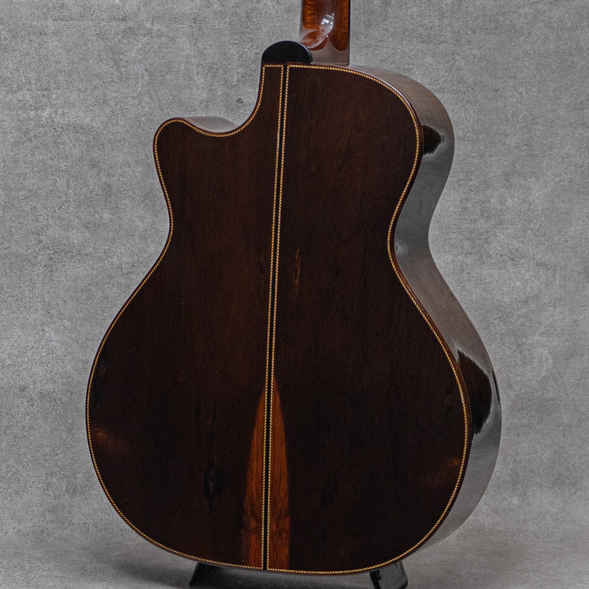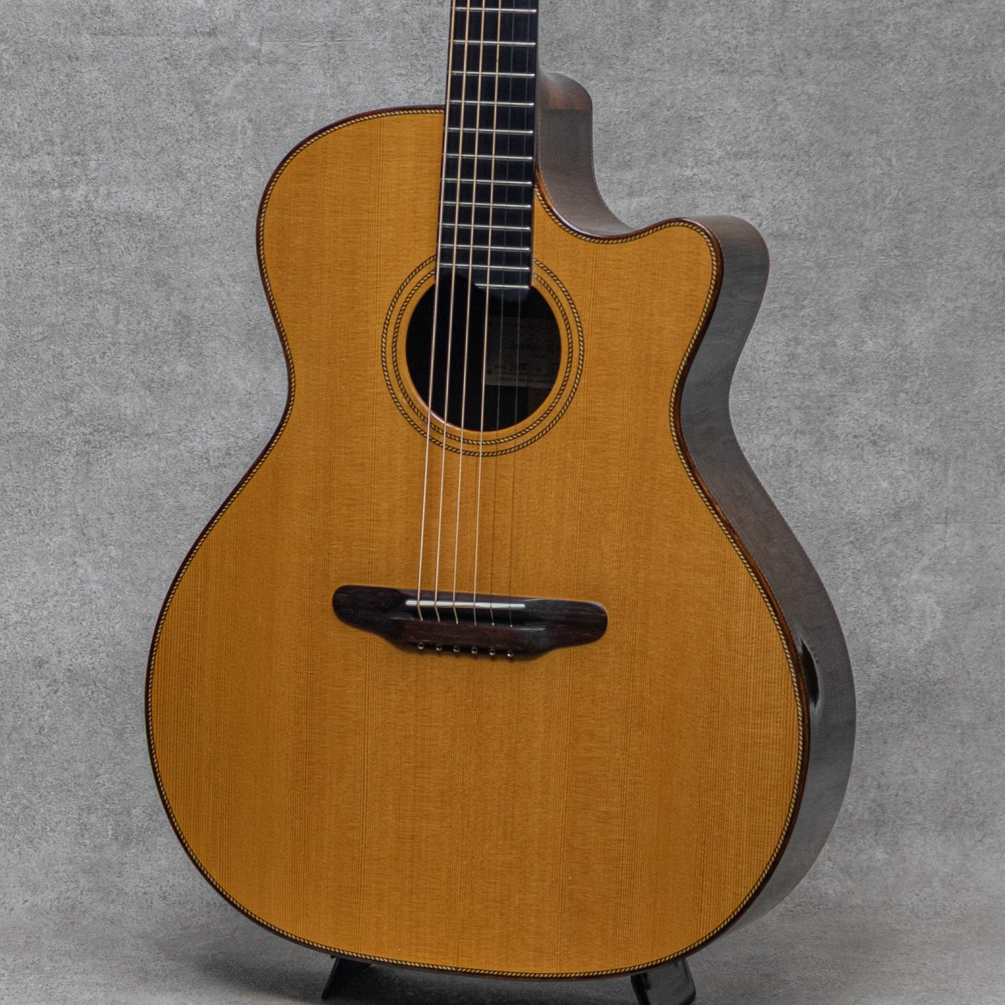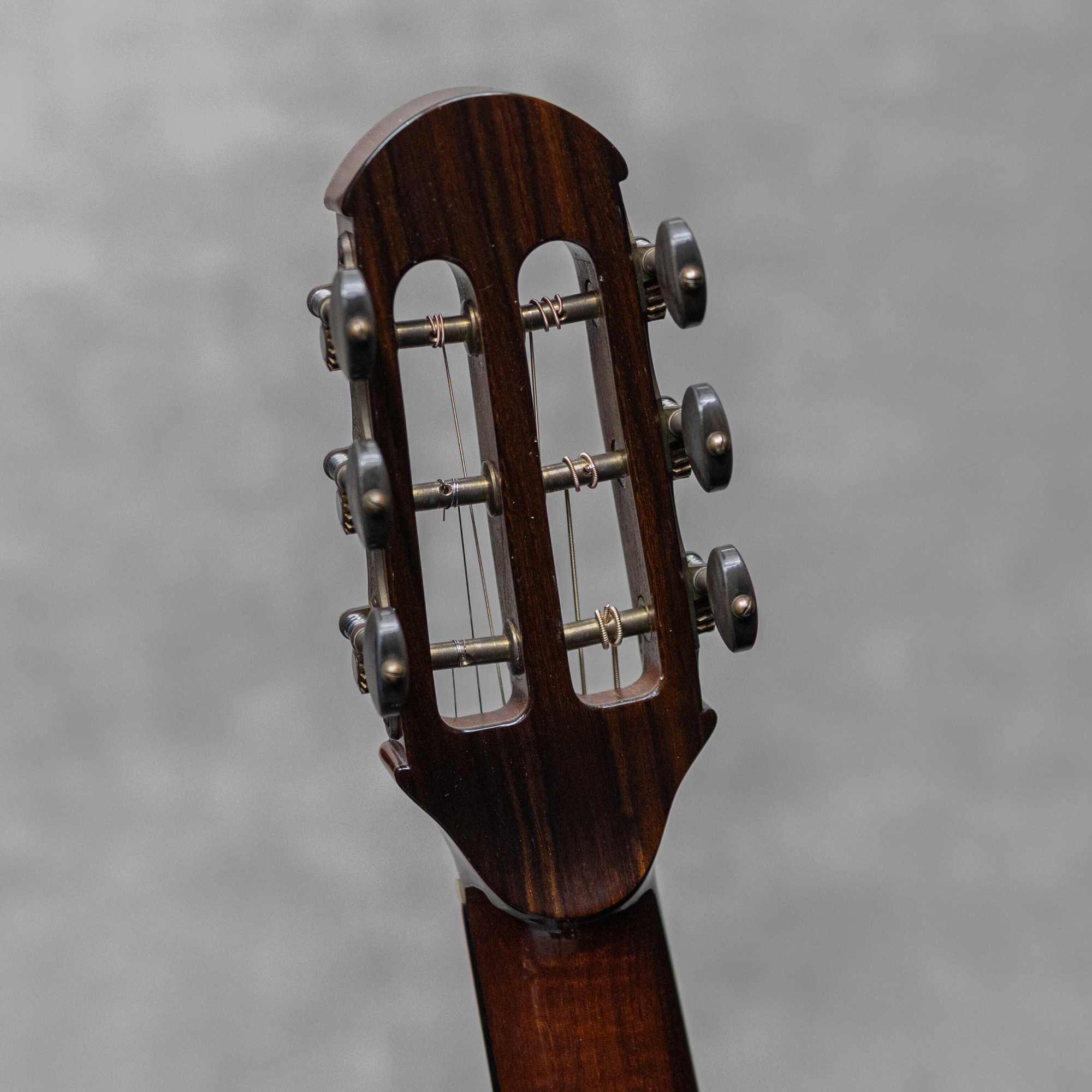 ドイツの産業発展に大きな役割を果たしてきた証とされる"マイスター"の資格を持つルシアー"Antonius Mueller(アントニウス・ミュラー)”。"Franz Ulrich Albert(フランツ・ウルリッヒ・アルベルト)”と”Albert&Mueller”を1984年に設立し、その中で自身でも製作を行なってきました。現在は息子と共に自身の工房にて製作をしています。本器はミュラー本人が手がけたフラグシップモデル”S-6 German Spruce / Jacaranda”。繊細で美しい響きのヨーロピアンサウンド。2008年製極上USED品。柾目痕がゆらめく上質なジャーマンスプルーストップ、淡い色味でワイルドな杢目のハカランダサイド&バック、マホガニーネック、エボニー指板、ハカランダブリッジ、アレッシチューナー/ブラックパールノブ、ロープロゼッタ&トリム、ハカランダバインディング、ベネチアンカッタウェイ。トップ構造はXとファンのオリジナルハイブリッドブレイシング。スキャロップを入れない代わりにそれぞれの棒が細く、力木はライニングに接触していません。入力タッチに対し、繊細かつダイレクトに反応する本器。クラシックギターも作る氏のギターならではの反応は、爪の当たる角度でのニュアンスまで体感できるトーン。そこに折り重なるふくよかで奥深い倍音は、しっかりと肉厚で色濃い音を楽しませてくれます。フィンガータッチでも十二分にその魅力を楽しんでいただけます。光にかざせば判断できる若干の使用感程度ととても良いコンディションを保った本器。目立つ打痕もなくノークラックの1本。ネック周りも良好で、弾きやすいアクションを保っています。過去にピックアップの取付履歴があり、エンド部が12mmに加工されています。現在はコンバージョンピンが装着されています。他に候補を探しにくい個性的なサウンドを持った、ソロギターにも向く上質な1本。是非お見逃しなく。ハードケース付属