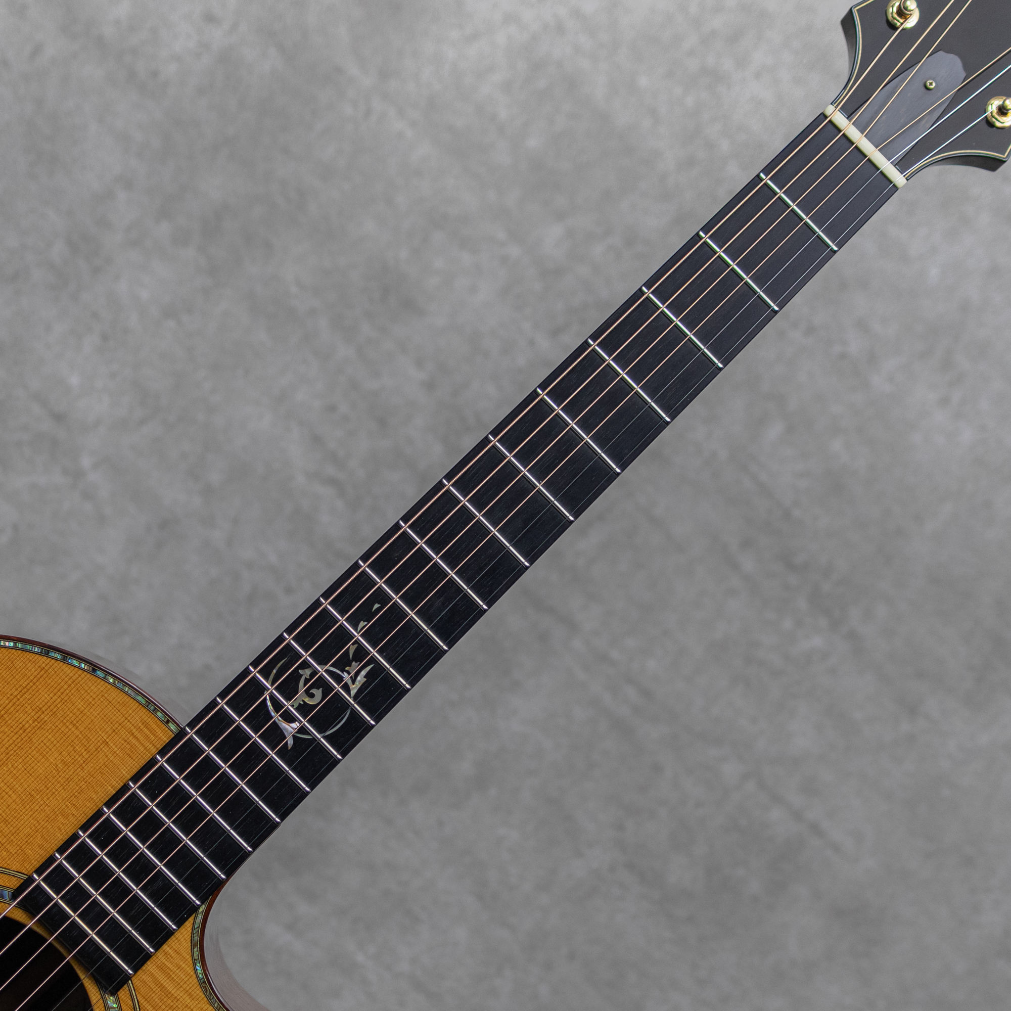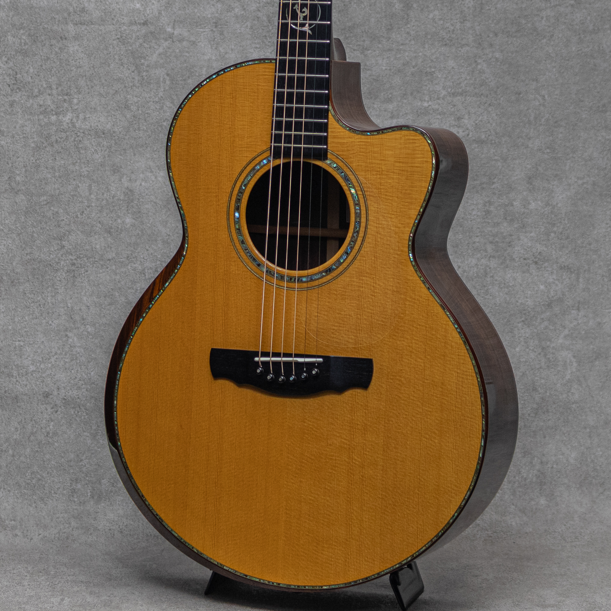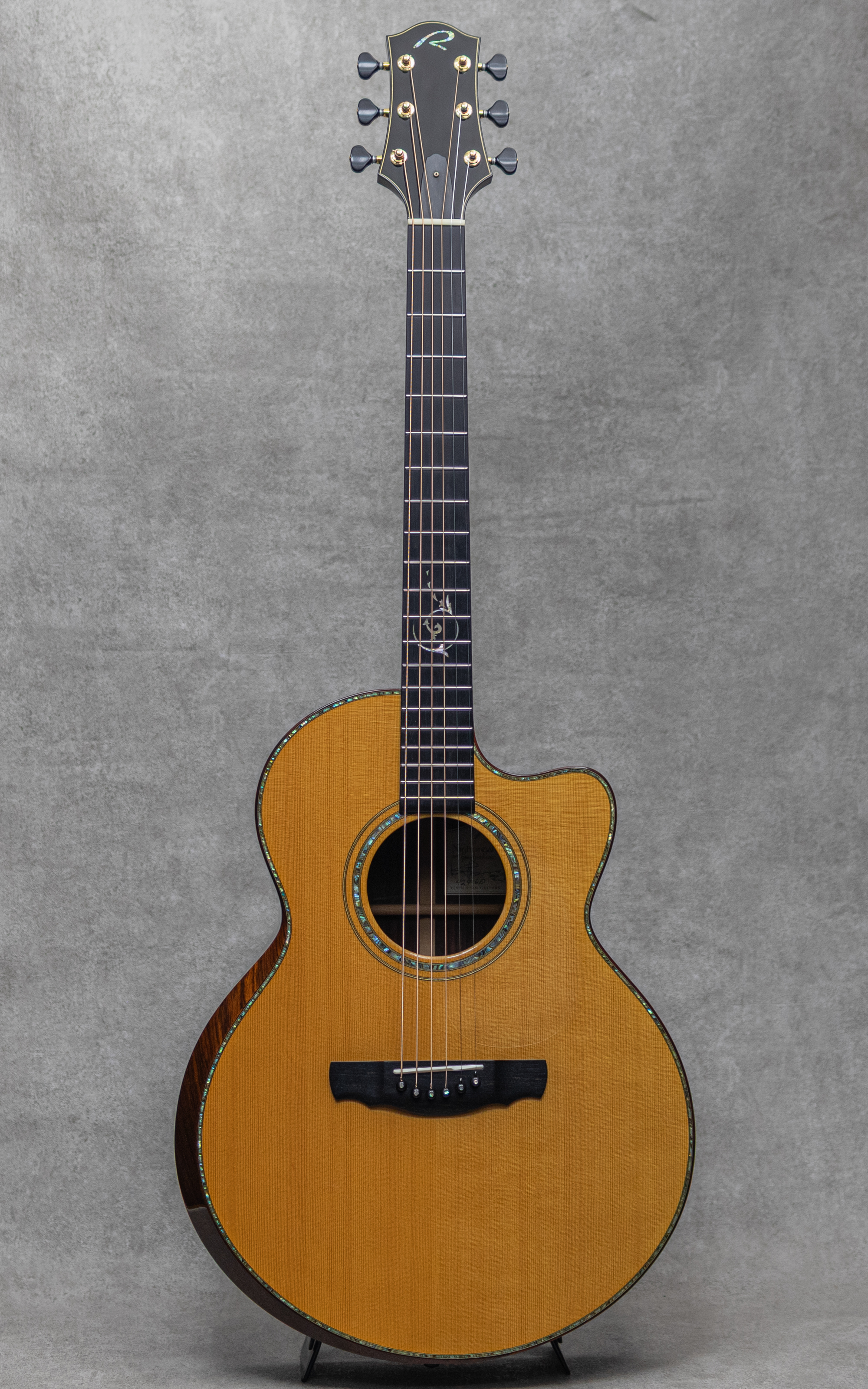 ギターの構造を三次元的な角度から研究するアメリカントップルシアー”Kevin Ryan(ケビン・ライアン)”。彼は前職が航空機開発研究という異色の経歴を持ちあわせる、人気・実力ともにアメリカを代表する製作家のひとりです。本器は、彼の出世作モデルのひとつでもある16"ボディの美しい流線型のアウトラインを持つ”Nightingale Grand Sololist Cutaway”。クールなアームベベル、ベネティアンカッタウェイを備えた1本。すでに高い完成度を持つ2004年製極上USED品。とても目の詰まった全面にゆらめく柾目痕が眩い極上のシトカスプルーストップ、真っ直ぐな美しい杢目のイーストインディアンローズウッド、ワンピースマホガニーネック、エボニー指板&ブリッジ、ゴトー製510ペグ、パウアシェルヘッドロゴ、アバロン指板フローラルインレイ、クリアピックガード、パウアシェルロゼッタ&トリムインレイ、パウアシェルバックストリップ、ベネチアンカッタウェイ、ベベルドアームレスト。トップ構造は平たいスキャロップド・エックスブレイシングを軸とした独自のパターンです。ロウワバウトにしっかりと容量を持たせた独特な美しいフォルムのライアン・ナイチンゲール。まんまるなロウワバウトはしっかりとしたトップ面積を確保し、豊かな低音と音域をもたらしてくれます。奥深く重厚に響く倍音、そしてそれに埋もれないロングサスティーンのトーン。野太く伸びやかに、そして艶やかに響く至極のトーンは、この時期からすでに確立され健在です。よく響きながらも重厚に響くライアンサウンド、フィンガータッチでも驚くほどの大音量で迫力のサウンドをしっかりと魅せてくれます。20数年の経年を感じさせない極上コンディションの本器。打痕や弾き傷など目立つ傷もなく良好、ネックヒールに若干のUV塗装の浮きが見られますが、剥がれ落ちの懸念もなく良好です。ネックまわりもとても良好で、弾きやすいアクションをしっかりと保っています。力強くワイドレンジに、かつ軽快でしっかりとしたレンスポンス。トップルシアー辿り着いたアメリカンルシアーギターの一端を体感できる逸品。ギター然とした弾きやすく高品位なサウンドを、是非お手元でご堪能ください。オリジナルハードケース付属