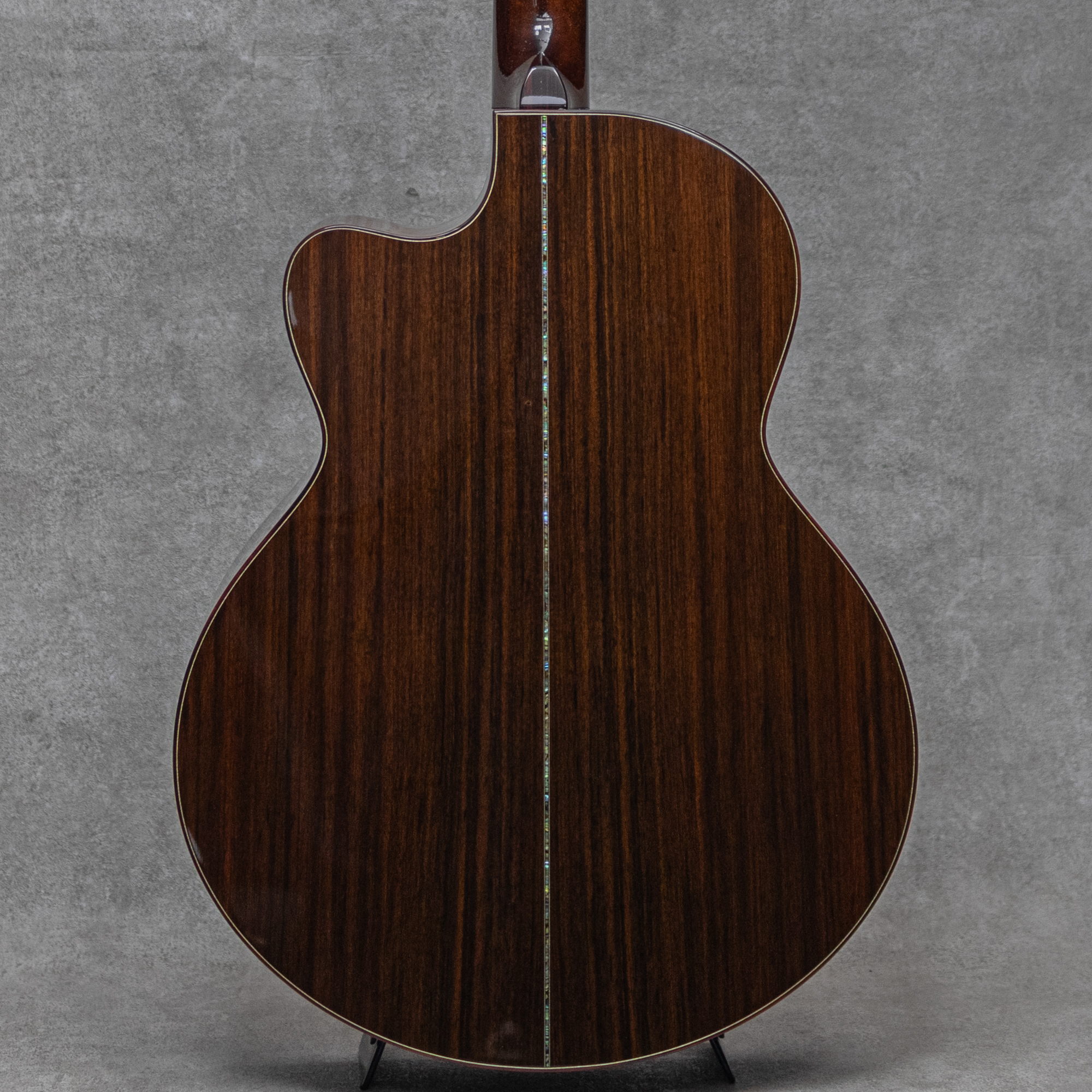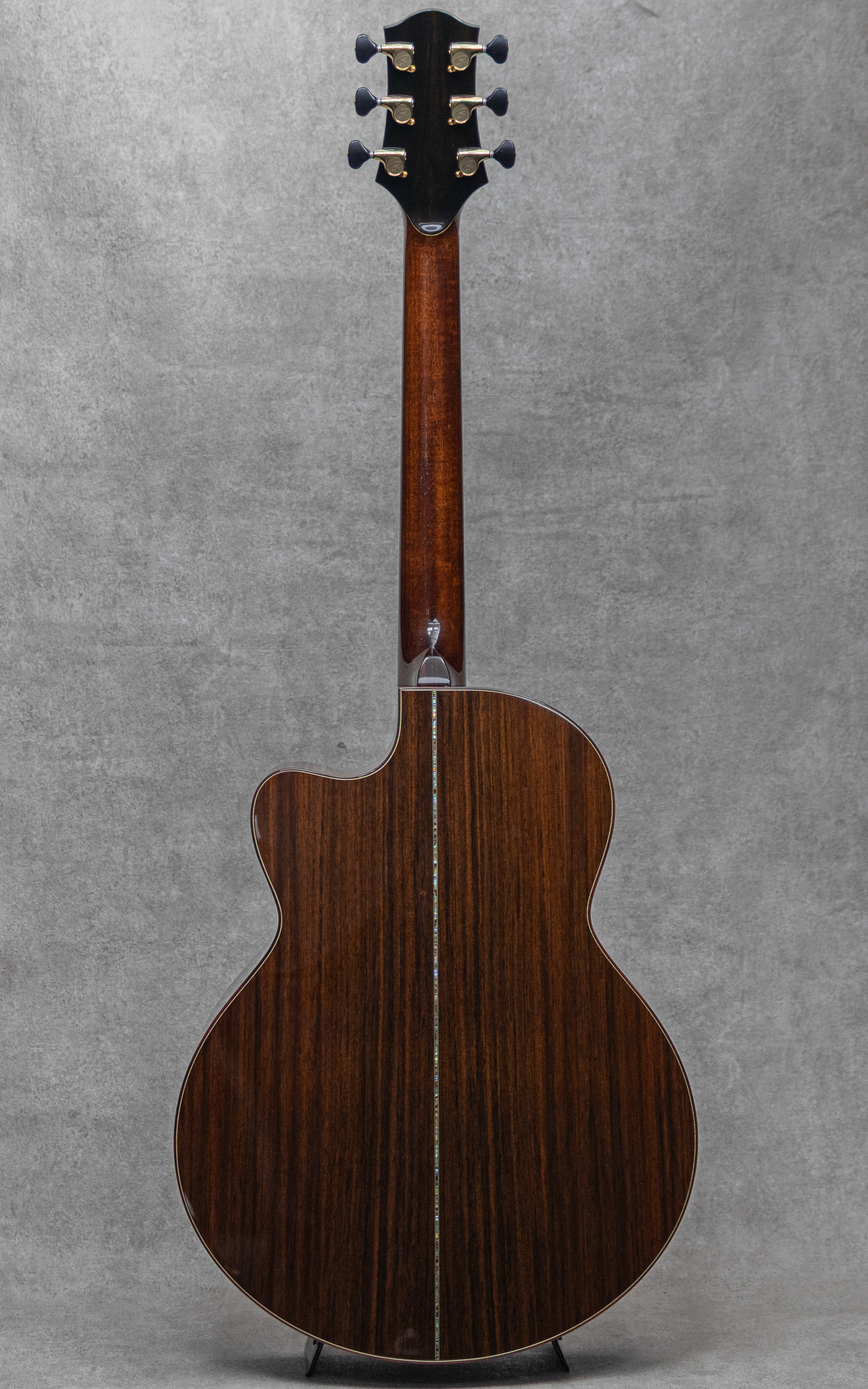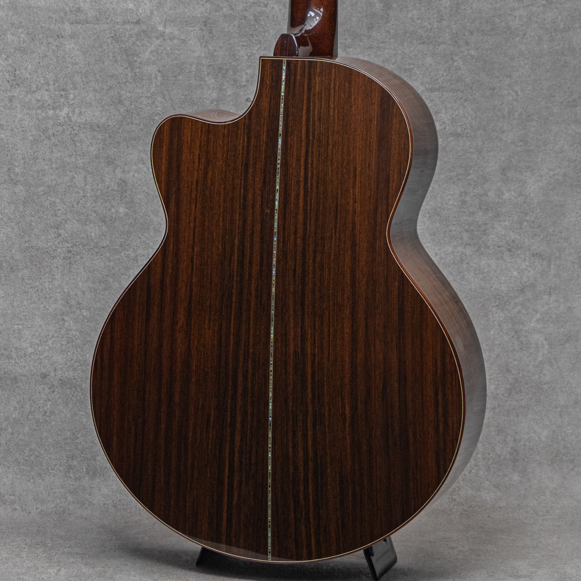 ギターの構造を三次元的な角度から研究するアメリカントップルシアー”Kevin Ryan(ケビン・ライアン)”。彼は前職が航空機開発研究という異色の経歴を持ちあわせる、人気・実力ともにアメリカを代表する製作家のひとりです。本器は、彼の出世作モデルのひとつでもある16"ボディの美しい流線型のアウトラインを持つ”Nightingale Grand Sololist Cutaway”。クールなアームベベル、ベネティアンカッタウェイを備えた1本。すでに高い完成度を持つ2004年製極上USED品。とても目の詰まった全面にゆらめく柾目痕が眩い極上のシトカスプルーストップ、真っ直ぐな美しい杢目のイーストインディアンローズウッド、ワンピースマホガニーネック、エボニー指板&ブリッジ、ゴトー製510ペグ、パウアシェルヘッドロゴ、アバロン指板フローラルインレイ、クリアピックガード、パウアシェルロゼッタ&トリムインレイ、パウアシェルバックストリップ、ベネチアンカッタウェイ、ベベルドアームレスト。トップ構造は平たいスキャロップド・エックスブレイシングを軸とした独自のパターンです。ロウワバウトにしっかりと容量を持たせた独特な美しいフォルムのライアン・ナイチンゲール。まんまるなロウワバウトはしっかりとしたトップ面積を確保し、豊かな低音と音域をもたらしてくれます。奥深く重厚に響く倍音、そしてそれに埋もれないロングサスティーンのトーン。野太く伸びやかに、そして艶やかに響く至極のトーンは、この時期からすでに確立され健在です。よく響きながらも重厚に響くライアンサウンド、フィンガータッチでも驚くほどの大音量で迫力のサウンドをしっかりと魅せてくれます。20数年の経年を感じさせない極上コンディションの本器。打痕や弾き傷など目立つ傷もなく良好、ネックヒールに若干のUV塗装の浮きが見られますが、剥がれ落ちの懸念もなく良好です。ネックまわりもとても良好で、弾きやすいアクションをしっかりと保っています。力強くワイドレンジに、かつ軽快でしっかりとしたレンスポンス。トップルシアー辿り着いたアメリカンルシアーギターの一端を体感できる逸品。ギター然とした弾きやすく高品位なサウンドを、是非お手元でご堪能ください。オリジナルハードケース付属
