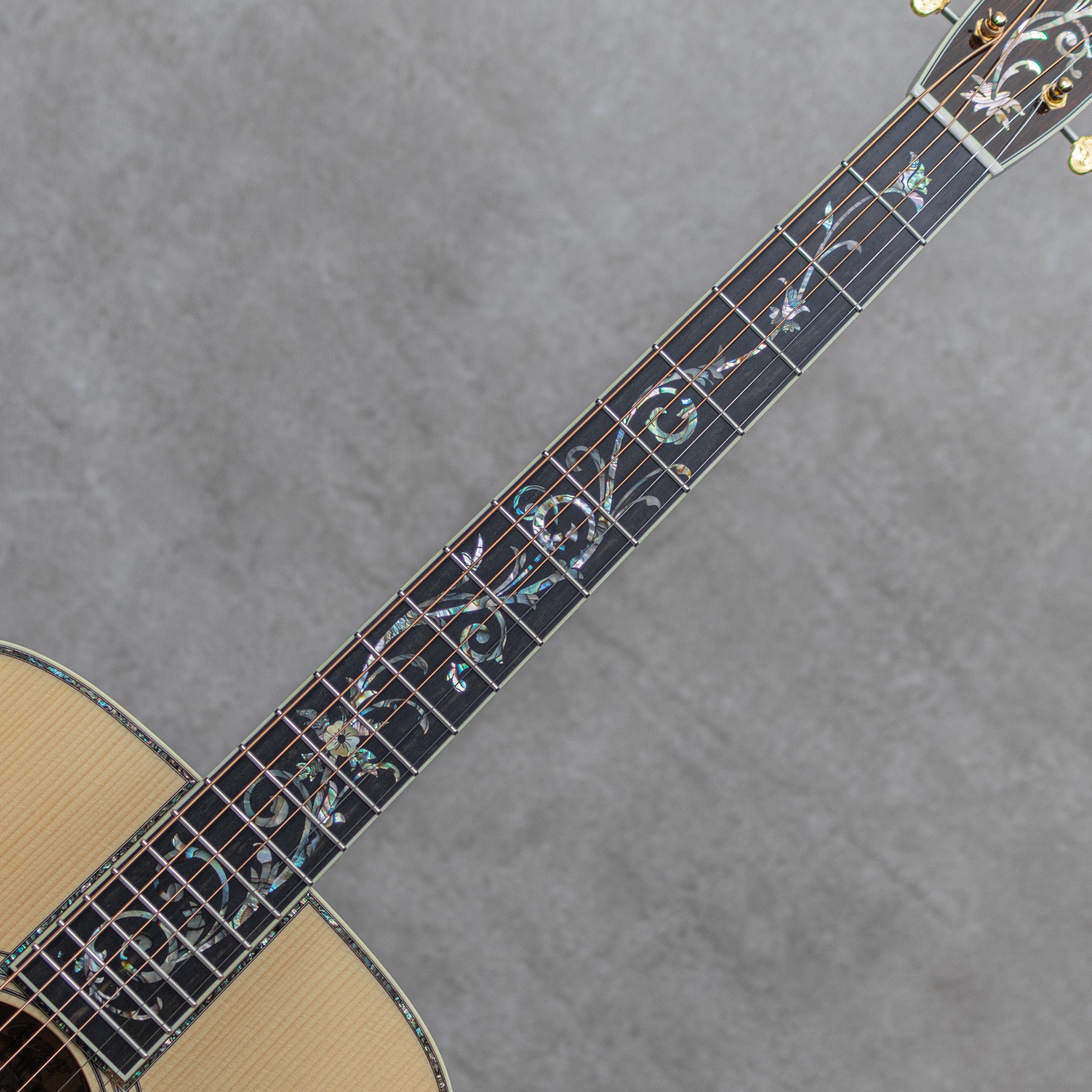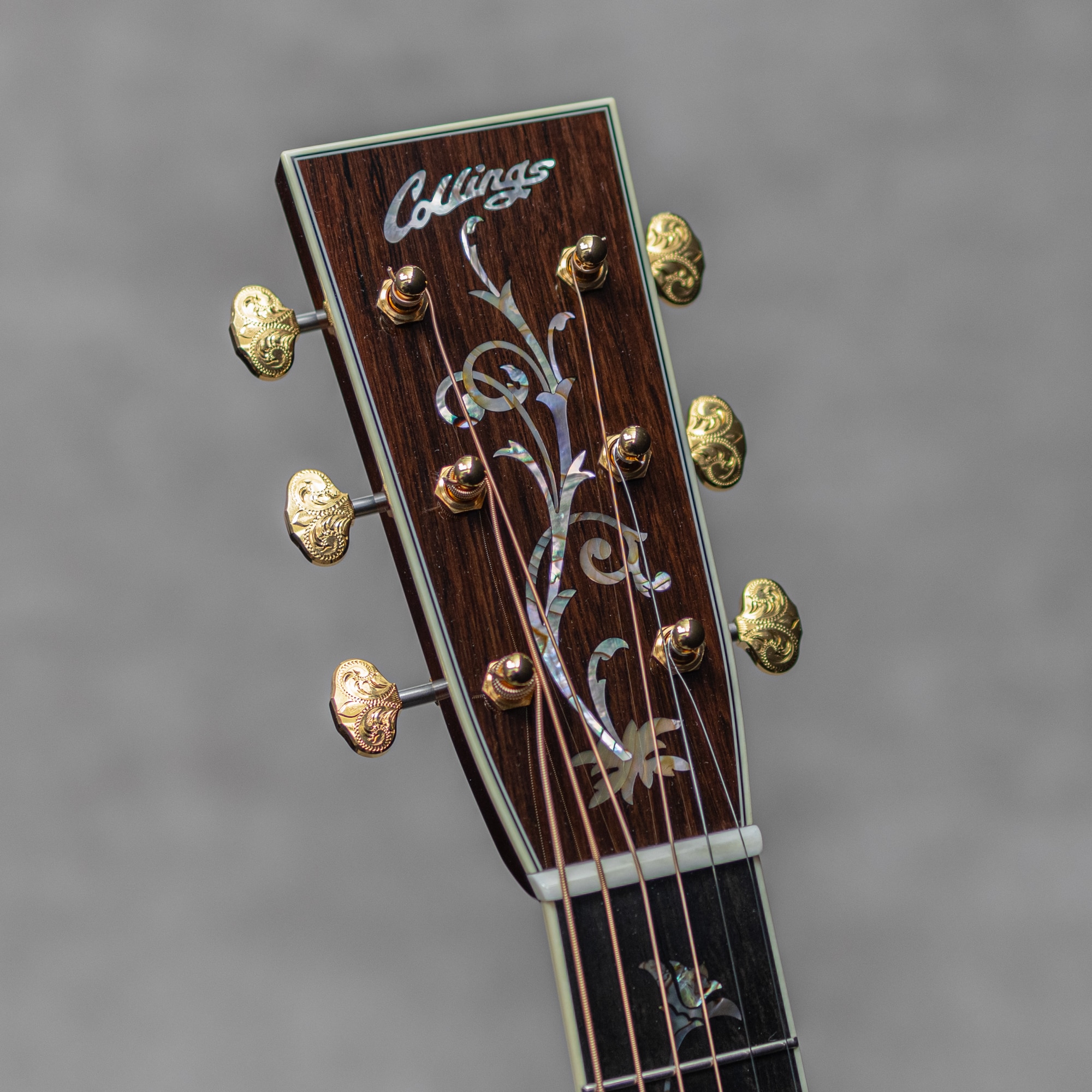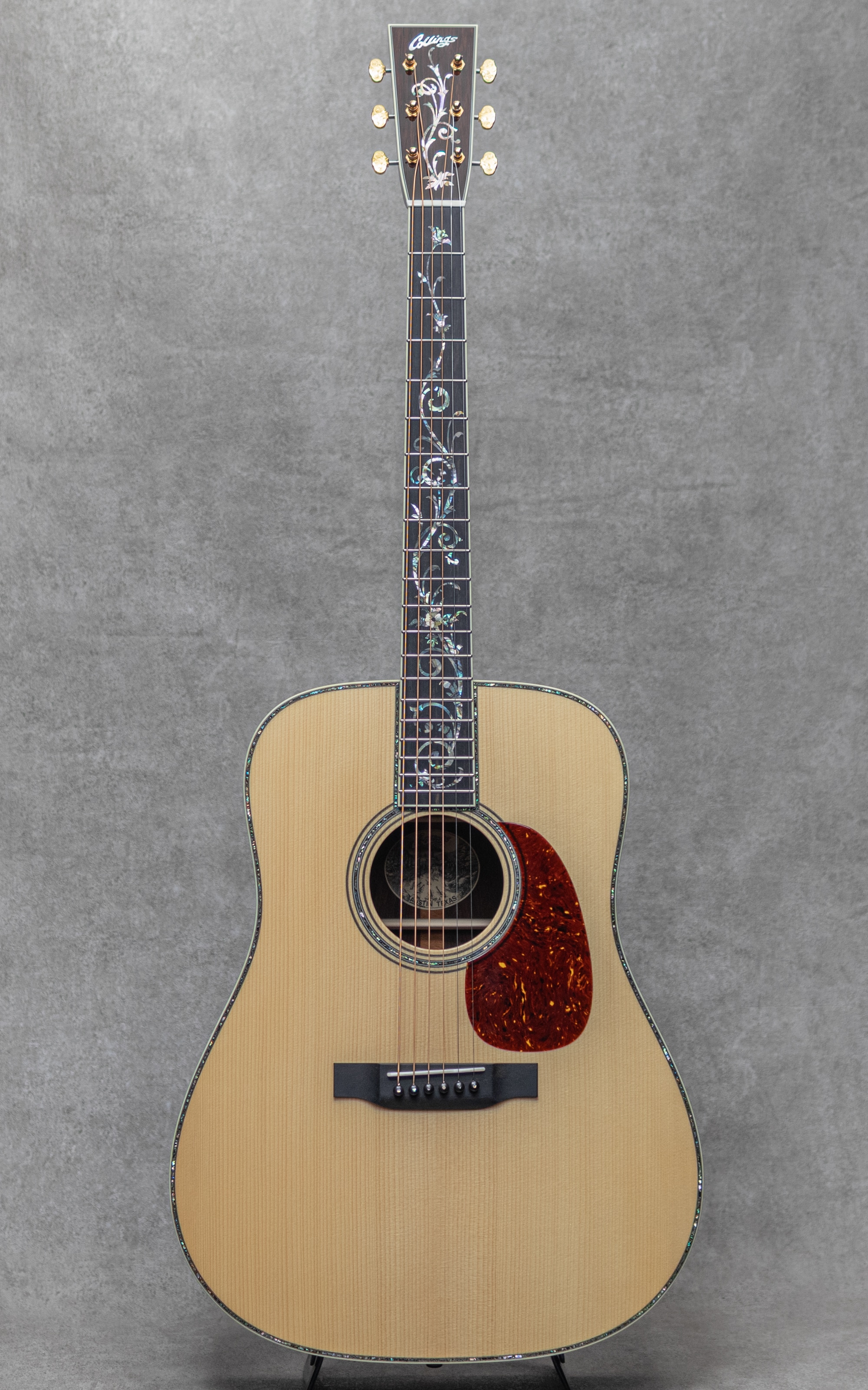 世界的にもっとも高い評価を得ているブランドの一つであるコリングスギター。コリングスの高く保たれたその完成度は、プレイヤーがその楽器を手に持つだけで見惚れてしまう美しさを持ち、音を出せば納得する響きを放ちます。本器は”D3”をベースに豪華なオプションを盛り込んだマスターピース、"D42MRA "Tree Of Life" Adirondack Spruce / Madagascar Rosewood -MIKI 200th Anniversary-“。弊社三木楽器株式会社の創立200周年を迎えるにあたり、特別モデルをオーダーさせていただいた記念モデルの1本。目幅が均一で全体に柾目痕のゆらめく柔らかな木肌の極上アディロンダックスプルーストップ、黒々としたワイルドな杢目でハカランダ杢がクールな極上のマダガスカルローズウッドサイド&バック、ホンジュラスマホガニーネック、エボニー指板&ブリッジ、カスタツリーオブライフ指板インレイ、カスタムバインペグヘッドインレイ、42スタイルアバロントップパーフリング、ウェバリー彫金オープンバックペグ、べっ甲柄セルロイドピックガード、アイボロイドバインディング、モザイクバックストリップ、アディロンダックブレイシング、戦前マーチンスタイルをもとにしたオリジナルスキャロップドXブレイシング。柔らかで広いサウンドレンジの響き渡るサウンド。そしてそれを大音量で再生する高いポテンシャル。倍音に富み、硬さを全く感じさせないトーンで、輪郭がありながら野太く轟き、軽くストロークするだけで奥から溢れ出る大音量がとても積もなく心地よい本器。アディロンブレイスの恩恵か、サスティンにも倍音を孕む至極のトーン。新品時でこの完成度は驚きの一言です。ここ数年のコリングスのスタンダードシリーズはとても完成度が高く、ある種の完成の域を感じさせる出来栄え。一時期に謳われた"カタイ"サウンドはもう過去の遺物で、しっかりと倍音を含みながら、方向性として凛としたサウンドを聴かせる完成度の高い楽器に仕上がっています。2017年にビル・コリングス氏が亡くなられ、最初期よりのマスタービルダー・ブルース・ヴァンワート氏も引退となり、着実に若い世代へと引き継がれていくコリングス。しかしながらその不安を根こそぎ払拭してくれるこの完成度。弊社のアニバーサリーモデルを同じ時代で共にできたことは何よりも嬉しく、感慨深い1本に仕上げてくれました。ブレない高い志を持つ現役世代のコリングスが産み出す至極の逸品。お見逃しなく。。
