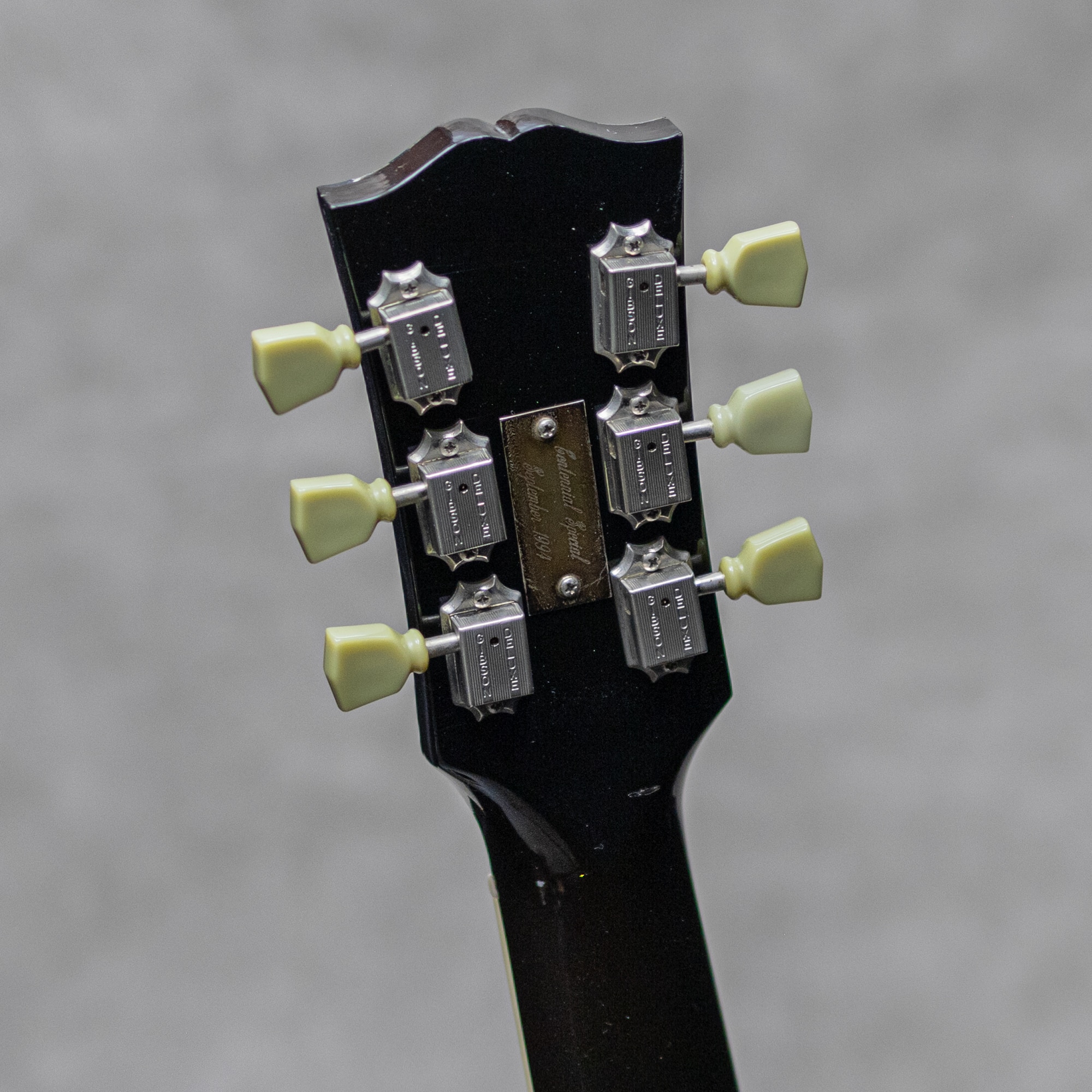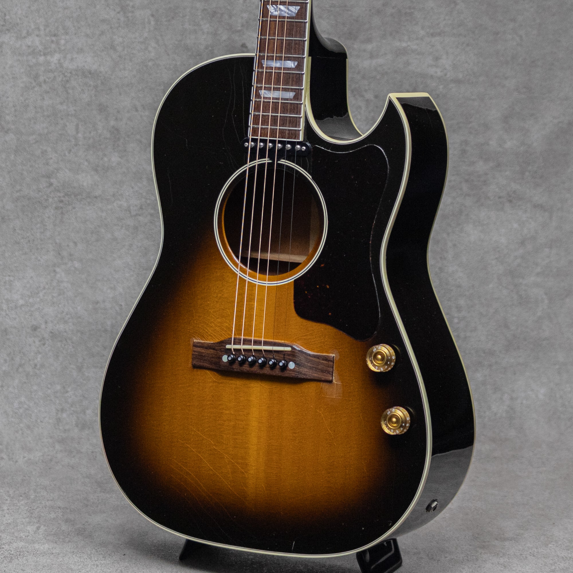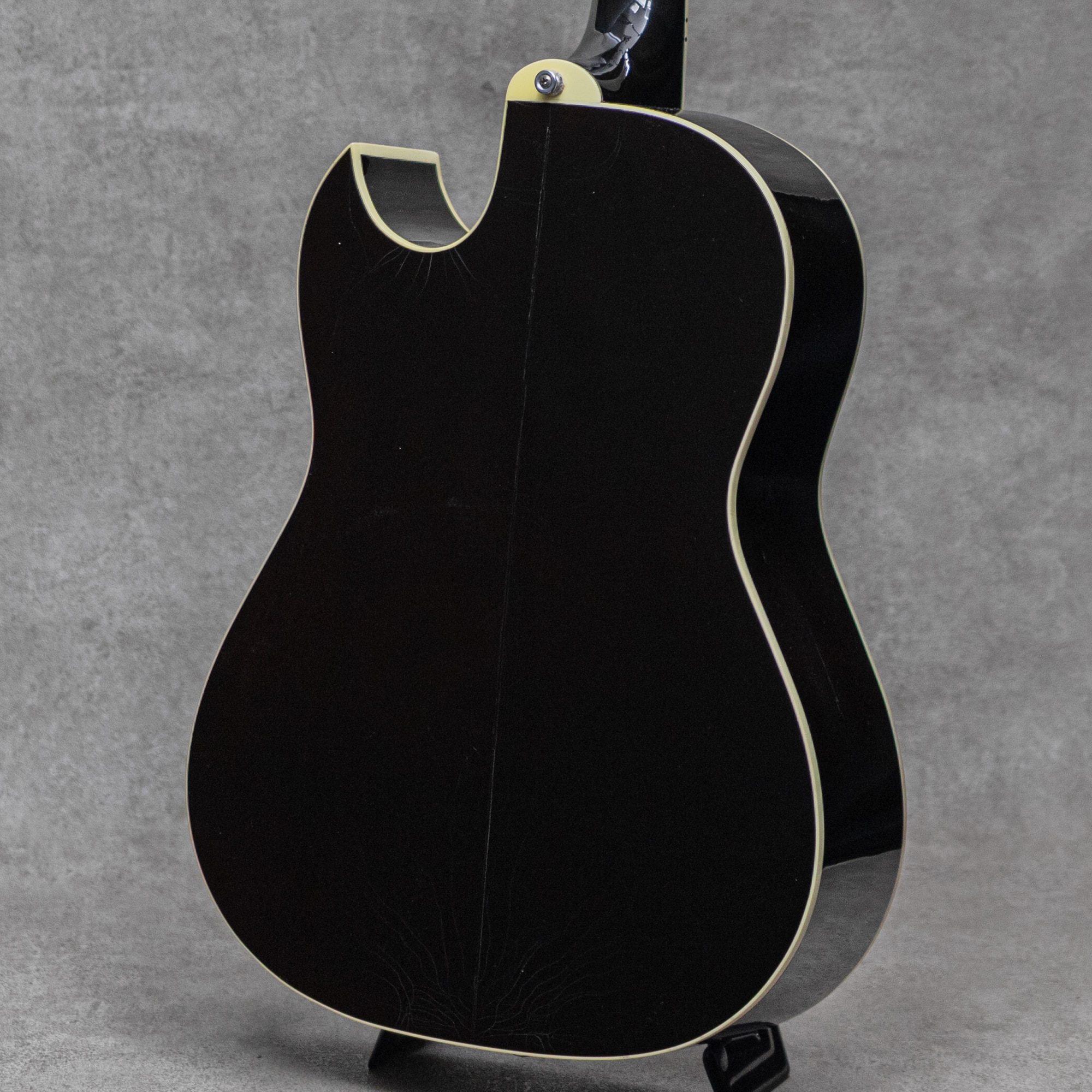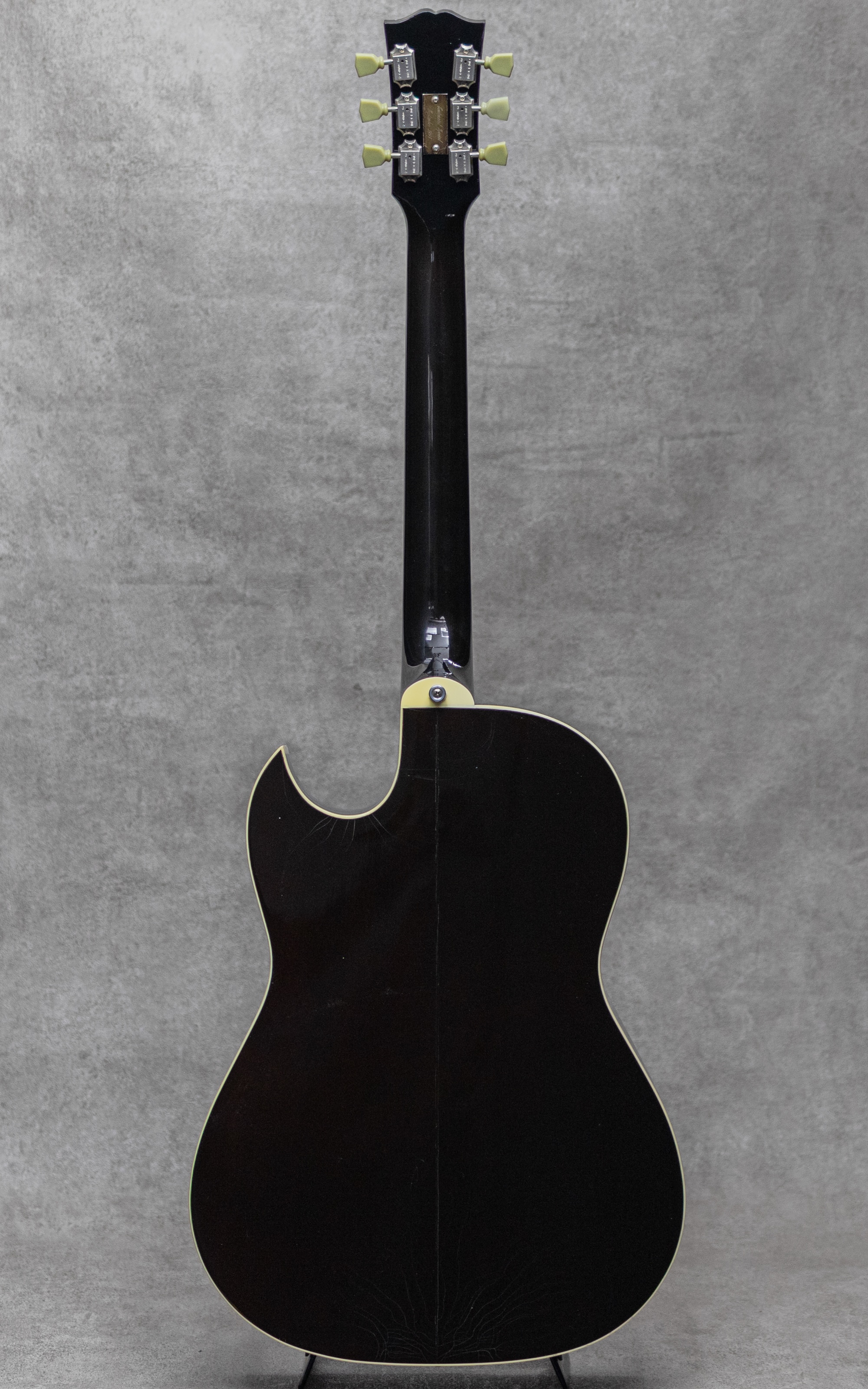 "Gibson Centennial Collection”。1994年にGibson100周年を記念して企画され、Nashville・Montanaのそれぞれの工場にて各月12モデル・各モデル100本づつの製造がされたGibson全体で盛り上げられたアニバーサーリーモデルです。本器は、Montana工場の9月モデルにラインナップされた1本、”1950 CF-100E”。”CF-100E”は1951年の発表からおよそ10年弱と短命に終わってしまった"J-160E"と並ぶギブソンエレアコの原点。前年1950年に発売されたXブレイシングを持つカッタウェイフラットトップモデルの”CF-100”にP-90ピックアップを搭載し登場しました。スプルーストップ、マホガニーサイド&バック、マホガニーネック、ローズウッド指板&ブリッジ、べっ甲柄ピックガード、ギブソンシールドバックデラックスペグ、ヘッドクラウンインデイ、指板パーロイドディッシュインレイ、P-90ピックアップ、フローレンタインカッタウェイ、”Centenial Special"メタルプレート。LGシリーズと同じく小振りなボディサイズながらスキャロップド・Xブレーシング、オール単板仕様となっておりしっかりとした生音で楽しめる本器。奥深く響く泥臭いサウンド。小気味よくもマディな響きはブルージーに楽しめます。経年によるウェザーチェッキングやブリッジまわりの塗装浮き若干の小傷は見られますが、大きく損なう傷みはなく良好な本器。ネックまわりのコンディションも良好で、弾きやすいアクションを保ちながらサドルマージンをしっかりと残してくれています。あまり見かけない90年代Montanaモデルですが、経年も相まって弾き頃の1本。さらにセンテニアルコレクションの1本、是非お手元でお確かめください。ハードケース付属
