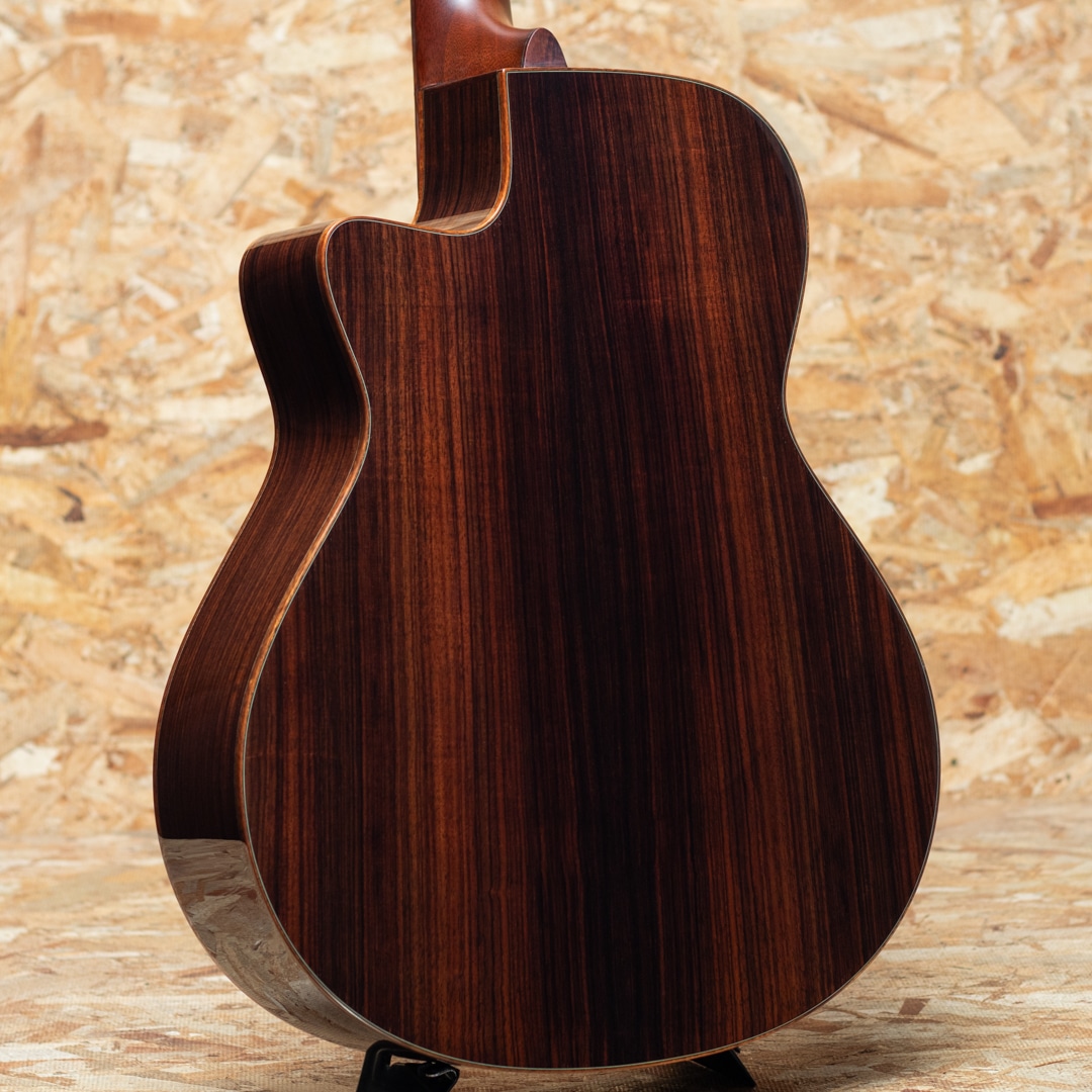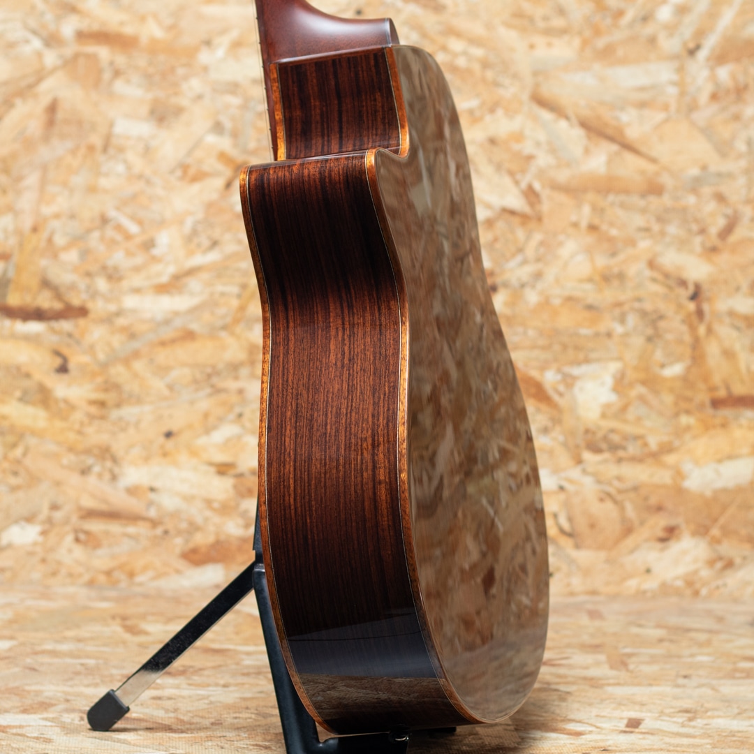 フィンガーピッカー向けに開発されたモーリスSシリーズを基に新たなSサウンドを探求し進化を遂げたSEシリーズ。半手工ラインにて製造される国産モーリスギターは各セクション毎に熟練したスタッフによって製造されています。本器はスプルーストップ、インディアンローズウッドサイド&バックの”SE-103”。マホガニーネック、エボニー指板、リッチライトブリッジ、ゴトーペグ。ボディシェイプはそのままでトップのXXブレイシングをフォワードシフテッドXに、バックのXブレイシングをラダーブレイシングに変更。バック形状はラウンドバック・スタイルからフラットバック・スタイルに変更しており豊かな鳴りとバランスの取れたサウンドを実現しています。ボリュート加工や新しいネックシェイプ、ハイポジションでの演奏性をさらに高めるためにネックヒールのエッジを丸くしたりとサウンド面でだけでなく演奏面等での拘りも感じられます。新たな進化を遂げたSEシリーズ。ぜひお試しください。オリジナルハードケース付属。