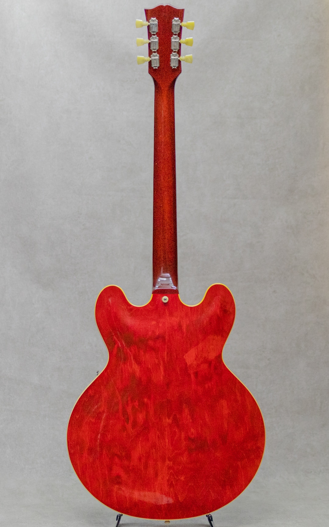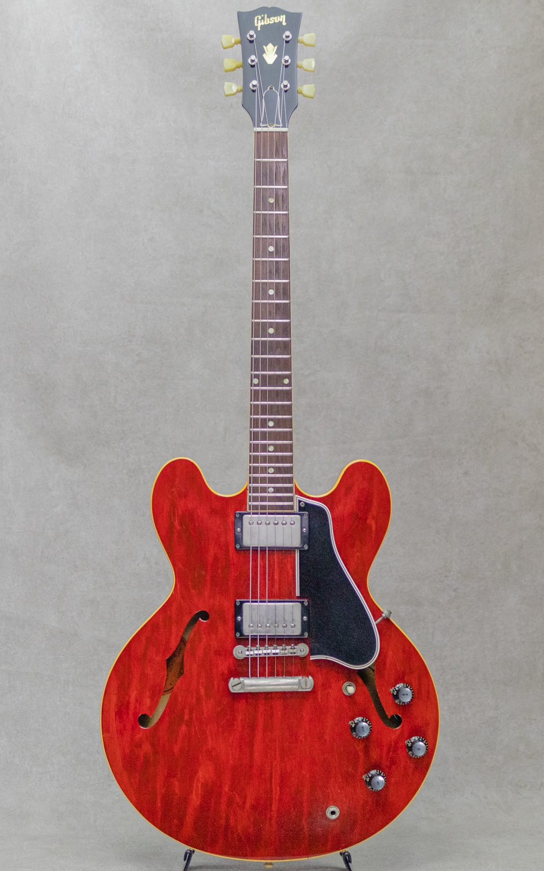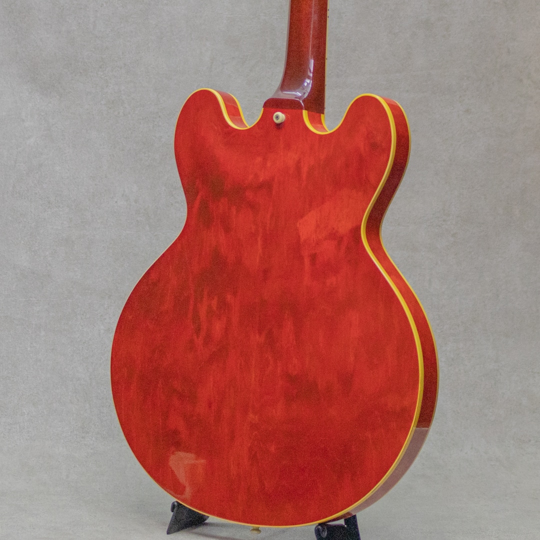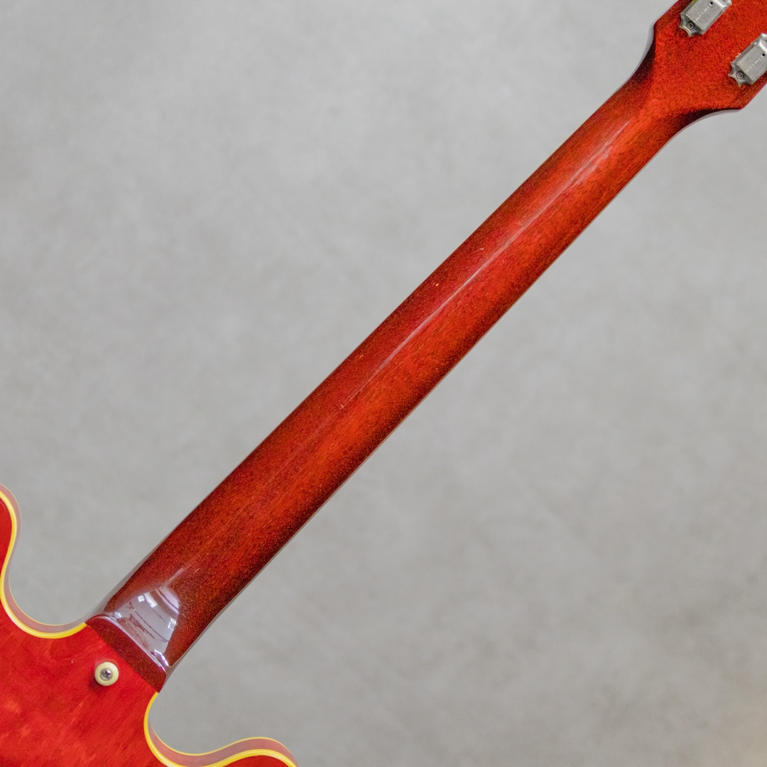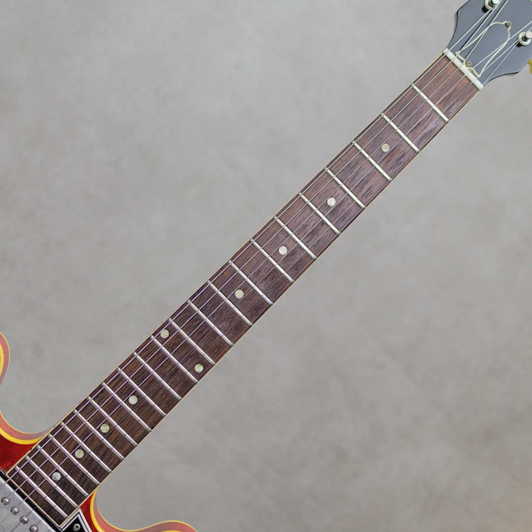 不朽の傑作、Gibson “ES-335TD”。ホロウ構造のシンボディにセンターブロックを合わせたセミアコースティックギターとして、1958年に発売されてよりセミアコモデルの代名詞として数多くのミュージシャンによりそのサウンドが残される銘器中の銘器です。本器は、1960-61年頃に製造された”ES-335TDC”。驚くほど美しいコンディションを保ったエクセレントコンディションの1本。ボディシリアルが”R”シリアルで60年製造レンジ、オレンジラベルの”A”ナンバーが61年1月出荷レンジになります。335ファンの中でも絶大の人気を誇る”Watermelon Cherry”の本器。レスポールのボディカラーで使用されていたアリニンダイ染料で生地着された独特の鮮やかなカラーは、以降のチェリーとは異なる鮮やかで透明感のあるチェリーカラーを魅せてくれるドリームギアです。ラミネイトメイプルを用いたホロウボディに合わせるメイプルセンターブロック、セルロイドバインディングを持つマホガニーネックにハカランダ指板、ドット指板インレイ、Gibsonロゴ&クラウンヘッドインレイ、オリジナル"2コブ"シングルラインクルーソンデラックスペグ。細身でとても弾きやすい薄手なネックシェイプの本器。ピックアップは、オリジナル”P.A.F"の”PU-490”ハムバッキングPUx2が搭載されています(フロントPUのステッカーは剥がれてしまっていますが、交換跡は見られずリアとも同質です)。ABR-1ブリッジ、アルミストップテイルピース、CRL製POT、ブラックビューティコンデンサー、ベベルドプライのロングピックガード、エスカッション、リフレクターノブなどのパーツはオリジナルをストックと、パーフェクトなコンディションです。335独特の少しミドルの抑えられたこれぞ正しくのサウンド。色気と艶があり、伸びやかなサスティンは決してくたびれておらず、元気で良いビンテージサウンドをもたらしてくれます。フレット残りは少し低めですが、ネックコンディションもとても良好で、ハイフレットまで音詰まりもなくスムースにプレイいただけます。若干の小傷は見られますが、目立つ打痕や塗装剥がれもなく、まさにビンテージミント。なによりも赤の色飛びがほとんどなく、新品のような鮮やかな色味を魅せてくれます。ドットインレイ&ロングガードのウィーターメロンは製造数も極僅か。その中でもオリジナルストップテールはさらにその半分ほど。コンディション・サウンド、そしてスペック。全てにおいてマスターピースの1本、まさにドリームギアです。本体同様にグッドコンディションのオリジナルブラウンハードケースが付属します。