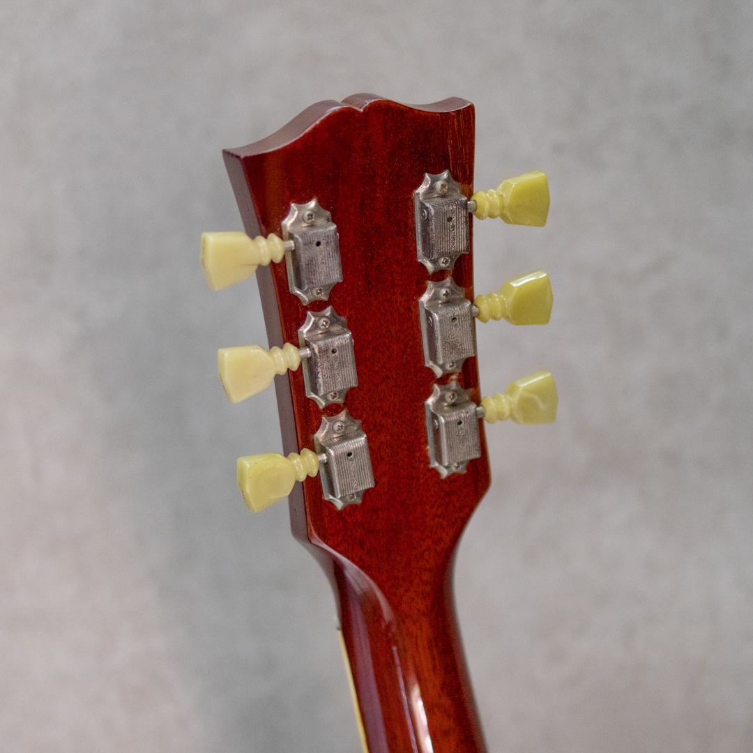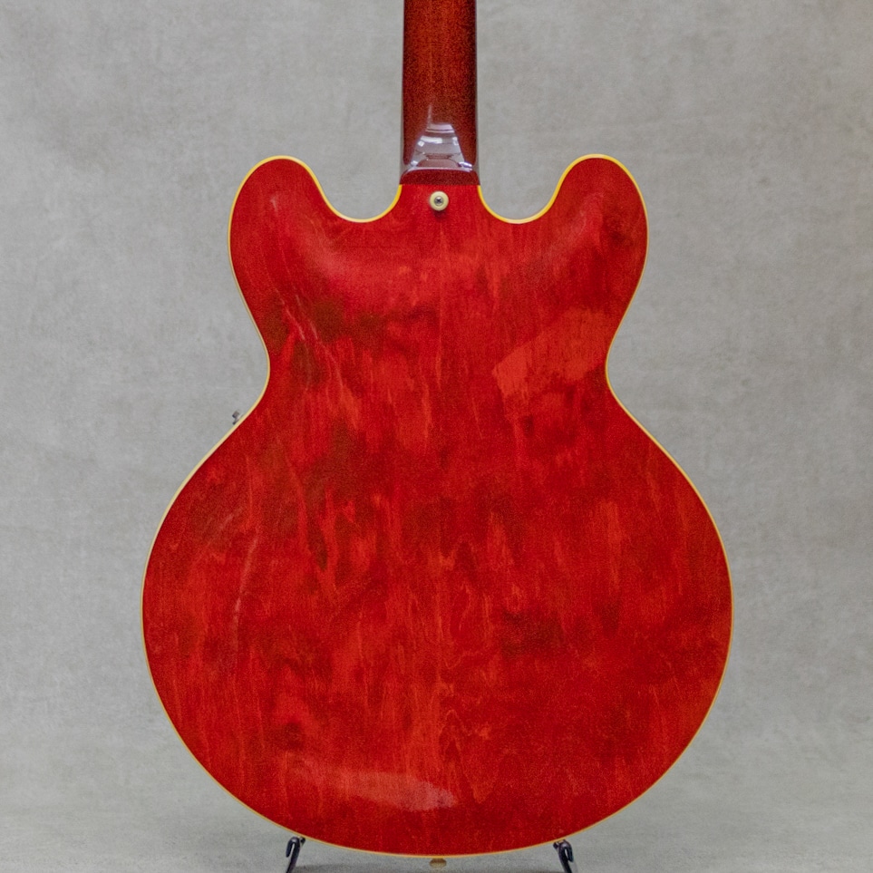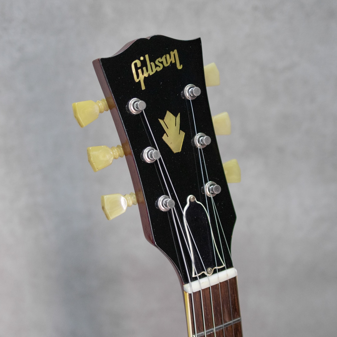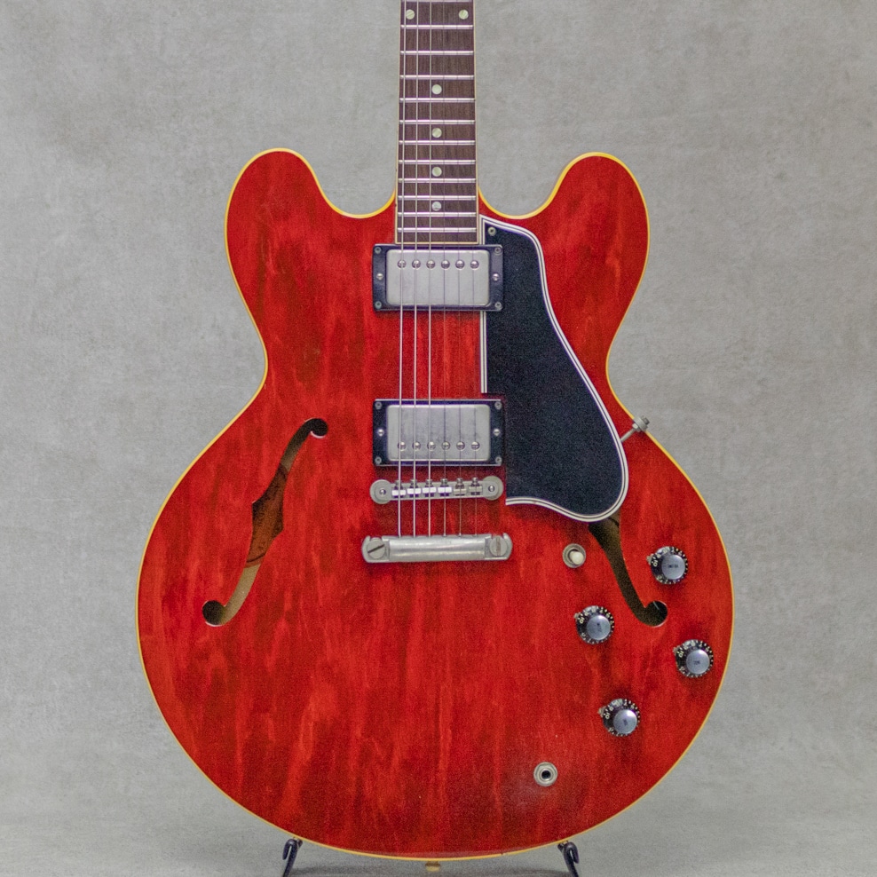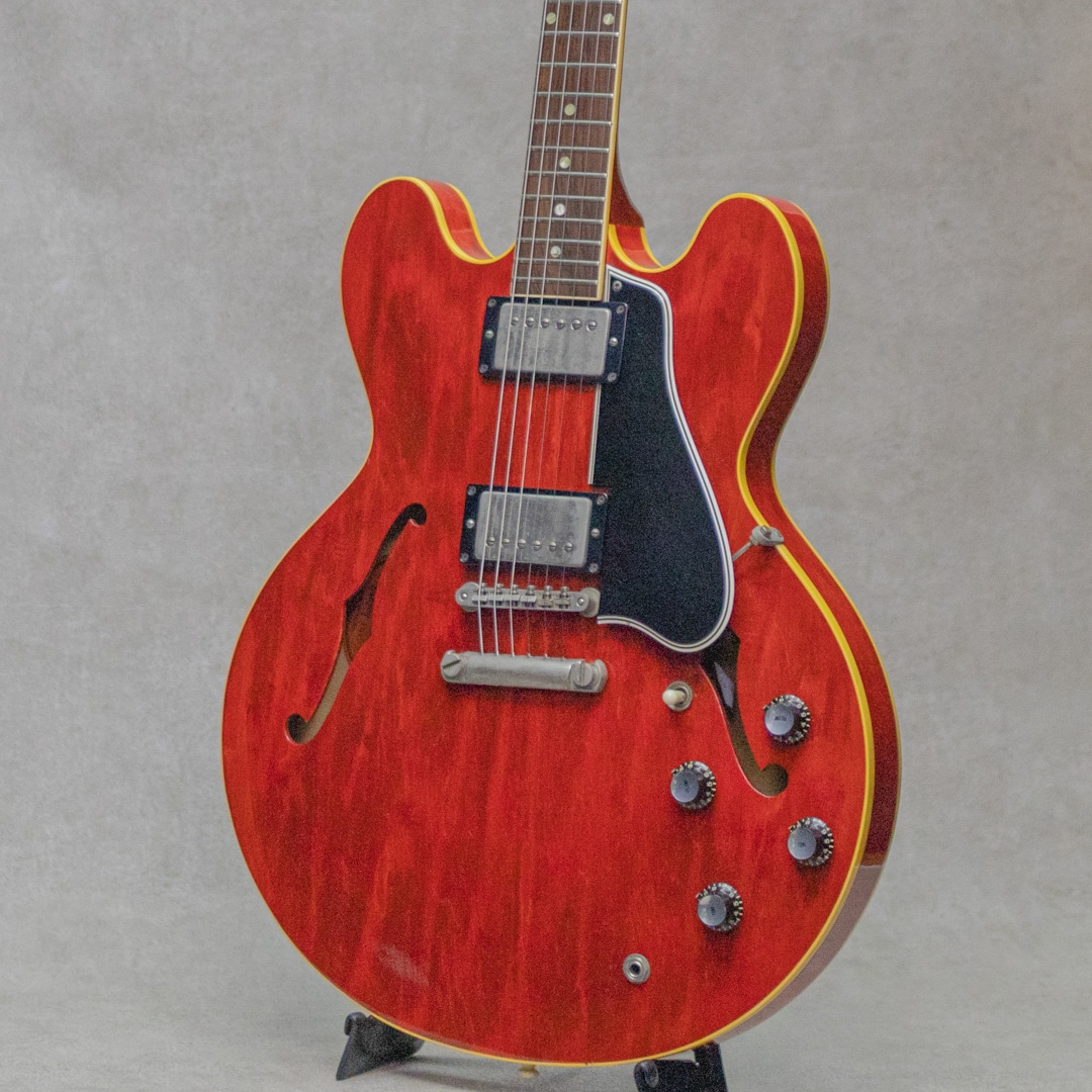 不朽の傑作、Gibson “ES-335TD”。ホロウ構造のシンボディにセンターブロックを合わせたセミアコースティックギターとして、1958年に発売されてよりセミアコモデルの代名詞として数多くのミュージシャンによりそのサウンドが残される銘器中の銘器です。本器は、1960-61年頃に製造された”ES-335TDC”。驚くほど美しいコンディションを保ったエクセレントコンディションの1本。ボディシリアルが”R”シリアルで60年製造レンジ、オレンジラベルの”A”ナンバーが61年1月出荷レンジになります。335ファンの中でも絶大の人気を誇る”Watermelon Cherry”の本器。レスポールのボディカラーで使用されていたアリニンダイ染料で生地着された独特の鮮やかなカラーは、以降のチェリーとは異なる鮮やかで透明感のあるチェリーカラーを魅せてくれるドリームギアです。ラミネイトメイプルを用いたホロウボディに合わせるメイプルセンターブロック、セルロイドバインディングを持つマホガニーネックにハカランダ指板、ドット指板インレイ、Gibsonロゴ&クラウンヘッドインレイ、オリジナル"2コブ"シングルラインクルーソンデラックスペグ。細身でとても弾きやすい薄手なネックシェイプの本器。ピックアップは、オリジナル”P.A.F"の”PU-490”ハムバッキングPUx2が搭載されています(フロントPUのステッカーは剥がれてしまっていますが、交換跡は見られずリアとも同質です)。ABR-1ブリッジ、アルミストップテイルピース、CRL製POT、ブラックビューティコンデンサー、ベベルドプライのロングピックガード、エスカッション、リフレクターノブなどのパーツはオリジナルをストックと、パーフェクトなコンディションです。335独特の少しミドルの抑えられたこれぞ正しくのサウンド。色気と艶があり、伸びやかなサスティンは決してくたびれておらず、元気で良いビンテージサウンドをもたらしてくれます。フレット残りは少し低めですが、ネックコンディションもとても良好で、ハイフレットまで音詰まりもなくスムースにプレイいただけます。若干の小傷は見られますが、目立つ打痕や塗装剥がれもなく、まさにビンテージミント。なによりも赤の色飛びがほとんどなく、新品のような鮮やかな色味を魅せてくれます。ドットインレイ&ロングガードのウィーターメロンは製造数も極僅か。その中でもオリジナルストップテールはさらにその半分ほど。コンディション・サウンド、そしてスペック。全てにおいてマスターピースの1本、まさにドリームギアです。本体同様にグッドコンディションのオリジナルブラウンハードケースが付属します。