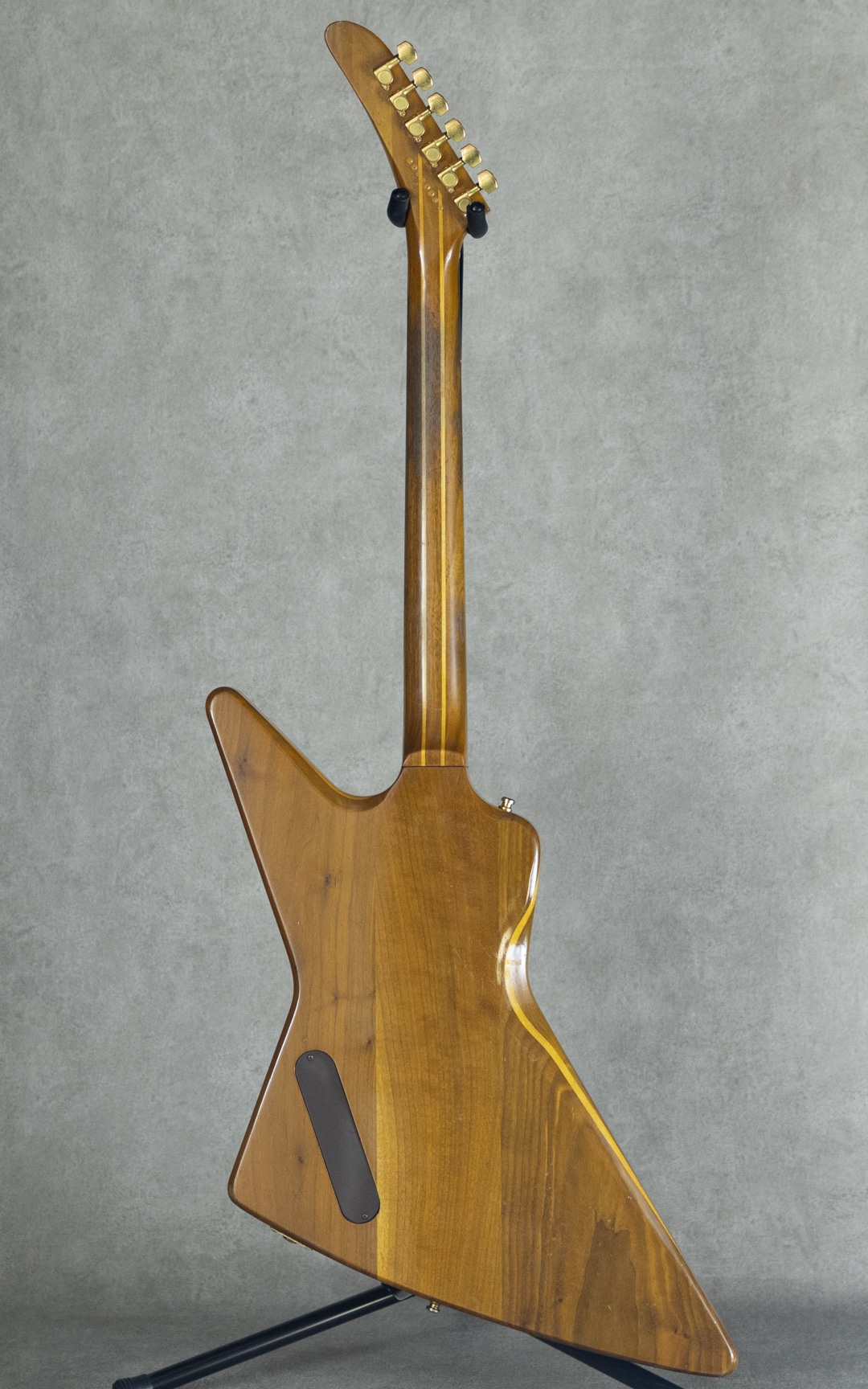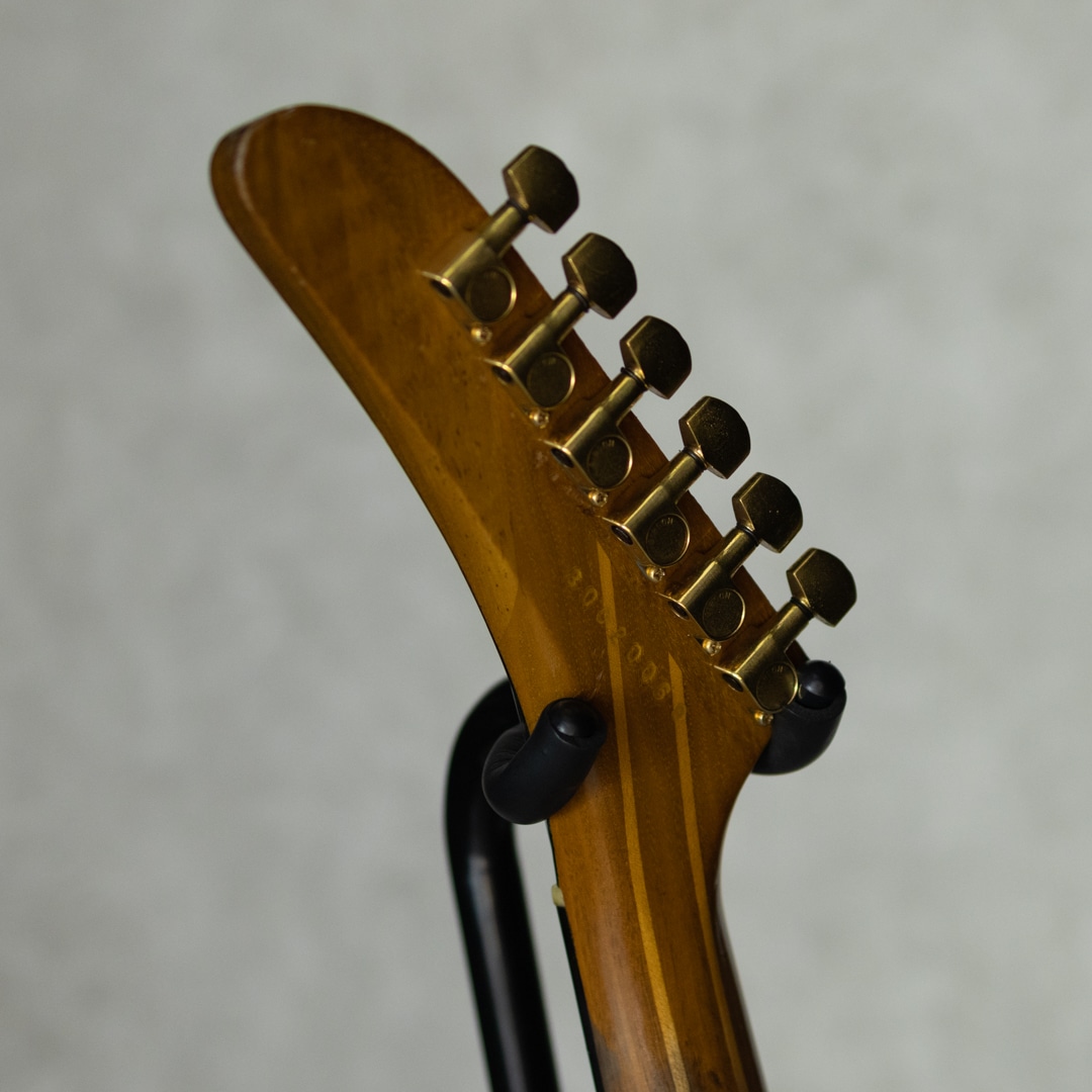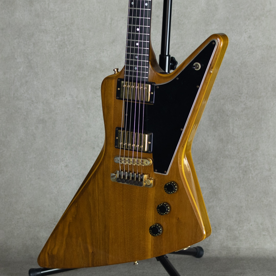1979年登場、4年間程の短い期間製造販売がされたExplorer・。同時期にラインナップされたFlying V・と並び、メイプルとウォルナットを使用した積層構造ボディ・ネック、ボディエッジに施されたコンター風加工と、それに伴い積層部が正面アングルに露出した視覚的デザインが特徴的なモデルです。(なお5層のボディ構造は、メイプルとウォルナットのそれぞれが逆になった2パターンが用意され、本器はトップとバックにウォルナットが配置された仕様)この特徴的な構造と加工を始め"E2"エンボスのロッドカバー、各弦独立のファインチューナー付きテールピース”TP-6”等など...各所のデザインとスペックは、80年台を目前に当時台頭し始めていた新興他社高級モデルの影響を大きく受けており、曲線的なデザインの使い方は、どこかミッドセンチュリーモダン後期との親和性が高そうな独特で特有のテイストも感じさせます。