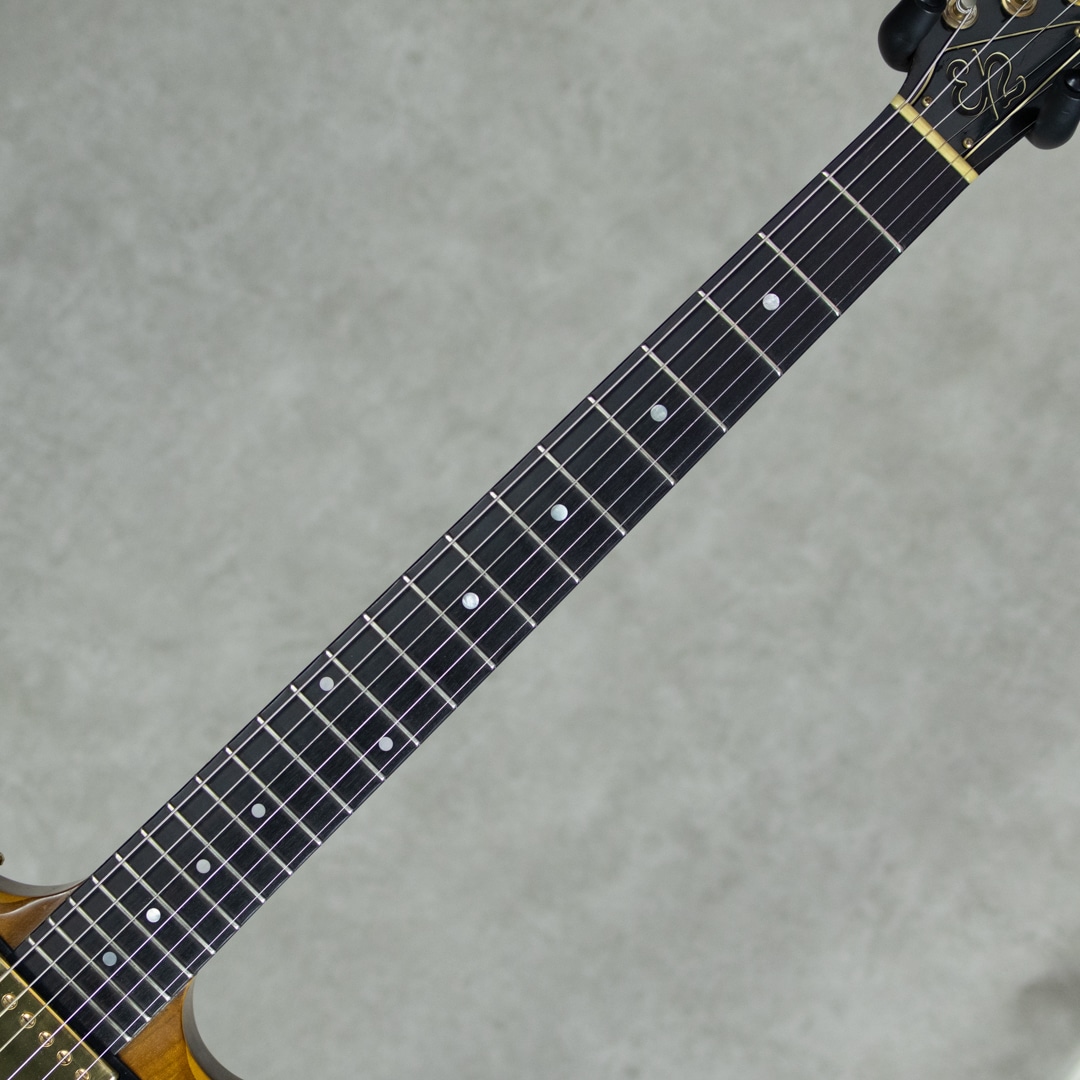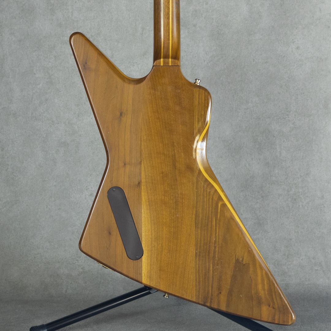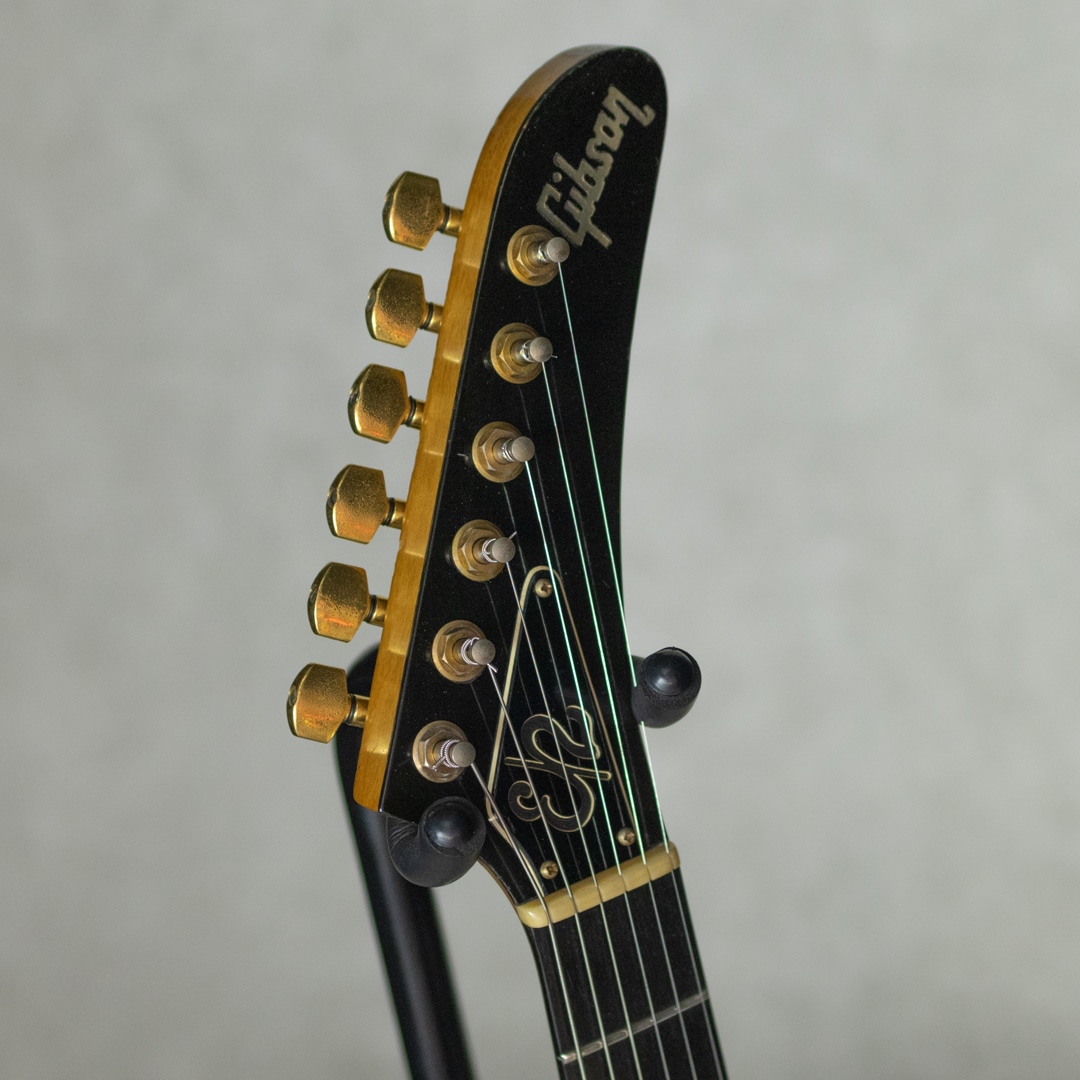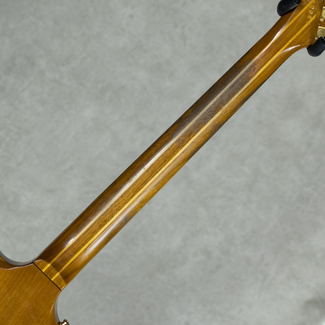 1979年登場、4年間程の短い期間製造販売がされたExplorer・。同時期にラインナップされたFlying V・と並び、メイプルとウォルナットを使用した積層構造ボディ・ネック、ボディエッジに施されたコンター風加工と、それに伴い積層部が正面アングルに露出した視覚的デザインが特徴的なモデルです。(なお5層のボディ構造は、メイプルとウォルナットのそれぞれが逆になった2パターンが用意され、本器はトップとバックにウォルナットが配置された仕様)この特徴的な構造と加工を始め"E2"エンボスのロッドカバー、各弦独立のファインチューナー付きテールピース”TP-6”等など...各所のデザインとスペックは、80年台を目前に当時台頭し始めていた新興他社高級モデルの影響を大きく受けており、曲線的なデザインの使い方は、どこかミッドセンチュリーモダン後期との親和性が高そうな独特で特有のテイストも感じさせます。