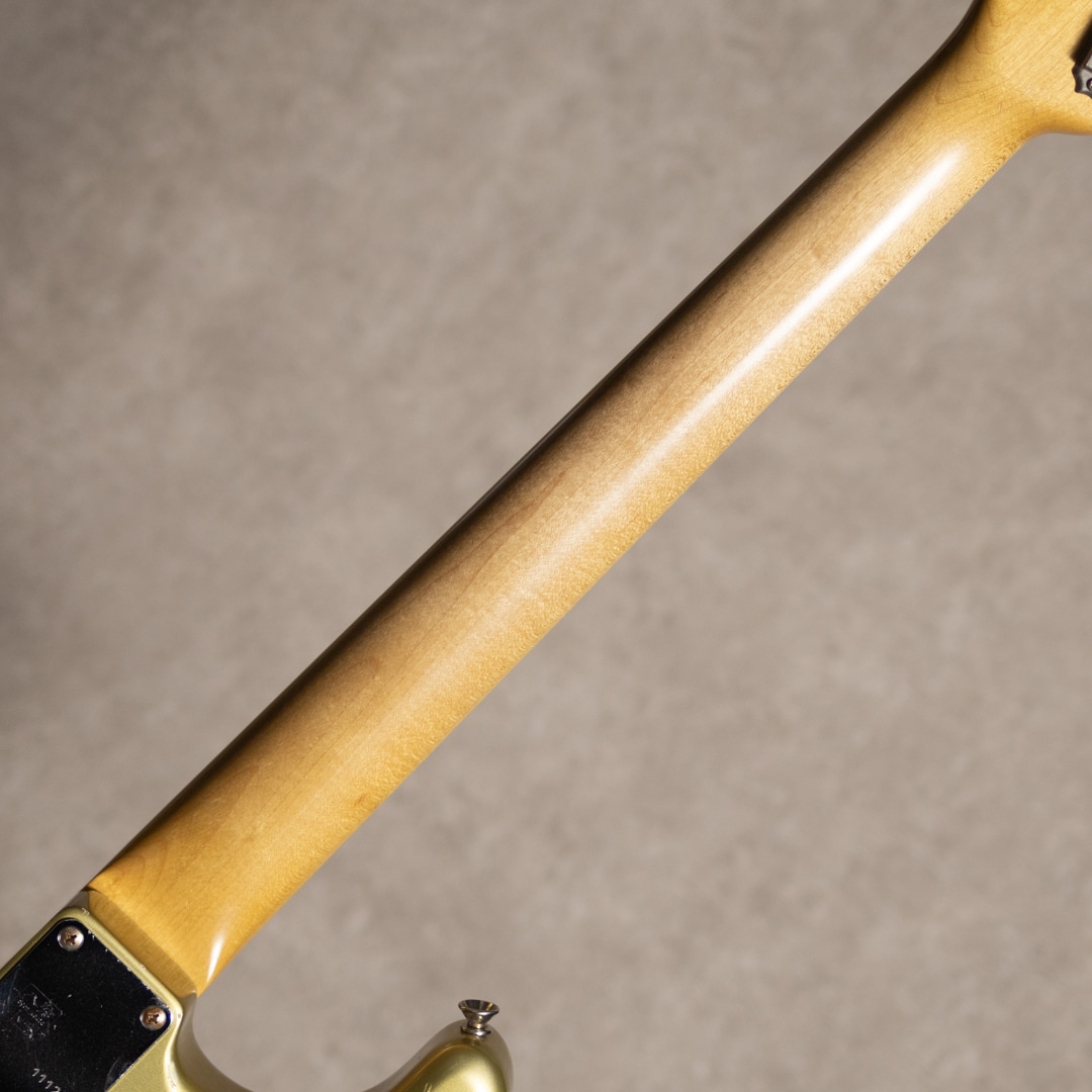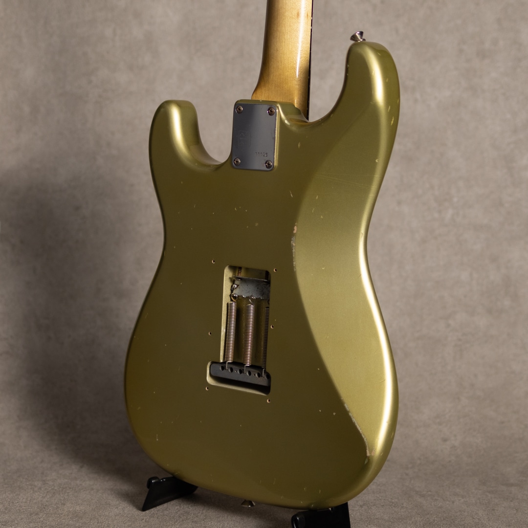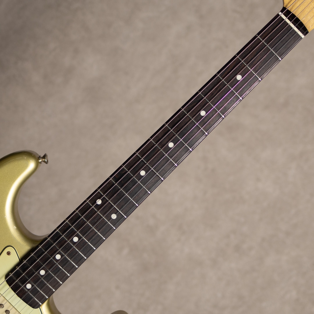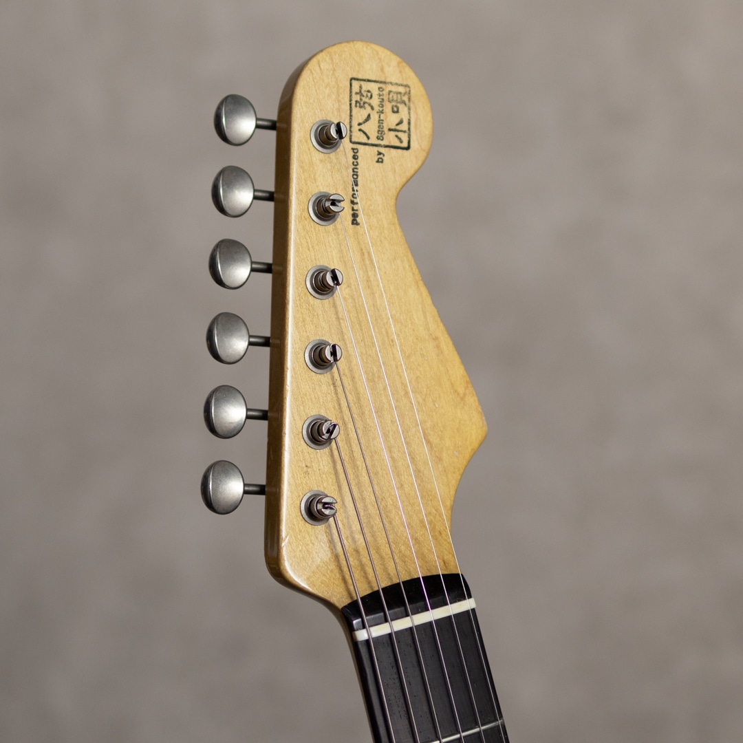 大阪に拠点を構えるリペア、製作工房"八弦小唄"。ヴィンテージショップを中心とした顧客から受ける膨大な量のリペアで得た知識と、セットアップに関する独自の解釈が反映される楽器はヴィンテージ通をも唸らせる仕上がりで知られます。本器は、ビンテージアプローチのSTモデル”60's ST type Jacaranda Finger Board Shoreline Gold”。60年代の仕様を踏襲した、ハカランダスラブボード指板の1本。メイプルネックにスラブボードのハカランダ指板、アルダー2pcsボディと60年代王道スペック。ネックグリップは握りやすい少し肉付きのあるCシェイプで、ビンテージギターのような手に馴染む丸みのある形状を見事に再現されてます。また、指板Rは7.25”ですが、ハイフレット側をわずかにRがゆるく加工されており、ハイフレットでの音詰まりをカバーしています。ピックアップには八弦小唄オリジナル60’s前半のブラックボビンタイプのシングルコイルPUが搭載されており、5wayスイッチにてワイヤリングされています。ライト目にエイジド加工された本器、カラーはビンテージと見まごう雰囲気のショアラインゴールドカラー。雰囲気満点のウェザーチェック、経年を想像させる使用感、、ハードウェアのエイジング具合も合間って、とても貫禄のあるルックスに仕上がっています。豊かな倍音ながら、クリアで抜けの良い金属質な質感を匂わせないサウンド。伸びやかでアタッキーなSTらしいレスポンス感が気持ち良いサウンドです。ハーフトーンもしっかりとしたキャラクターが出ていて、各ポジションでそれぞれのトーンを活かしたプレイを楽しんでいただけます。良質な国産ハイグレードSTモデル、生産量も少なく、流通稀な実力派モデルです。