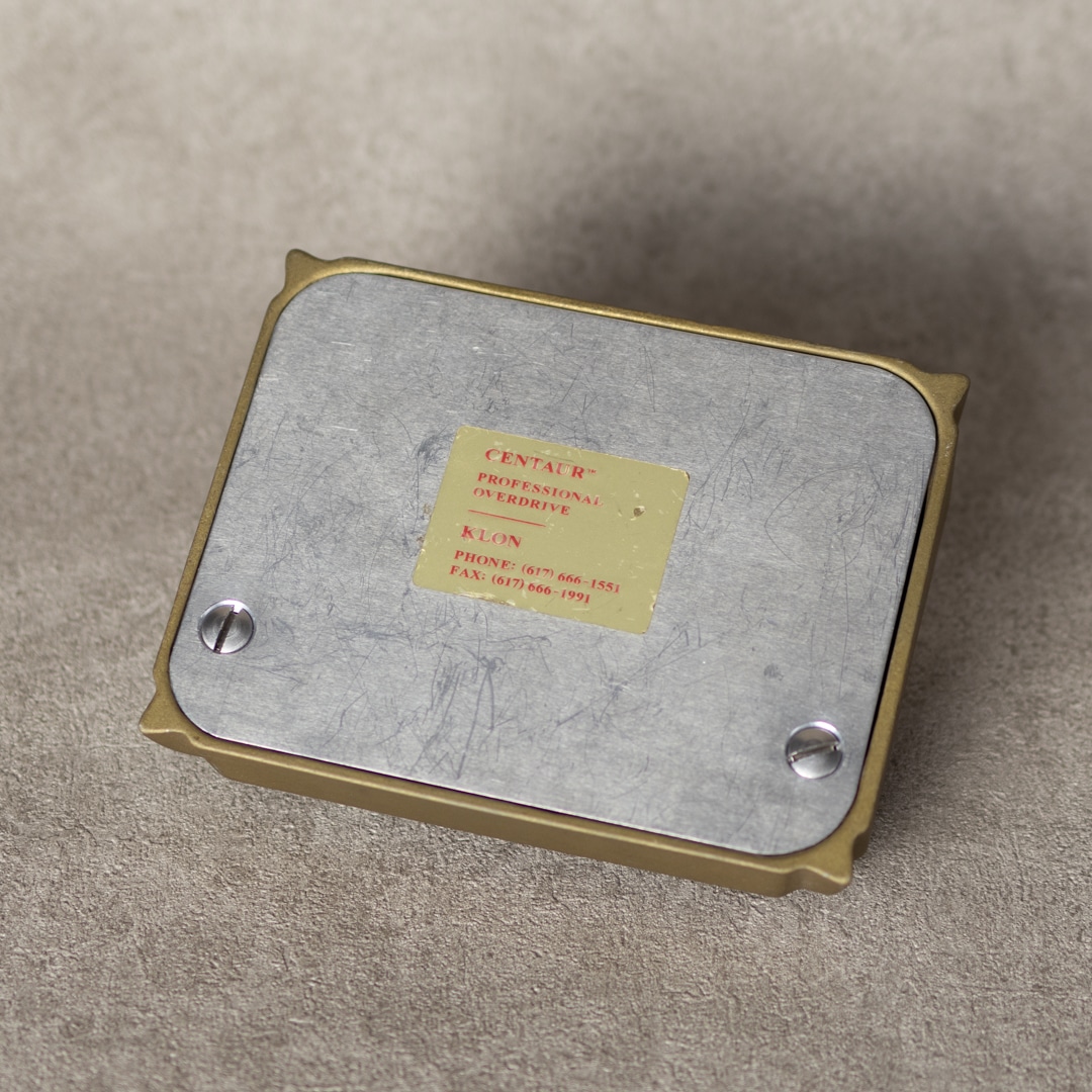数あるストンプボックスの中でも、一際高い評価を得るKLON “CENTAUR”。その独特の外観とサウンドで数多くのギタリストを魅了し、今なおその人気は衰えない唯一無二のオーバードライブペダルです。”Centaur Professional Orverdrive”が製品化されたのは1994年のこと。製作者であるBill Finnegan(ビル・フィネガン)氏は、当時既存のペダルでは自身が演奏するサウンドに満足できず、それを満たすペダルの設計をすることとなります。友人の協力を得ながら2年間の試行錯誤の末に製品化を完成させました。2009年に受注ストップされるまでに製造された”Centaur Professional Orverdrive”は3バージョンの外観を持ちます。本器は、最初期にあたる通称”ロングテール”モデル。POTデイト1997年、スイッチデイト1998年、ロングテール筐体、初期モデルの最終期仕様1600番台シリアルの1998年頃製になります。この頃の”Centaur Professional Orverdrive”は最初期に比べ、少しゲインの倍率が高く、単体でもしっかりと歪んでくれます。また、後期モデルに比べミドルが野太く、ブースターとしてもその真価を発揮してくれます。足ゴムは欠損していますが内部の改造や修理などもなく、また外装の傷みもほとんどないグッドコンディションの本器。レンジの広いファットなブースターとしても、クリーンchに合わせクランチブーストとしても、その真価を味わえるキング・オブ・オーバードライブペダル。是非ご体感ください。