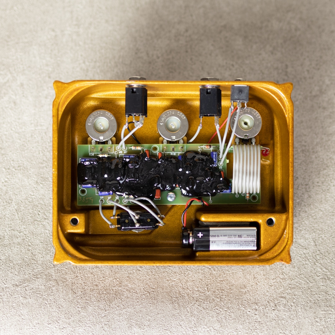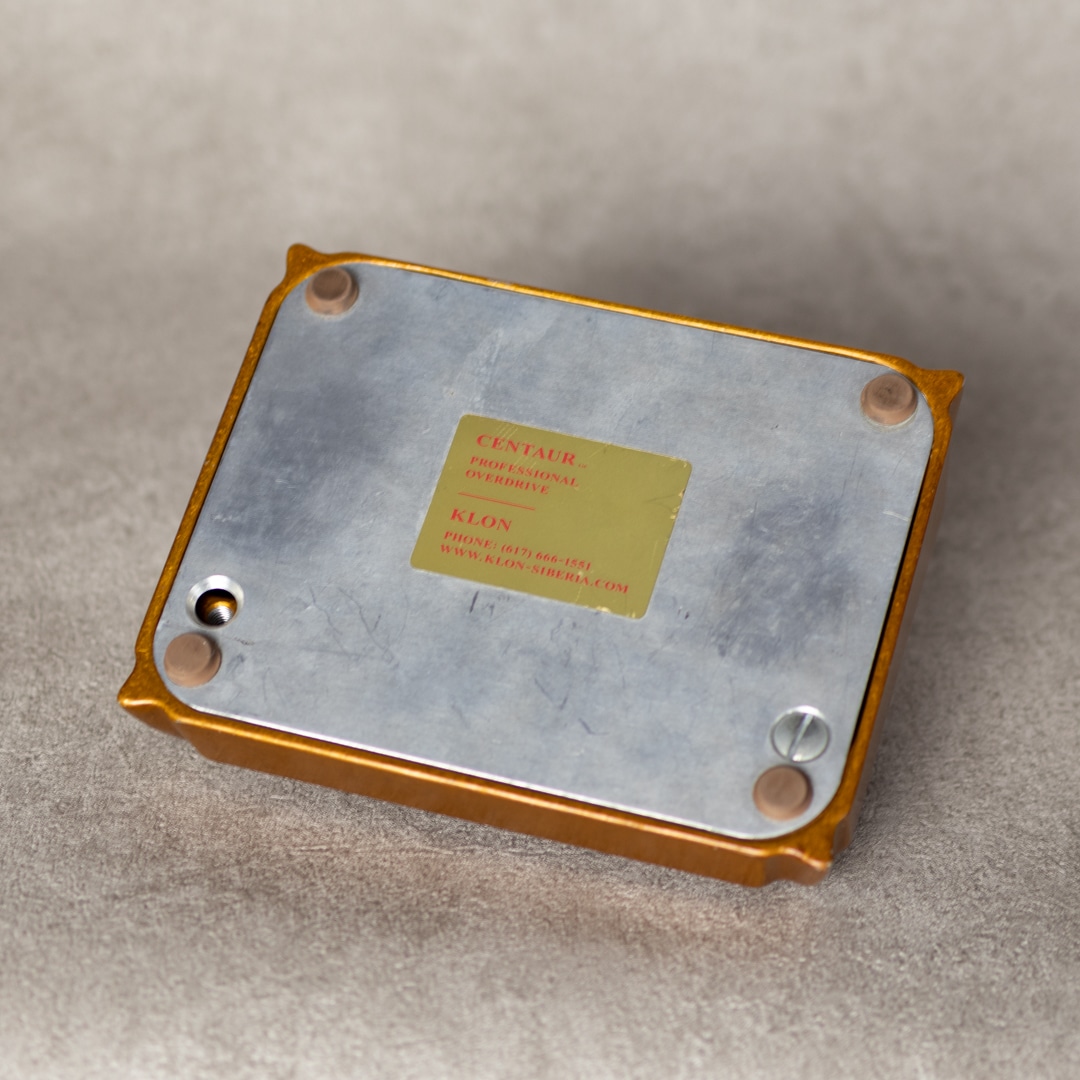 数あるストンプボックスの中でも、一際高い評価を得るKLON “CENTAUR”。その独特の外観とサウンドで数多くのギタリストを魅了し、今なおその人気は衰えない唯一無二のオーバードライブペダルです。”Centaur Professional Orverdrive”が製品化されたのは1994年のこと。製作者であるBill Finnegan(ビル・フィネガン)氏は、当時既存のペダルでは自身が演奏するサウンドに満足できず、それを満たすペダルの設計をすることとなります。友人の協力を得ながら2年間の試行錯誤の末に製品化を完成させました。2009年に受注ストップされるまでに製造された”Centaur Professional Orverdrive”は3バージョンの外観を持ちます。本器は、最終期にあたる通称”ノーピクチャー”モデル。POTデイト2003年、スイッチデイト2005年、ノーピクチャー筐体、最終モデル仕様3600番台シリアルの2005年頃製になります。この頃の”Centaur Professional Orverdrive”はゲインの倍率も高く、単体でもしっかりと歪んでくれます。アンプブースターとしてはもちろん、きらびやかで抜けと歯切れの良いオーバードライブとしてもその真価を発揮してくれます。バックパネルのネジ1/2が欠損していますが内部の改造や修理などもなく、また外装の傷みも極僅かのグッドコンディションの本器。レンジの広いクリーンブースターとしても、クリーンchに合わせ艶やかで荒々しいドライブとしても、その真価を味わえるキング・オブ・オーバードライブペダル。是非ご体感ください。