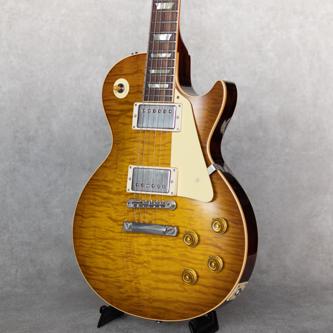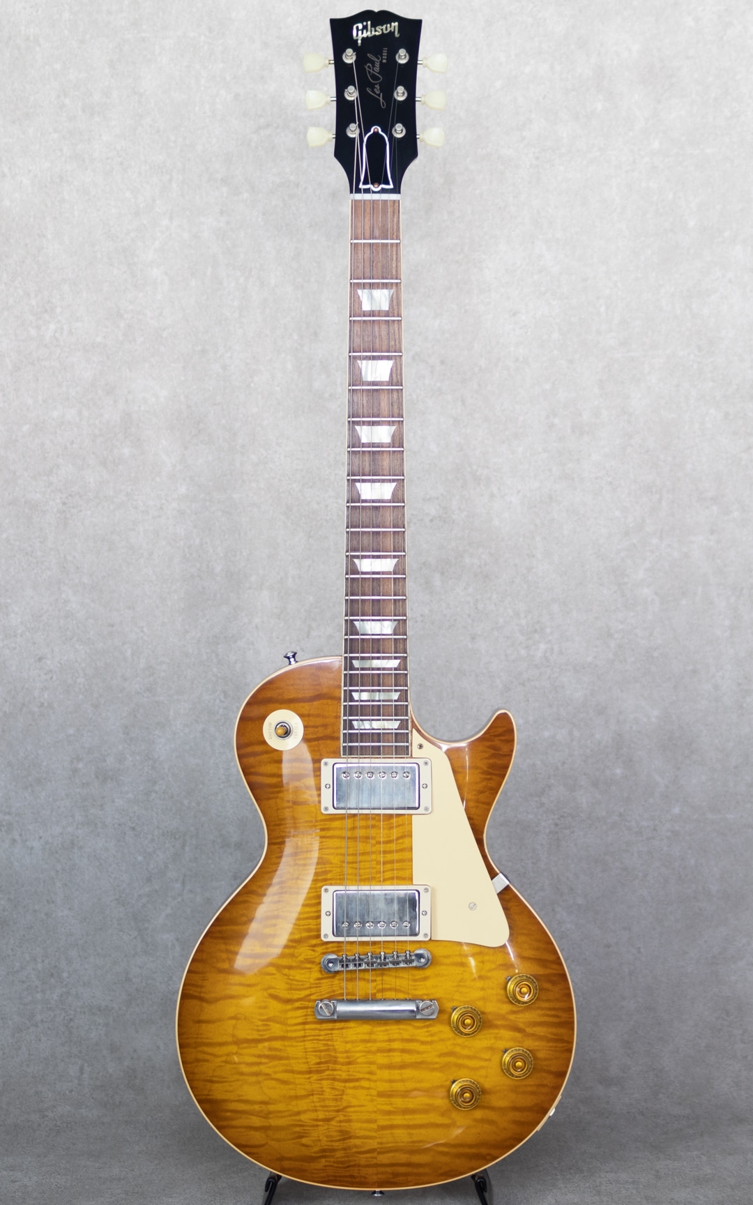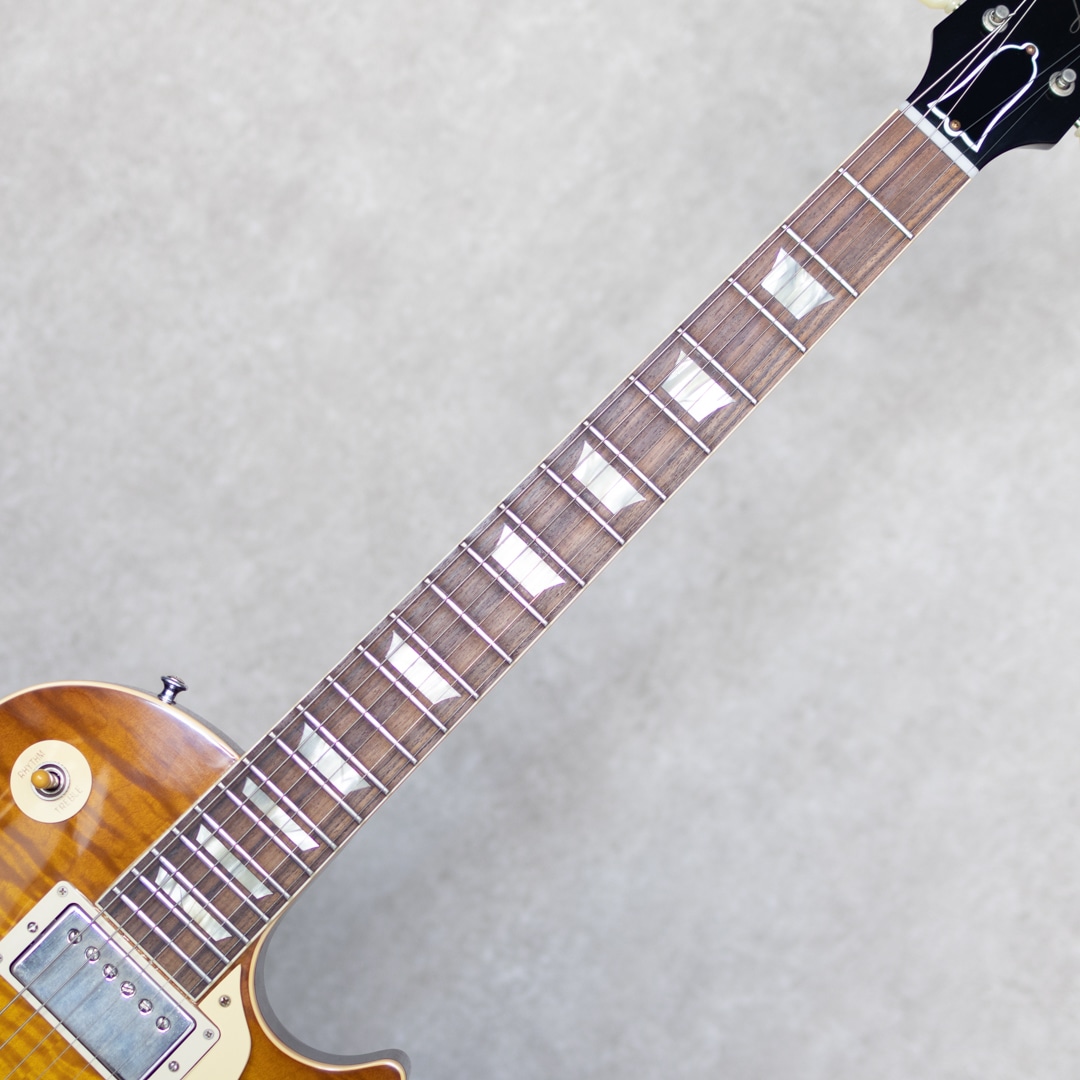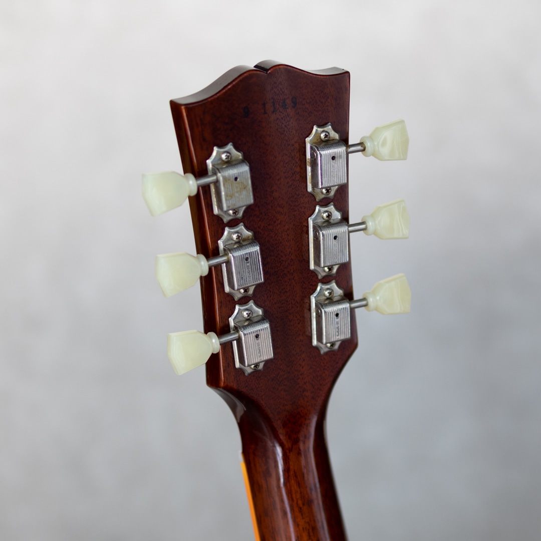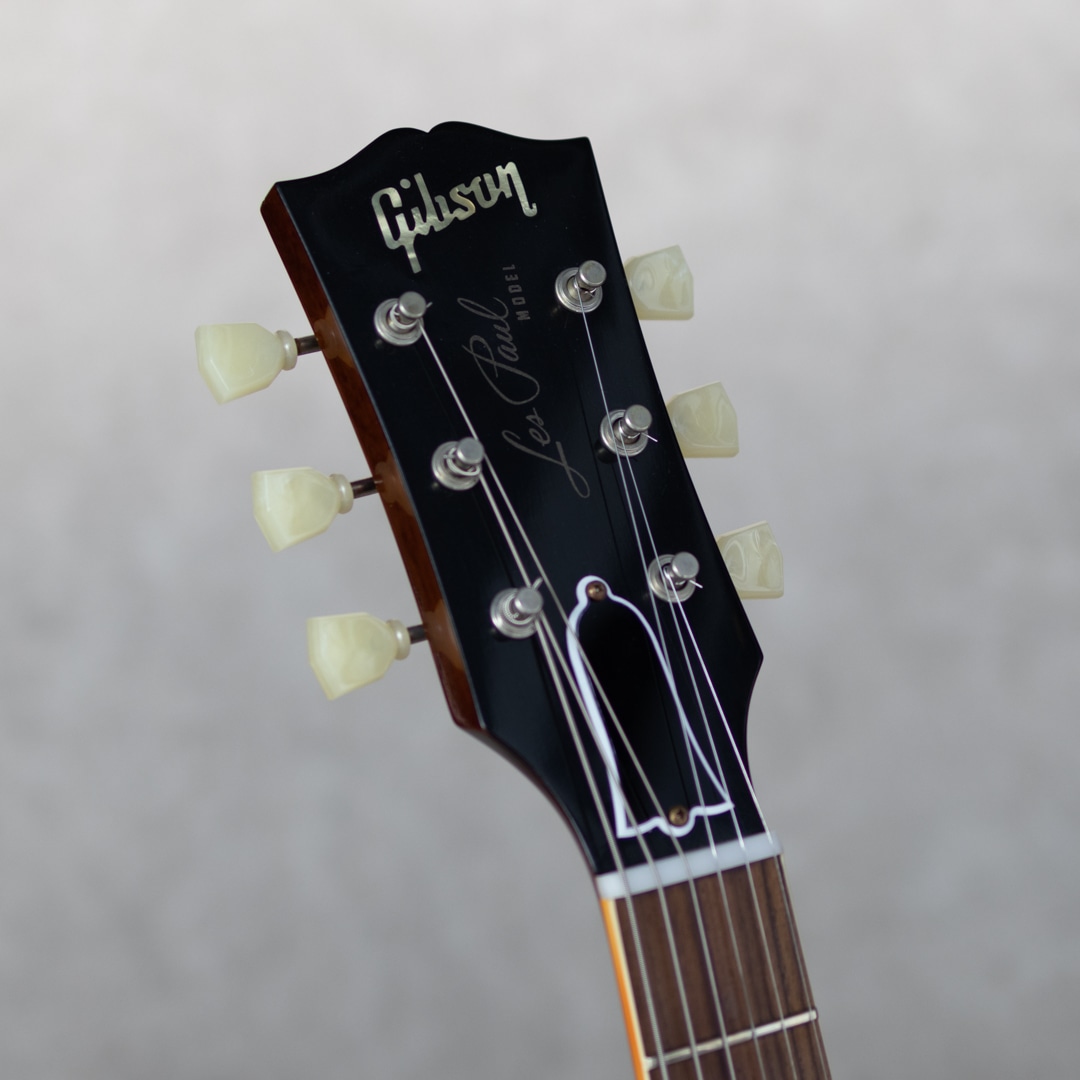Gibson Custom ShopにおけるフラッグシップモデルR9 Les Paul。最新のアップデートは常に当モデルのブラッシュアップから波及していく形で進められます。2015年の”True Historic”登場、2018年の”Historic Collection”復活を経て、2019年の60周年記念モデルではデザインディテール、電装パーツ等がより詰められ、決定版的スペック圧倒的な完成度となりました。2019年のアップデートでは、ヘッドトップの“Gibson”&“Les Paul”ロゴがより当時に近い書体と色味になり、指板のディッシュインレイ素材も更にビンテージに近い質感に変更。また搭載されるCustombuckerピックアップはヴィンテージに倣いロウ付けをしない”アンポッテド”仕様に、サーキット内のポットとバンブルビーコンデンサーもよりヴィンテージライクな仕様を採用。オールニカワ接着やトゥルーヒストリックパーツ採用等の基本仕様も、勿論継承されております。