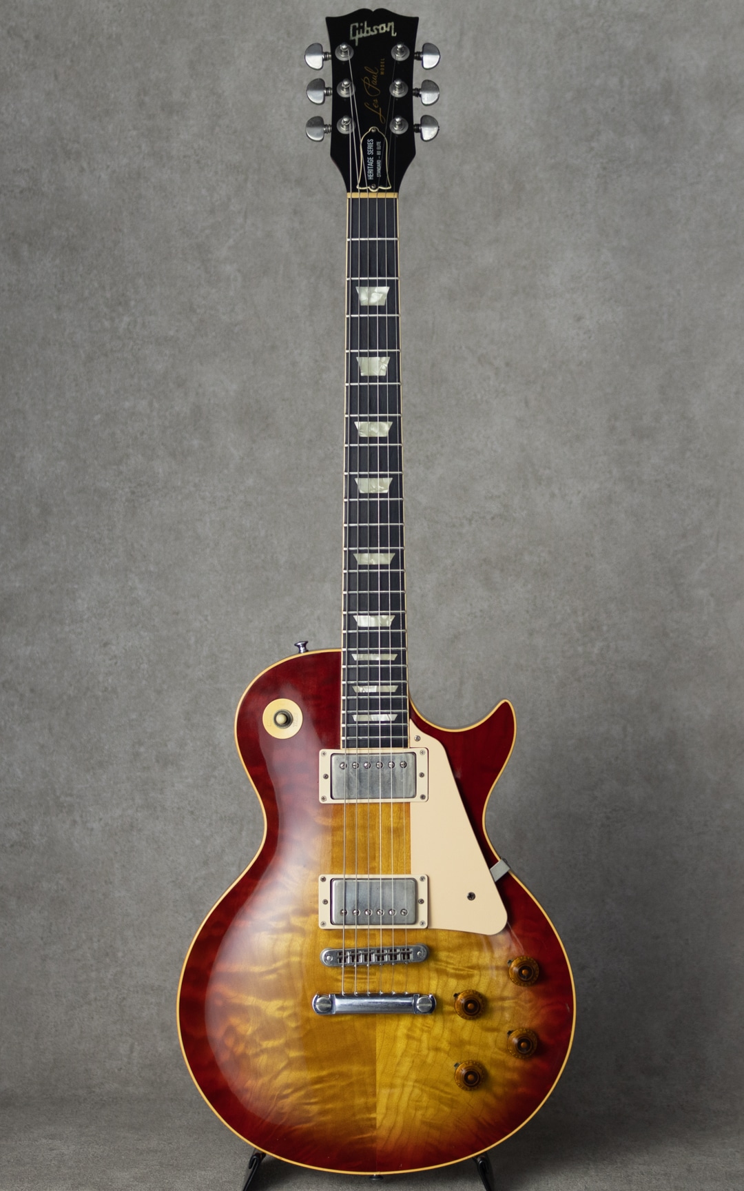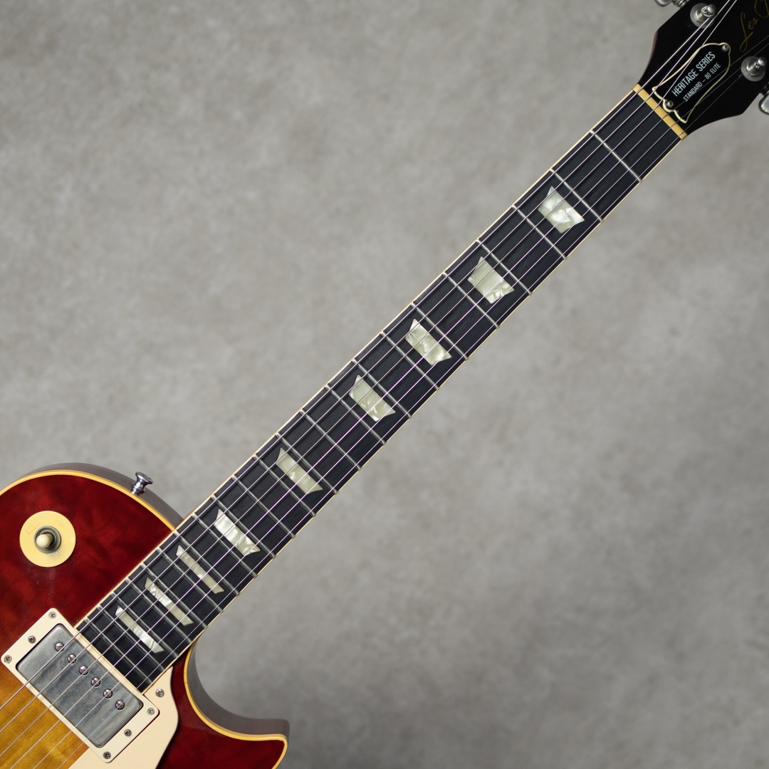 当モデルに合わせて新登場したピックアップはハムバッカー生みの親であるセス・ラバーを招きティム・ショウが開発に携わったことから通称Tim Show PAF等で呼ばれております。68年以降浅い14度角であったヘッドは17度角スモールヘッドに回帰。ネック材も当時のメイプルではなくマホガニーネックを採用。”Heritage Series”ラインアップの中Standard 80は3ピースマホガニーですが、上位グレードである本モデル”Elite”では1ピースマホガニーにエボニー指板が採用されております。ボディ構造は王道の1ピースマホバックにフィギュアドメイプル2ピース・センターシーム、カラーリングに関してもより”バースト”然とした深い色味になりました。65年以降長らくクロームメッキだったハードウェアはニッケルメッキに変更。”憧れ”のイメージ踏み込んだルックスを手に入れました。
