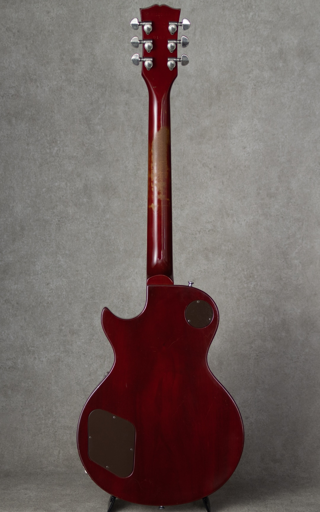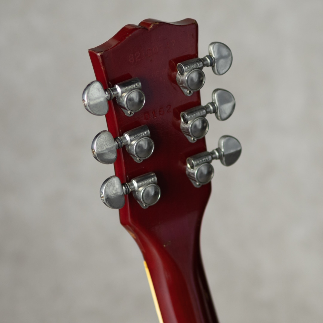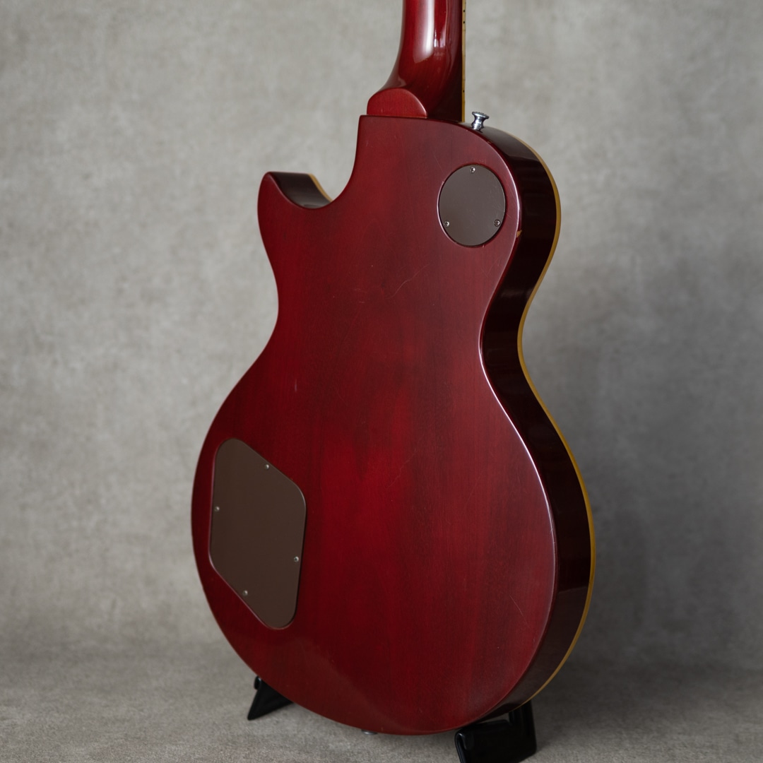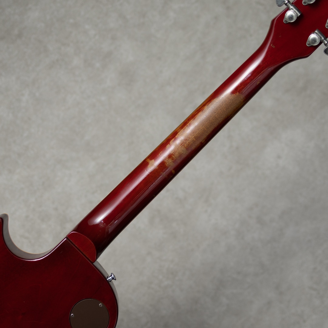 塗装面には全体的に細かいウェザーチェックが出ている他、ネック裏7フレット辺りを中心にチェリーカラーが擦れている個所があり貫禄も感じさせる風合い。小傷、バックル痕、細かな打痕等はあるものの著しく目立つダメージ等はなく、経年を鑑みると上々のコンディション、演奏面はとても良好です。テールピースがリプレイス。オリジナルハードケースが付属。