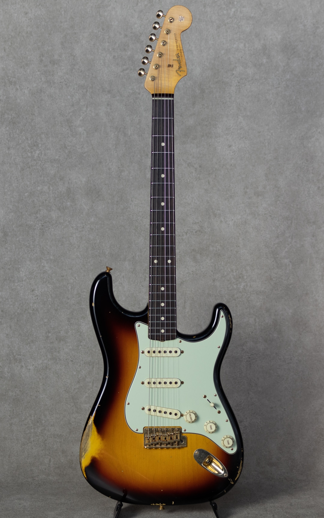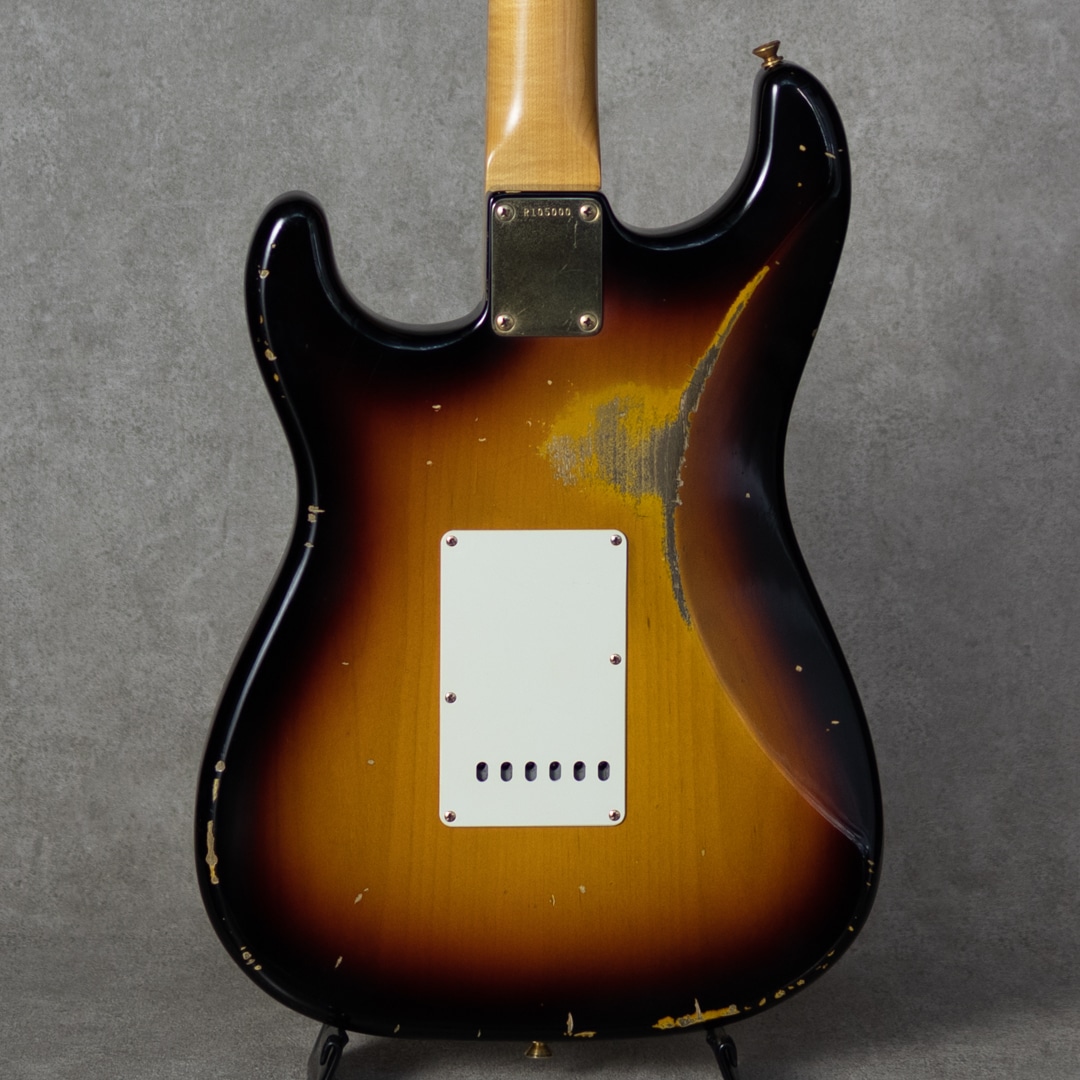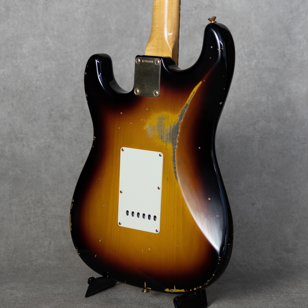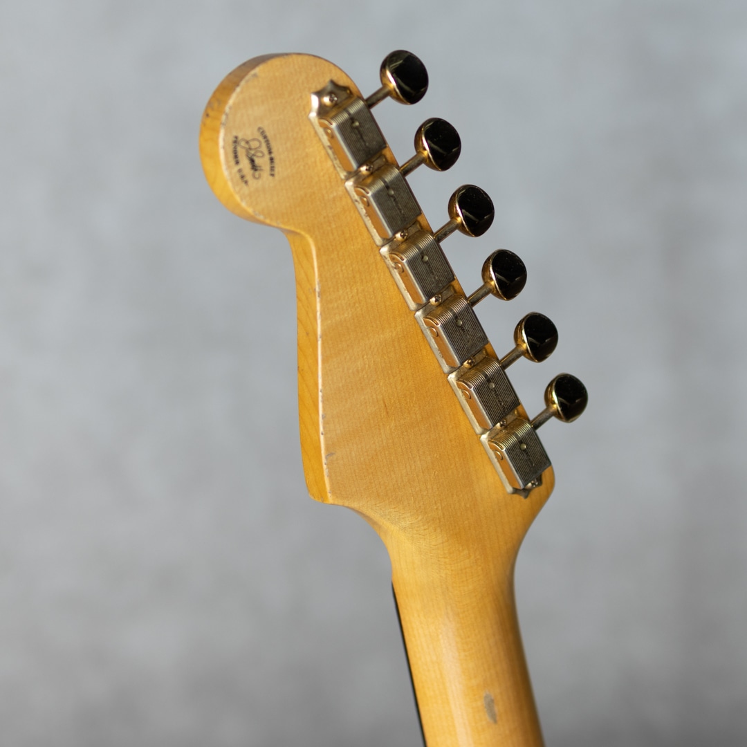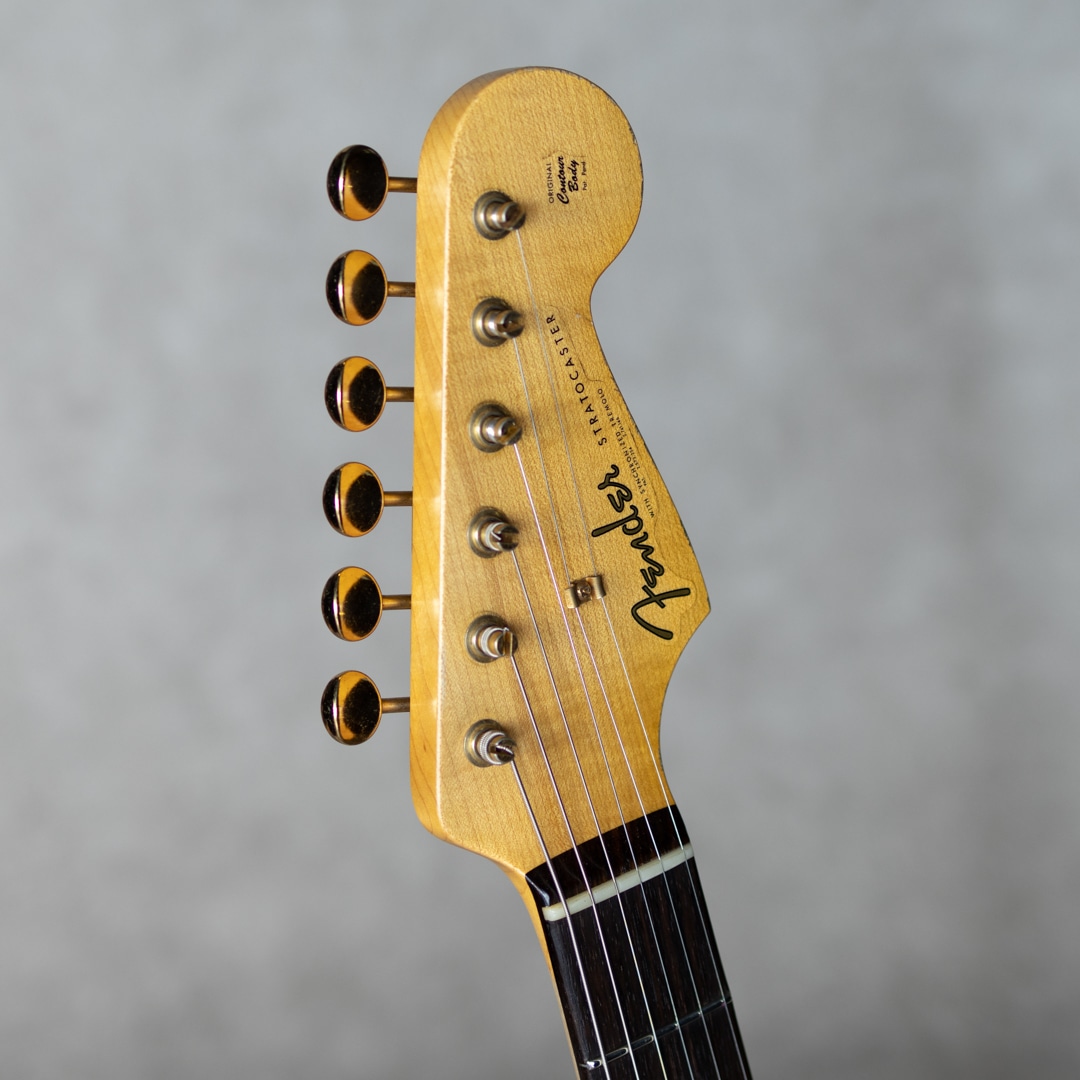 "Fender Custom Shop"最高峰の憧れ"Master Built"。本器は”Jason Smith(ジェイソン・スミス)”作の”1961 Stratocaster Relic 3 Color Sunburst”。2020年製極上USED品。セレクテッドアルダー2pcsボディ、スラブローズ指板の1961年仕様。ネックのメイプル材はほぼ柾目取りで取られた少し握り心地のあるオーバル”C”シェイプ。9.5”R指板、6105/ナロウトールフレット。ハードウェアにはゴールドハードウェアが採用されており、程よいエイジド加減とウェザーチェックが雰囲気満点のレリック加工が施されています。ピックガードにはセルロイド製のミントグリーンガード、そしてピックアップには"Josefina Campos(ホセフィーナ・カンポス)"によるハンドワウンドFAT’60sピックアップを搭載。またコンデンサーには60年代初頭まで使用されていたタイプのワックスペーパーコンデンサーが搭載されています。もちろん61ですので、パテントナンバー入りのロゴです。父親である”Dan Smith(ダン・スミス)"や師事した”John English(ジョン・イングリッシュ)"などから深く引き継がれているフェンダースピリットとロックミュージックがDNAに流れている”Jason Smith”。しっかりと芯のあるアタックとファットでノリの良い倍音感。歯切れよくクイックながら、ビンテージフェンダーから受け継ぐトーンバランス。60sのファットで甘めなトーンが埋もれない凛としたサウンドでアウトされます。FAT’60sはセットアップで多彩なバランスを体現可能で、好みのトーンを得やすく、ビンテージライクなタッチから、モダンなバランスまで幅広く受け応えてくれます。使用に伴う傷や使用感は伺いにくく、とても良好なコンディションで保たれた本器。ネックコンディションも良好でフレット減りも殆んど無く、弾きやすいアクションでしっかりとお使いいただけます。憧れのマスタービルト、その中でもガッツのあるストラトをお探しの方にオススメしたい正統派アプローチのビンテージモデルです。オリジナルハードケース、認定書、スペックシートや新品時付属品等もしっかりと付属します。