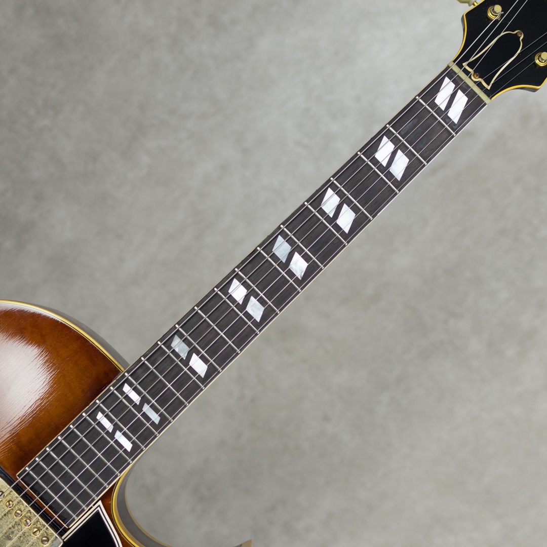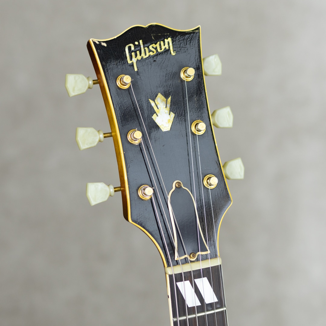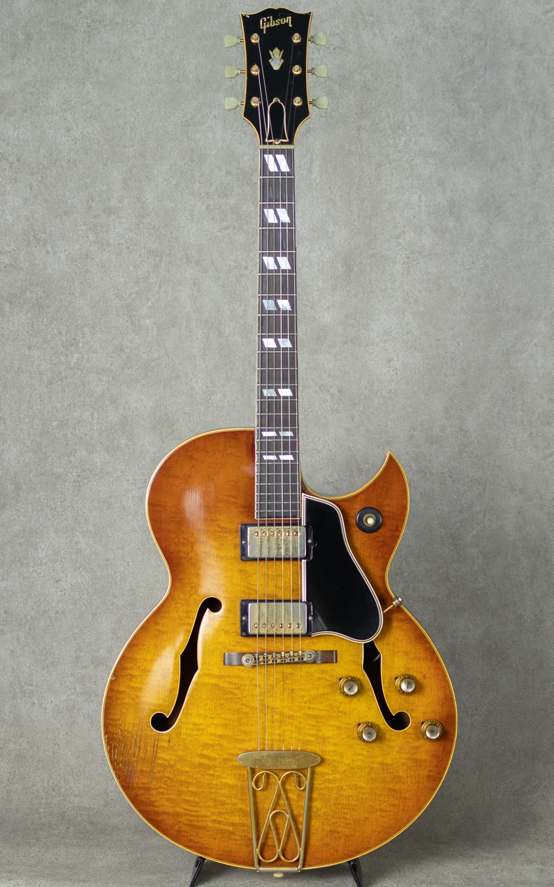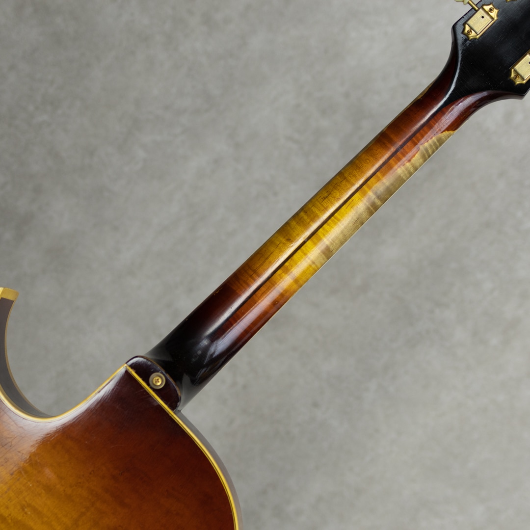 17インチ幅シンライン・ラミネートメイプルボディにショートネックを採用。異色の存在感が魅力的なES-350T。PAF搭載の61年製Vintage。ラミネイトメイプルボディ/ショートスケールメイプルネック/ダブルパラレログラムインレイが施されたバウンドローズウッド指板/ヘッドのクラウンインレイ。2 1/4インチボディ厚、”バードランド”と同様のショートスケール仕様が採用されたフルアコ―スティックモデルです。本器は1960年後期以降のフローレンタインカッタウェイを採用したボディデザイン。搭載のハムバッカーに関しては、当モデルと当モデル同様のボディデザインを持つ従妹モデル”バードランド”との専用に作られたナローピッチ仕様を採用。ショートスケール採用に伴い、狭まった弦間ピッチに合わせてポールピースの間隔を狭くデザインしたもので、通常ネック側ブリッジ側の両方がこの仕様ですが、本器におきましてはネック側のみがナロー仕様となっております。ブリッジ側は通常ピッチのPAFが搭載されておりますが、サーキット配線、ポットカバー等に手が加わった形跡が見当たらず、出荷時オリジナルのスペックと推定しております。ナットからブリッジに向けてハの字に張られる弦において、ある意味合理的な配置で近年では一般的なものではございますが、当時ファクトリーにおいて何らかの事情でこのような仕様となったのか、偶然や単純な取違えによるものなのか…今となっては想像をするしかない部分もまさにVintage Gibsonらしい楽しみです。