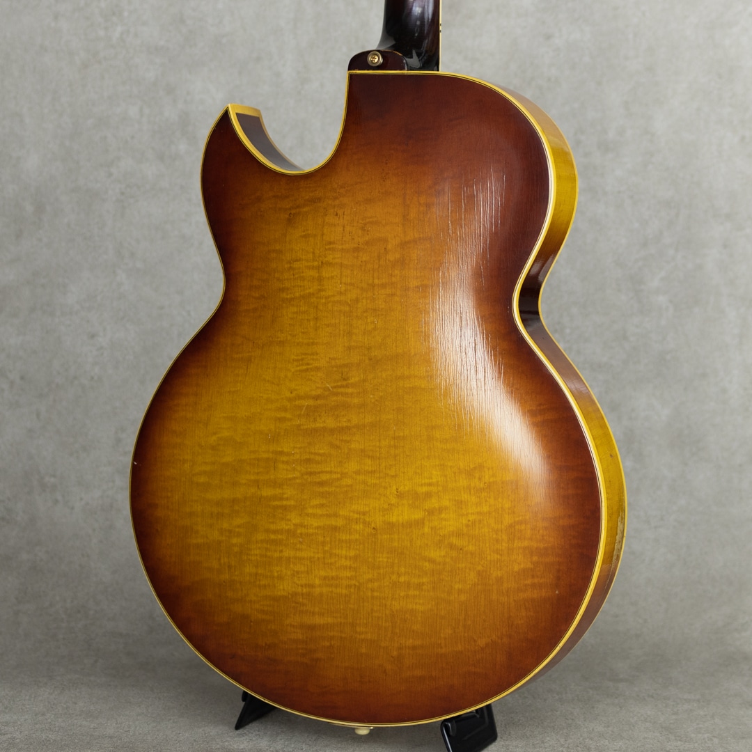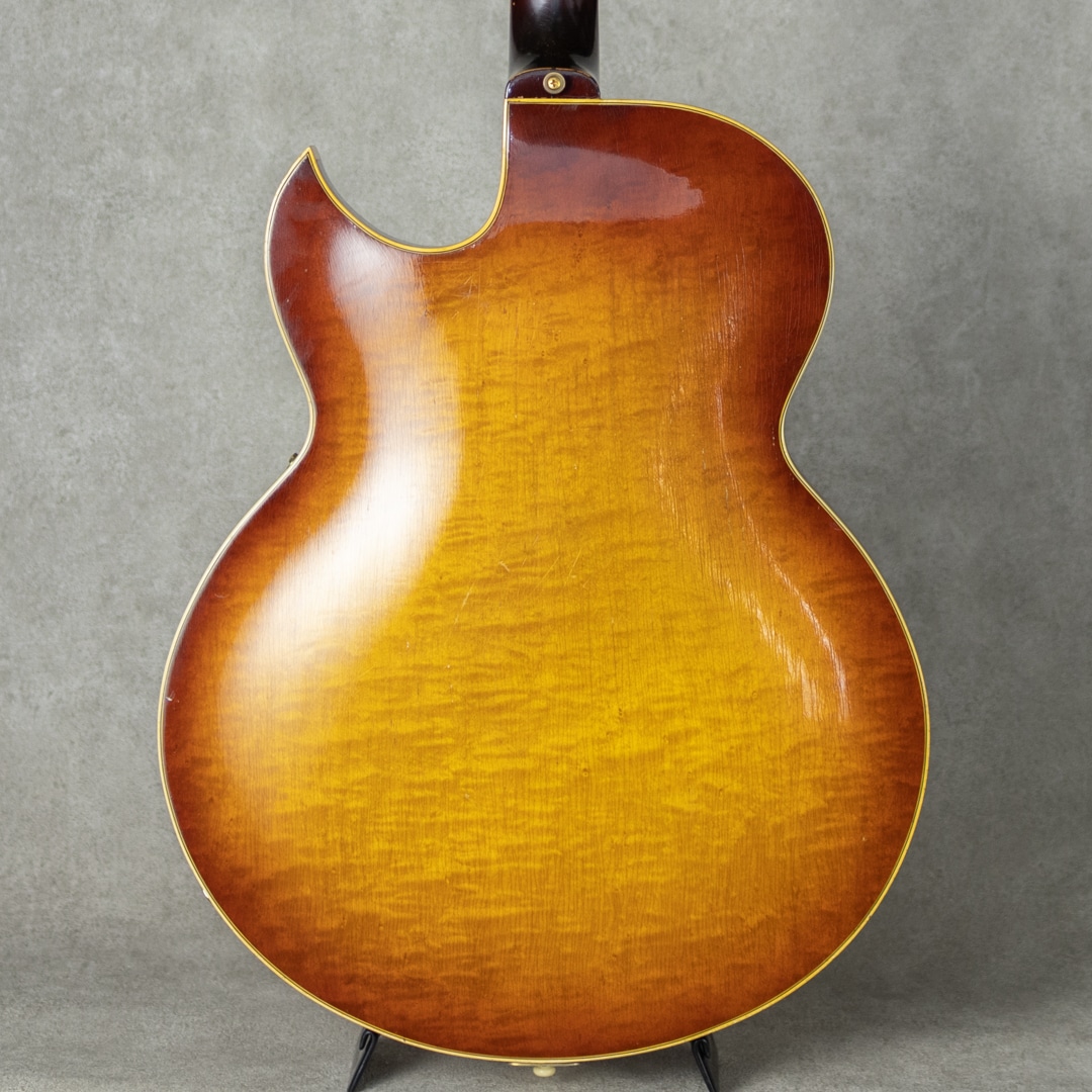 ラミネート構造のESモデル、取り回しの良い薄胴ながら17インチボディによるアコースティック感のある豊かな鳴りももつ350。ショートスケール故の甘い響きと僅かにラフなテンション感、独特のキャラクターを持った魅力が楽しめる名モデル。リフレット・リナットがされている為演奏性もしっかりしており、個体的にも反応の良いアウトプットをお楽しみいただけます。ウェザーチェックで覆われた外観ながら機能上瑕疵となるような大きなダメージはなく、弾いて良し、眺めて良し、抜群の貫録です。当時物のブラックのハードケースが付属いたします。