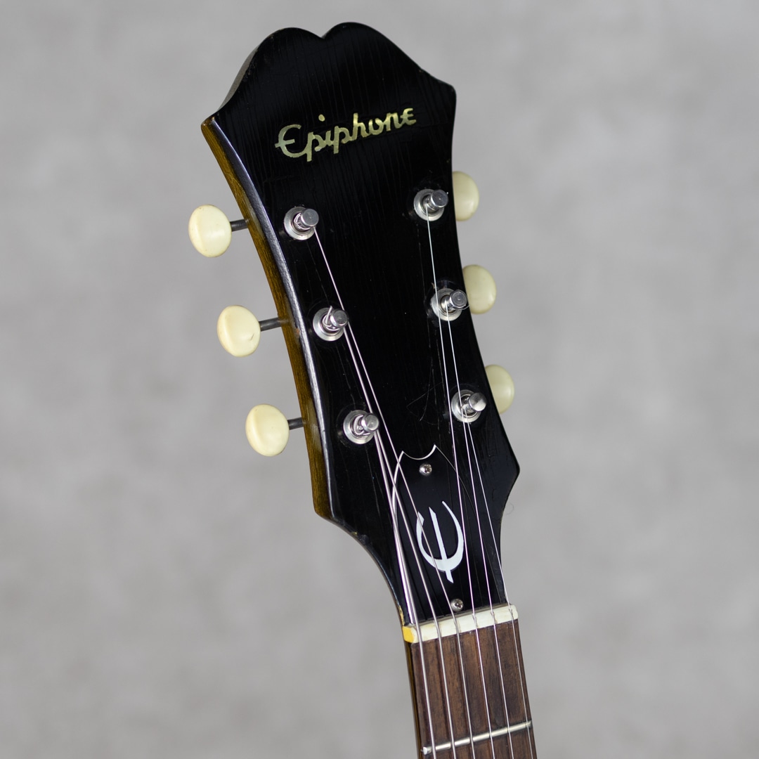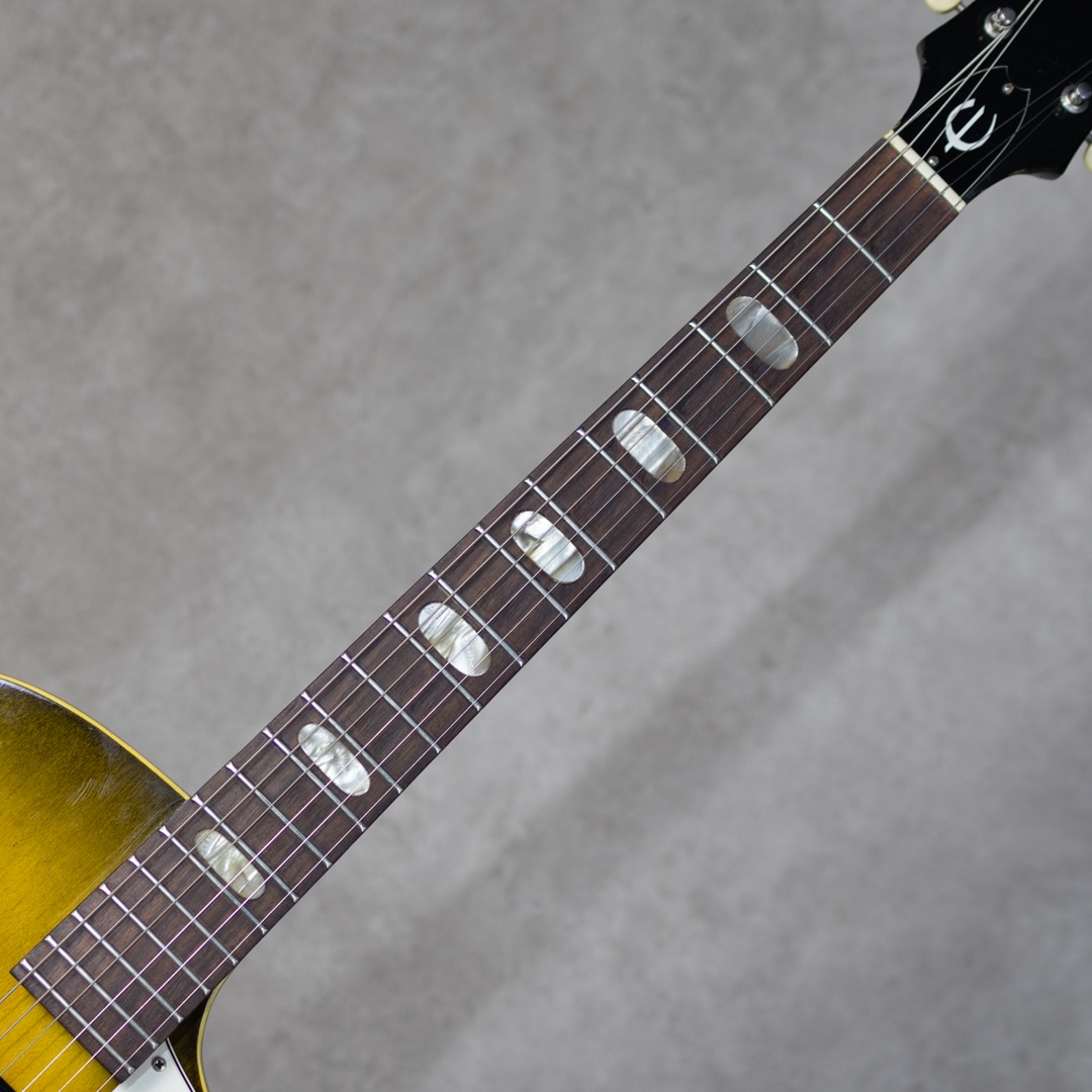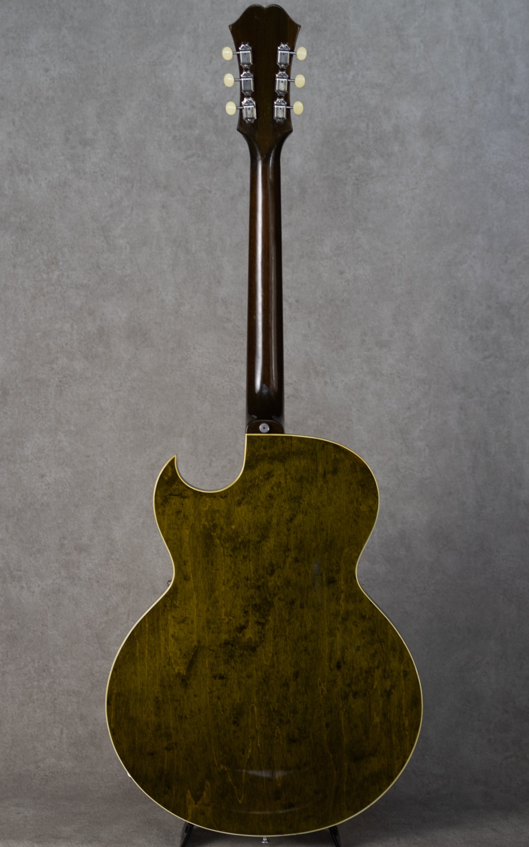 ジャンルを超え様々なアーティストに愛される "Epiphone" 、本器は Gibson Kalamazoo工場にて製作された E452TD"Sorrento" 。フルアコースティック仕様のシンボディにシングルカッタウェイを持ち "Gibson ES-125TDC" とほぼ同一の構造ですが、ミニハムバッカー2機を搭載、125とはまた一味違ったトーンをご体感いただけます。ボディフィニッシュは所謂 "Green Lemon" 系に近い色味の "Royal Olive" カラーで、ボディに刻まれたチェッキングと共に、非常に良い雰囲気を持っております。状態と致しまして、テールピースの交換歴(現在はオリジナル)、ネッククラックの補修歴がございますが、古い時代に強固に接着されており現状演奏性に支障はなくロッドの調整にも問題ございません。ペグはロトマチックタイプに交換されていた歴がありますが、現在は元のスタイルの60年代クルーソンが換装されております。その他、雰囲気を損なうような顕著なダメージも見受けられず良好な外観をキープ、軽快なミニハムバッカーのサウンドを存分にお楽しみいただけます。その他、詳細等は別途お問い合わせくださいませ。
