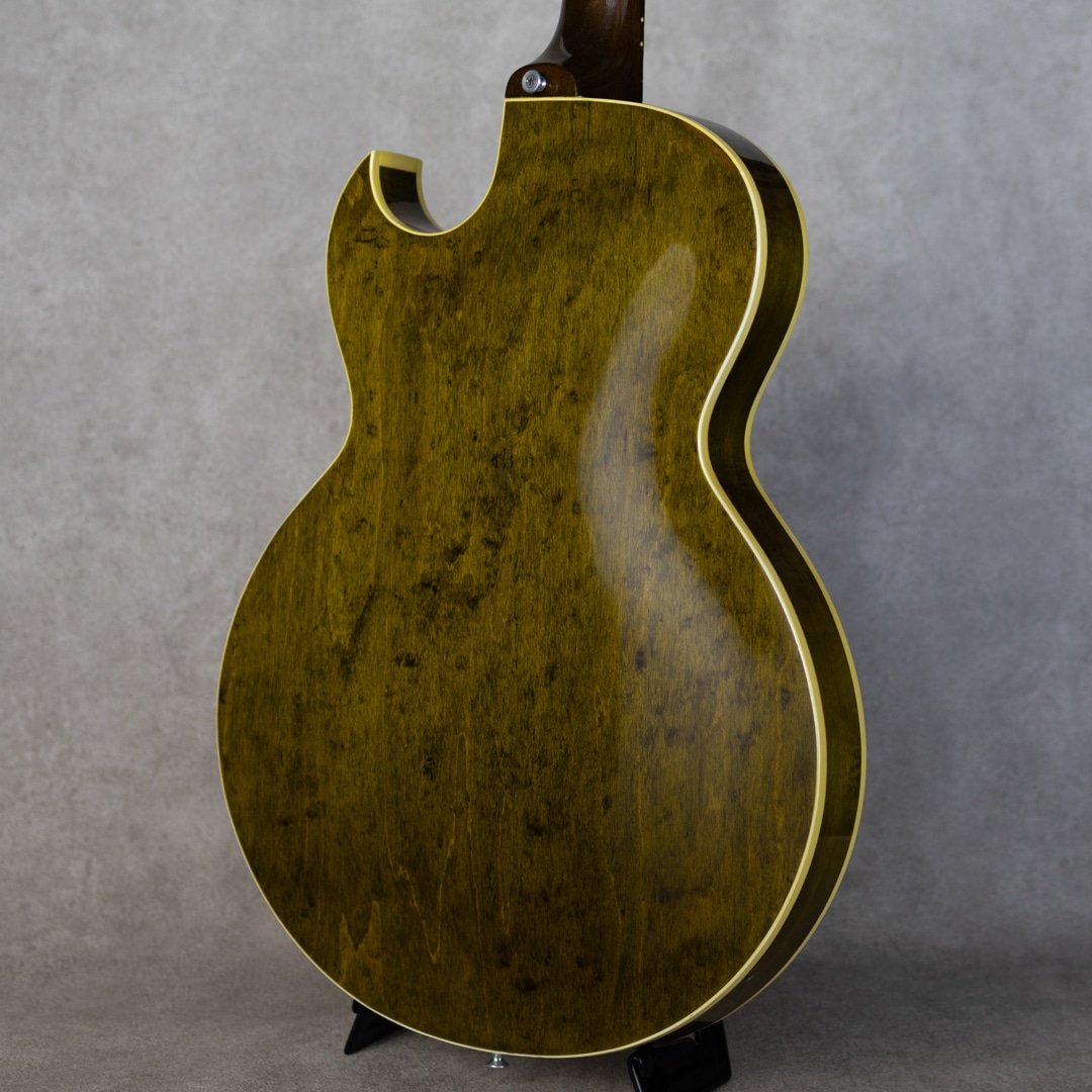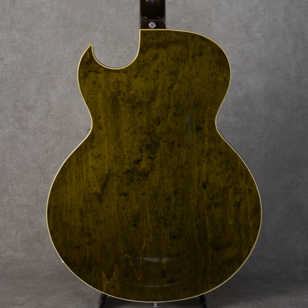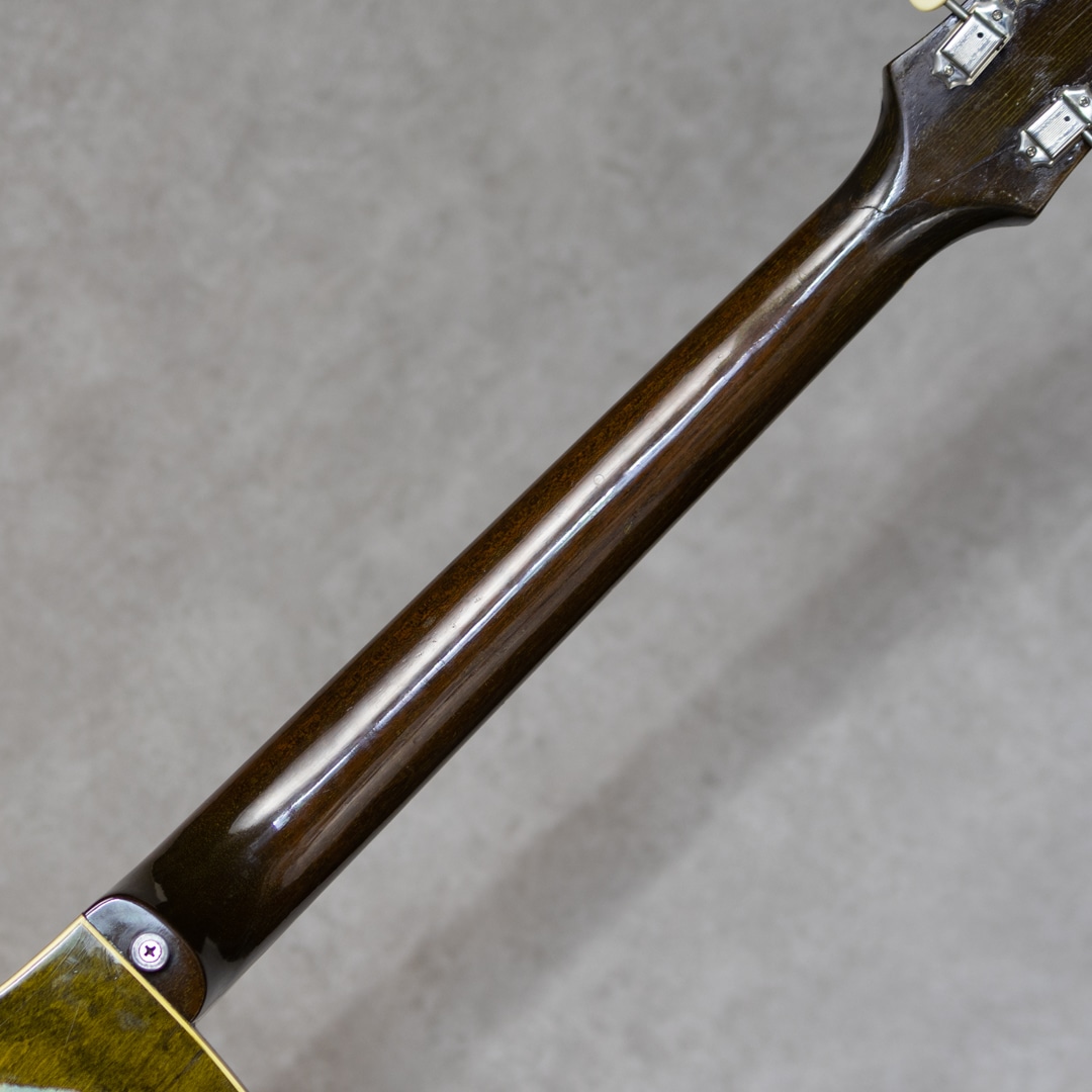 ジャンルを超え様々なアーティストに愛される "Epiphone" 、本器は Gibson Kalamazoo工場にて製作された E452TD"Sorrento" 。フルアコースティック仕様のシンボディにシングルカッタウェイを持ち "Gibson ES-125TDC" とほぼ同一の構造ですが、ミニハムバッカー2機を搭載、125とはまた一味違ったトーンをご体感いただけます。ボディフィニッシュは所謂 "Green Lemon" 系に近い色味の "Royal Olive" カラーで、ボディに刻まれたチェッキングと共に、非常に良い雰囲気を持っております。状態と致しまして、テールピースの交換歴(現在はオリジナル)、ネッククラックの補修歴がございますが、古い時代に強固に接着されており現状演奏性に支障はなくロッドの調整にも問題ございません。ペグはロトマチックタイプに交換されていた歴がありますが、現在は元のスタイルの60年代クルーソンが換装されております。その他、雰囲気を損なうような顕著なダメージも見受けられず良好な外観をキープ、軽快なミニハムバッカーのサウンドを存分にお楽しみいただけます。その他、詳細等は別途お問い合わせくださいませ。