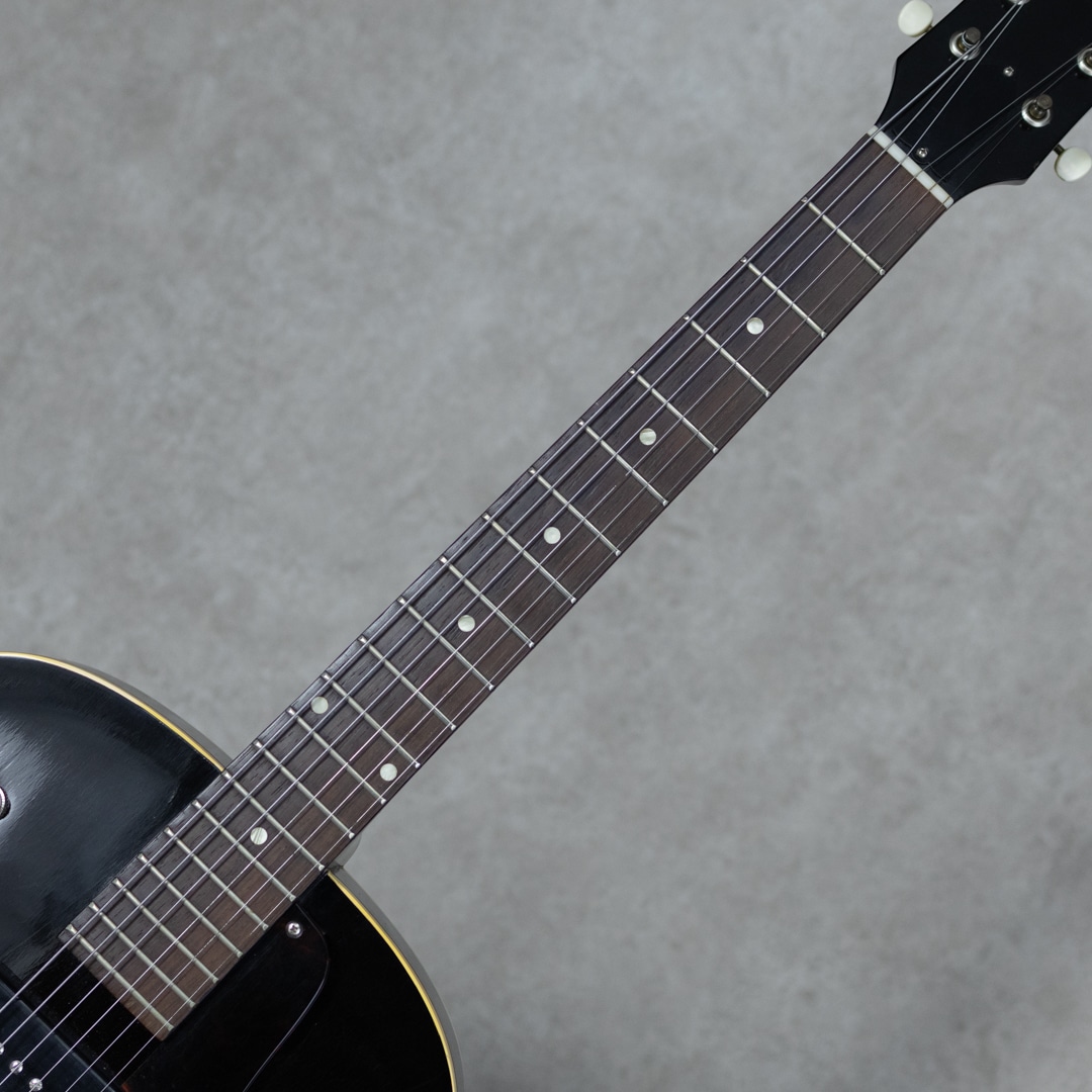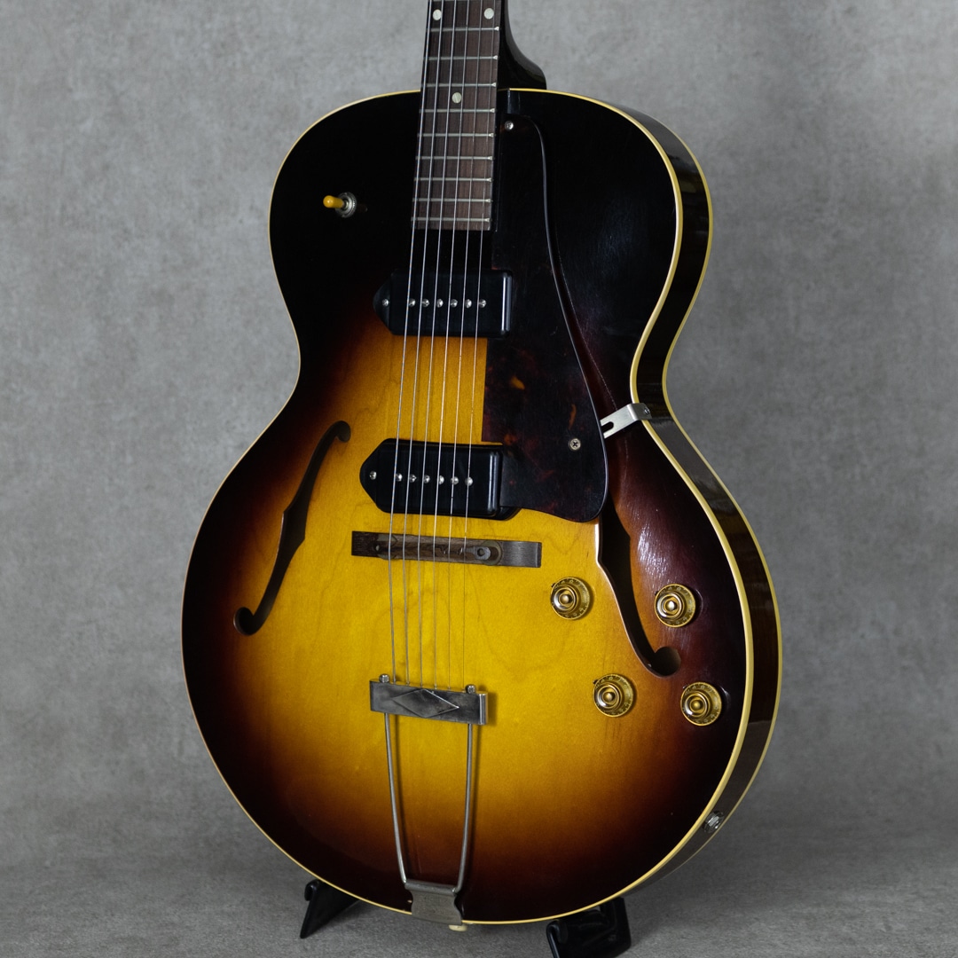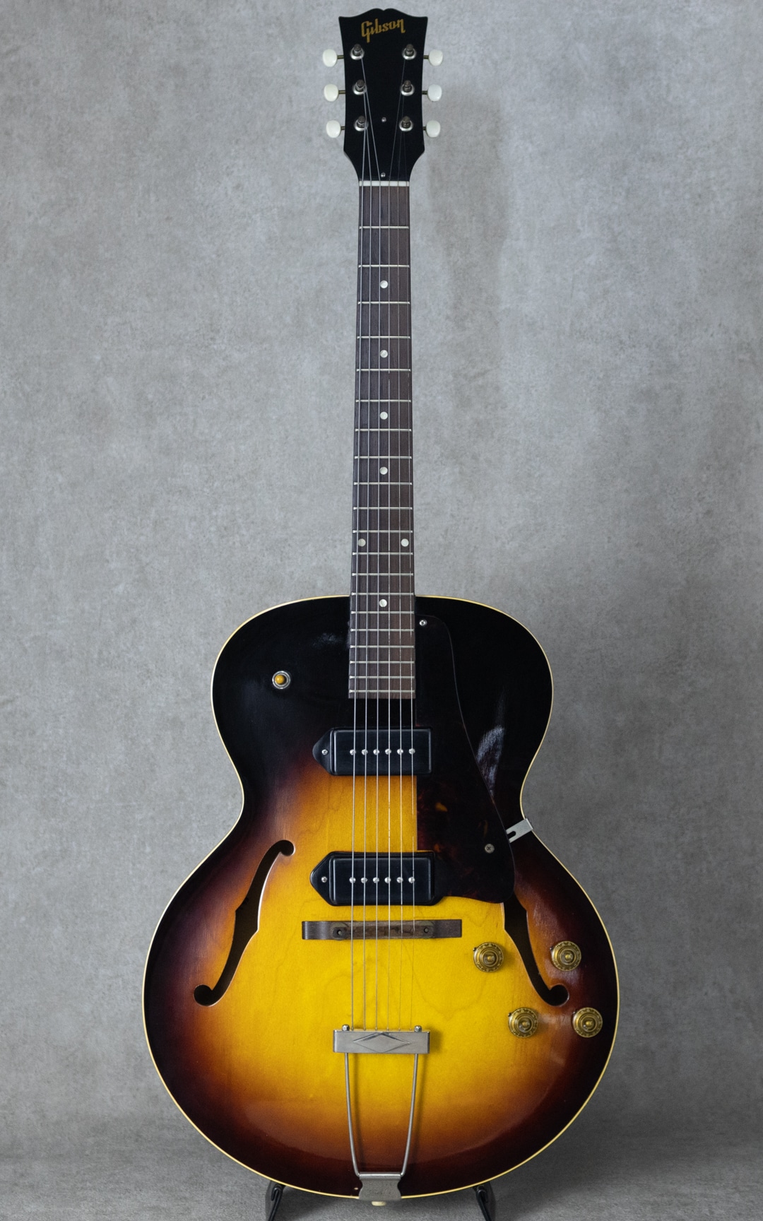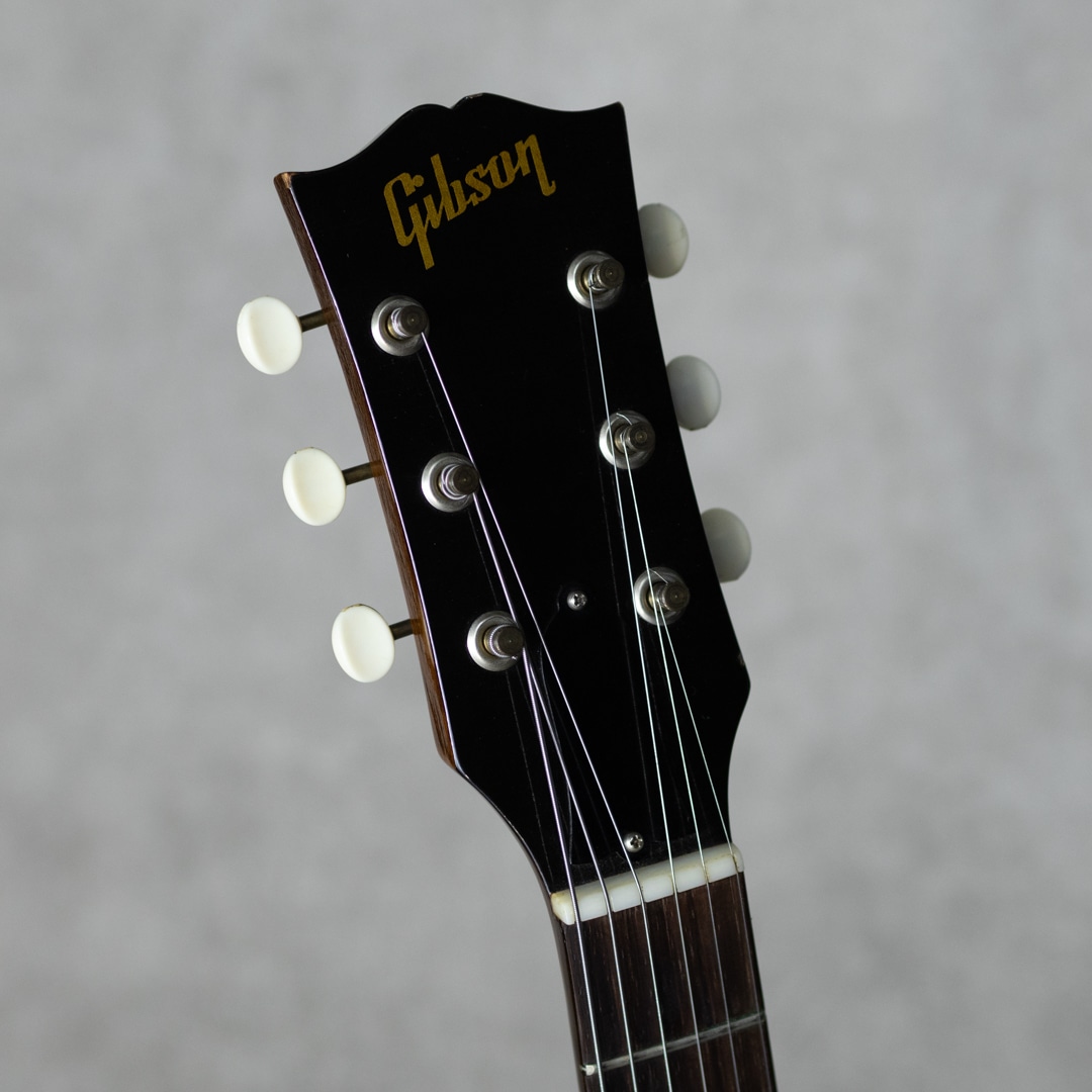 戦後46年の販売再開よりGibsonの普及モデルとして広く販売されたES-125。アーチトップモデルの中では廉価モデルとしてラインナップされ、多彩なバリエーションを持ちます。シンプルな装飾でコストを抑えておりますが、音色は上質。価格の上昇が著しいヴィンテージギブソンの中でも、比較的お求めやすいESとして人気のモデルです。本器はレアな59年製ノンカッタウェイ、ダブルピックアップのスペック。16インチのラミネイトメイプルボディ/マホガニーネック/ハカランダ指板/ワイドナット/17度のレギュラーヘッド角。カッタウェイなし故のアコースティック感の強い生鳴りも申し分無しで、心地よいエアー感と枯れた質感、図太い音像と豊かなサスティンを持ったグッドサウンドを聞かせてくれます。
