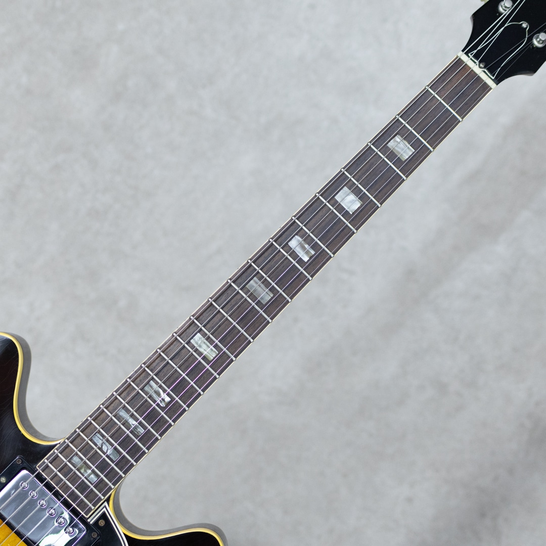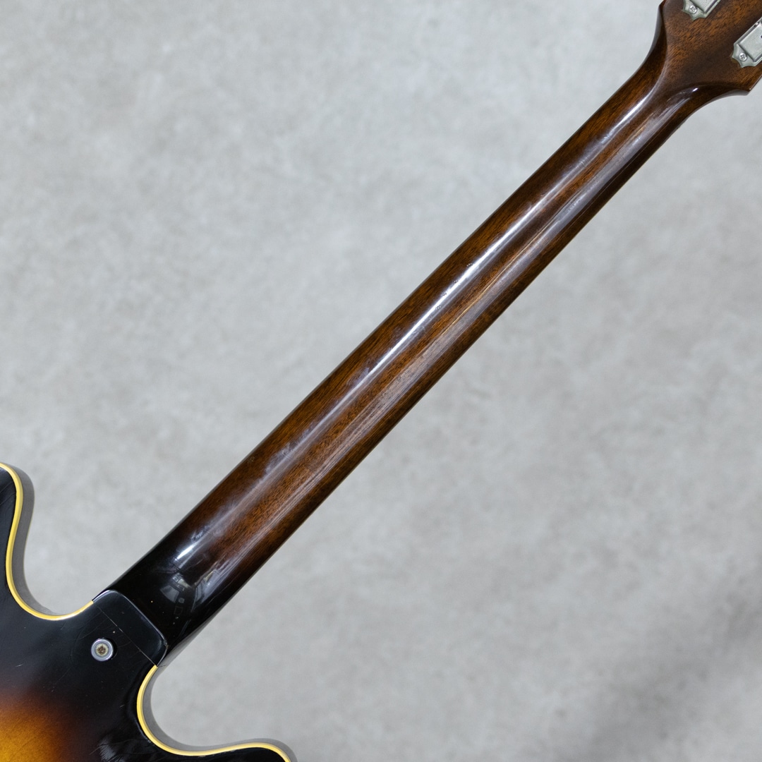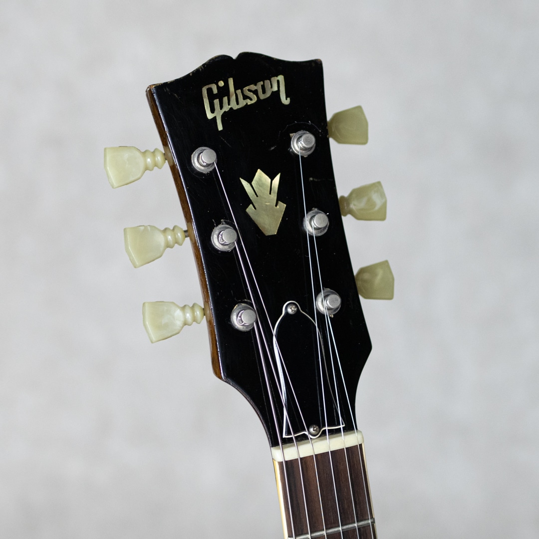 58年頃の生産開始より、いくつもの仕様変更を伴いながら販売が続けられるES-335。本器はブランコテールピースを始め、特徴的なスペックを持つ60年台後半のスタイル。14度の浅いヘッド角に、1ピースマホガニーナローネック、ナイロンサドル、”ステッカードナンバード”を搭載。センタ‐ブロック中央部の空洞は1弦側が大きく開放され、58年~60年台前半までのソリッドな仕様に比べ、よりエアー感を伴ったトーンが魅力の年代。甘いトーンと程よい空気感を持ちながら、艶やかで芯の太い音像が素早いタッチレスポンスで弾け出てくるグッドサウンド。搭載の”ステッカードナンバード”に関して、Gibson では60年台後半のこの頃よりワインディングマシンに自動停止機構が備えられるようになり、それまでばらつきの大きかったコイルの巻き数が均一化。直流抵抗値の安定に加えてマグネットもアルニコVに統一、シリーズ接続される2つのコイルがより同質化することにより、元来求められたハムキャンセリングの原理が、より安定した製品のレベルに持ち上げられた年台です。昨今では”オリジナルPAF”の再現として、あえて2つのコイルの巻き数をずらす工夫も見受けられますが、ブライトで繊細、シングルライクなそれに比べ、より"ハムバッカー"然とした音の厚み、パワフルながら整ったダイナミクスの出力から成るスムースなドライブトーンなどはこの年代故の魅力です。