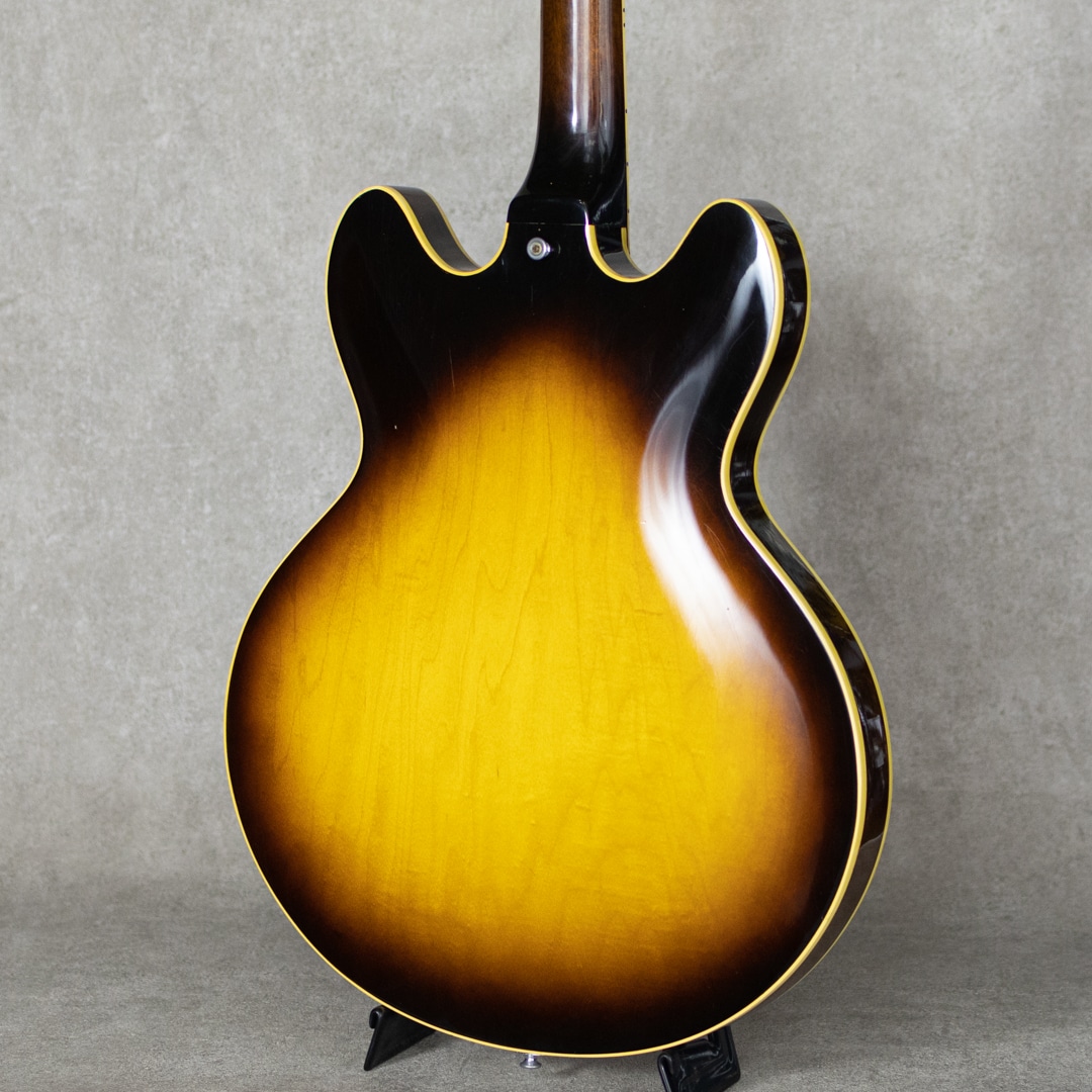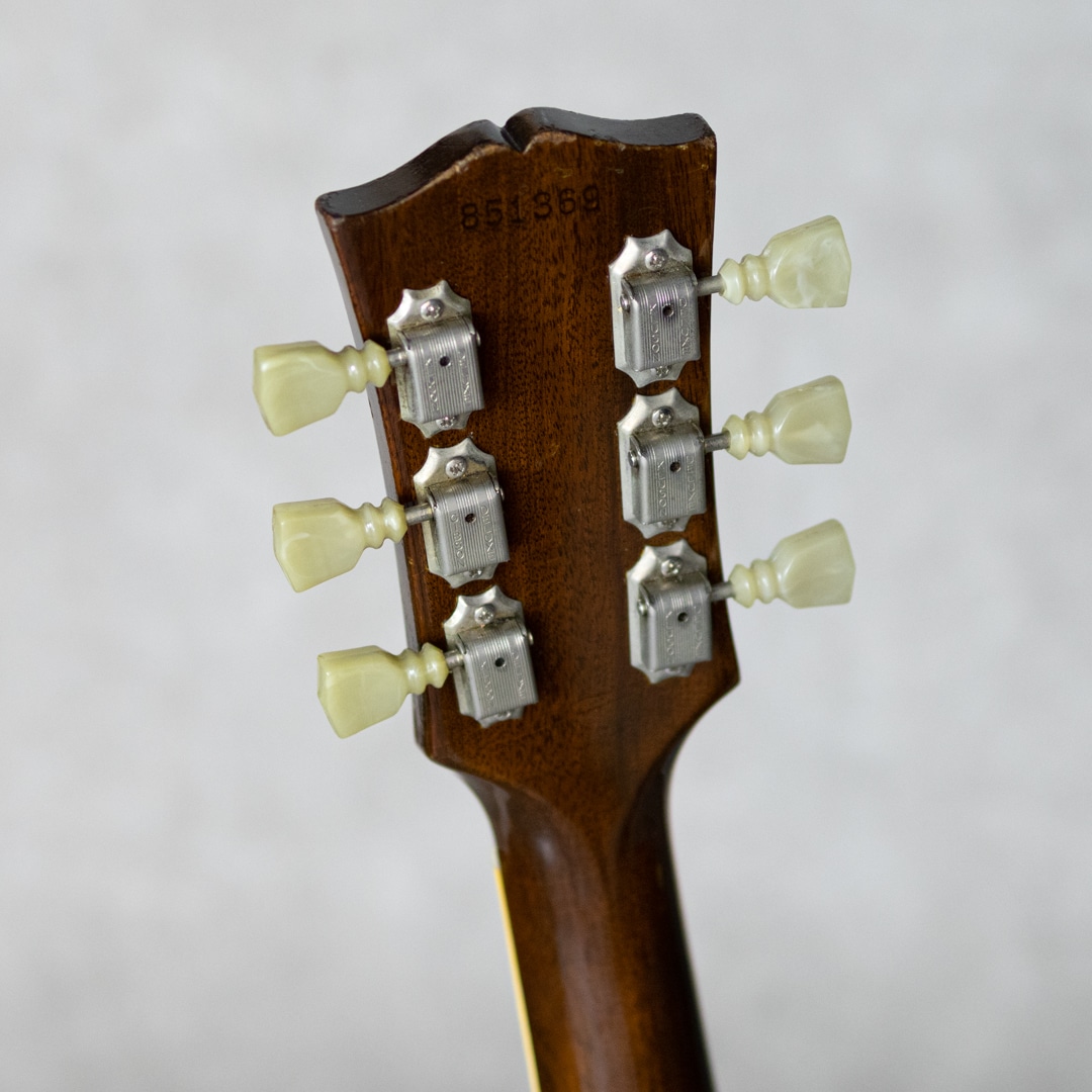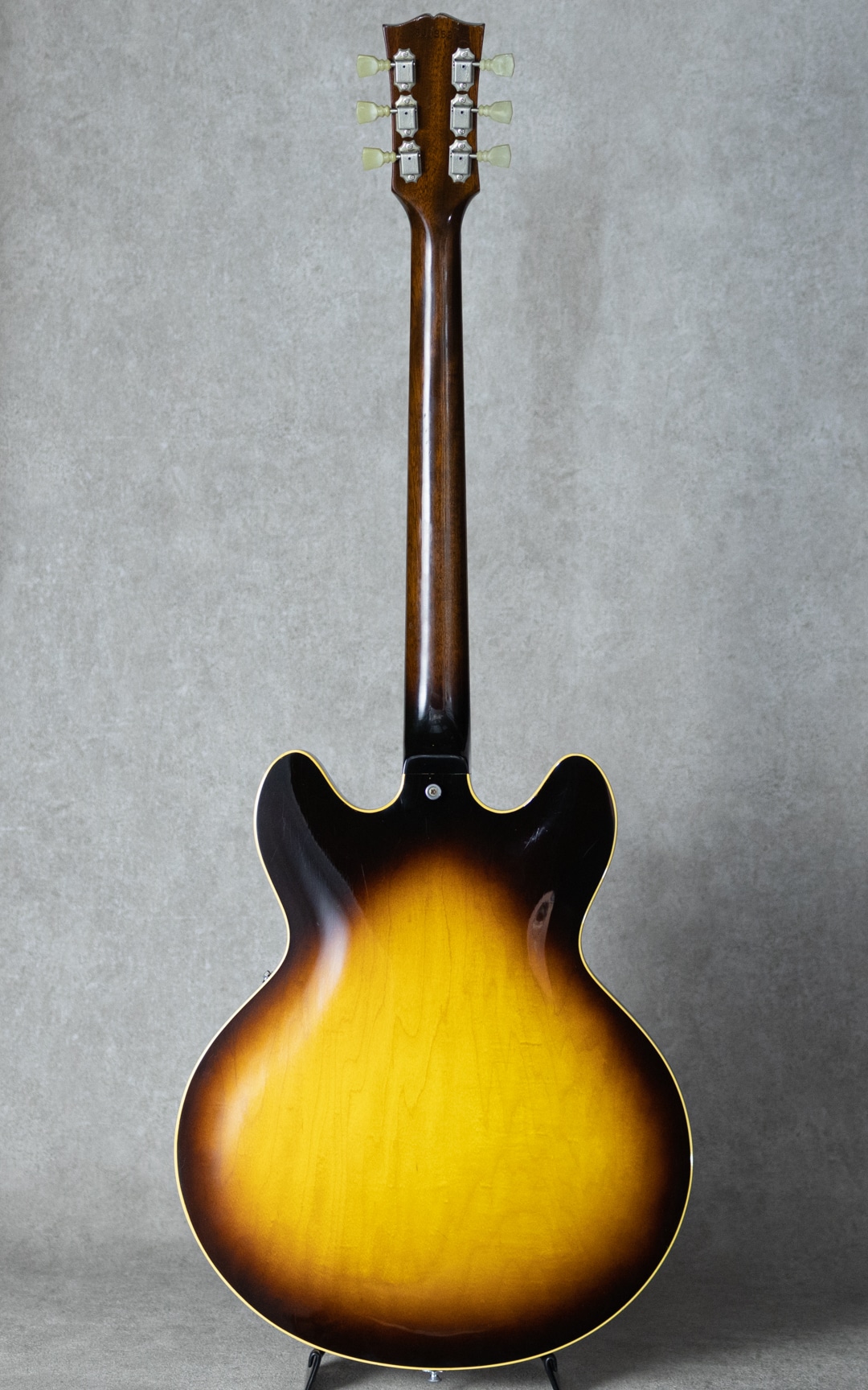 58年頃の生産開始より、いくつもの仕様変更を伴いながら販売が続けられるES-335。本器はブランコテールピースを始め、特徴的なスペックを持つ60年台後半のスタイル。14度の浅いヘッド角に、1ピースマホガニーナローネック、ナイロンサドル、”ステッカードナンバード”を搭載。センタ‐ブロック中央部の空洞は1弦側が大きく開放され、58年~60年台前半までのソリッドな仕様に比べ、よりエアー感を伴ったトーンが魅力の年代。甘いトーンと程よい空気感を持ちながら、艶やかで芯の太い音像が素早いタッチレスポンスで弾け出てくるグッドサウンド。搭載の”ステッカードナンバード”に関して、Gibson では60年台後半のこの頃よりワインディングマシンに自動停止機構が備えられるようになり、それまでばらつきの大きかったコイルの巻き数が均一化。直流抵抗値の安定に加えてマグネットもアルニコVに統一、シリーズ接続される2つのコイルがより同質化することにより、元来求められたハムキャンセリングの原理が、より安定した製品のレベルに持ち上げられた年台です。昨今では”オリジナルPAF”の再現として、あえて2つのコイルの巻き数をずらす工夫も見受けられますが、ブライトで繊細、シングルライクなそれに比べ、より"ハムバッカー"然とした音の厚み、パワフルながら整ったダイナミクスの出力から成るスムースなドライブトーンなどはこの年代故の魅力です。