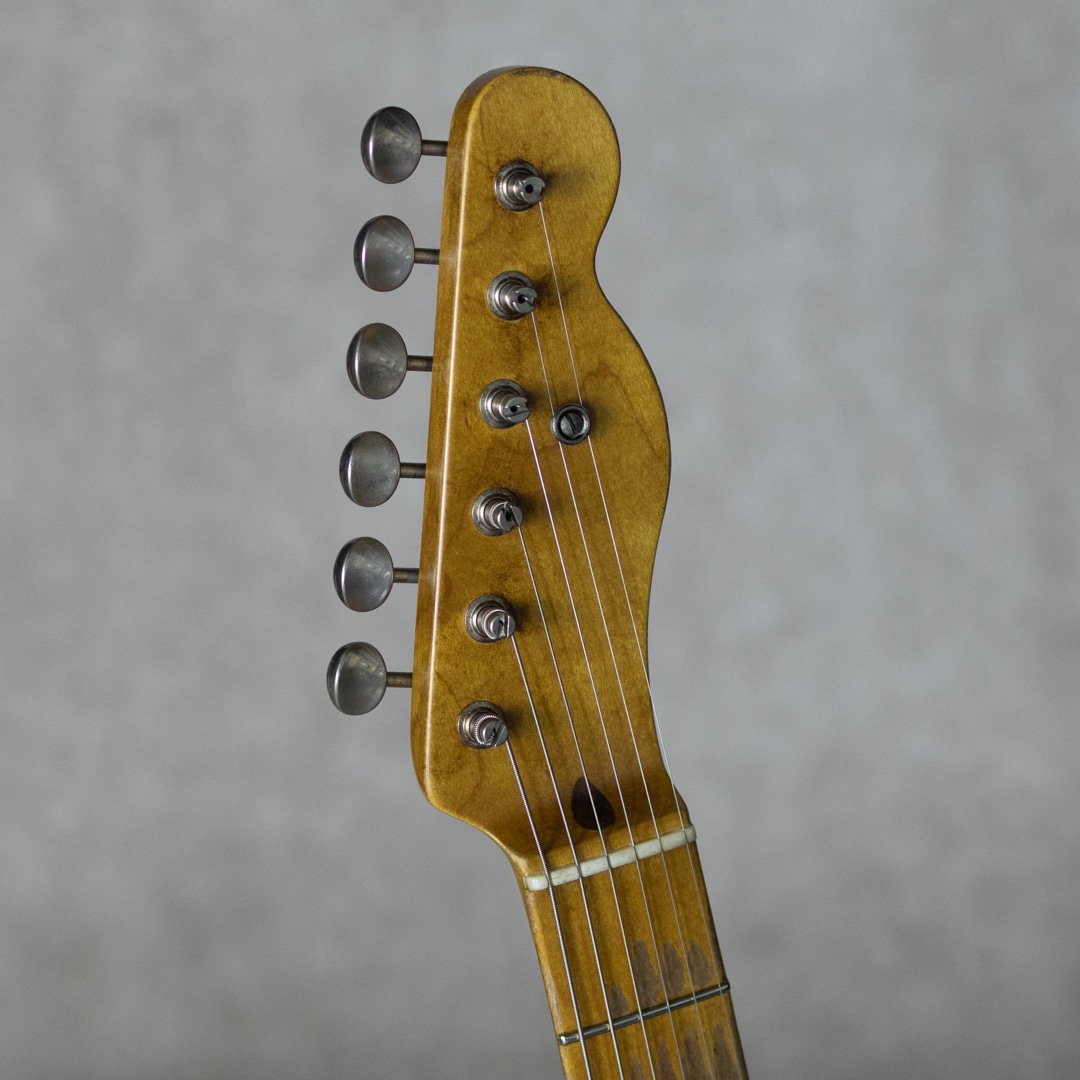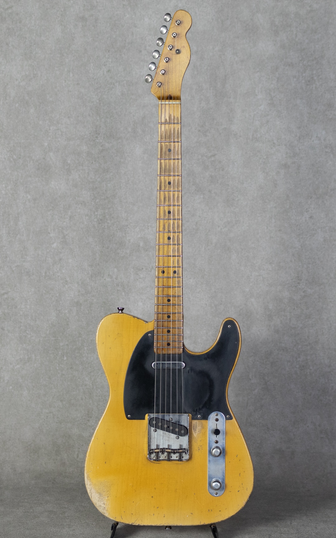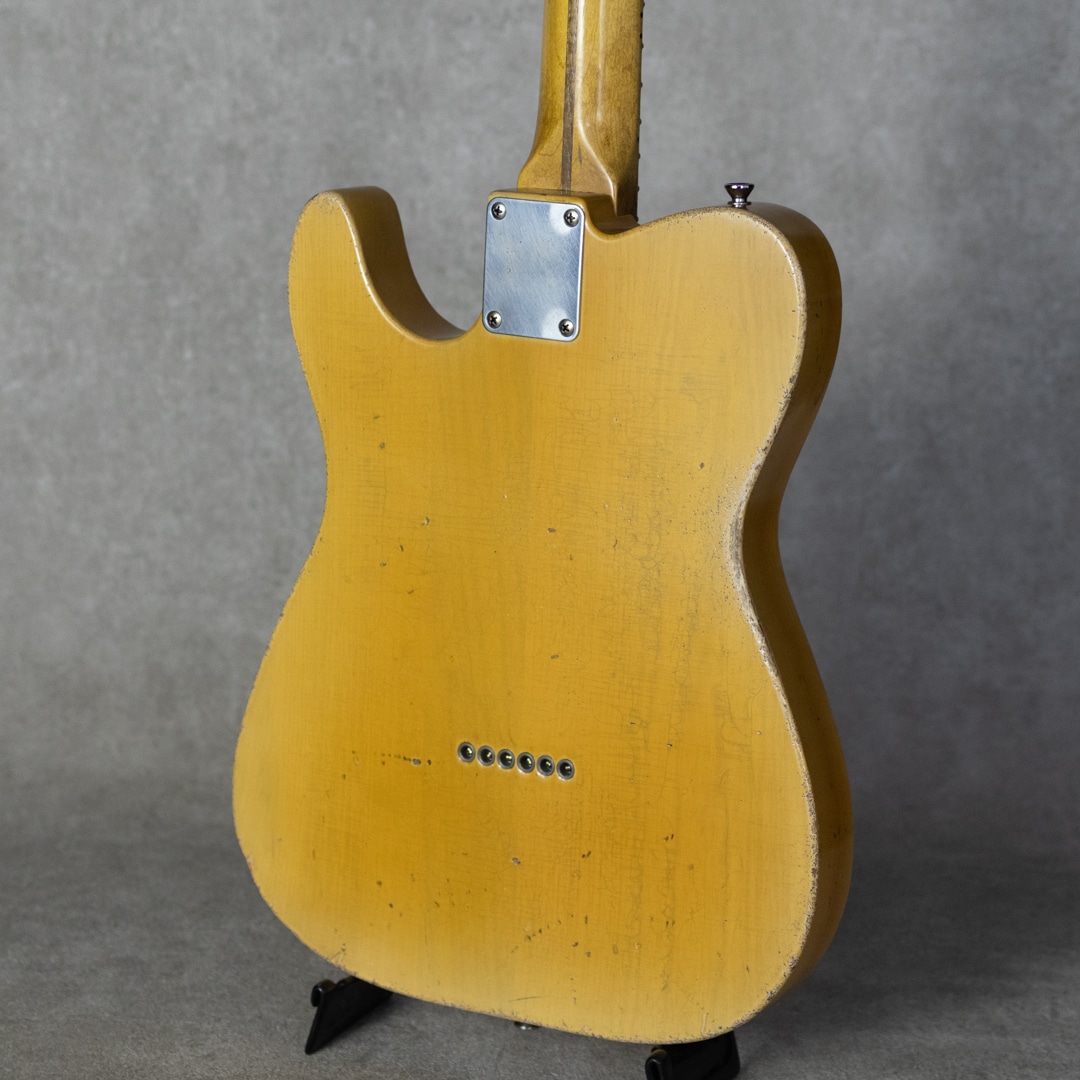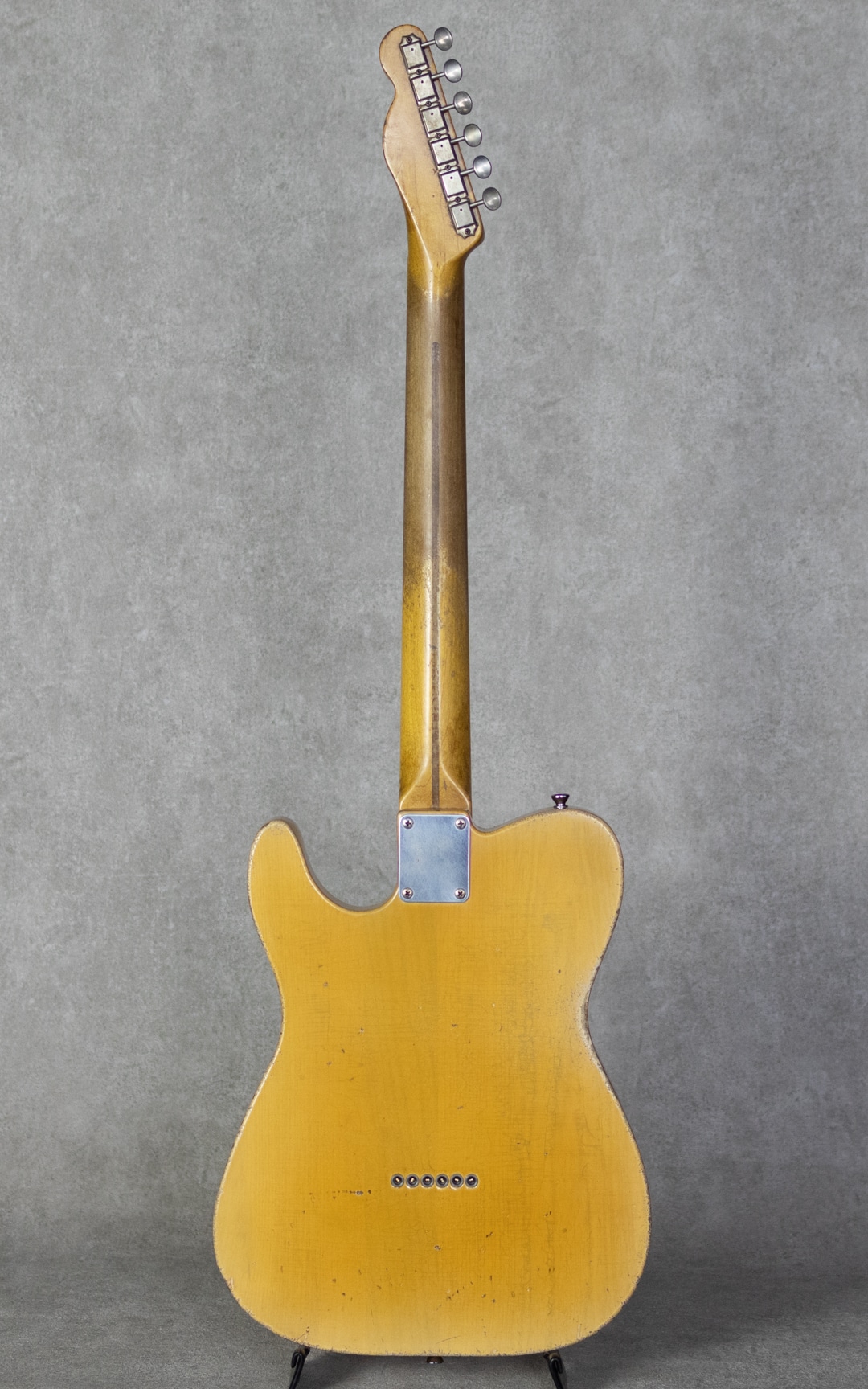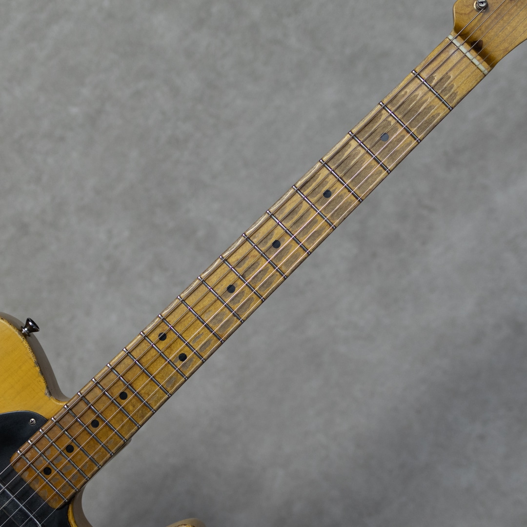 "THE BLACKGUARD BOOK"の著書でもあるNacho Banos氏による、究極のBlackguard Replicaブランド"Nacho Guitars”。年間の製作本数は非常に少なく日本国内への入荷数も限られており、カタログモデルといった概念は無く1本1本個性を宿したギターをワンオフで製作するようなスタイルが貫かれています。同じ年代・特徴のモデルであっても、それぞれが個性を持った外観・弾き心地・そしてサウンドが表現されております。本器は、”1950-1952 Blackguard #2035 Heavy Aging Butterscotch Blonde Soft V Neck”。オリジナル・ブラックガードを知り尽くしたNacho氏の経験値を元に製作される、圧巻の完成度を誇る 50’sレプリカの1本。メイプルワンピースネック、アッシュボディのウッドスペック。オールドを知り尽くしたNacho氏ならではの雰囲気あるヘビーエイジド加工が施されたバタースコッチブロンドカラー。ソフトVシェイプに仕上げられたネックはこの年代独特の山なりを感じるVながらに、太くなく握り心地の良いネックシェイプです。本物さながらの経年したハードウェア、オリジナル同様に塗装吹き付けをしエイジングしたフェノール樹脂PGは、その作り込みを愛でるだけでも楽しめる仕上がり。9.5”ラジアス指板、ミディアムフレット、50’sスタイルのブリッジにコンペンセイテッドブラスサドル、Early 50’sスタイルピックアップ。ピックアップセレクターワイヤリングは、ブリッジPU、ブリッジ&ネックのシリーズアウト、ネックPUです。倍音感にあふれる甘いトーンから、トゥワンギーでカラッとしたテレサウンドまで、このスタイルに求められるサウンドを遺憾なく発揮してくれます。ストイックにブラックガードを愛したNacho氏ながら、指板ラジアスやピックアップワイヤリングなどはモダンで使いやすいセットをセレクトしており、より実戦向きで使えるビンテージレプリカに仕上げられています。オリジナルビンテージと見まごうほどの雰囲気と仕上がりの話題と人気を集めるスペイン発”Nacho Guitars”。オリジナルハードケース、ブリッジカバー、オリジナル・レザーバック、50年代当時のFender資料のコピー、スペックシート、当機の画像データが入ったUSBとUSB用の木箱、レザーストラップ付属