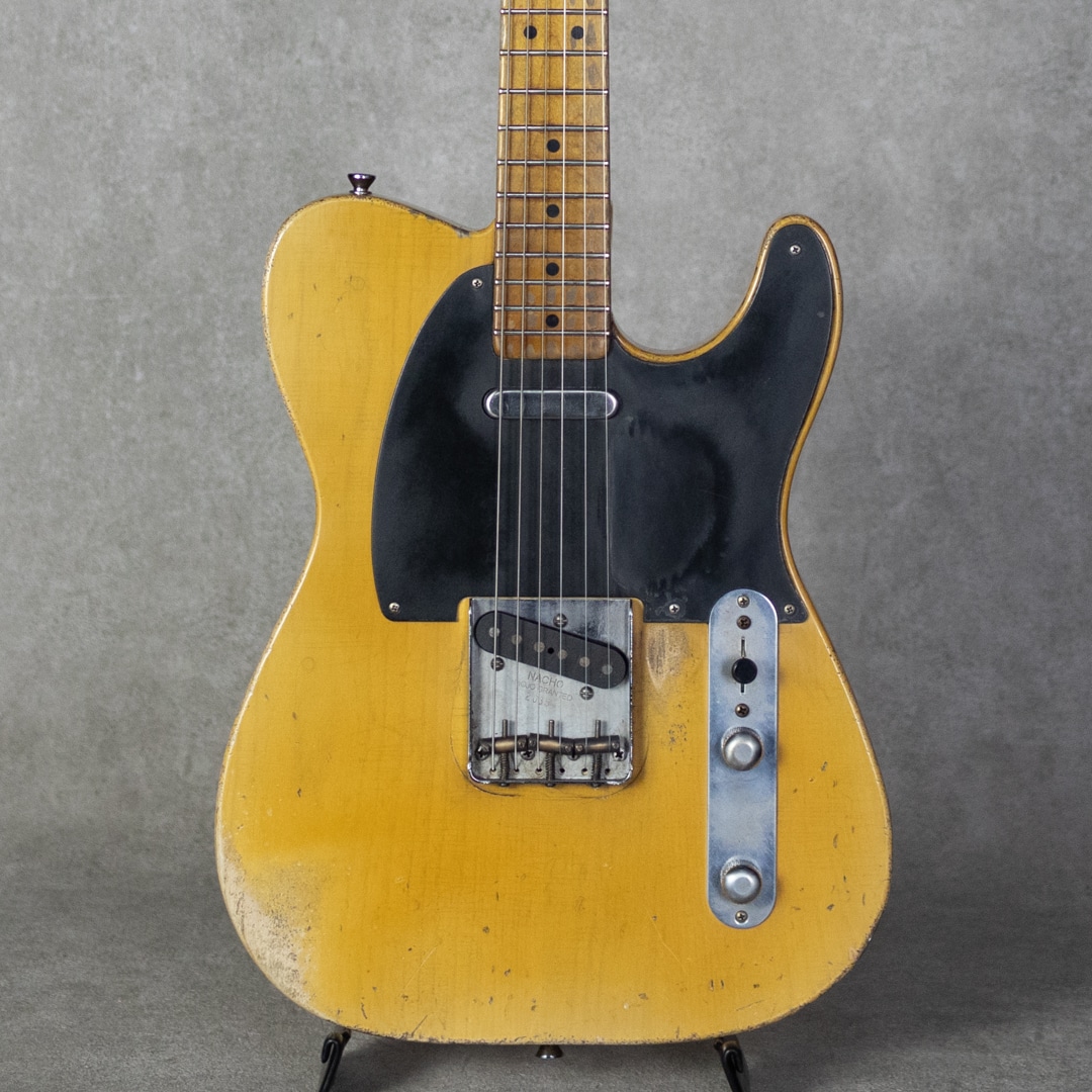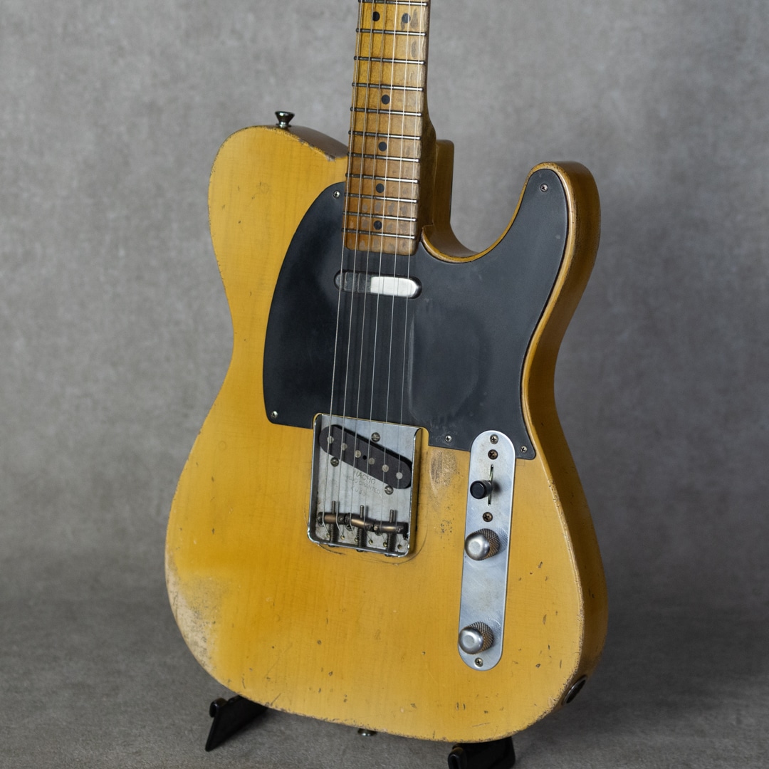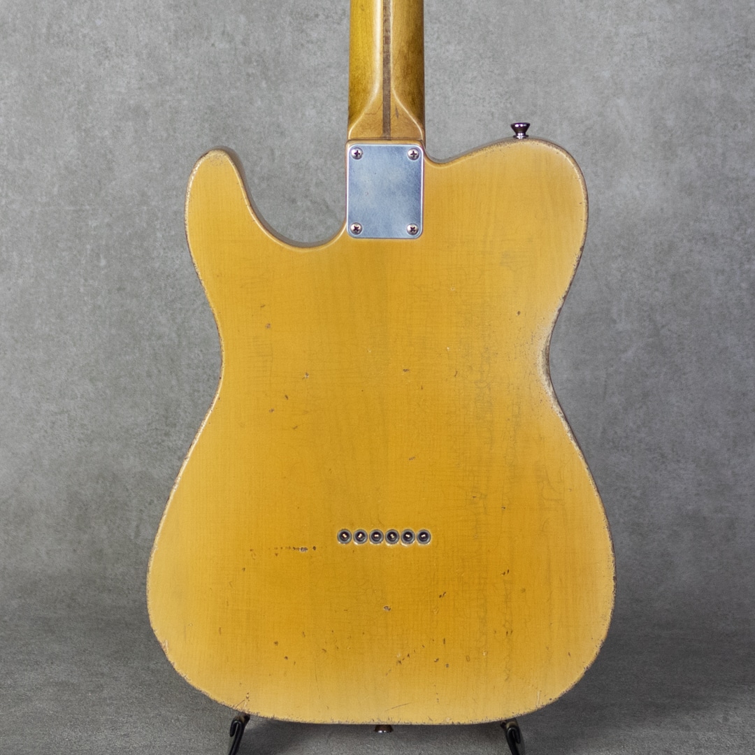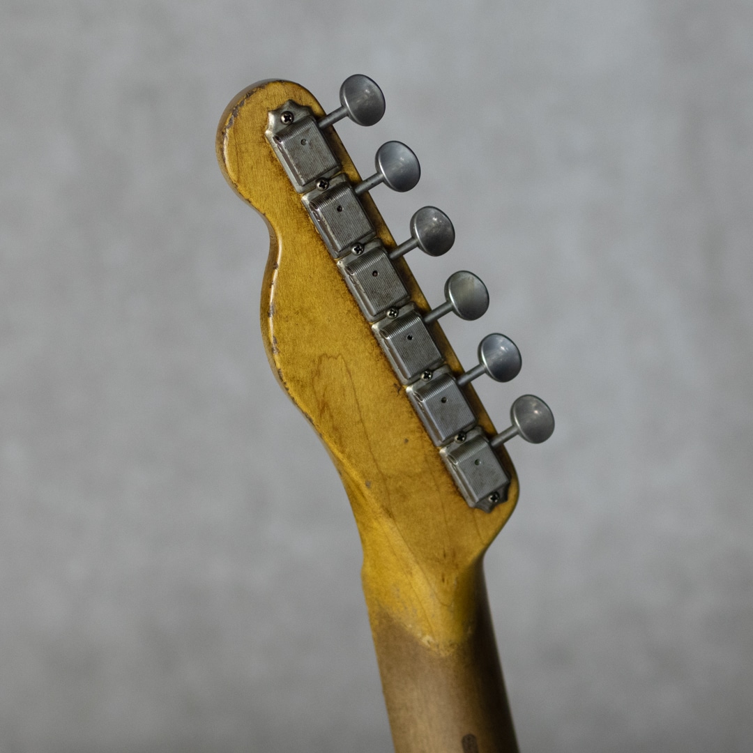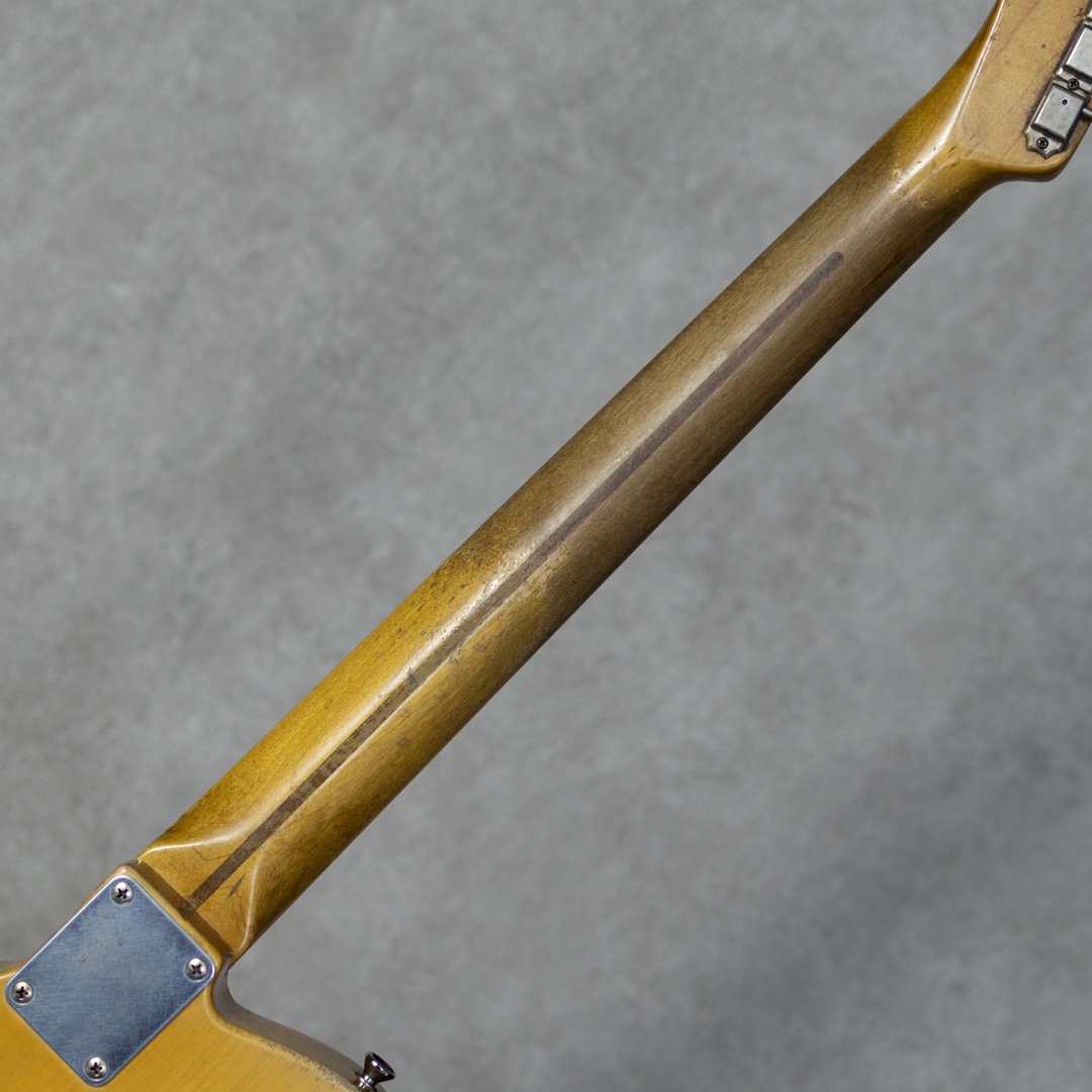 "THE BLACKGUARD BOOK"の著書でもあるNacho Banos氏による、究極のBlackguard Replicaブランド"Nacho Guitars”。年間の製作本数は非常に少なく日本国内への入荷数も限られており、カタログモデルといった概念は無く1本1本個性を宿したギターをワンオフで製作するようなスタイルが貫かれています。同じ年代・特徴のモデルであっても、それぞれが個性を持った外観・弾き心地・そしてサウンドが表現されております。本器は、”1950-1952 Blackguard #2035 Heavy Aging Butterscotch Blonde Soft V Neck”。オリジナル・ブラックガードを知り尽くしたNacho氏の経験値を元に製作される、圧巻の完成度を誇る 50’sレプリカの1本。メイプルワンピースネック、アッシュボディのウッドスペック。オールドを知り尽くしたNacho氏ならではの雰囲気あるヘビーエイジド加工が施されたバタースコッチブロンドカラー。ソフトVシェイプに仕上げられたネックはこの年代独特の山なりを感じるVながらに、太くなく握り心地の良いネックシェイプです。本物さながらの経年したハードウェア、オリジナル同様に塗装吹き付けをしエイジングしたフェノール樹脂PGは、その作り込みを愛でるだけでも楽しめる仕上がり。9.5”ラジアス指板、ミディアムフレット、50’sスタイルのブリッジにコンペンセイテッドブラスサドル、Early 50’sスタイルピックアップ。ピックアップセレクターワイヤリングは、ブリッジPU、ブリッジ&ネックのシリーズアウト、ネックPUです。倍音感にあふれる甘いトーンから、トゥワンギーでカラッとしたテレサウンドまで、このスタイルに求められるサウンドを遺憾なく発揮してくれます。ストイックにブラックガードを愛したNacho氏ながら、指板ラジアスやピックアップワイヤリングなどはモダンで使いやすいセットをセレクトしており、より実戦向きで使えるビンテージレプリカに仕上げられています。オリジナルビンテージと見まごうほどの雰囲気と仕上がりの話題と人気を集めるスペイン発”Nacho Guitars”。オリジナルハードケース、ブリッジカバー、オリジナル・レザーバック、50年代当時のFender資料のコピー、スペックシート、当機の画像データが入ったUSBとUSB用の木箱、レザーストラップ付属
