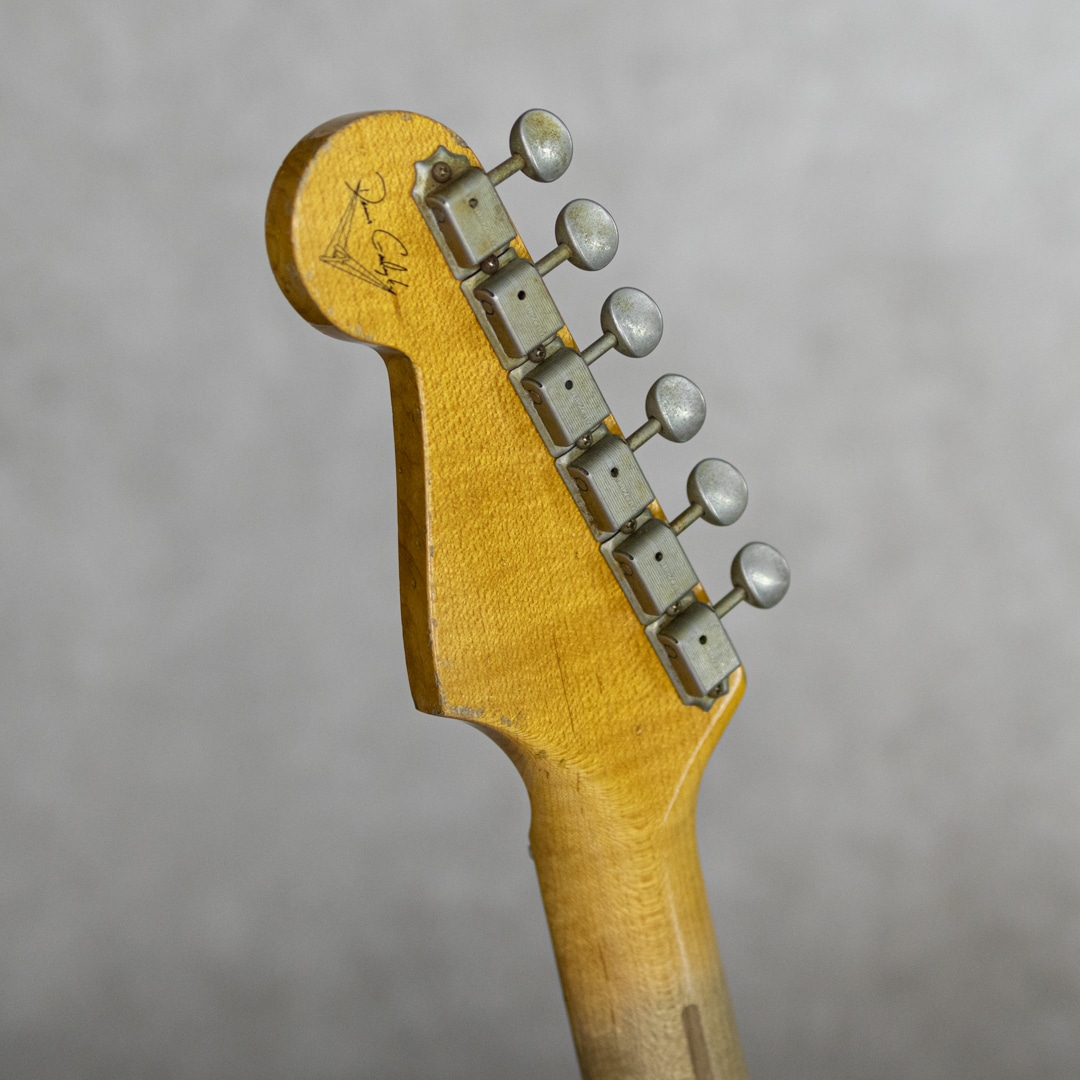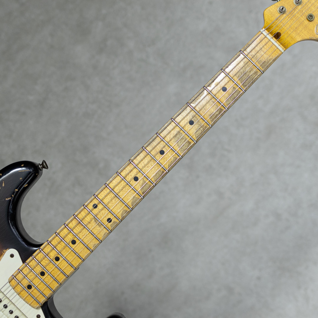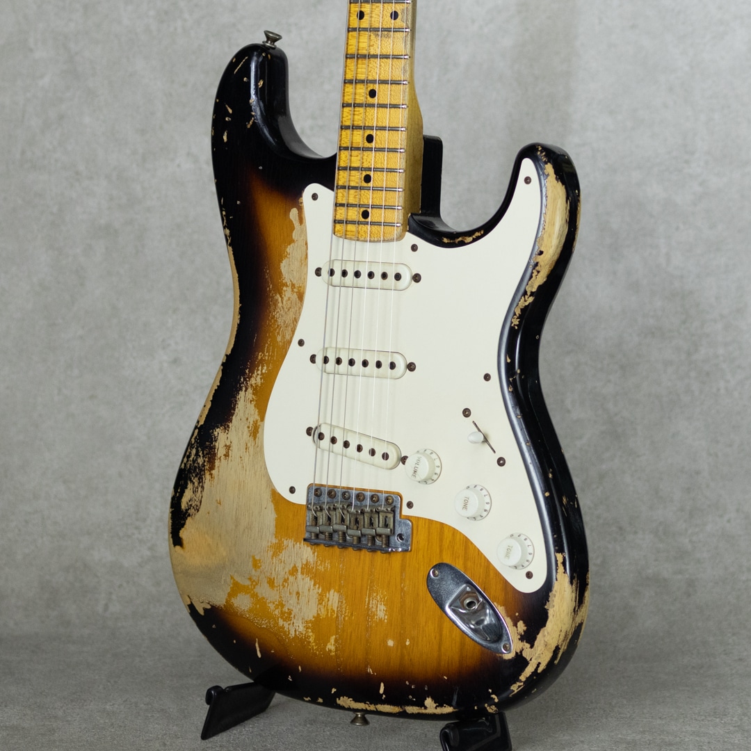 "Fender Custom Shop"最高峰の憧れ"Master Built"。本器は”Dennis Galuszka(デニス・ガルスカ)”作の”1954 Stratocaster Heavy Relic 2 Color Sunburst”。2014年製USED品。1ピースアッシュボディ、メイプルワンピースネック、ストラトキャスター初年度になる1954年仕様。ネックのメイプル材はしっかりと柾目取りで取られており、握り心地が良い”U”シェイプネック。9.5”R指板、6105/ナロウトールフレット。長年しっかりと弾き込まれてきたような貫禄の雰囲気をまとうヘビーレリック加工が施されています。こだわりのショートスカートノブやフットボールスイッチノブは、オリジナルビンテージのようにベークライト製パーツが使用されており、ヒビ割れが見られますが現状は使用強度を保っています。ピックアップはショート Gスタッガードの”54 PickUp”を搭載。またコンデンサーには当時も使用されていたワックスペーパーコンデンサーが搭載されています。ポール・マッカートニーやアンディー・サマーズ、ジョニー・マー、パトリック・スタンプ、マイク・ダーント、スティングなど、数多くのミュージシャンの楽器も手がける、音楽と木工に対する情熱を持つ"Dennis Galuszka”。美しくクリアでベルトーンの冴え渡る’54サウンド。ほど好く枯れたミドルテイストながら、しっかりとアタックが立ちダイナミクスレンジにも長けるメイプル&アッシュサウンドです。決して耳障りでなく、切り裂くアタックとサスティンは、フィンガータッチのニュアンスからエッジーなトーンまで幅広く表現してくれます。使用に伴う傷や使用感は伺いにくく、とても良好なコンディションで保たれた本器。ネックコンディションも良好でフレット減りも殆んど無く、弾きやすいアクションでしっかりとお使いいただけます。憧れのマスタービルト、そして憧れの初年度54モデル。見てよし弾いてよしのコレクタブルストラトをお探しの方にオススメしたい正統派アプローチのビンテージモデルです。オリジナルツイードハードケース、認定書、トレモロアームやバックパネル等もしっかりと付属します。