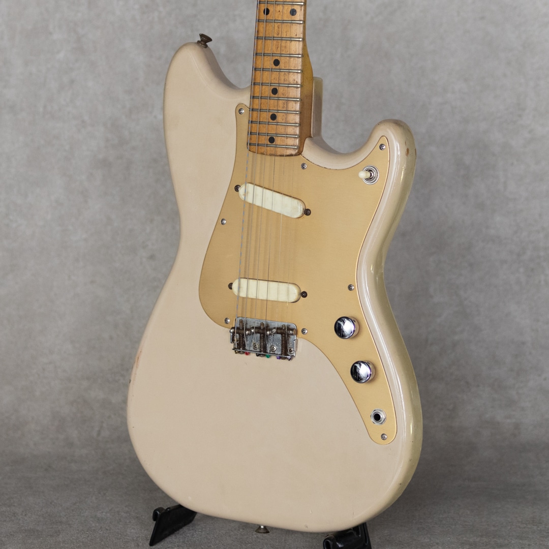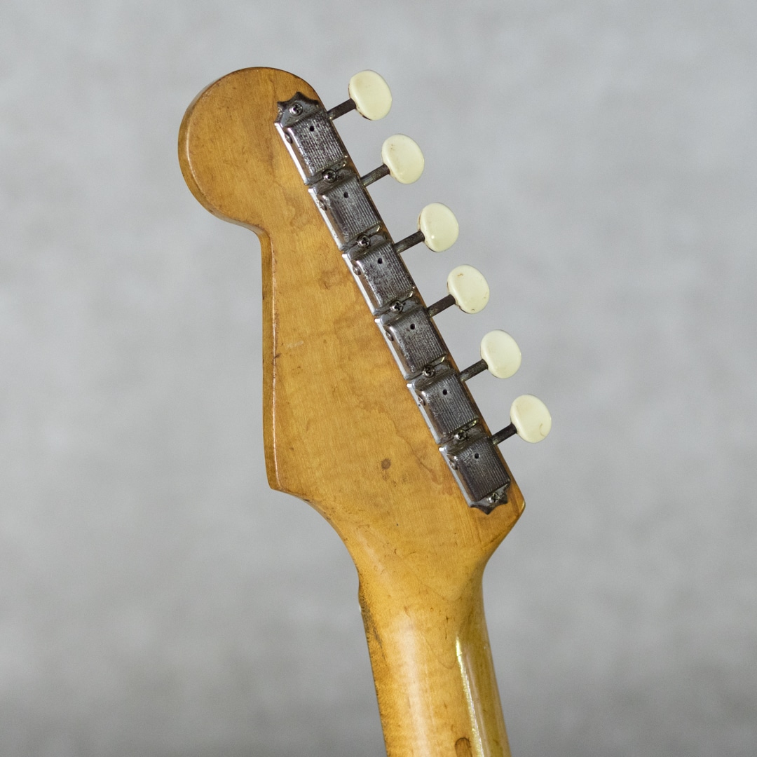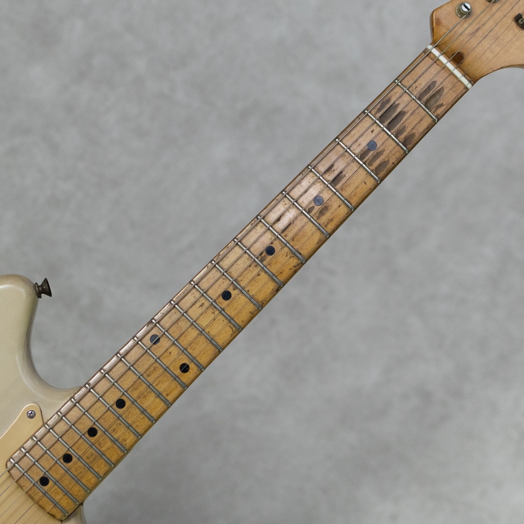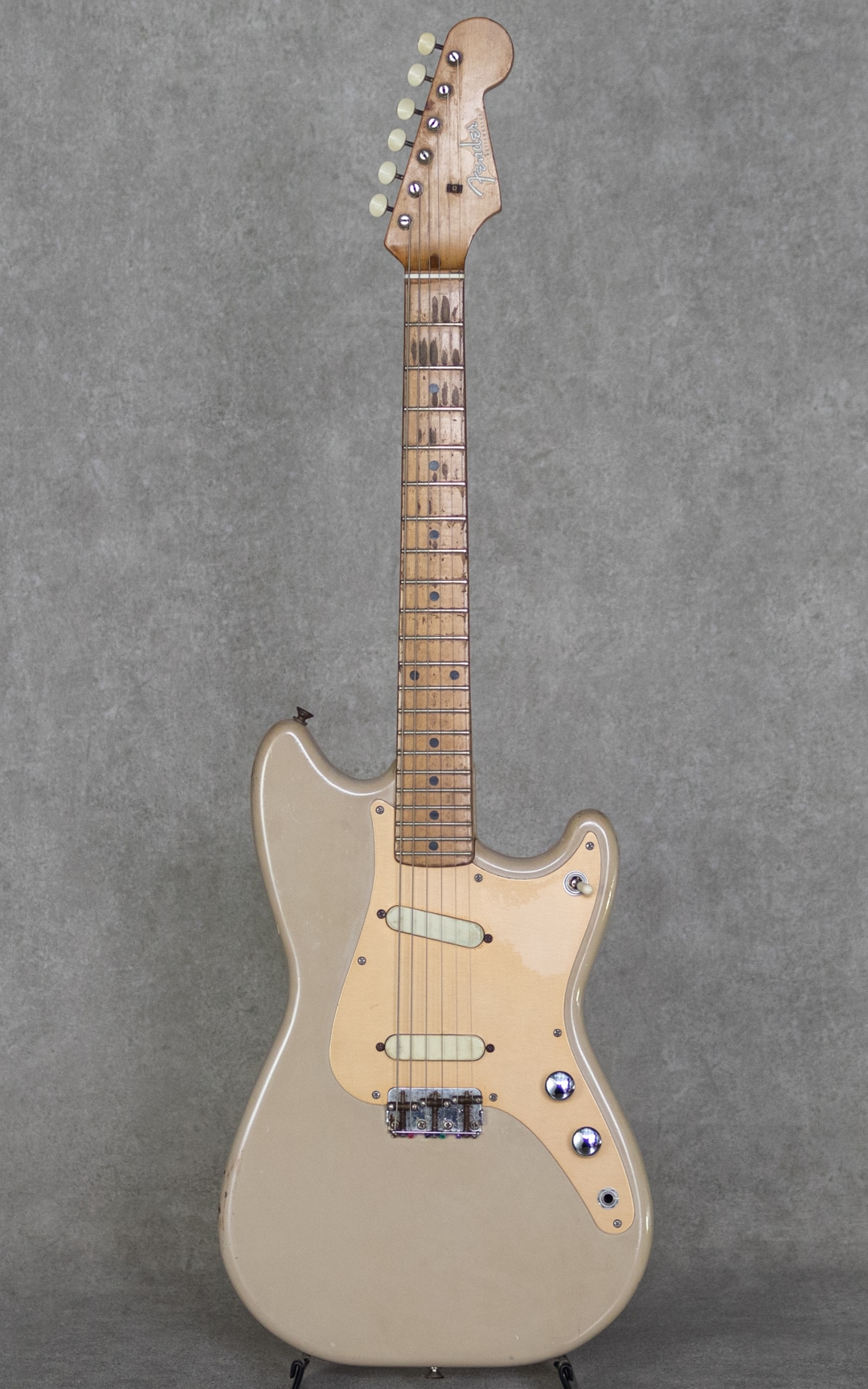 Fender 3/4モデル”Musicmaster”&”Duo-Sonic"。1956年代半ばに登場したスチューデントモデルのひとつで、1ピックアップモデルの”Musicmaster”と2ピックアップモデルの”Duo-Sonic”がラインナップされていました。本器は、発売初年度となる1956年製の”Musicmaster”のネックに1957年製頃製と見られる”Duo-Sonic”のボディが組み合わせられた1本。ネックはうっすらとフィギュアド杢が浮かび上がる板目取りされたメイプルワンピースネック。オリジナルシングルラインクルーソンデラックスペグが搭載されており、オリジナルフィニッシュを残してリフレットがされたグッドコンディションの”Musicmaster”デカールのネック。ネックデイトがしっかりと確認でき1956年製と判断できます。ボディは”Duo-Sonic"と見られ、オリジナルフィニッシュでザグリ痕などもなくグッドルッキンのボディ。オリジナルブリッジを搭載しており、ネックプレートのシリアルから1957年頃製のボディと思われます。ピックアップも片側のPU配線材が交換されていますが、同年代のオリジナルPUが残されています。コンデンサーは”RMC”0.05uFのセラミックディスクを使用。POTやスイッチ、ジャックやノブ類は近年製にて交換されておりますが、ワイヤリングなどは丁寧な作業でされています。スイッチレイアウトはオリジナルとは異なり、センターポジションでパラレル配線になるようになっています。PGマウントスクリューやPUマウントスクリューの一部などがリプレイスパーツですが、可能な限り当時のパーツを使用した好印象のニコイチ・ビンテージ品。プレイコンディションはとても良く、音詰まりなどもなく低いアクションでプレイ可能。ネック周りもトラスロッドの余裕を残し、フレット残りもしっかりと余裕があり良好です。サウンドも良く乾いたドライなアタックと、メイプルネックならではの程よく落ち着いたミドルテイストとサスティン感がたまらない1本です。”Musicmaster”/"Duo-Sonic"を基にした改造モデル。ひと昔は多く見られましたが、ビンテージの価格高騰で見られにくくなりました。手入れされながらビンテージをしっかりと残すアプローチの本器、まだまだしっかりとお使いいただけるグッドコンディションのプレイヤーズビンテージです。ギグバッグ付属
