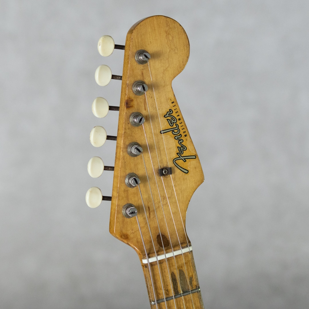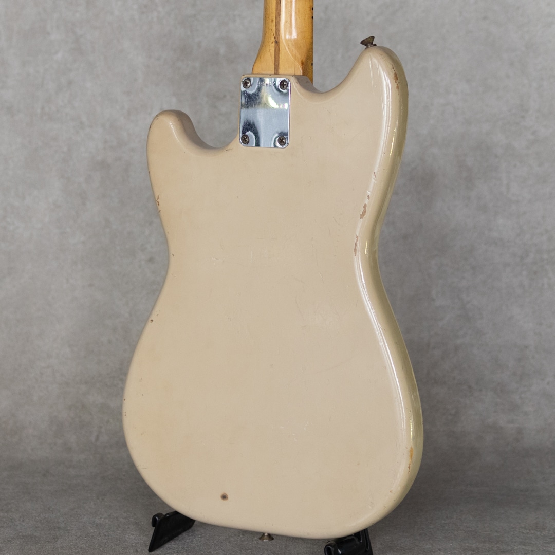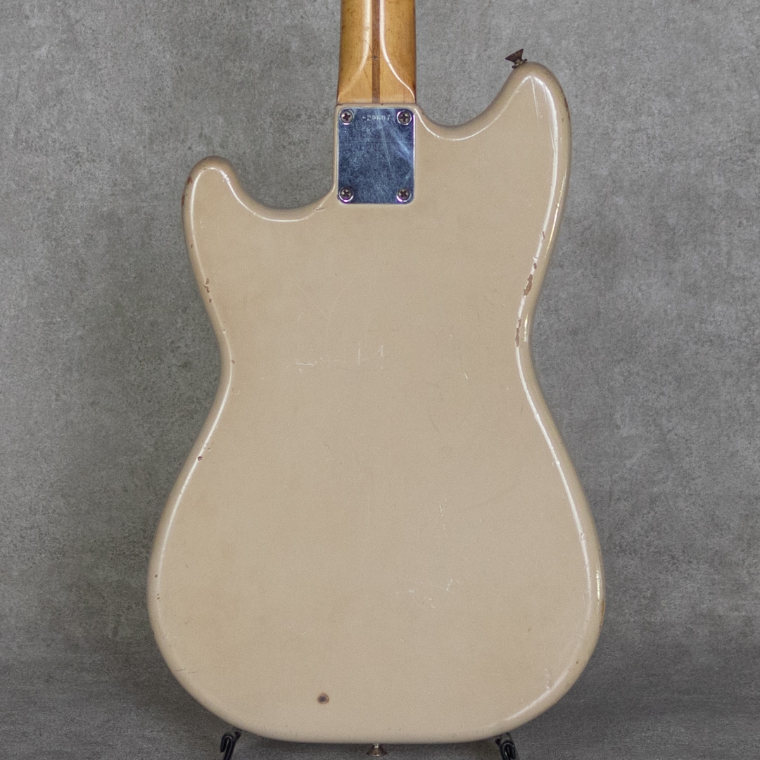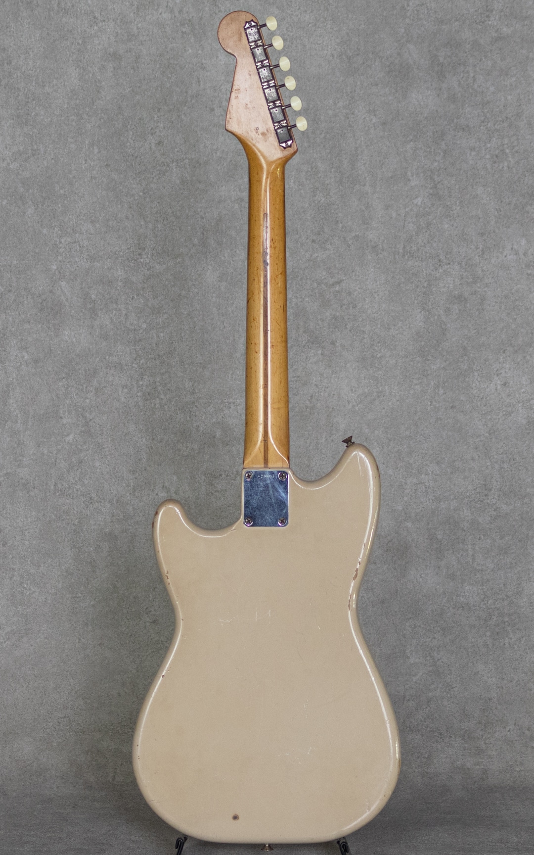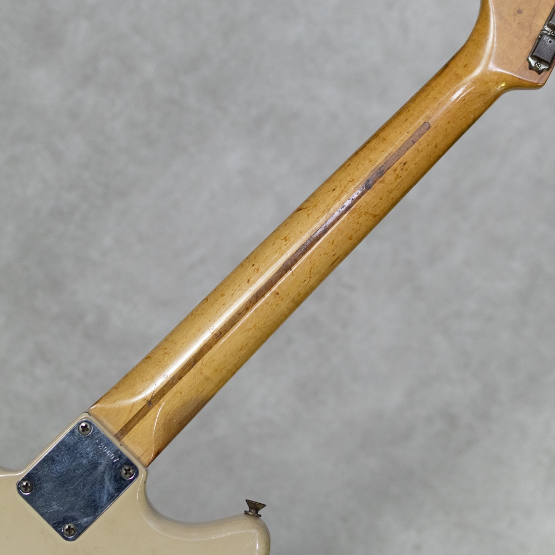 Fender 3/4モデル”Musicmaster”&”Duo-Sonic"。1956年代半ばに登場したスチューデントモデルのひとつで、1ピックアップモデルの”Musicmaster”と2ピックアップモデルの”Duo-Sonic”がラインナップされていました。本器は、発売初年度となる1956年製の”Musicmaster”のネックに1957年製頃製と見られる”Duo-Sonic”のボディが組み合わせられた1本。ネックはうっすらとフィギュアド杢が浮かび上がる板目取りされたメイプルワンピースネック。オリジナルシングルラインクルーソンデラックスペグが搭載されており、オリジナルフィニッシュを残してリフレットがされたグッドコンディションの”Musicmaster”デカールのネック。ネックデイトがしっかりと確認でき1956年製と判断できます。ボディは”Duo-Sonic"と見られ、オリジナルフィニッシュでザグリ痕などもなくグッドルッキンのボディ。オリジナルブリッジを搭載しており、ネックプレートのシリアルから1957年頃製のボディと思われます。ピックアップも片側のPU配線材が交換されていますが、同年代のオリジナルPUが残されています。コンデンサーは”RMC”0.05uFのセラミックディスクを使用。POTやスイッチ、ジャックやノブ類は近年製にて交換されておりますが、ワイヤリングなどは丁寧な作業でされています。スイッチレイアウトはオリジナルとは異なり、センターポジションでパラレル配線になるようになっています。PGマウントスクリューやPUマウントスクリューの一部などがリプレイスパーツですが、可能な限り当時のパーツを使用した好印象のニコイチ・ビンテージ品。プレイコンディションはとても良く、音詰まりなどもなく低いアクションでプレイ可能。ネック周りもトラスロッドの余裕を残し、フレット残りもしっかりと余裕があり良好です。サウンドも良く乾いたドライなアタックと、メイプルネックならではの程よく落ち着いたミドルテイストとサスティン感がたまらない1本です。”Musicmaster”/"Duo-Sonic"を基にした改造モデル。ひと昔は多く見られましたが、ビンテージの価格高騰で見られにくくなりました。手入れされながらビンテージをしっかりと残すアプローチの本器、まだまだしっかりとお使いいただけるグッドコンディションのプレイヤーズビンテージです。ギグバッグ付属