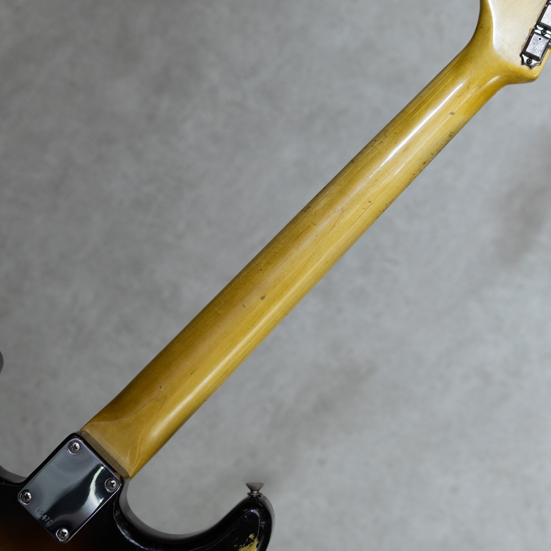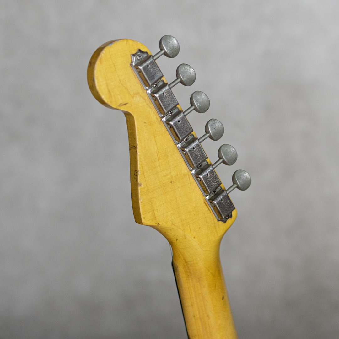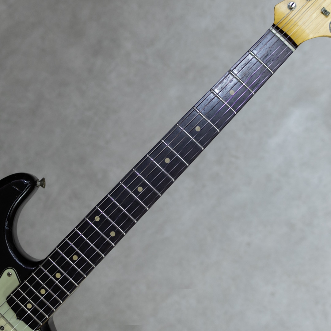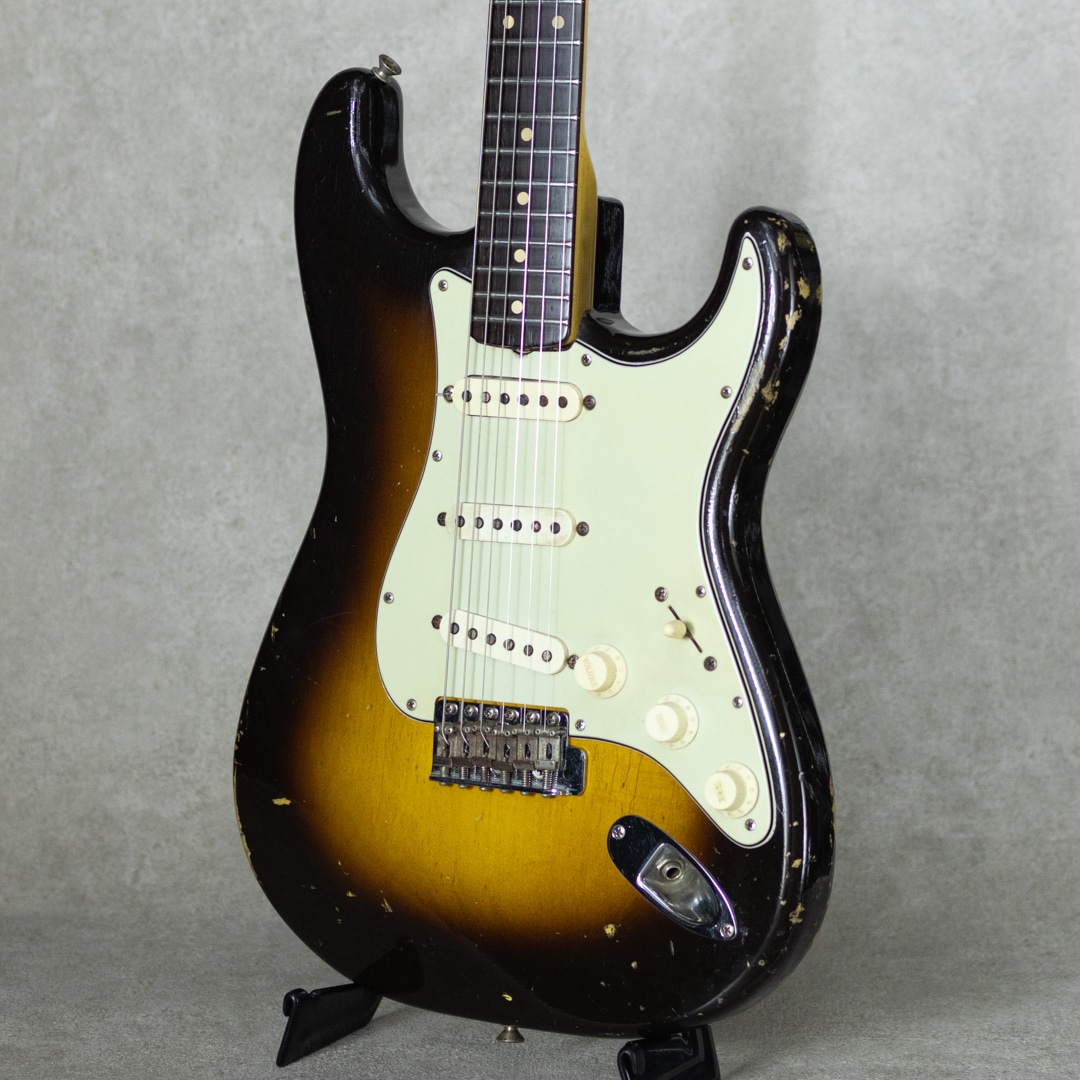 スラブボードで貼られたハカランダ指板ネックを持つ”Staratocaster"、1960年製Vintage品。アルダー2pcsボディ、黒々としたハカランダ・スラブボード指板、板目で取られたメイプルネック、スモールヘッドに冠するスパゲティロゴ。ミントグリーンピックガードに、60年代のオリジナルブラックボビンピックアップ、3wayセレクタースイッチ、スタックポール社製POT、ワックスディップペーパーコンデンサーなどのアッセンブリーも年代マッチングのオリジナル。シングルラインクルーソンデラックスペグ、ストリングガイド、サドル、トレモロアッセンブリーに至るまでオリジナルかつグッドコンディションの本器。リイシューモデルでも多く見られ数々のストラトモデルへ多大なる影響を与えたスラブボード指板の仕様は1959年5月に採用され、同年夏のNAMM SHOWに向けて準備されました。スラブボードネックのストラトは数々の名演とサウンドを世に残し、あまたの憧れを後世に残しています。しかし、意外にもその採用期間は短く、1962年の8月頃にはもう少し薄いハカランダを使用したラウンドボードへと変更されます。しかしながらスラブボードネックは後にビンテージリシューモデルに採用され、今では当たり前のように知られるようになりました。またモデル年式としても有名な1960年製のストラトキャスターですが、その他にも特徴的な外観や仕様を併せ持ち、それらにおいても個々に別々の採用期間を持つ仕様過渡期の中に誕生した短命な仕様を併せ持つストラトのひとつです。この時期の外観の特徴のひとつとして人気が高いミントグリーンのピックガードは1959年7月頃に採用され1963年途中にはネジ位置が変更され、この年代の特徴的なサウンドを彩るひとつのワックスディップペーパーコンデンサーは翌年1961年にはセラミックディスクコンデンサーへと変更されます。またこの時期の外観を特徴づける3トーンサンバーストカラーですが、61年頃までは赤味の褪色がしやすく、2トーンカラーになっているものも多く見られます。また、サンバーストカラーは塗装職人ごとによるクセで吹きムラが大きく、60年?61年頃に見られる本器のようなトリム部の幅が広い”Wide Trim”サンバーストもこの時期ならではの特徴的な外観のひとつです。しっかりと赤味が褪色したサンバースト、ワイドトリムが最高にクールな1本。使用に伴う傷や塗装剥がれは嫌らしい感じのものはなく、びっしりと入ったウェザーチェックも合間って貫禄の雰囲気を漂わせます。ヘッド先端部に小さい欠けを埋めた痕が見られます。リフレット&ナット交換がされていますが指板厚はしっかりと残っており、部分的な指板材の減りも少なくネックコンディションも良好。フレットはだいたい75%?85%ほどとしっかり残っており音詰まりもなく低いアクションでしっかりとプレイできます。ネックピックアップ部のピックガードに割れが見られますが、歪みもそこまで大きくありません。ピックガードスクリュー、1弦サドル、サドルハイトスクリューがリプレイスメントパーツに交換されていますが雰囲気を損なう感じは覚えません。またトレモロスプリングは3本がオリジナルで1本がリプレイスメントパーツが使用されています。柔らかくファットな倍音を含むサウンドから、スラブらしいアタックの効いたパンチのあるサウンドまで、想像を裏切らない幅広いスラブサウンドを魅せてくれる1本です。誰しもが憧れるハカランダスラブ、そして貫禄のワイドトリムサンバースト。。年々高騰が止まらない人気モデルのひとつ。このチャンスをお見逃しなく。。オリジナルブラウントーレックスケース、オリジナルトレモロアーム付属