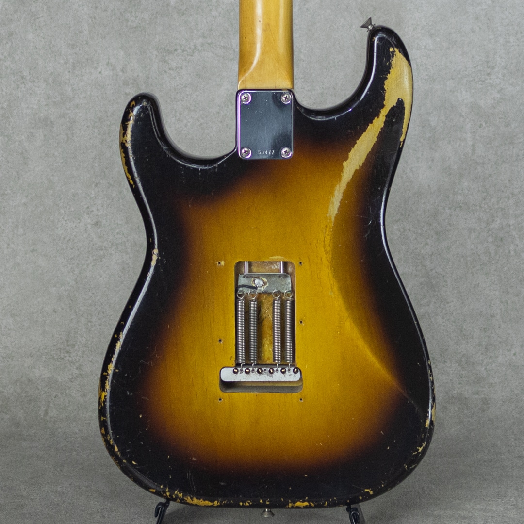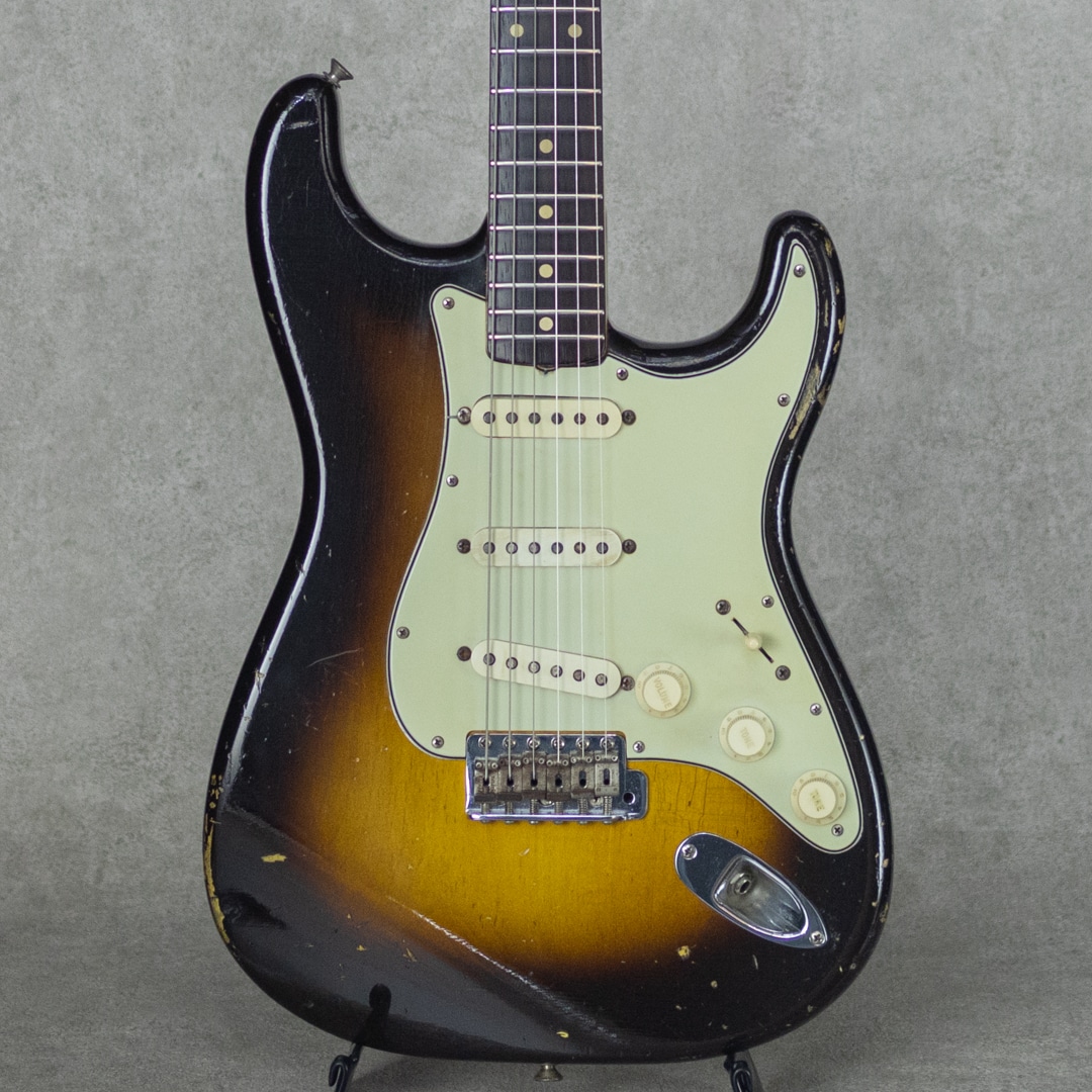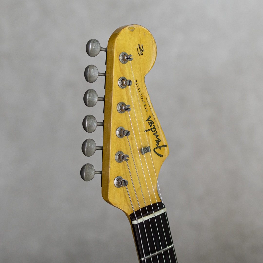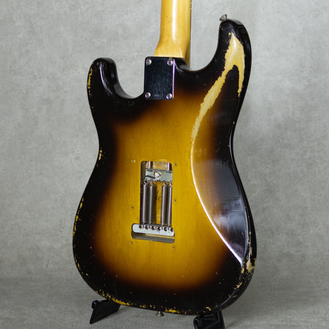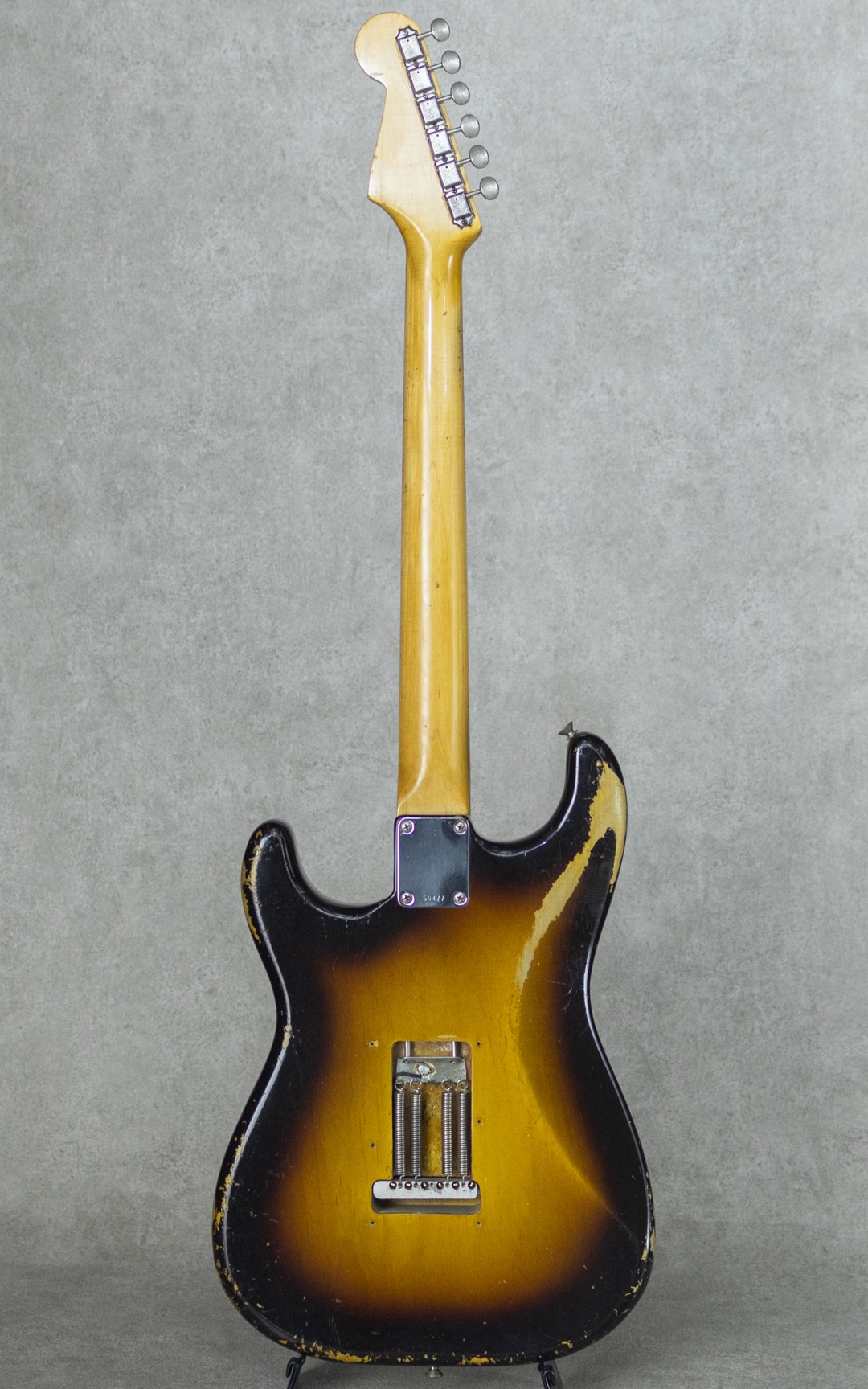 スラブボードで貼られたハカランダ指板ネックを持つ”Staratocaster"、1960年製Vintage品。アルダー2pcsボディ、黒々としたハカランダ・スラブボード指板、板目で取られたメイプルネック、スモールヘッドに冠するスパゲティロゴ。ミントグリーンピックガードに、60年代のオリジナルブラックボビンピックアップ、3wayセレクタースイッチ、スタックポール社製POT、ワックスディップペーパーコンデンサーなどのアッセンブリーも年代マッチングのオリジナル。シングルラインクルーソンデラックスペグ、ストリングガイド、サドル、トレモロアッセンブリーに至るまでオリジナルかつグッドコンディションの本器。リイシューモデルでも多く見られ数々のストラトモデルへ多大なる影響を与えたスラブボード指板の仕様は1959年5月に採用され、同年夏のNAMM SHOWに向けて準備されました。スラブボードネックのストラトは数々の名演とサウンドを世に残し、あまたの憧れを後世に残しています。しかし、意外にもその採用期間は短く、1962年の8月頃にはもう少し薄いハカランダを使用したラウンドボードへと変更されます。しかしながらスラブボードネックは後にビンテージリシューモデルに採用され、今では当たり前のように知られるようになりました。またモデル年式としても有名な1960年製のストラトキャスターですが、その他にも特徴的な外観や仕様を併せ持ち、それらにおいても個々に別々の採用期間を持つ仕様過渡期の中に誕生した短命な仕様を併せ持つストラトのひとつです。この時期の外観の特徴のひとつとして人気が高いミントグリーンのピックガードは1959年7月頃に採用され1963年途中にはネジ位置が変更され、この年代の特徴的なサウンドを彩るひとつのワックスディップペーパーコンデンサーは翌年1961年にはセラミックディスクコンデンサーへと変更されます。またこの時期の外観を特徴づける3トーンサンバーストカラーですが、61年頃までは赤味の褪色がしやすく、2トーンカラーになっているものも多く見られます。また、サンバーストカラーは塗装職人ごとによるクセで吹きムラが大きく、60年?61年頃に見られる本器のようなトリム部の幅が広い”Wide Trim”サンバーストもこの時期ならではの特徴的な外観のひとつです。しっかりと赤味が褪色したサンバースト、ワイドトリムが最高にクールな1本。使用に伴う傷や塗装剥がれは嫌らしい感じのものはなく、びっしりと入ったウェザーチェックも合間って貫禄の雰囲気を漂わせます。ヘッド先端部に小さい欠けを埋めた痕が見られます。リフレット&ナット交換がされていますが指板厚はしっかりと残っており、部分的な指板材の減りも少なくネックコンディションも良好。フレットはだいたい75%?85%ほどとしっかり残っており音詰まりもなく低いアクションでしっかりとプレイできます。ネックピックアップ部のピックガードに割れが見られますが、歪みもそこまで大きくありません。ピックガードスクリュー、1弦サドル、サドルハイトスクリューがリプレイスメントパーツに交換されていますが雰囲気を損なう感じは覚えません。またトレモロスプリングは3本がオリジナルで1本がリプレイスメントパーツが使用されています。柔らかくファットな倍音を含むサウンドから、スラブらしいアタックの効いたパンチのあるサウンドまで、想像を裏切らない幅広いスラブサウンドを魅せてくれる1本です。誰しもが憧れるハカランダスラブ、そして貫禄のワイドトリムサンバースト。。年々高騰が止まらない人気モデルのひとつ。このチャンスをお見逃しなく。。オリジナルブラウントーレックスケース、オリジナルトレモロアーム付属