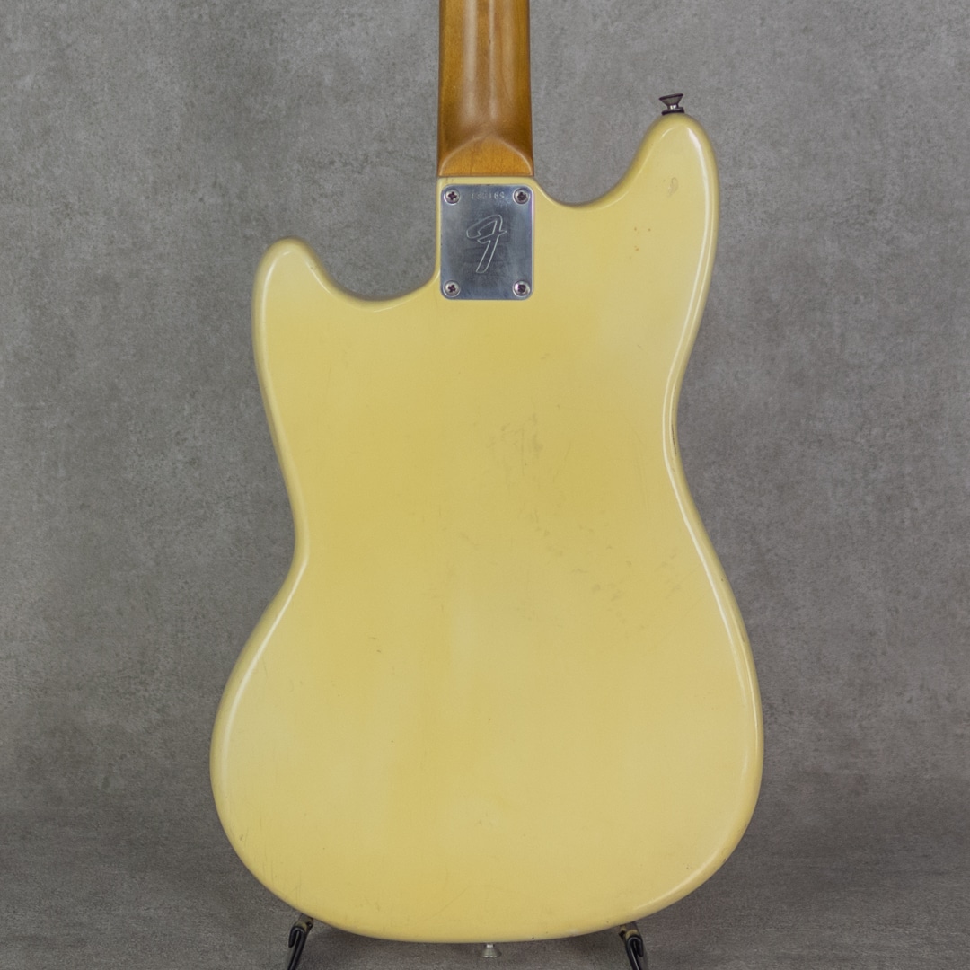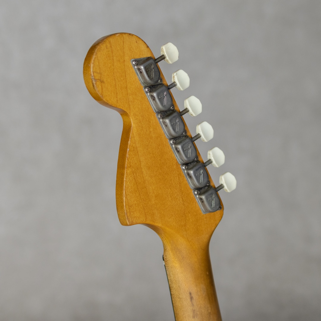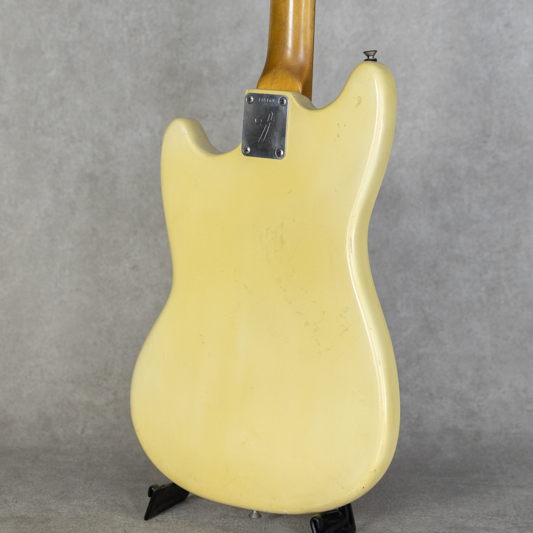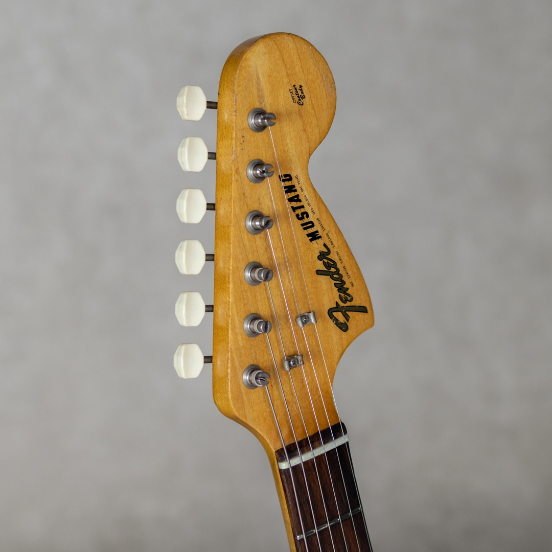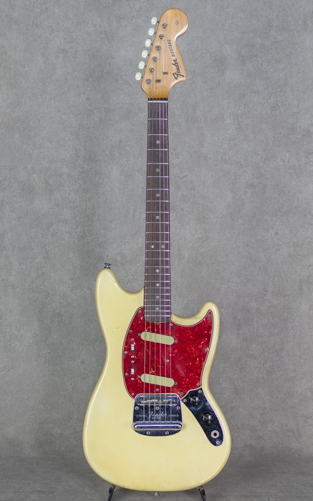 フェンダー”Mustang”。スチューデントモデルであった”Duo-Sonic”とプロフェッショナルモデルであった”Telecaster”の中間モデルとして開発されたモデルで、CBSに売却される前の1964年にデビューし、1982年まで製造された人気モデルのひとつです。スチューデントモデルとしての印象が強いながら、国内でもChar氏などの仕様でとても人気が高いモデルで、その人気ゆえ86年にFender Japanから再発されアメリカに逆輸入されたほどです。本器は貫禄と雰囲気のあるホワイトカラーの褪色具合がクールな1966年製Vintage品。アルダーボディ、ラウンド貼りローズ指板、板目よりな目取のメイプルネック、トランジションロゴ。レギュラーグリップの”B”ネックに24”(609.6mm)スケール。’66デイティングのグレイボビンオリジナルPUx2と、年代マッチングのPUセレクター。”F”キーチューナーペグ、トレモロアッセンブリーやべっ甲柄セルロイドピックガードなどの主だったパーツはオリジナルをキープしています。ボリューム&トーンのPOTが交換されており、コンデンサーもセラミックディスクCAPに交換されています。その他ナット交換、ジャック交換、一部配線材交換、一部トレモロマウントスクリュー交換、一部PGスクリュー交換など、使用に伴ういくらかのパーツ交換は見られますが、しっかりと大切に使用しながら残されたことが伺える本器。オリジナルフレットは65%?70%残りと少し低めですが、ネックコンディションもとても良好で音つまりなどもなくプレイいただけます。ネックは昔にネック裏のみオーバースプレイされたような様子が伺えますが、そこからまたしっかりと弾かれて磨耗しており分厚く重なっている感じは見られません。また、ボディネックジョイント部にヒビが確認できますが、グルーが入れられており動く様子は伺えません。オリジナルビンテージならではの太く倍音の乗ったアタックが小気味良い本器。カッティングもひとしおで、独特のレスポンス感がたまらないです。小傷や打痕は見られますが、塗装剥がれなども少なく、弾いてよし愛でてよしの1本。価格高騰が続くフェンダービンテージ、若干のパーツ交換や補修があるためのお値打ち放出価格。お見逃しなく。。その他詳細はお気軽にお問い合わせください。ハードケース、オリジナルトレモロアーム付属