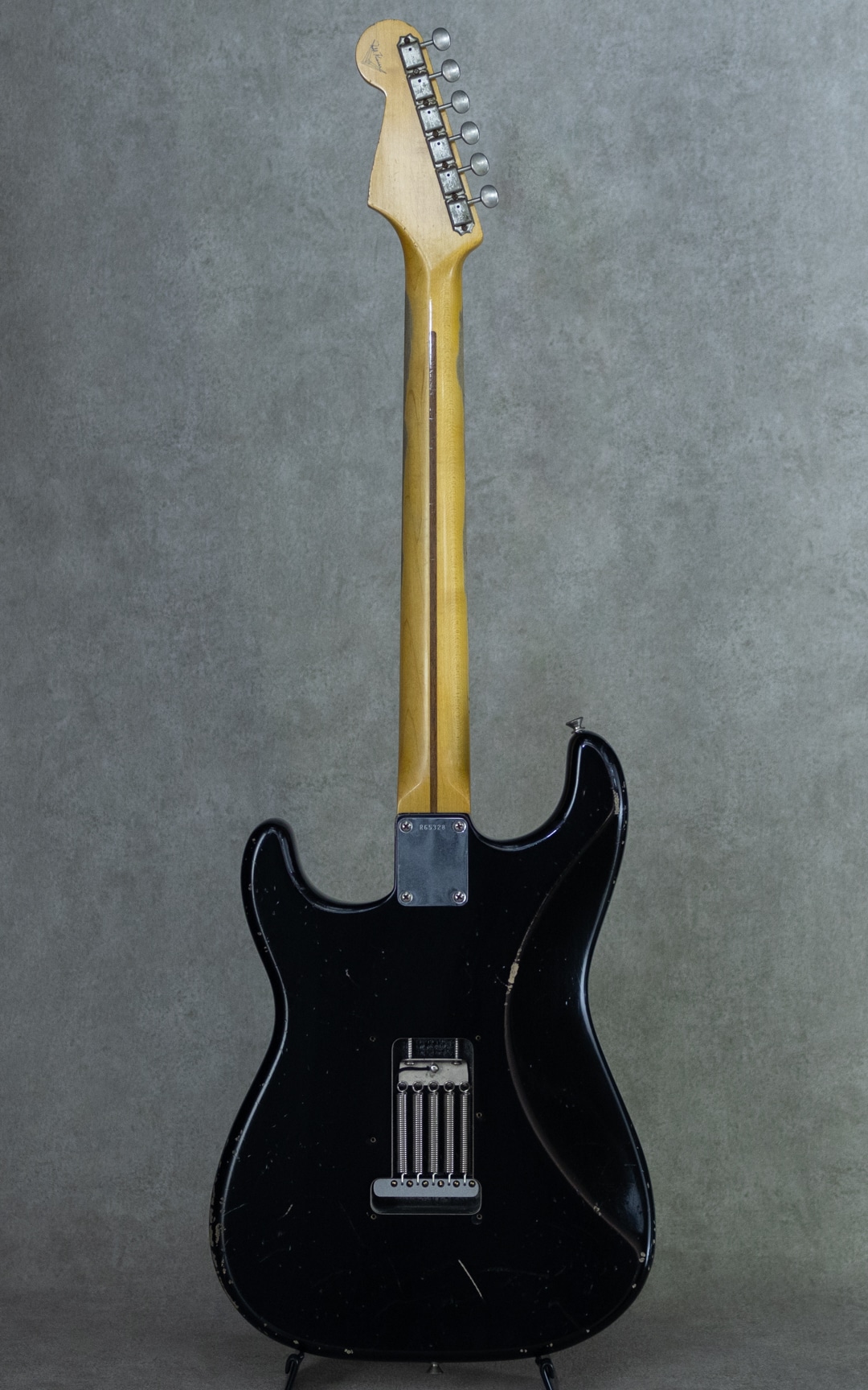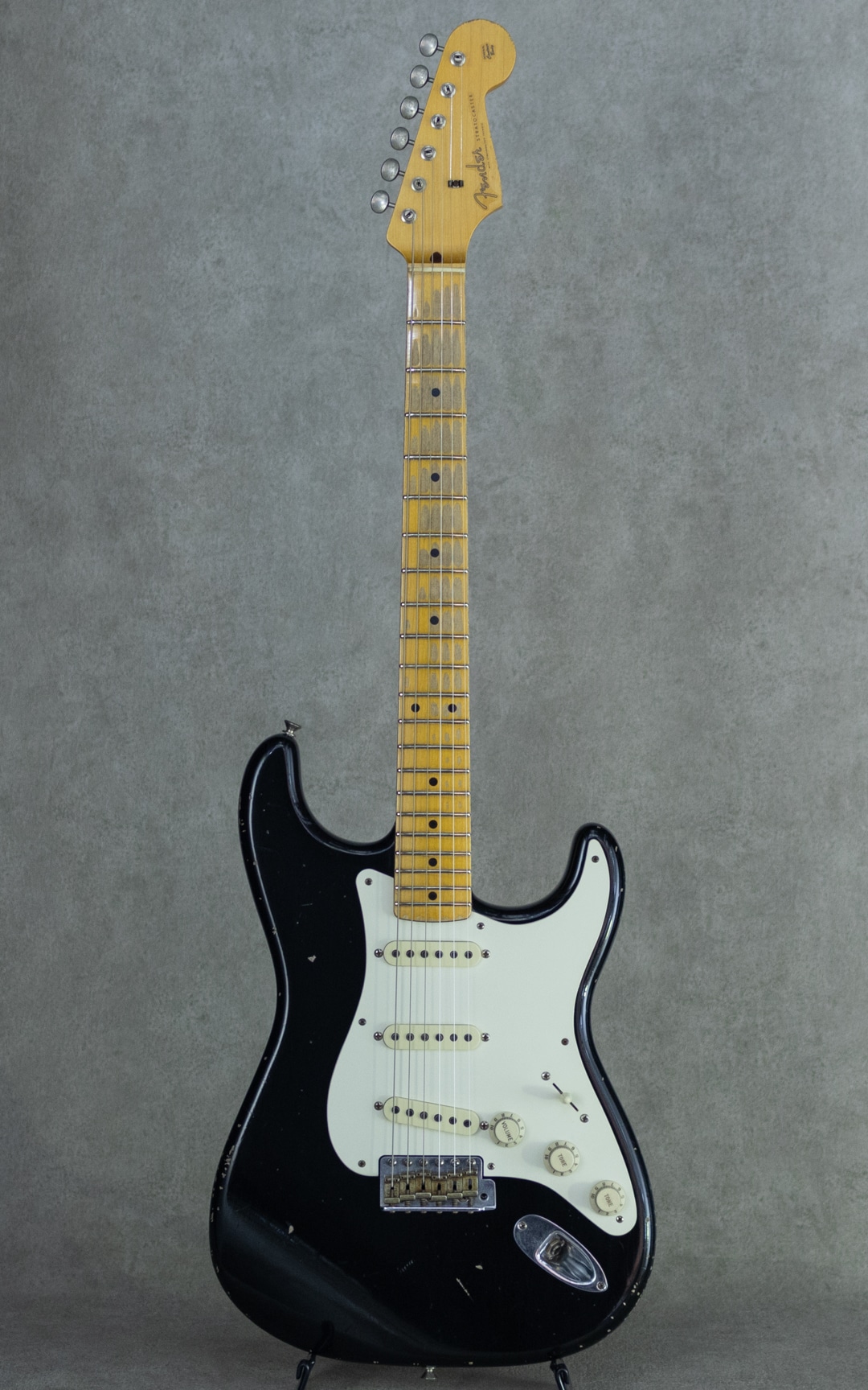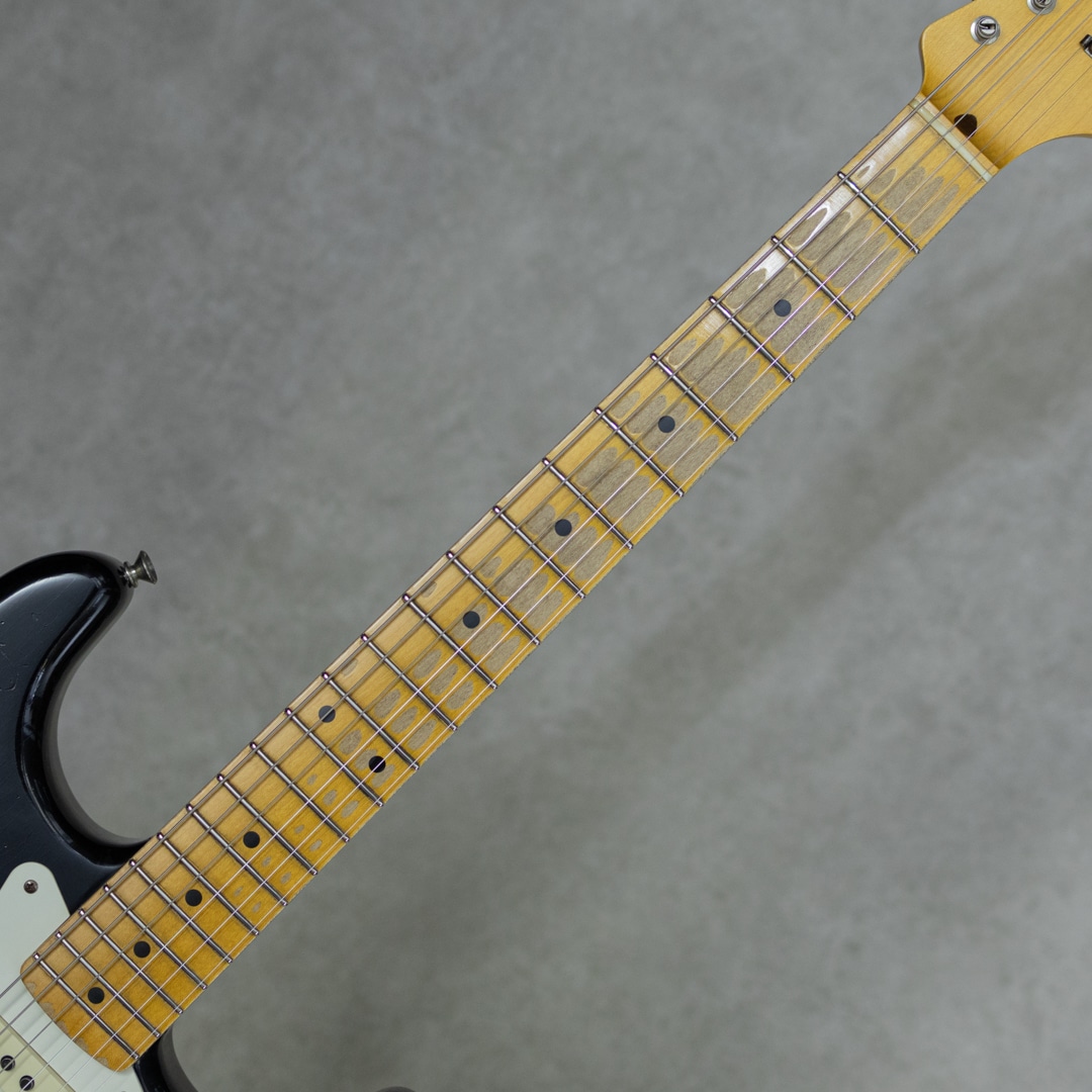 "Fender Custom Shop"最高峰の憧れ"Master Built"。本器は”Todd Krause(トッド・クラウス)”作の”1956 Stratocaster Relic Black”。2013年製USED品。アルダー2ピースボディ、メイプルワンピースネック、近年ではメイプル/アルダーモデルのお手本のようにされる1956年仕様。ネックのメイプル材は四方柾目取りで取られており、握り心地のある太めの”ソフトV”シェイプネック。7.25”R指板、45085/ビンテージフレット。程よい艶加減、上品なエイジド具合、しっかりと細かく入れられたウェザーチェッキング、、風格を漂わせるレリック加工が施されています。ピックアップは”Custom 50’s PickUp”を搭載、またコンデンサーにはMid50’sを思わせるワックスペーパーコンデンサーが使用されており、トーン回路はフロント、ミドル・リアの配線にされています。ジェフ・ベック、エリック・クラプトン、ボブ・ディラン、デビッド・ギルモア、ロビー・ロバートソン、ケニー・ウェイン・シェパード、ロビン・トロワーなどなど、世界で最も偉大なミュージシャンのために絶妙にカスタマイズされた楽器を製作する”Todd Krause”。多くの経験値を積みながら1997年にマスタービルダーに就任し、自身の個人的なデザイン哲学を体現しながら独特の楽器を製作する人気ビルダー。本器ではストレートな50’sアプローチのストラトを製作しながら、この年代の設計のストラトで起こりうる問題点を見事に消化して作り上げています。太くコシのあるサウンド。ブライトでハリがありながら、とてもクリアでノイズレスなサウンド。ノイズレスピックアップでは得られないレンジ感とスムースなレスポンスを体現しています。メイプルネックとは思えないミドルの張りと抜けは、様々なジャンルで活躍してくれる頼もしいサウンドです。使用に伴う傷や使用感は伺いにくく、とても良好なコンディションで保たれた本器。ネックコンディションも良好でフレット減りも殆んど無く、弾きやすいアクションでしっかりとお使いいただけます。憧れのマスタービルト、そして多くの人が憧れるブラック/メイプルのレリックモデル。弾き手にビンビンと伝わるダイレクトなドライブ感、見てよし弾いてよしのコレクタブルストラト。オススメのビンテージモデルストラトです。オリジナルツイードハードケース、認定書、トレモロアームやバックパネル、シールドケーブル、ストラップ等の新品時付属品もしっかりと付属します。