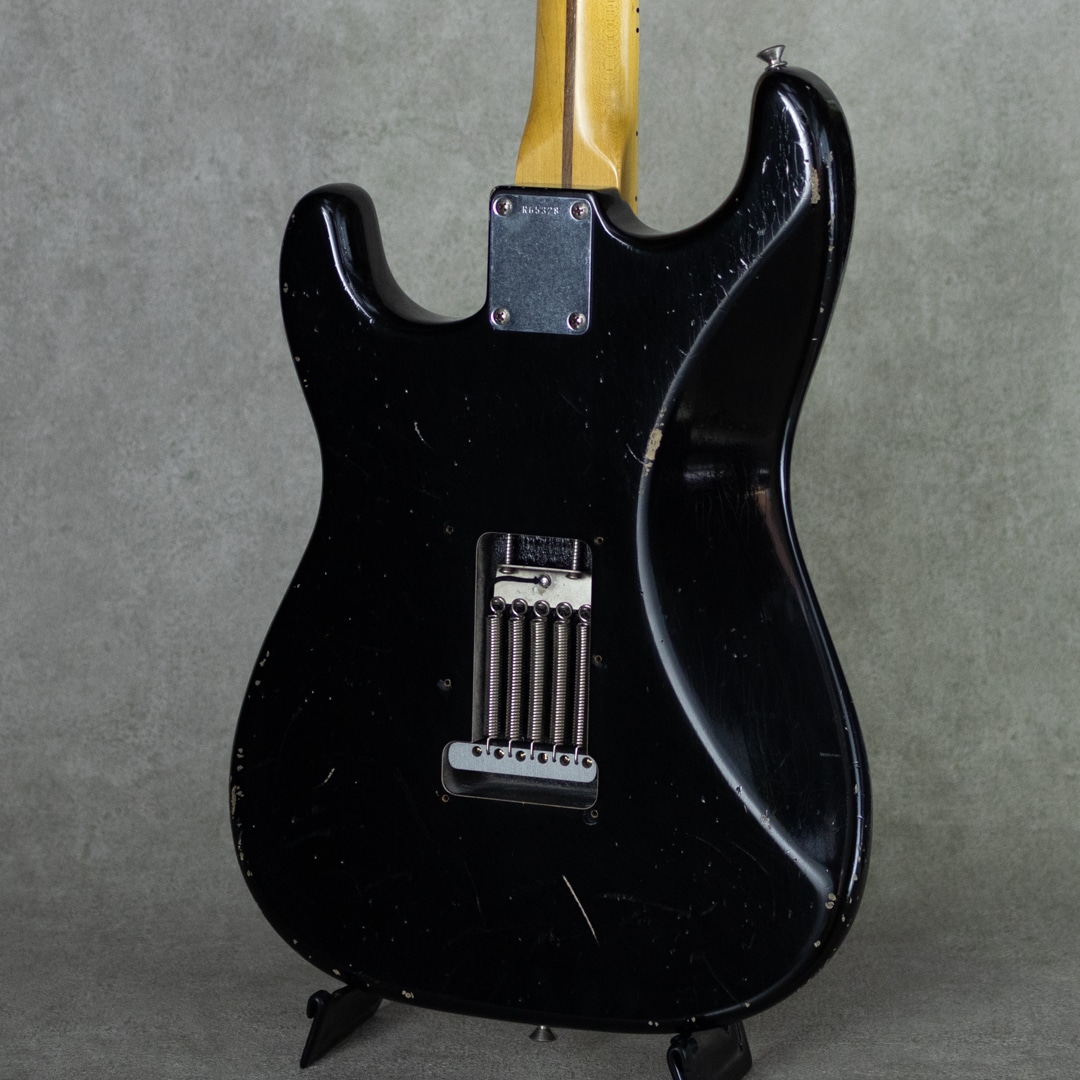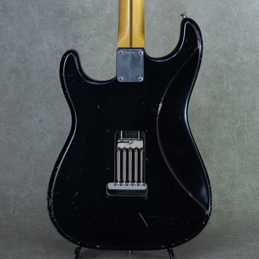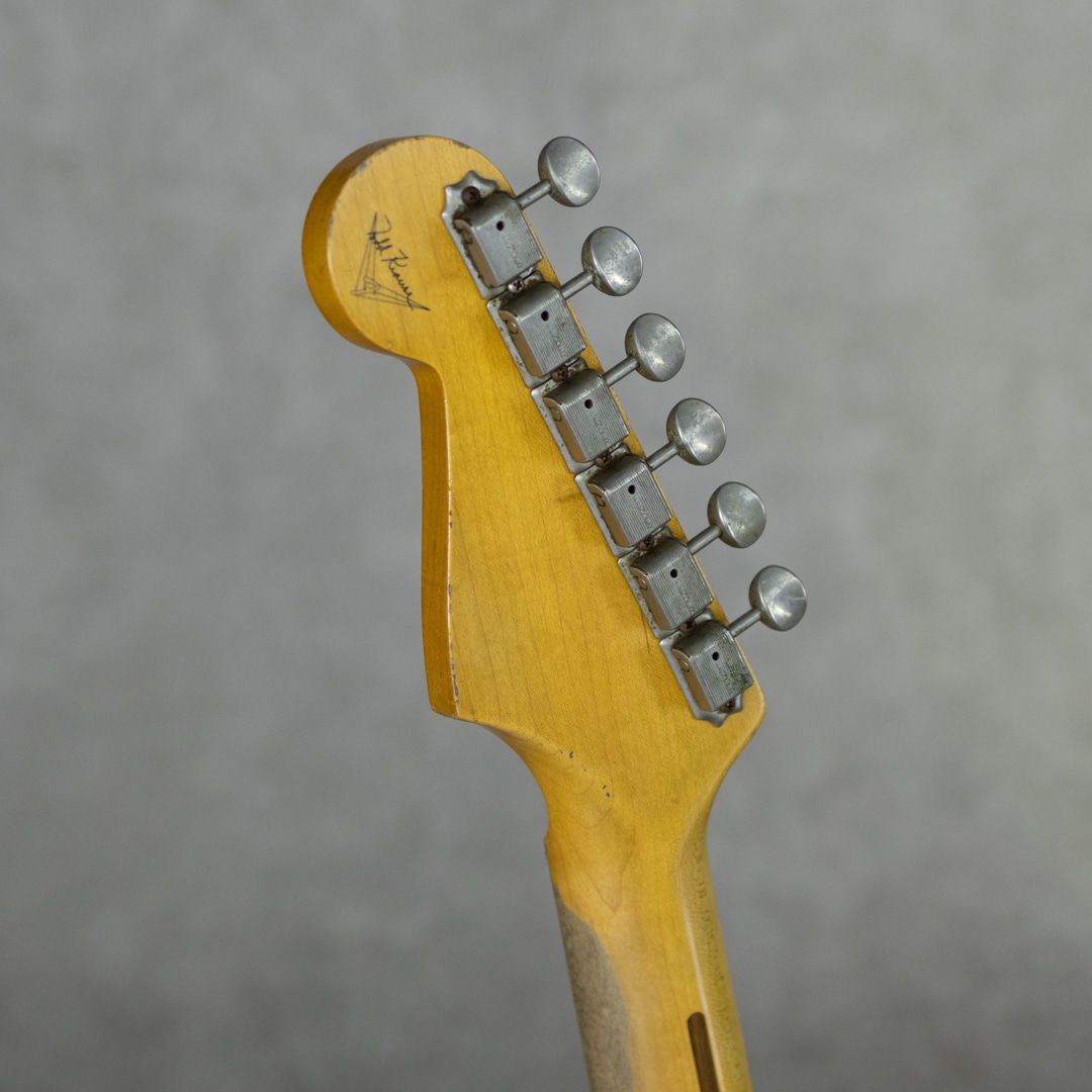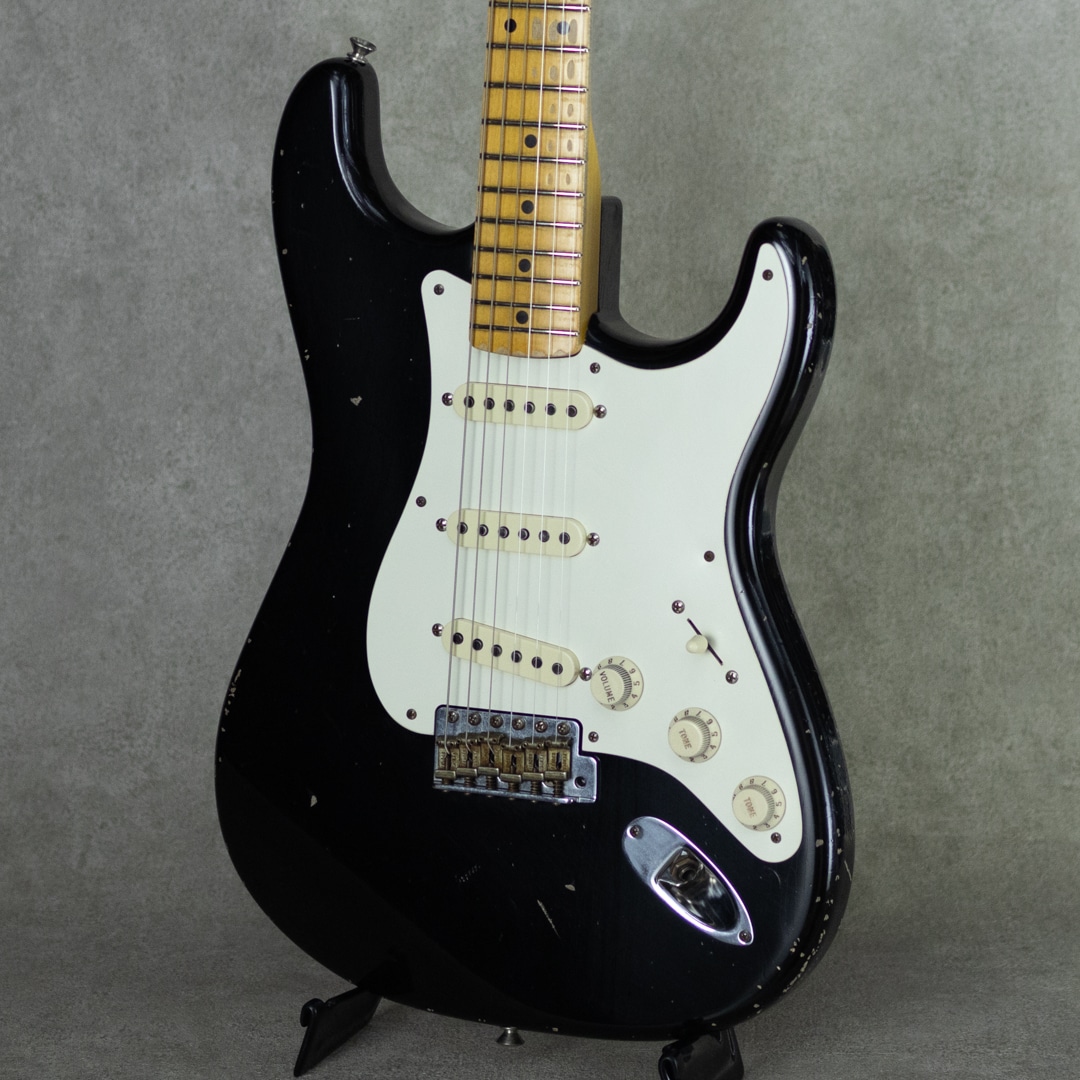 "Fender Custom Shop"最高峰の憧れ"Master Built"。本器は”Todd Krause(トッド・クラウス)”作の”1956 Stratocaster Relic Black”。2013年製USED品。アルダー2ピースボディ、メイプルワンピースネック、近年ではメイプル/アルダーモデルのお手本のようにされる1956年仕様。ネックのメイプル材は四方柾目取りで取られており、握り心地のある太めの”ソフトV”シェイプネック。7.25”R指板、45085/ビンテージフレット。程よい艶加減、上品なエイジド具合、しっかりと細かく入れられたウェザーチェッキング、、風格を漂わせるレリック加工が施されています。ピックアップは”Custom 50’s PickUp”を搭載、またコンデンサーにはMid50’sを思わせるワックスペーパーコンデンサーが使用されており、トーン回路はフロント、ミドル・リアの配線にされています。ジェフ・ベック、エリック・クラプトン、ボブ・ディラン、デビッド・ギルモア、ロビー・ロバートソン、ケニー・ウェイン・シェパード、ロビン・トロワーなどなど、世界で最も偉大なミュージシャンのために絶妙にカスタマイズされた楽器を製作する”Todd Krause”。多くの経験値を積みながら1997年にマスタービルダーに就任し、自身の個人的なデザイン哲学を体現しながら独特の楽器を製作する人気ビルダー。本器ではストレートな50’sアプローチのストラトを製作しながら、この年代の設計のストラトで起こりうる問題点を見事に消化して作り上げています。太くコシのあるサウンド。ブライトでハリがありながら、とてもクリアでノイズレスなサウンド。ノイズレスピックアップでは得られないレンジ感とスムースなレスポンスを体現しています。メイプルネックとは思えないミドルの張りと抜けは、様々なジャンルで活躍してくれる頼もしいサウンドです。使用に伴う傷や使用感は伺いにくく、とても良好なコンディションで保たれた本器。ネックコンディションも良好でフレット減りも殆んど無く、弾きやすいアクションでしっかりとお使いいただけます。憧れのマスタービルト、そして多くの人が憧れるブラック/メイプルのレリックモデル。弾き手にビンビンと伝わるダイレクトなドライブ感、見てよし弾いてよしのコレクタブルストラト。オススメのビンテージモデルストラトです。オリジナルツイードハードケース、認定書、トレモロアームやバックパネル、シールドケーブル、ストラップ等の新品時付属品もしっかりと付属します。