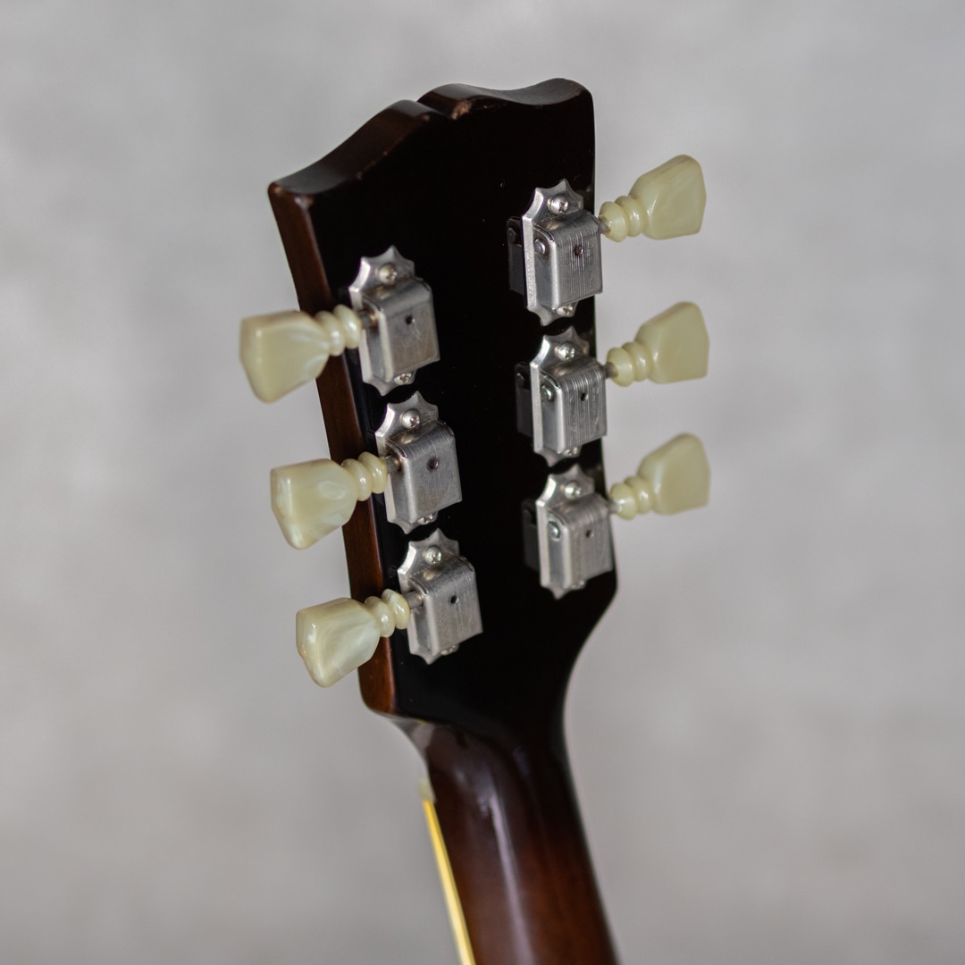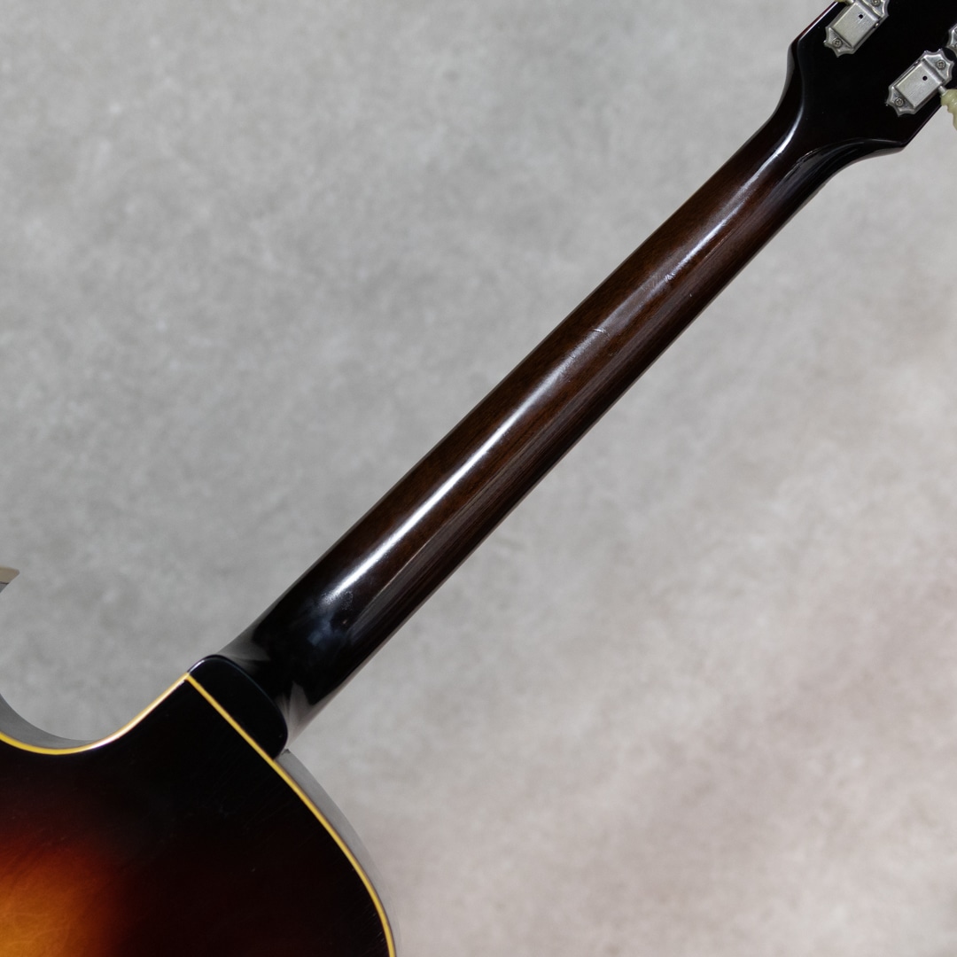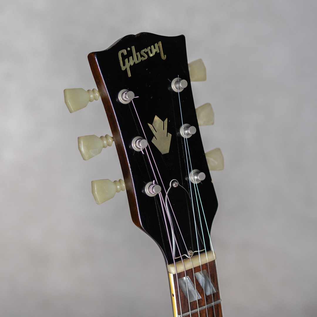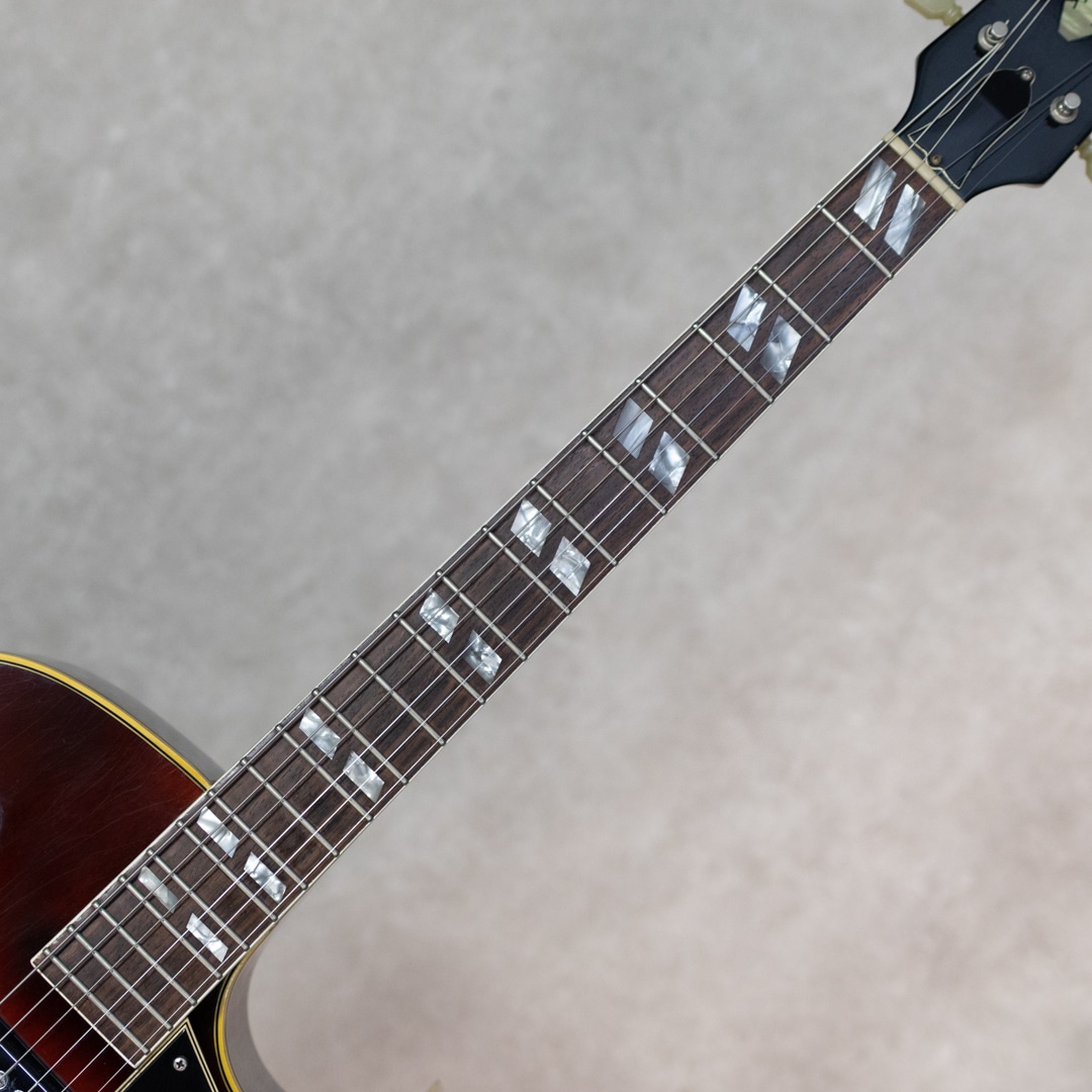 ギブソンアーチトップのスタンダードとして燦然とその名を歴史に刻むモデル"ES-175"。16インチのラミネイトメイプルボディというスタイルはアーチトップギターの標準の一つとしてあらゆるメーカーにの指針とされています。本器は"ノーリン期"直前の67年製。ナローネック/クロームハードウェア/ソンブレロノブ、と60年代後半の装いですが、いまだボリュートが付けられていないネックは1ピースマホガニーで、50年代から続く伝統的な雰囲気も感じさせる堂々とした面構えの一本です。その他、クラウンインレイ/パラレログラム・ダブル・インレイ/フローレンタインカッタウェイ/アイコニックな"ジグザグ"テールピース…と中堅モデル175を形作る各スペック。14度の浅いヘッド角、華奢なネックシェイプ等が相まって独自の明るくタイトなサウンドキャラクターを持つこの年代、搭載の"ステッカード・ナンバード・PAF"に関しましても、60年台後半のこの頃からは製造時のワインディングマシンに自動停止機構が供えられるようになり、安定した性質のアウトプットが特徴的。生々しくより楽器的なキャラクターであった初期の"P.A.F"に対し、工学的に正しく製造されサウンド的にも少しソリッドな印象が増したキャラクターは、70年台以降、技術的な選択肢が増え多様化していくサウンドメイクやプレイスタイルの幅において、一役買った要素と言ってよいかもしれません。こちら全体的に相応のウェザーチェックや数か所の小さな打痕などあるものの、使用に伴うダメージは経年を鑑みると少なく塗装の艶もしっかり残った美しいコンディション。リフレット・リナットがされており、プレイコンディションも良好。オリジナルハードケースが付属いたします。