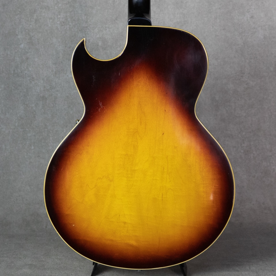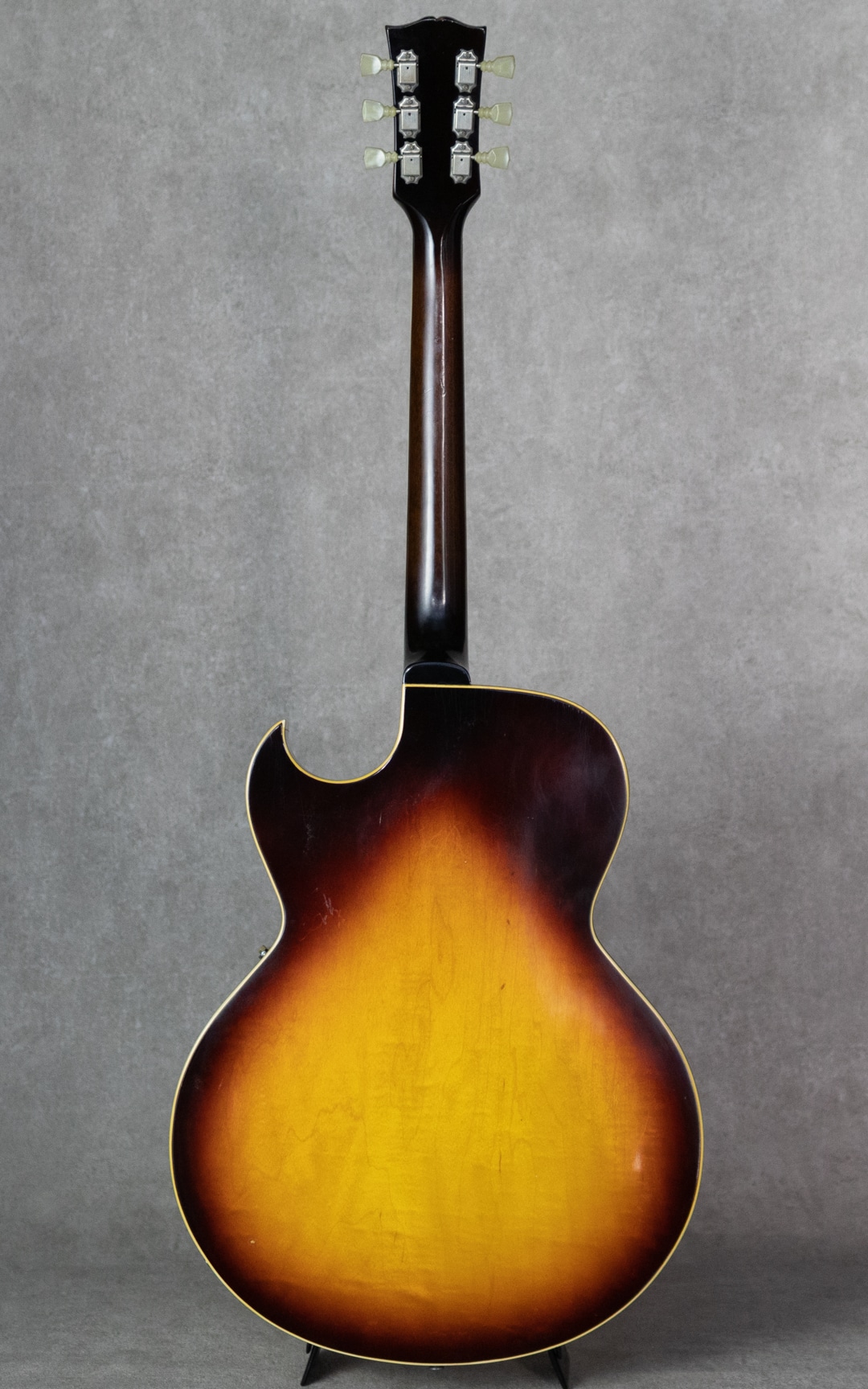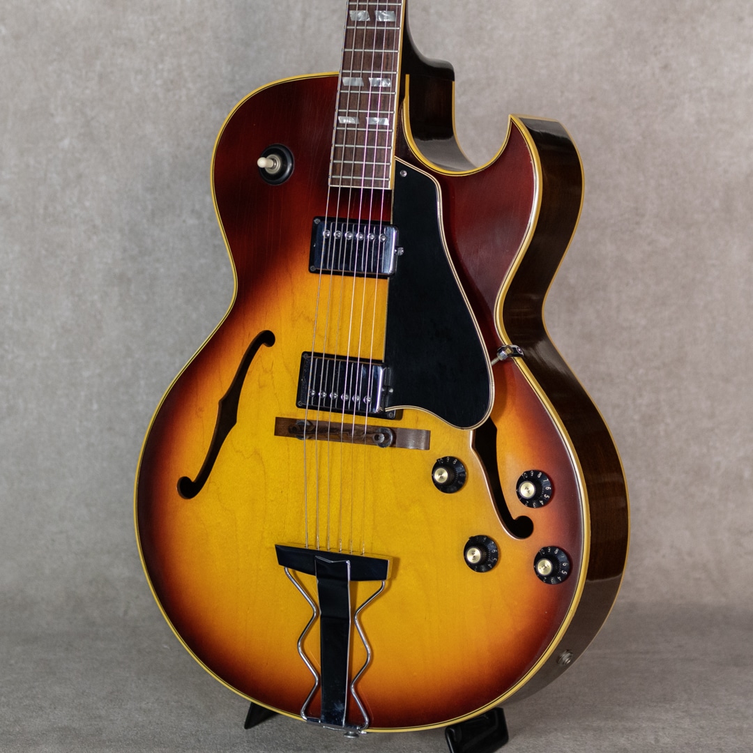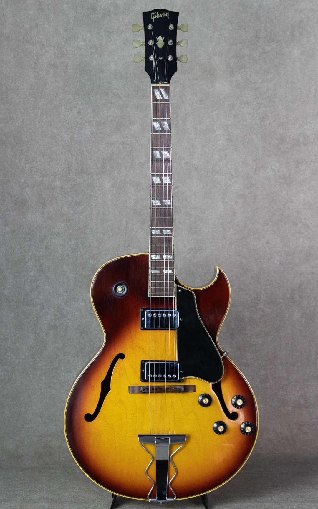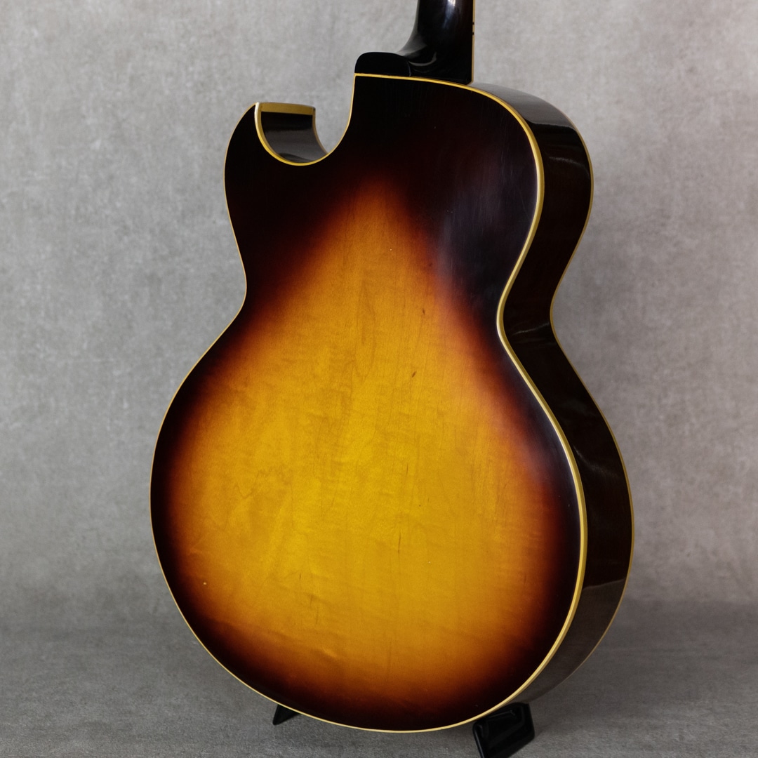 ギブソンアーチトップのスタンダードとして燦然とその名を歴史に刻むモデル"ES-175"。16インチのラミネイトメイプルボディというスタイルはアーチトップギターの標準の一つとしてあらゆるメーカーにの指針とされています。本器は"ノーリン期"直前の67年製。ナローネック/クロームハードウェア/ソンブレロノブ、と60年代後半の装いですが、いまだボリュートが付けられていないネックは1ピースマホガニーで、50年代から続く伝統的な雰囲気も感じさせる堂々とした面構えの一本です。その他、クラウンインレイ/パラレログラム・ダブル・インレイ/フローレンタインカッタウェイ/アイコニックな"ジグザグ"テールピース…と中堅モデル175を形作る各スペック。14度の浅いヘッド角、華奢なネックシェイプ等が相まって独自の明るくタイトなサウンドキャラクターを持つこの年代、搭載の"ステッカード・ナンバード・PAF"に関しましても、60年台後半のこの頃からは製造時のワインディングマシンに自動停止機構が供えられるようになり、安定した性質のアウトプットが特徴的。生々しくより楽器的なキャラクターであった初期の"P.A.F"に対し、工学的に正しく製造されサウンド的にも少しソリッドな印象が増したキャラクターは、70年台以降、技術的な選択肢が増え多様化していくサウンドメイクやプレイスタイルの幅において、一役買った要素と言ってよいかもしれません。こちら全体的に相応のウェザーチェックや数か所の小さな打痕などあるものの、使用に伴うダメージは経年を鑑みると少なく塗装の艶もしっかり残った美しいコンディション。リフレット・リナットがされており、プレイコンディションも良好。オリジナルハードケースが付属いたします。