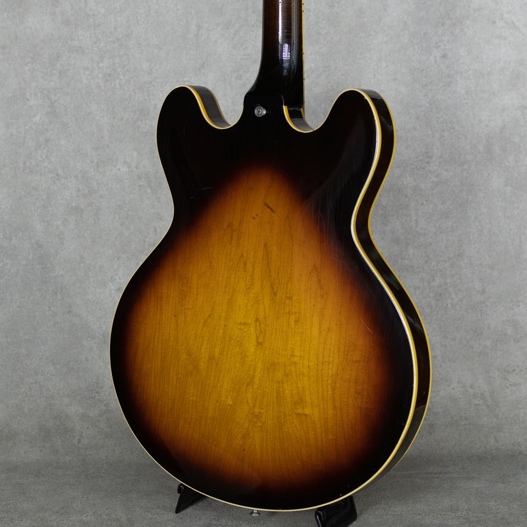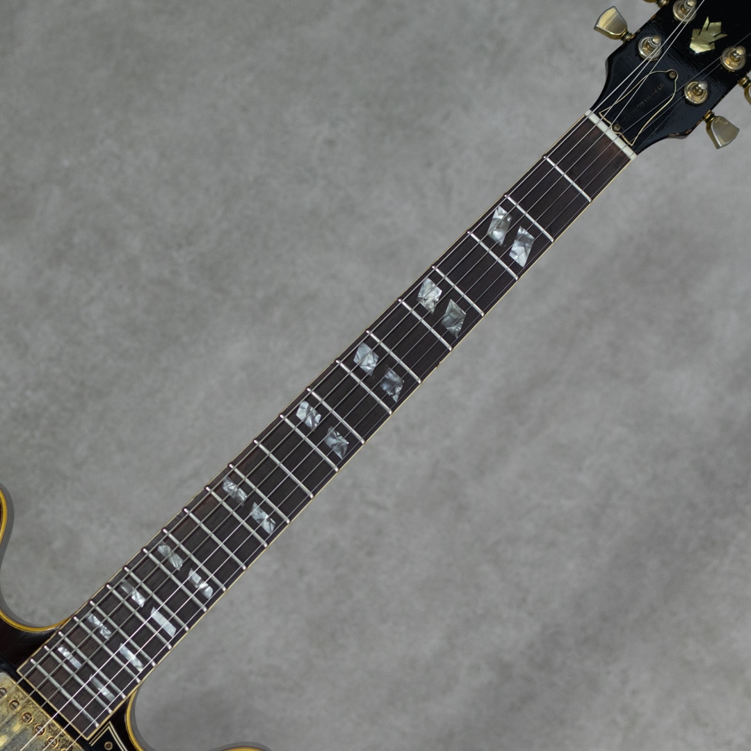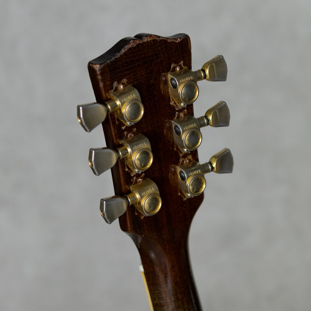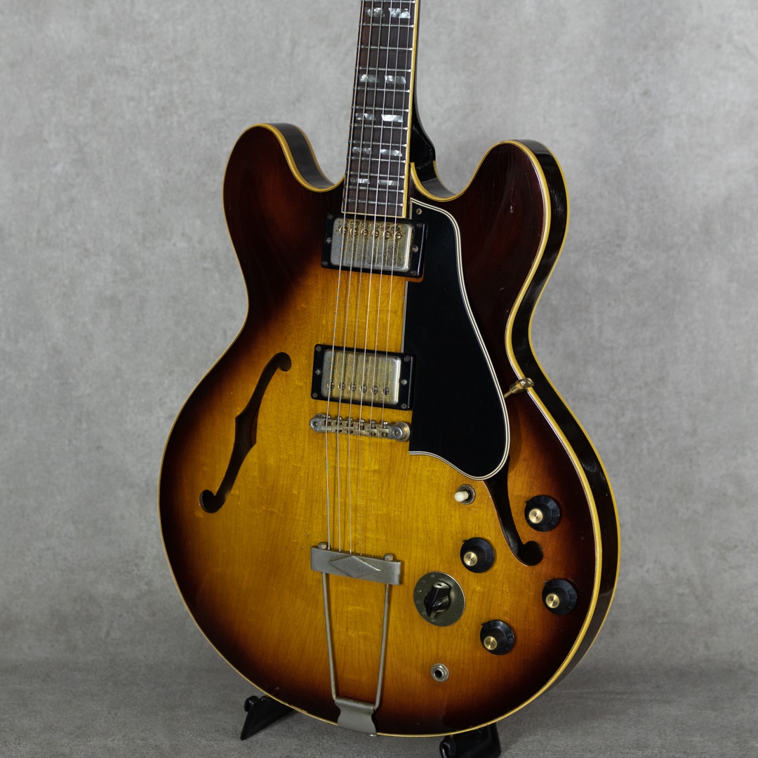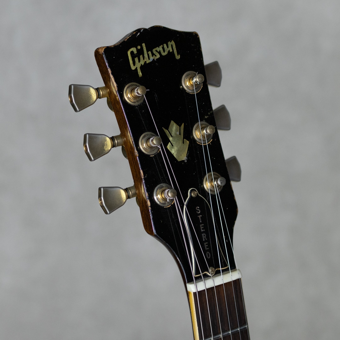 ES-335TDのバリエーションモデルとして59年に登場したES-345TD。ES-335TDとES-355TDの中間的グレードに位置するES-345TDは、ダブル・パラレログラム・ポジションマーク/3層に施されたマルチプライ・ボディトップバインディング/クラウン・ヘッドインレイ/ゴールドハードウェアといった外観スペック。加えて上位モデル然とした仕様として、ステレオアウト/ヴァリトーンスイッチが登場時より標準装備されておりました。本器は所謂”ノーリンエラ”前夜の68年製。69年頃に3ピースネックとなる直前のボリュートなし1ピースマホガニーネック/14度の浅いヘッド角/ナローネック/ナイロンサドル/ソンブレロノブ...と、Late60'sらしい設計・デザインが特徴的です。この時期ならではの軽く歯切れの良い第一印象に程よいコンプ感を帯びたサウンドが独特な魅力を持っており、空気感のあるスイートさが、程よくタイトなアウトプットに同居した少し不思議な挙動。やわらかさと速さ、野太さと鋭さとが見事に合わさったこの年式特有の魅力が存分にお楽しみいただけます。こちらペグは元のクルーソンからグローヴァーに換装、ピックガードも50'sスタイルのロング・ピックガードに変えられております。また現代的に使われることのないステレオアウトプットは一般的なモノラルアウトに直されています。Volポット2点が交換済み。リフレット・リナット済みで演奏性は非常に良く、モノラル仕様に変更されている為、即戦力としてお楽しみいただける一本。全体的にしっかりとウェザーチェックの入った貫禄溢れる外観。ネック裏を中心に塗装剥がれも各所ございますが、塗装面には艶を残した良い印象です。オリジナルのハードケースが付属。
