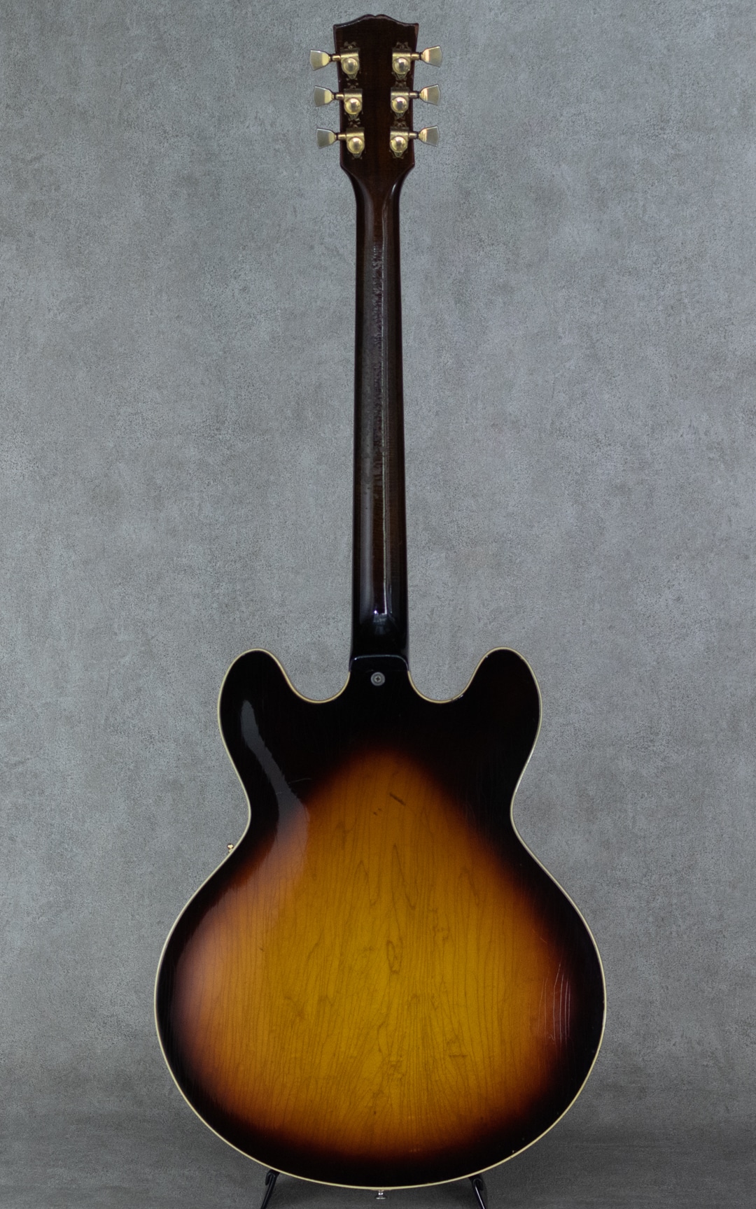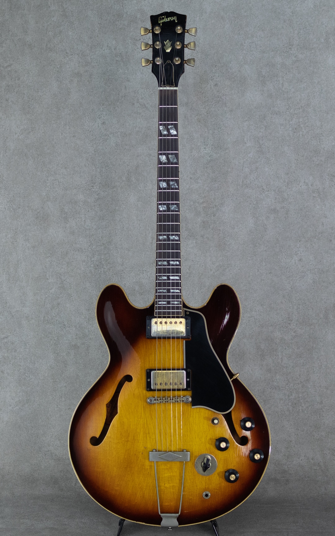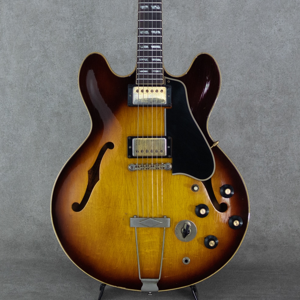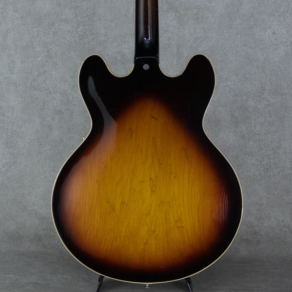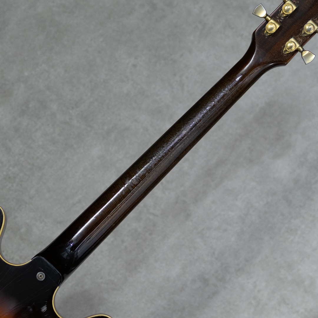 ES-335TDのバリエーションモデルとして59年に登場したES-345TD。ES-335TDとES-355TDの中間的グレードに位置するES-345TDは、ダブル・パラレログラム・ポジションマーク/3層に施されたマルチプライ・ボディトップバインディング/クラウン・ヘッドインレイ/ゴールドハードウェアといった外観スペック。加えて上位モデル然とした仕様として、ステレオアウト/ヴァリトーンスイッチが登場時より標準装備されておりました。本器は所謂”ノーリンエラ”前夜の68年製。69年頃に3ピースネックとなる直前のボリュートなし1ピースマホガニーネック/14度の浅いヘッド角/ナローネック/ナイロンサドル/ソンブレロノブ...と、Late60'sらしい設計・デザインが特徴的です。この時期ならではの軽く歯切れの良い第一印象に程よいコンプ感を帯びたサウンドが独特な魅力を持っており、空気感のあるスイートさが、程よくタイトなアウトプットに同居した少し不思議な挙動。やわらかさと速さ、野太さと鋭さとが見事に合わさったこの年式特有の魅力が存分にお楽しみいただけます。こちらペグは元のクルーソンからグローヴァーに換装、ピックガードも50'sスタイルのロング・ピックガードに変えられております。また現代的に使われることのないステレオアウトプットは一般的なモノラルアウトに直されています。Volポット2点が交換済み。リフレット・リナット済みで演奏性は非常に良く、モノラル仕様に変更されている為、即戦力としてお楽しみいただける一本。全体的にしっかりとウェザーチェックの入った貫禄溢れる外観。ネック裏を中心に塗装剥がれも各所ございますが、塗装面には艶を残した良い印象です。オリジナルのハードケースが付属。