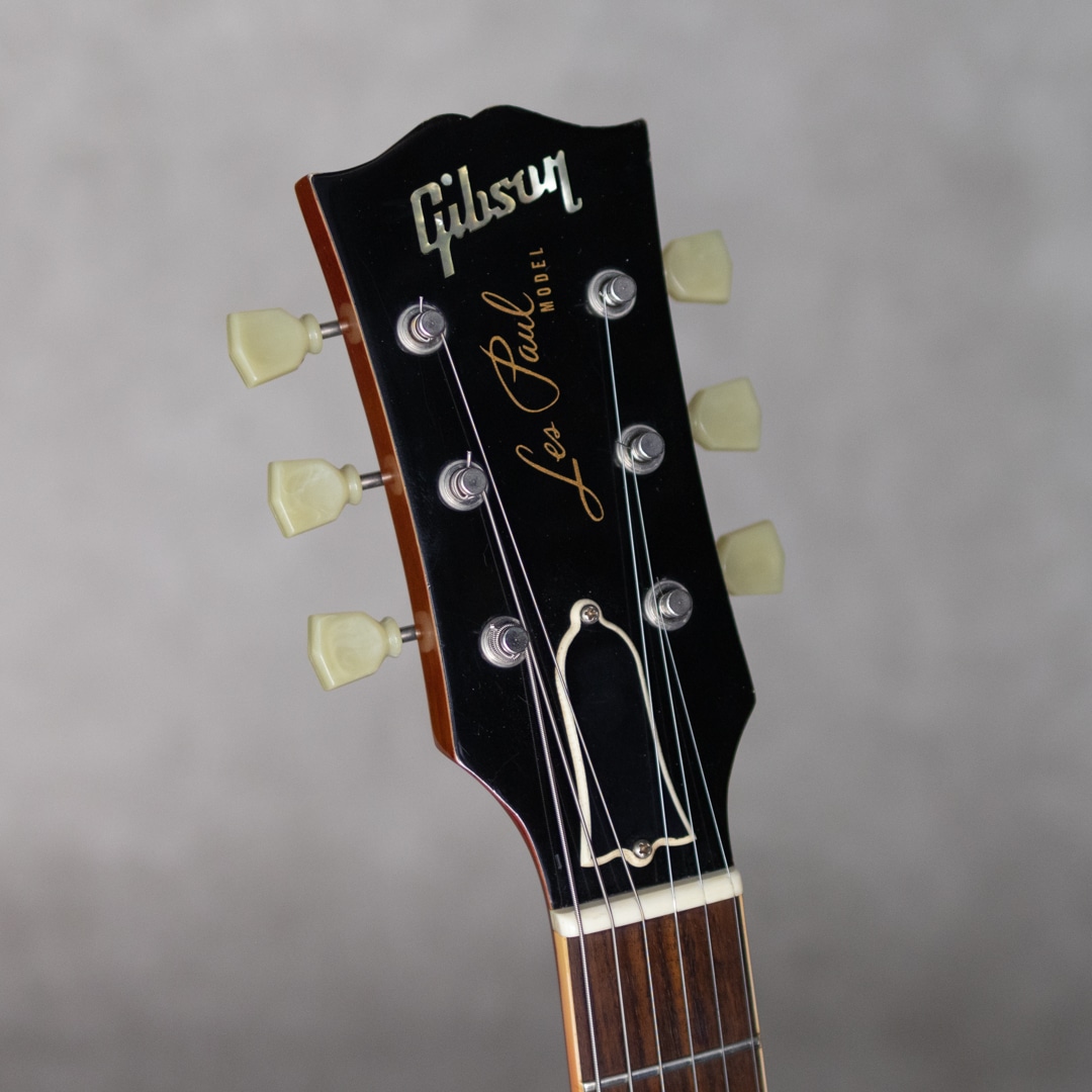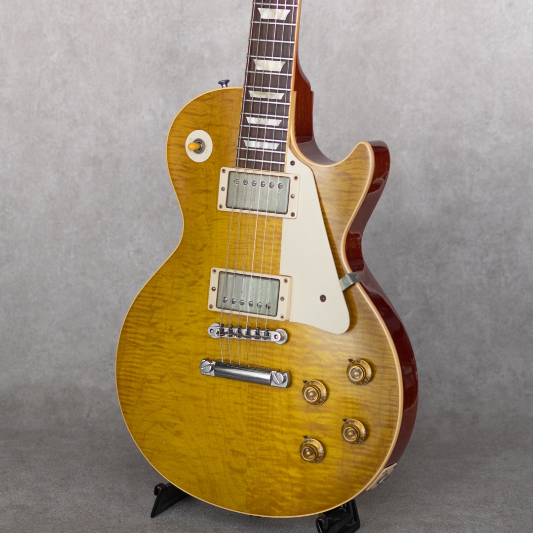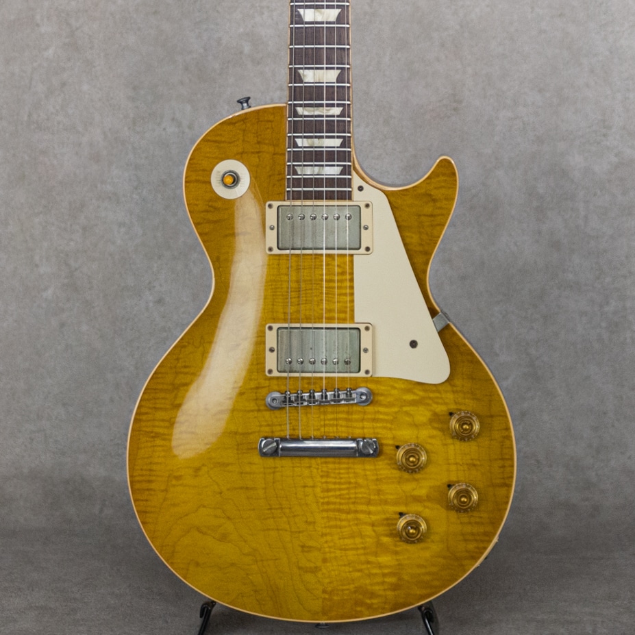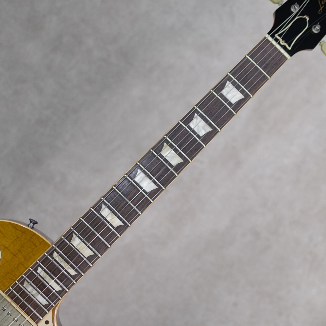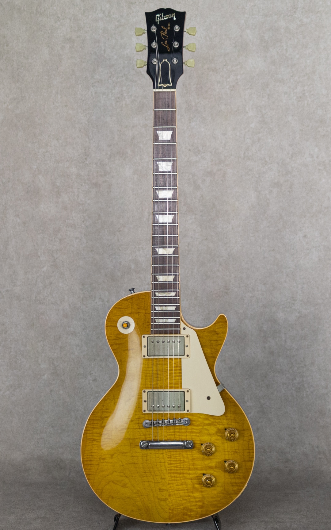 90年代にスタートしたGibson Custom Shopとヒストリックレスポール。オリジナルサンバーストへの憧れと神話化が年々と高まっていく中、常にブラッシュアップを重ね、理想の体現を担ってきたフラッグシップモデルが1959 Les Paul Standard Reissue "R9"です。本器は薄いバインディング/トートイズシェル・ポジションマーク/アルミテールピース/バンブルビーコンデンサといったアップデートを経た2006年製。レモンバースト系カラーにリアルな杢目の揺れ方が、一見して魅力的な個体。センターから両側にかけて板目となっていくワイルドなトップメイプルは、自然な雰囲気ながら物足りなさを一切感じない動きの良いフィギュアド。見る角度によって瞬間睨み返すように浮き立つ表情には、さながらオリジナルバーストのような存在感があります。99年の40th Anniversaryモデルから復刻が始まったアニリンダイによるバックカラーは2006年に再度仕様から外れますが、本器はシリアルの若さからもとれるように2006年初頭の製造のようで、リアルな滲みが楽しめるアニリンダイバックです。また、この時期特有の物としてマホガニーバックがリフトソーン寄りの木取りをされており、故かアタックの鋭さとソリッドなサスティーンに若干の軽快さを感じるトーン。ピックアップはBusrt Bucker1&2搭載期。リアピックアップで気持ちよくドライブさせた際の迫力とバイト感はさることながら、ファットでありながらも締まりがあり埋もれる事のない存在感を見せるフロント、そしてセンターから生まれる抜群の鈴鳴り感溢れるトーンは、紛れもなくレスポールのポテンシャルを感じる要所と言えるでしょう。こちらトップ、バックにコメ粒ほどの打痕や小傷が数か所ある他、全体的な塗装表面のスレ、ニッケルハードウェアのくすみ等経年相応の物がありますが、雰囲気を損なうダメージはございません。フレットの気になる凹みなど無く綺麗なネックコンディションで演奏性も良好です。オリジナルハードケースが付属。