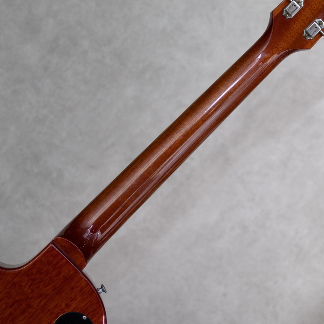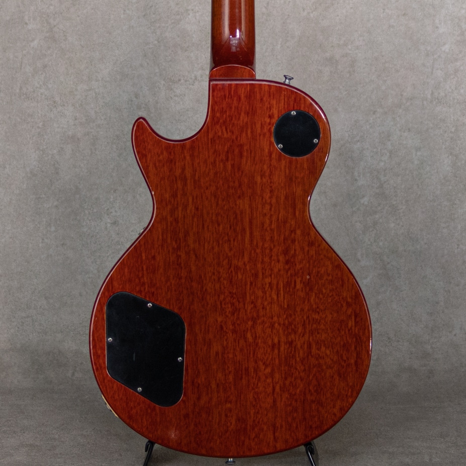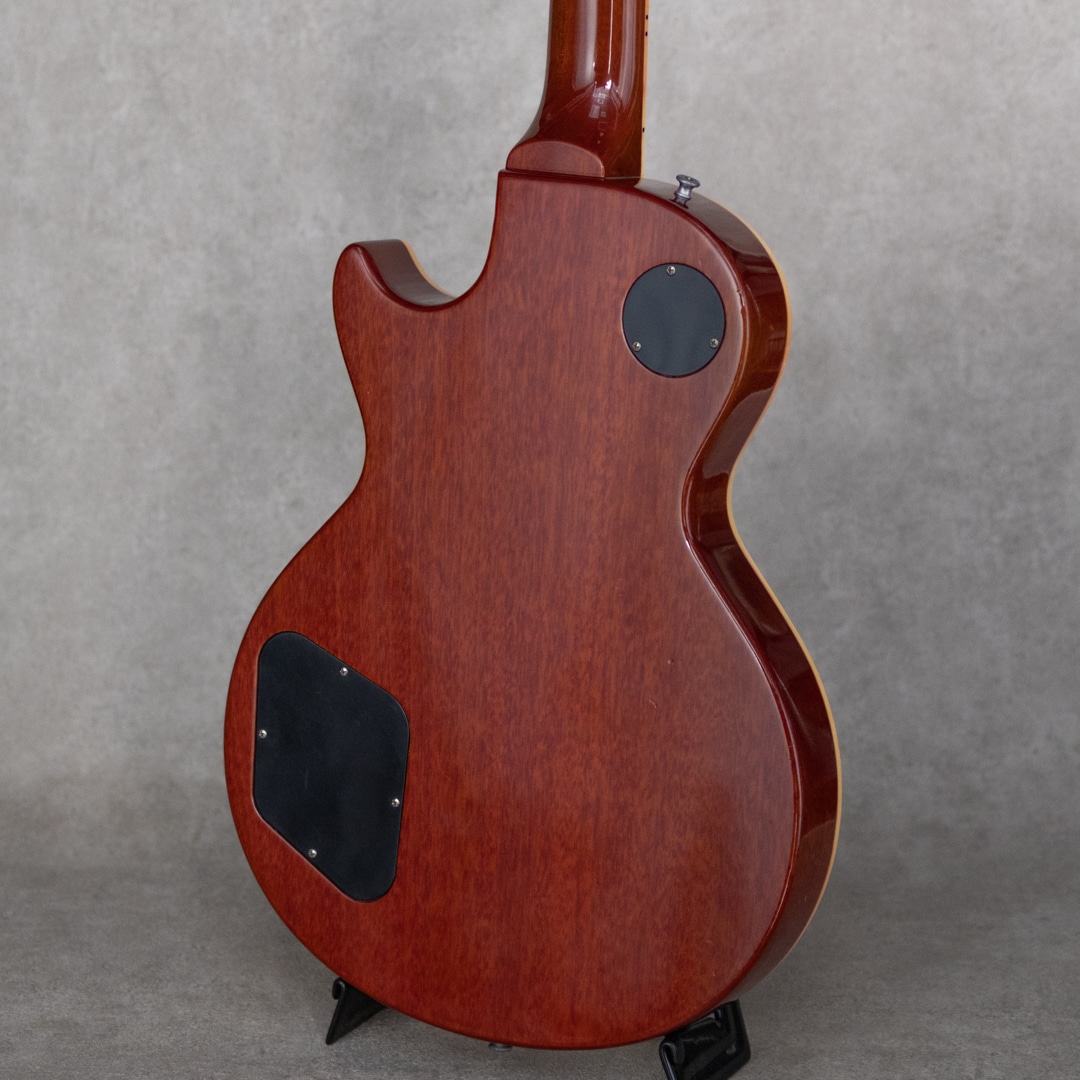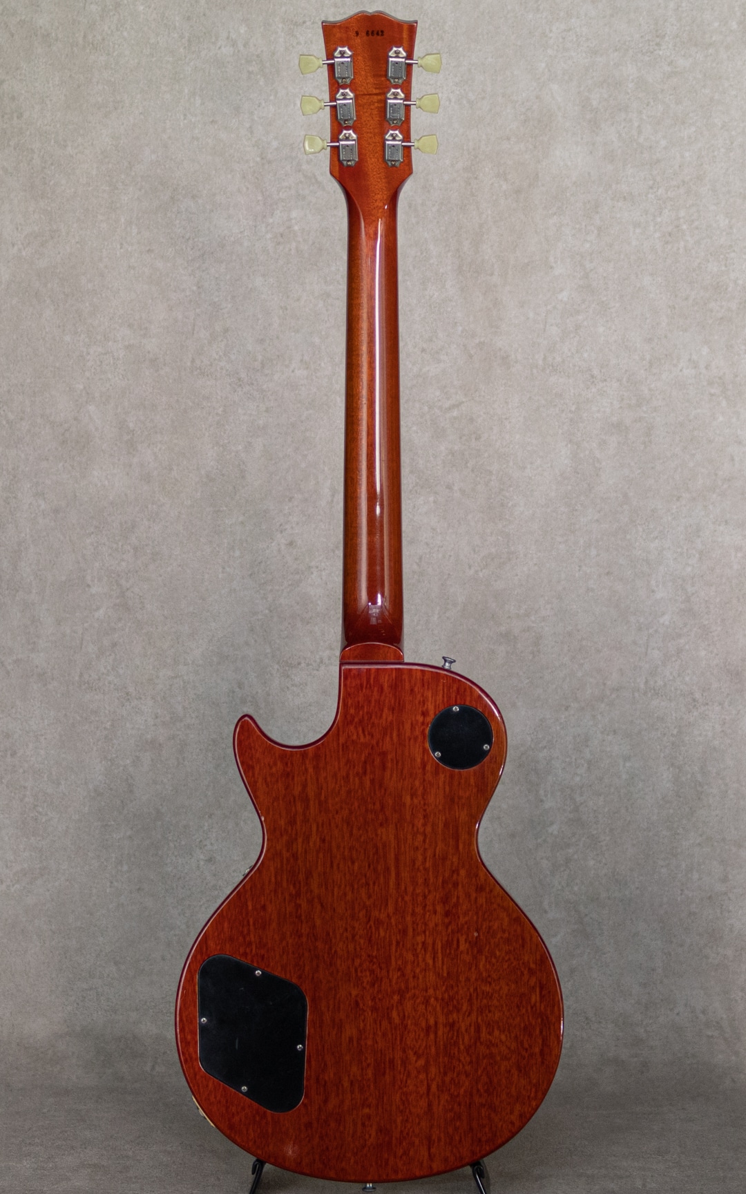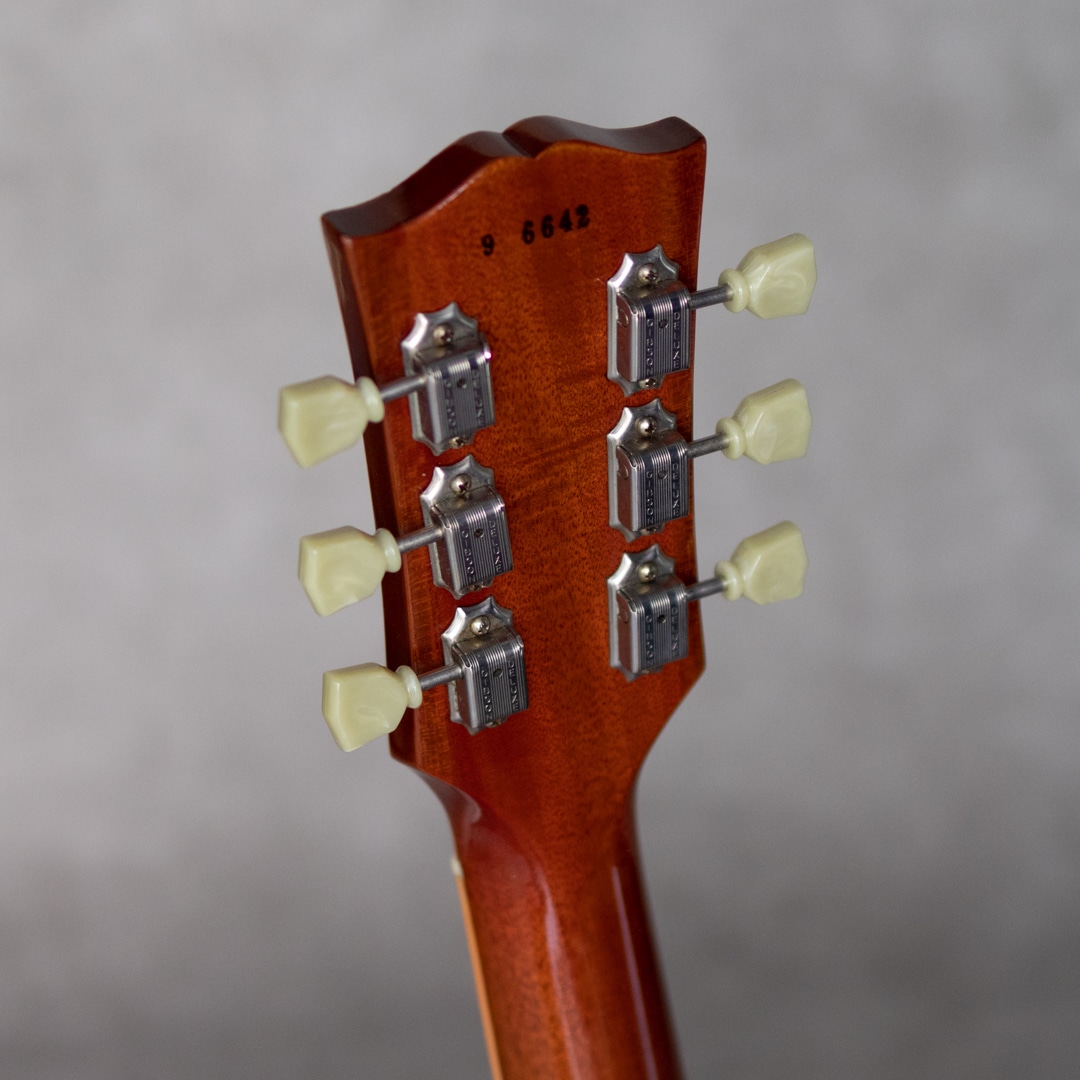 90年代にスタートしたGibson Custom Shopとヒストリックレスポール。オリジナルサンバーストへの憧れと神話化が年々と高まっていく中、常にブラッシュアップを重ね、理想の体現を担ってきたフラッグシップモデルが1959 Les Paul Standard Reissue "R9"です。本器は薄いバインディング/トートイズシェル・ポジションマーク/アルミテールピース/バンブルビーコンデンサといったアップデートを経た2006年製。レモンバースト系カラーにリアルな杢目の揺れ方が、一見して魅力的な個体。センターから両側にかけて板目となっていくワイルドなトップメイプルは、自然な雰囲気ながら物足りなさを一切感じない動きの良いフィギュアド。見る角度によって瞬間睨み返すように浮き立つ表情には、さながらオリジナルバーストのような存在感があります。99年の40th Anniversaryモデルから復刻が始まったアニリンダイによるバックカラーは2006年に再度仕様から外れますが、本器はシリアルの若さからもとれるように2006年初頭の製造のようで、リアルな滲みが楽しめるアニリンダイバックです。また、この時期特有の物としてマホガニーバックがリフトソーン寄りの木取りをされており、故かアタックの鋭さとソリッドなサスティーンに若干の軽快さを感じるトーン。ピックアップはBusrt Bucker1&2搭載期。リアピックアップで気持ちよくドライブさせた際の迫力とバイト感はさることながら、ファットでありながらも締まりがあり埋もれる事のない存在感を見せるフロント、そしてセンターから生まれる抜群の鈴鳴り感溢れるトーンは、紛れもなくレスポールのポテンシャルを感じる要所と言えるでしょう。こちらトップ、バックにコメ粒ほどの打痕や小傷が数か所ある他、全体的な塗装表面のスレ、ニッケルハードウェアのくすみ等経年相応の物がありますが、雰囲気を損なうダメージはございません。フレットの気になる凹みなど無く綺麗なネックコンディションで演奏性も良好です。オリジナルハードケースが付属。